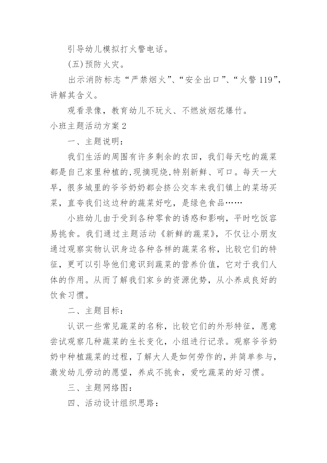 小班主题活动方案小班主题活动方案为保障事情或工作顺利开展,常常需要提前进行细致的方案准备工作,方案是计划中内容最为复杂的一种。那么什么样的方案才是好的呢?以下是小编精心整理的小班主题活动方案,仅供参考,大家一起来看看吧。小班主题活动方案1活动目标:了解行人在马路上应该遵守的一些交通规则,形成初步的安全意识与自我保护意识,提高自我保护能力。活动准备:1、幼儿有与成人一起外出的经验。2、有关模拟游戏的情景创设。3、课件《看望兔奶奶》。活动过程:1、边观看课件(一)边讨论。(1)兔奶奶生病了,兔妈妈带兔宝宝去看望她。半路上,兔妈妈到水果店给奶奶买水果,兔宝宝就跑到了马路上。她看到花丛中有一只漂亮的蝴蝶,就去捉蝴蝶玩。蝴蝶飞到了马路中央,兔宝宝就一路追过去,差点被车撞上。(2)为什么兔宝宝差点被车撞到?(3)教师归纳:兔宝宝离开妈妈在马路上玩耍,差点被车撞上。这样太危险了,不管什么情况我们都不能在马路上玩。2、边观看课件(二)边讨论。(1)兔妈妈和兔宝宝继续往前走。奶奶家就在马路对面,兔宝宝兴奋地想冲过马路见奶奶,可是被兔妈妈一把拉住了。(2)兔妈妈为什么要拉住兔宝宝?过马路应该走哪里?(3)教师归纳:过马路要走斑马线。(4)十字路口有斑马线,行人是不是什么时候都可以走呢?什么时候可以走?(5)教师归纳:过十字路口要看红绿灯,红灯停,绿灯行。(6)兔妈妈和兔宝宝走到斑马线前,等绿灯亮时再穿过马路去奶奶家。3、小结:兔宝宝在路上遇到了一些危险,你们知道怎样才能避免那样的危险吗?(幼儿回答后,教师用自编儿歌进行归纳:小朋友,要牢记,走路要走人行道,路上玩耍不可以。过马路走斑马线,红灯停,绿灯行,确保安全是第一。)4、在情景模拟游戏“去春游”中或到马路上去实地体验。(1)带领幼儿一边走一边根据场景提问,巩固对交通规则的.认识。场景一:人行道和车行道师:前面有两种道路,行人应该走哪一种路?(人行道。)师:行人应该注意什么?(靠右边走,不能边走边玩,特别是不能到车行道上玩。)场景二:十字路口师:要过马路了,我们应该怎么走?(找到斑马线,看清红绿灯,红灯停,绿灯行。)场景三:天桥师:这是什么?我们应该怎么走?(走天桥就像走幼儿园的楼梯,要靠右边一个跟着一个走,不能推也不能挤。)(2)顺利到达目的地之后,引导幼儿对刚才的情况进行小结,启发幼儿把过天桥的要点编到儿歌里去,如“过天桥靠右边,一个跟着一个走”。延伸活动:行人走在马路上还应该注意什么?请和爸爸妈妈一起找一找,然后把它们也编到儿歌里去好吗?小班安全主题活动2活动目标1、教育幼儿遇事不要紧张。2、培养幼儿基本的防火意识与能力。3、让幼儿初步掌握最基本的安全防火、灭火知识,学会简单的自我保护方法。4、探索、发现生活中的多样性及特征。5、加强幼儿的安全意识。活动准备1、幼儿事先记住自己的家庭住址和电话号码。2、相关VCD一盘。3、消防标志“严禁烟火”、“安全出口”、“火警119”,相关字卡、电话机一部、湿毛巾若干。活动过程(一)组织幼儿观看火灾录像,使幼儿感受火灾的危险性。(二)出示图片,幼儿观察。教师提问,启发幼儿讨论。1、你刚才看到了什么?2、火灾会带来什么后果?3、消防员叔叔用什么来灭火?是怎样灭高楼上的大火的?(云梯、高压水龙头、空气呼吸器。)(三)着火了,怎么办?1、火烧得很大,自己没办法扑灭怎么办?(打电话报火警)你知道火警电话号码是多少吗?(119)2、如果小朋友家里着火了,屋里很多烟怎样逃出来呢?(观看录像后得知用湿毛巾捂住口鼻,弯下腰往楼下跑)3、为什么要用湿毛巾捂住口鼻?(大火烧着的许多物体冒出浓烟,人们呼吸困难,容易窒息死亡)4、为什么要弯着腰往外跑呢?(烟火上升导致上层空气更加缺氧,尽量降低身体,呼吸近地面的氧气)(四)模拟打火警电话。教师演示拨打“119”电话的方法,提示幼儿说清楚着火物、着火地点和自己的姓名及电话号码。引导幼儿模拟打火警电话。(五)预防火灾。出示消防标志“严禁烟火”、“安全出口”、“火警119”,讲解其含义。观看录像,教育幼儿不玩火、不燃放烟花爆竹。小班主题活动方案2一、主题说明:我们生活的周围有许多剩余的农田,我们每天吃的蔬菜都是自己家里种植的,现摘现烧,特别新鲜、可口。每天一大早,很多城里的爷爷奶奶都会挤公交车来我们镇上的菜场买菜,直夸我们这边种的蔬菜好吃,是绿色食品……小班幼儿由于受到各种零食的诱惑和影响,平时吃饭容易挑食。我们通过主题活动《新鲜的蔬菜》,不仅让小朋友通过观察实物认识身边各种各样的蔬菜名称,比较它们的特征,更可以引导他们意识到蔬菜的营养价值,它对于我们人体的作用。从而了解我们家乡的资源优势,从小养成良好的饮食习惯。二、主题目标:认识一些常见蔬菜的名称,比较它们的外形特征,愿意尝试观察几种蔬菜的生长变化,小组进行记录。观察爷爷奶奶