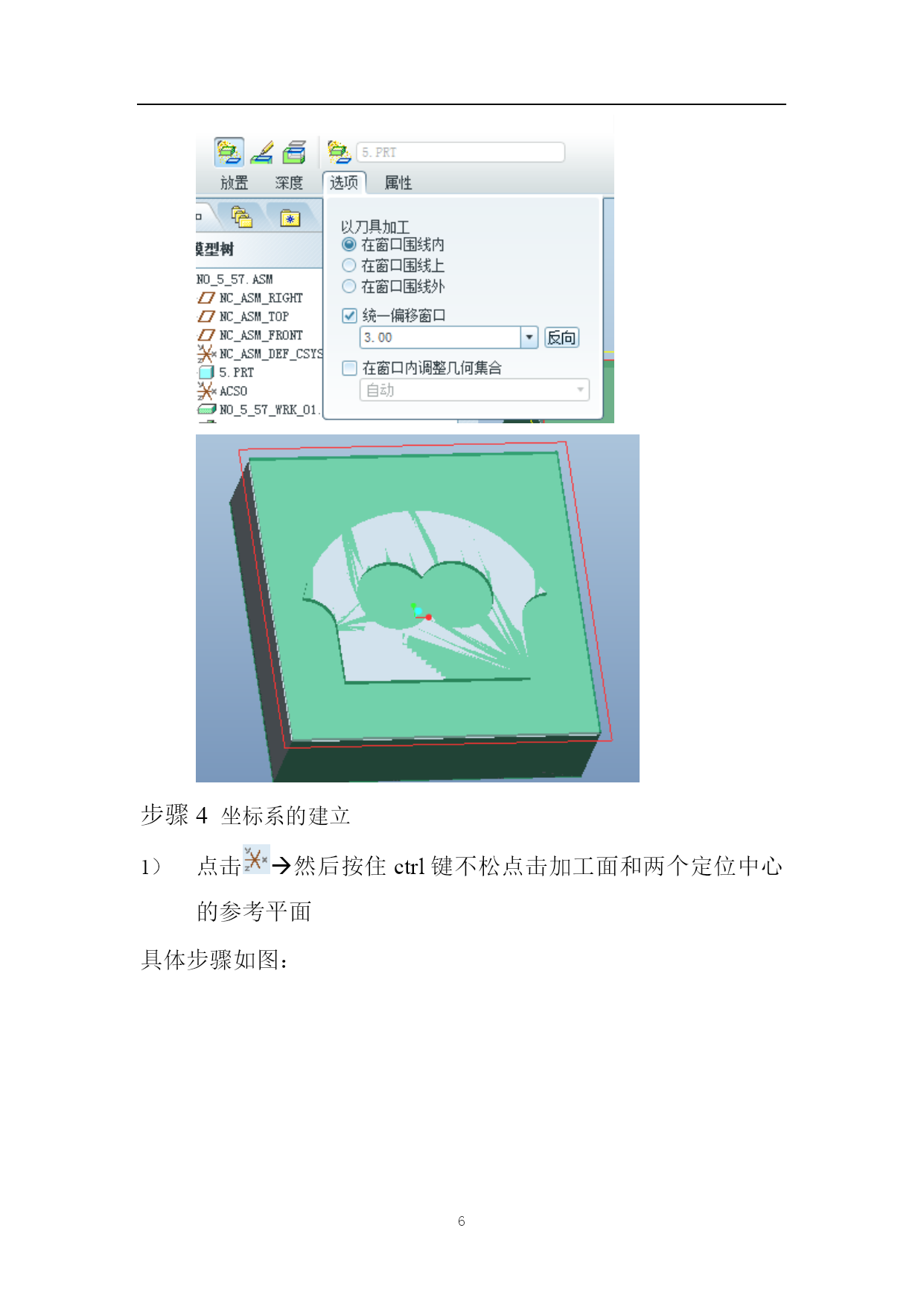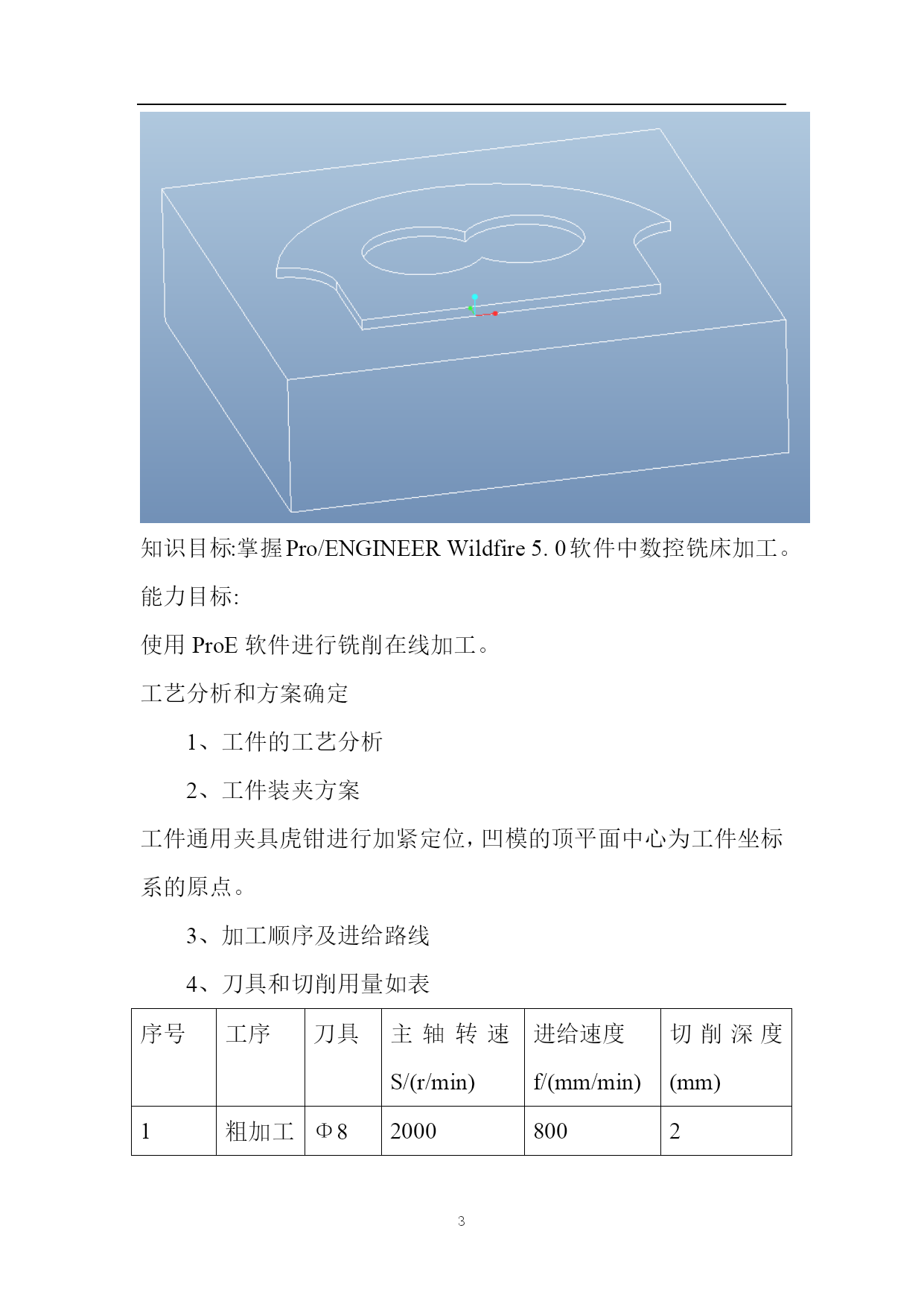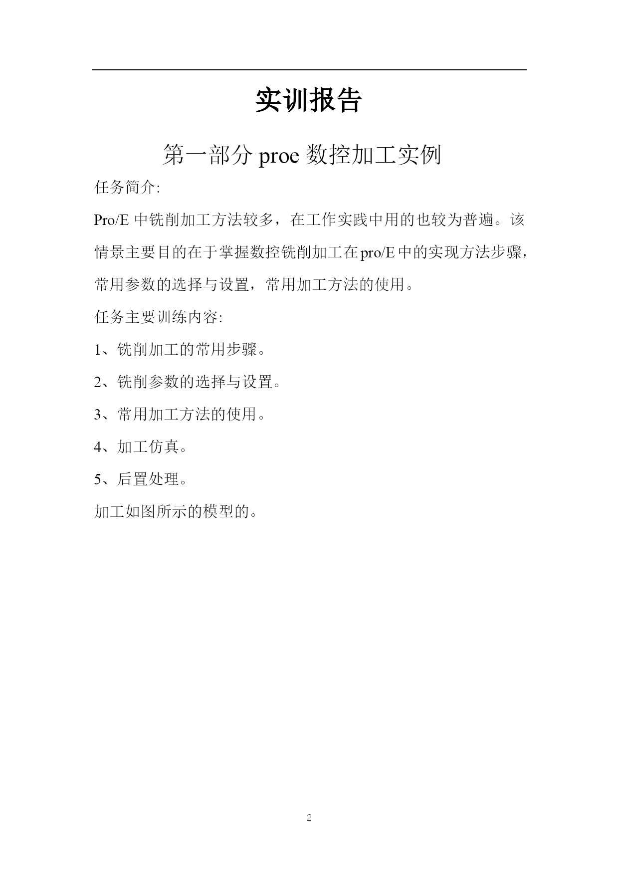 PAGEPAGE15机械CAD\CAM实训报告学院:机械工程学院班级:机制3152班分组:第5小组姓名:张银磊学号:11315211实训地点:7-602、指导教师:吴让利曾霞张娟飞,雒铭花日期:2017.03.13--2017.03.31实训报告第一部分proe数控加工实例任务简介:Pro/E中铣削加工方法较多,在工作实践中用的也较为普遍。该情景主要目的在于掌握数控铣削加工在pro/E中的实现方法步骤,常用参数的选择与设置,常用加工方法的使用。任务主要训练内容:1、铣削加工的常用步骤。2、铣削参数的选择与设置。3、常用加工方法的使用。4、加工仿真。5、后置处理。加工如图所示的模型的。知识目标:掌握Pro/ENGINEERWildfire5.0软件中数控铣床加工。能力目标:使用ProE软件进行铣削在线加工。工艺分析和方案确定1、工件的工艺分析2、工件装夹方案工件通用夹具虎钳进行加紧定位,凹模的顶平面中心为工件坐标系的原点。3、加工顺序及进给路线4、刀具和切削用量如表序号工序刀具主轴转速S/(r/min)进给速度f/(mm/min)切削深度(mm)1粗加工Φ820008002第二部分数控实训加工实例操作步骤:步骤1:创建制造模型NO_5_57,模板采用mmns_mfg_nc.mfg.如图:步骤2装配工件装配参考零件5.prt装配参考零件。选择工具选择5.prt,然后按“打开”按钮选择右键菜单“缺省约束”选择按钮,完成参考零件装配。创建毛坯选择工具再点击完成;结果如图所示:步骤3创建铣削窗口点击选择加工端面选项统一偏移窗口输入3.如图:步骤4坐标系的建立点击然后按住ctrl键不松点击加工面和两个定位中心的参考平面具体步骤如图:调整使其满足笛卡尔坐标系的形式步骤5进行加工环境设置点击步骤操作NC机床选择3轴铣削机床切削刀具选自直径为8的端铣刀应用确定,具体如图:机床零点的选择点击选择步骤4建立的坐标系退刀曲面的选择点击选择铣削窗口选择的面在弹出的退刀设置窗口的值填10确定。步骤6体积块粗加工1)选择第二项在弹出的对话框中点击完成,结果如图所示:接着再弹出的编辑序列参数对话框填写工艺参数然后选择铣削窗口步骤7NC参数修改点击工具选项搜索框输入nccheck_type点击查找点击搜出来的结果将vericut*改为nccheck添加更改确定步骤8检验点击播放路径NC检查运行完成序列步骤9程序导出点击编辑CL数据输出(准备工作:打开proe5.0安装目录下的bin,将里面的复制到你proe的工作目录下)NC序列NC序列列表里的1文件勾选mcd点击完成选择你程序要保存的位置确定完成再在弹出的菜单选择P12关闭。导出的位置文件名为CX.tap用记事本打开即可看到程序根据机床修改部分程序(删除G43H01T01等)后进行步骤10步骤10检验加工时间,点击打开选择导出的程序打开如图:检查,合格后加工第三部分CAD实训成果总结编号:时间:2021年x月x日书山有路勤为径,学海无涯苦作舟页码:第PAGE35页共NUMPAGES35页第PAGE\*MERGEFORMAT35页共NUMPAGES\*MERGEFORMAT35页拉伸绘图-拉伸、拉伸-钻孔旋转——拉伸——倒角,拉伸-螺旋扫旋转-拉伸-完成拉伸-拉伸-孔拉伸-螺纹-倒角-完成表2.10拉伸-拉伸-倒角-螺纹-完成拉伸-拉伸-孔拉伸-螺纹-倒圆角-完成拉伸-完成拉伸-拉伸-拉伸-孔拉伸-修饰螺纹-镜像-倒圆角-完成拉伸—旋转—插入—螺旋扫描—切口—完成旋转-倒角-螺纹-完成表2.6拉伸-拉伸-螺纹-完成表2.3.5拉伸-孔拉伸-镜像-拉伸-螺纹-完成表2.4.5拉伸-拉伸-拉伸-孔拉伸-完成拉伸—孔工具—筋—倒圆角—镜像—完成旋转-拉伸拉伸—孔工具—阵列—倒圆角—完成下面都是练习图拉伸-镜像-完成拉伸—旋转—完成拉伸—插入—混合—伸出顶—完成拉伸-拉伸-拉伸-完成第四部分CAD/CAM实训心得实训心得在开学的第9周,我们进行了为期三个星期的CAD/CAM的实训,在这段时间里,我学到了大量的有关于计算机绘图与计算机编程的知识。其实在实训之初我是抱着玩的心态来的,毕竟以前的实训都是边玩边学过来的还是及其轻松的,但真的开始实训后我发现这还是