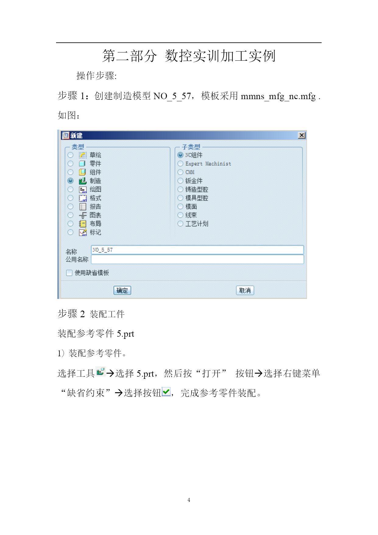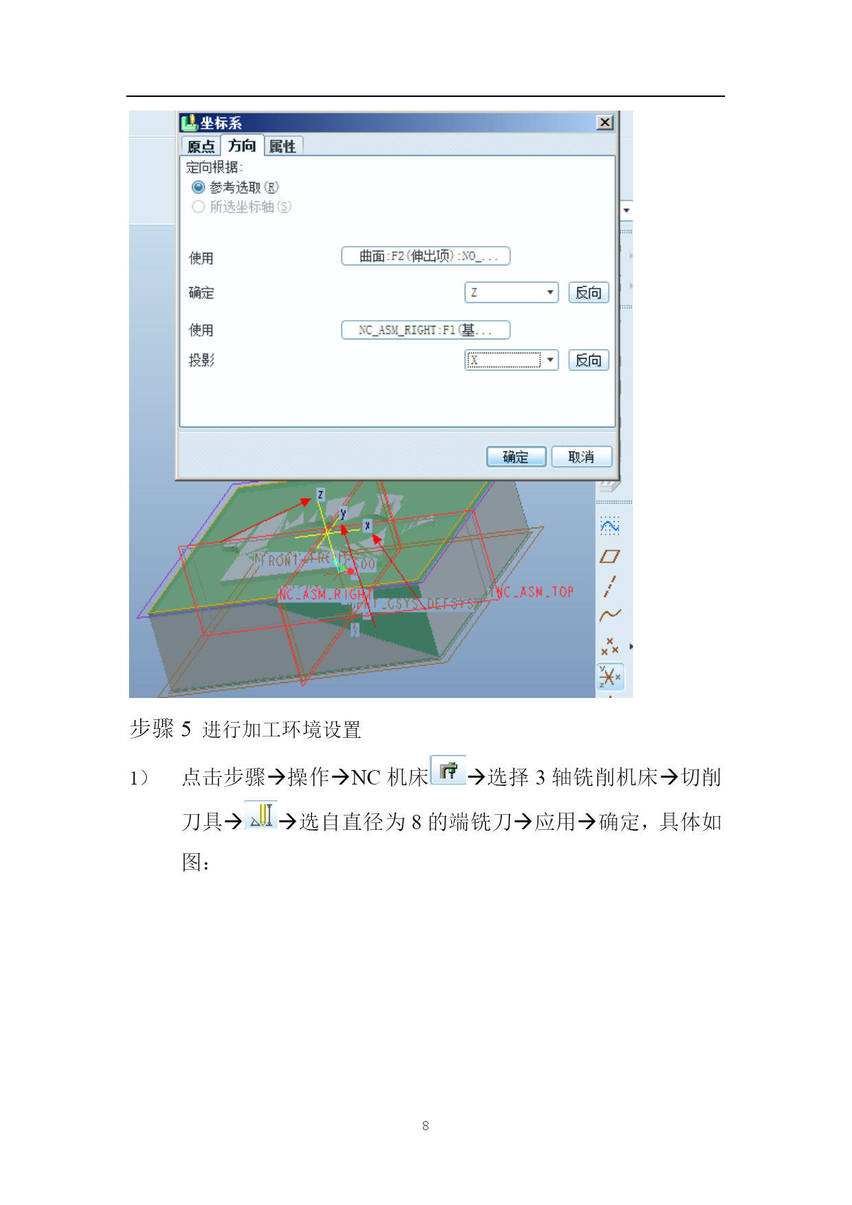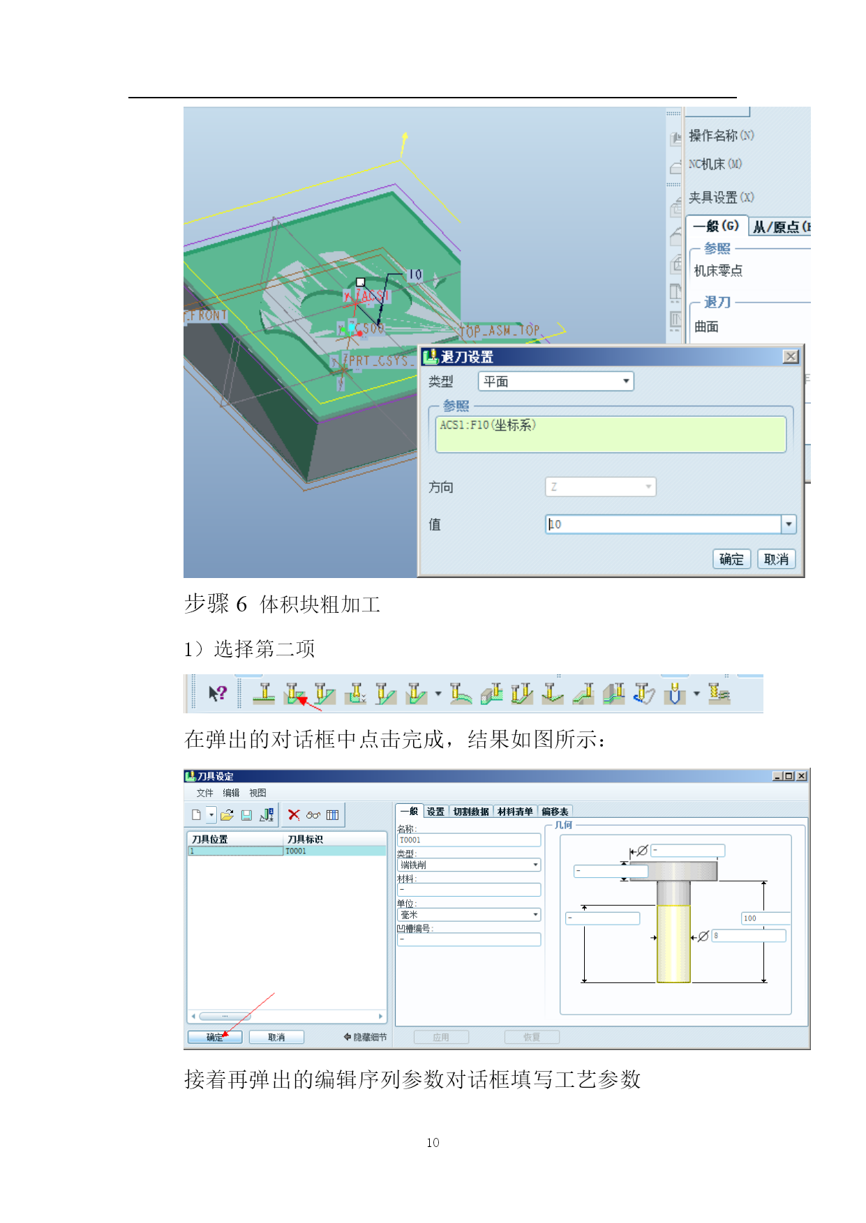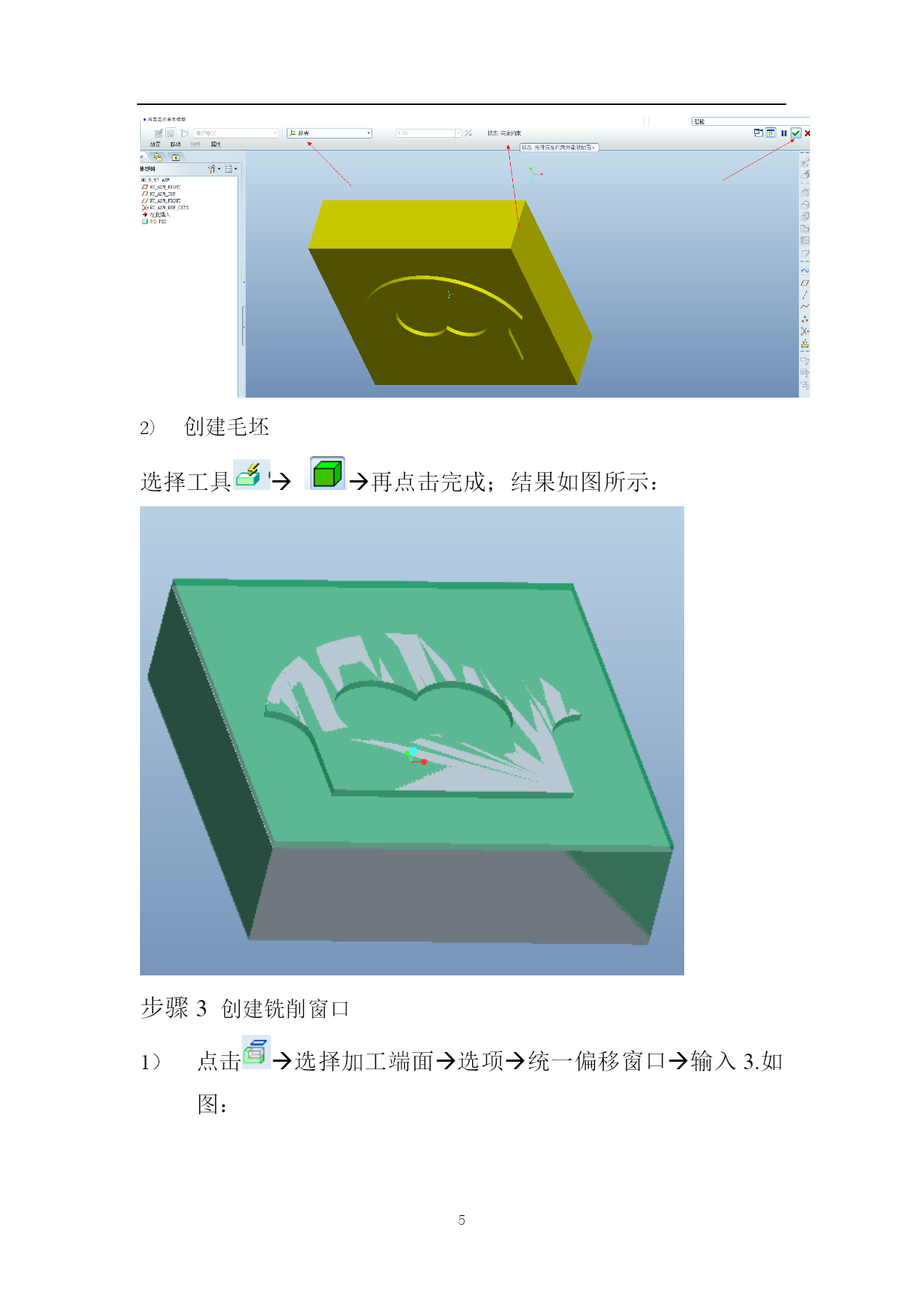 PAGEPAGE15机械CAD\CAM实训报告学院:机械工程学院班级:机制3152班分组:第5小组姓名:张银磊学号:11315211实训地点:7-602、指导教师:吴让利曾霞张娟飞,雒铭花日期:2017.03.13--2017.03.31实训报告第一部分proe数控加工实例任务简介:Pro/E中铣削加工方法较多,在工作实践中用的也较为普遍。该情景主要目的在于掌握数控铣削加工在pro/E中的实现方法步骤,常用参数的选择与设置,常用加工方法的使用。任务主要训练内容:1、铣削加工的常用步骤。2、铣削参数的选择与设置。3、常用加工方法的使用。4、加工仿真。5、后置处理。加工如图所示的模型的。知识目标:掌握Pro/ENGINEERWildfire5.0软件中数控铣床加工。能力目标:使用ProE软件进行铣削在线加工。工艺分析和方案确定1、工件的工艺分析2、工件装夹方案工件通用夹具虎钳进行加紧定位,凹模的顶平面中心为工件坐标系的原点。3、加工顺序及进给路线4、刀具和切削用量如表序号工序刀具主轴转速S/(r/min)进给速度f/(mm/min)切削深度(mm)1粗加工Φ820008002第二部分数控实训加工实例操作步骤:步骤1:创建制造模型NO_5_57,模板采用mmns_mfg_nc.mfg.如图:步骤2装配工件装配参考零件5.prt装配参考零件。选择工具选择5.prt,然后按“打开”按钮选择右键菜单“缺省约束”选择按钮,完成参考零件装配。创建毛坯选择工具再点击完成;结果如图所示:步骤3创建铣削窗口点击选择加工端面选项统一偏移窗口输入3.如图:步骤4坐标系的建立点击然后按住ctrl键不松点击加工面和两个定位中心的参考平面具体步骤如图:调整使其满足笛卡尔坐标系的形式步骤5进行加工环境设置点击步骤操作NC机床选择3轴铣削机床切削刀具选自直径为8的端铣刀应用确定,具体如图:机床零点的选择点击选择步骤4建立的坐标系退刀曲面的选择点击选择铣削窗口选择的面在弹出的退刀设置窗口的值填10确定。步骤6体积块粗加工1)选择第二项在弹出的对话框中点击完成,结果如图所示:接着再弹出的编辑序列参数对话框填写工艺参数然后选择铣削窗口步骤7NC参数修改点击工具选项搜索框输入nccheck_type点击查找点击搜出来的结果将vericut*改为nccheck添加更改确定步骤8检验点击播放路径NC检查运行完成序列步骤9程序导出点击编辑CL数据输出(准备工作:打开proe5.0安装目录下的bin,将里面的复制到你proe的工作目录下)NC序列NC序列列表里的1文件勾选mcd点击完成选择你程序要保存的位置确定完成再在弹出的菜单选择P12关闭。导出的位置文件名为CX.tap用记事本打开即可看到程序根据机床修改部分程序(删除G43H01T01等)后进行步骤10步骤10检验加工时间,点击打开选择导出的程序打开如图:检查,合格后加工第三部分CAD实训成果总结编号:时间:2021年x月x日书山有路勤为径,学海无涯苦作舟页码:第PAGE35页共NUMPAGES35页第PAGE\*MERGEFORMAT35页共NUMPAGES\*MERGEFORMAT35页拉伸绘图-拉伸、拉伸-钻孔旋转——拉伸——倒角,拉伸-螺旋扫旋转-拉伸-完成拉伸-拉伸-孔拉伸-螺纹-倒角-完成表2.10拉伸-拉伸-倒角-螺纹-完成拉伸-拉伸-孔拉伸-螺纹-倒圆角-完成拉伸-完成拉伸-拉伸-拉伸-孔拉伸-修饰螺纹-镜像-倒圆角-完成拉伸—旋转—插入—螺旋扫描—切口—完成旋转-倒角-螺纹-完成表2.6拉伸-拉伸-螺纹-完成表2.3.5拉伸-孔拉伸-镜像-拉伸-螺纹-完成表2.4.5拉伸-拉伸-拉伸-孔拉伸-完成拉伸—孔工具—筋—倒圆角—镜像—完成旋转-拉伸拉伸—孔工具—阵列—倒圆角—完成下面都是练习图拉伸-镜像-完成拉伸—旋转—完成拉伸—插入—混合—伸出顶—完成拉伸-拉伸-拉伸-完成第四部分CAD/CAM实训心得实训心得在开学的第9周,我们进行了为期三个星期的CAD/CAM的实训,在这段时间里,我学到了大量的有关于计算机绘图与计算机编程的知识。其实在实训之初我是抱着玩的心态来的,毕竟以前的实训都是边玩边学过来的还是及其轻松的,但真的开始实训后我发现这还是