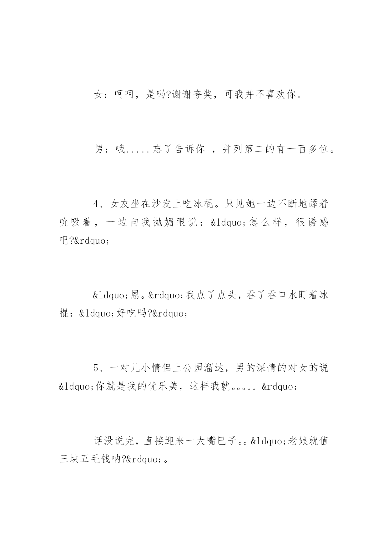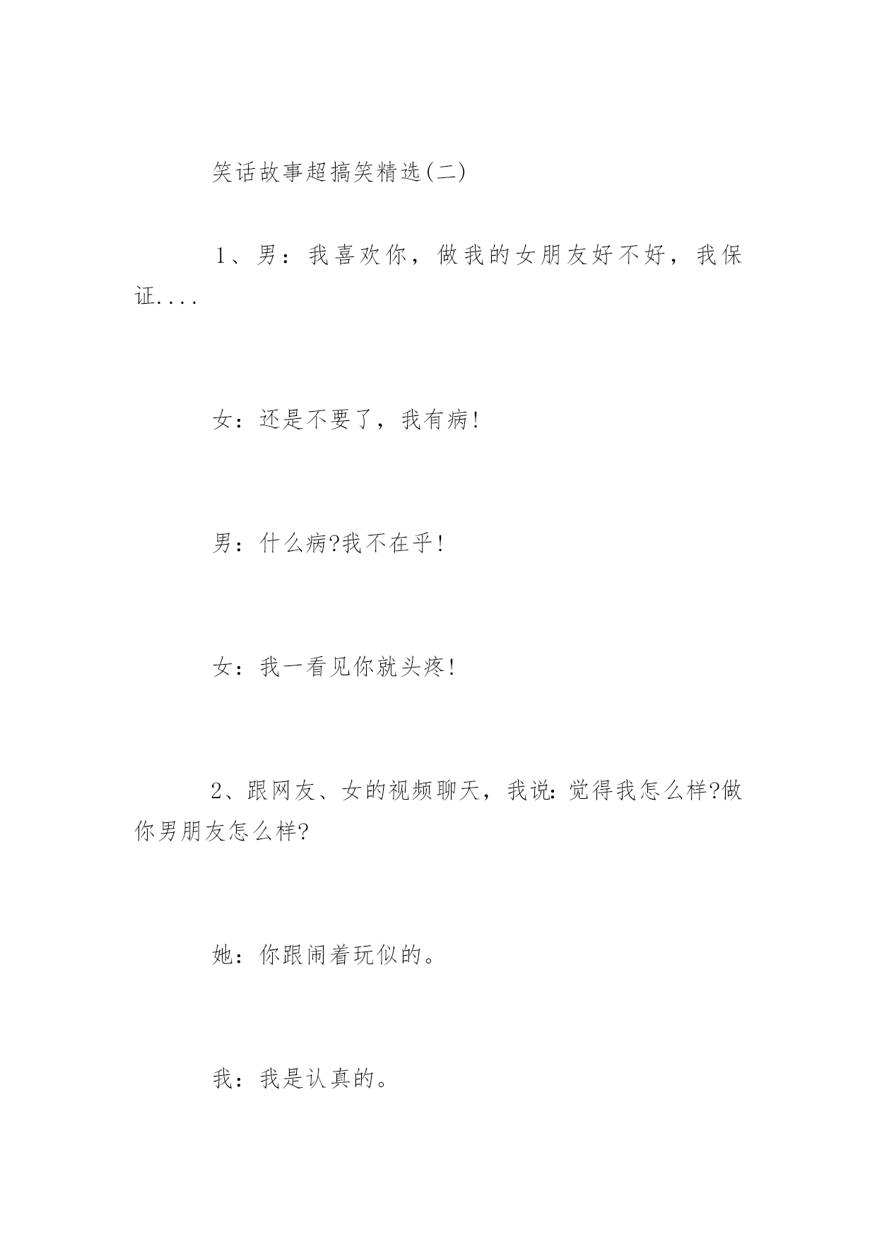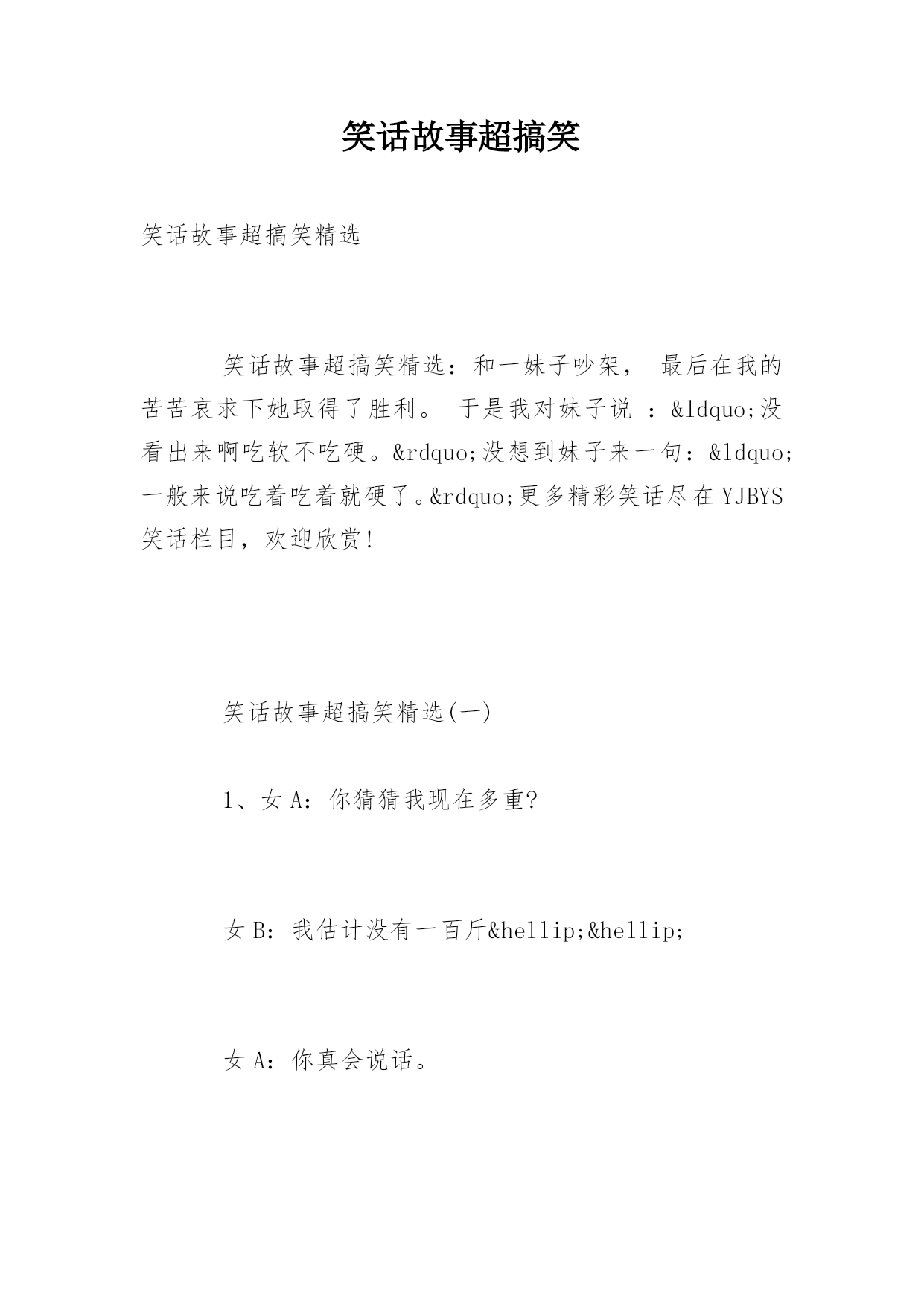 笑话故事超搞笑笑话故事超搞笑精选笑话故事超搞笑精选:和一妹子吵架,最后在我的苦苦哀求下她取得了胜利。于是我对妹子说:“没看出来啊吃软不吃硬。”没想到妹子来一句:“一般来说吃着吃着就硬了。”更多精彩笑话尽在YJBYS笑话栏目,欢迎欣赏!笑话故事超搞笑精选(一)1、女A:你猜猜我现在多重?女B:我估计没有一百斤……女A:你真会说话。女B:也有一百二十斤。2、一天输掉两万多,我日薪才4000啊,以后一定要改掉这坏习惯。美女评论,只要你能改掉我愿意和你在一起。后来在床上美女问:你是做什么工作的?我说无业游民一个。那你一天输两万???喔,那是斗地主欢乐豆3、男:亲爱的,你知道吗,在我一生见过的女人当中,你的美貌与性格都可以排到前三位。女:呵呵,是吗?谢谢夸奖,可我并不喜欢你。男:哦.....忘了告诉你,并列第二的有一百多位。4、女友坐在沙发上吃冰棍。只见她一边不断地舔着吮吸着,一边向我抛媚眼说:“怎么样,很诱惑吧?”“恩。”我点了点头,吞了吞口水盯着冰棍:“好吃吗?”5、一对儿小情侣上公园溜达,男的深情的对女的说“你就是我的优乐美,这样我就。。。。。”话没说完,直接迎来一大嘴巴子。。“老娘就值三块五毛钱呐?”。笑话故事超搞笑精选(二)1、男:我喜欢你,做我的女朋友好不好,我保证....女:还是不要了,我有病!男:什么病?我不在乎!女:我一看见你就头疼!2、跟网友、女的视频聊天,我说:觉得我怎么样?做你男朋友怎么样?她:你跟闹着玩似的。我:我是认真的。她:我说你长得跟闹着玩似的。3、男:这么多年不见,长的大变样了。女:你才大便样呢,你全家都是大便样。男:……4、一日,和女友逛街,路过一个粪坑,女友突然问:如果我和你妈同时跳下去。你会先救谁?我肯定的说道:“你。”女友暗喜道:“你真好,那你妈呢?”我呵呵的'笑着说:“她不会跳的!”5、男孩女孩吵架,气急败坏的女孩大喊:“你给我滚!”男孩也生气的回道:“好,滚就滚。”女孩看着离去的背影忍不住大哭,男孩回头喊道:“哭啥?晚上我还会滚回来的。”笑话故事超搞笑精选(三)1、最近总是感觉电磁炉用久了,用起来噪音太大。我看了看存折,去年也挣了不少钱,就咬咬牙买了个新耳塞。2、现代诗《大海》:大海啊/无边无际的波涛/你这么大/你这么蓝/你家里人造吗?3、胡同里看到有个妇女正在喝农药,我赶紧跑到楼下又买了一瓶递给她:“两瓶一起喝效果才好。”4、到浴池洗澡,遇见一个左右臂分别纹着一头猛虎的光头大哥,他问我:“纹身好看吗?”我悻悻的点点头。他说:“这纹身教会了我很多道理,是我纵横江湖多年没被砍死得出的人生信条。”我问:“要像老虎一样勇猛?”他肆意的笑了,摸了摸胸前的刀疤,突然颔首沉吟道:“两只老虎,两只老虎,跑得快...”5、“这种事情,大家心知肚明。老板骂骂就过去了。别人不出声,你为什么要出声!”主管大骂道。我也很委曲:“主管,一个屁实在憋不住了,不出声行吗?”