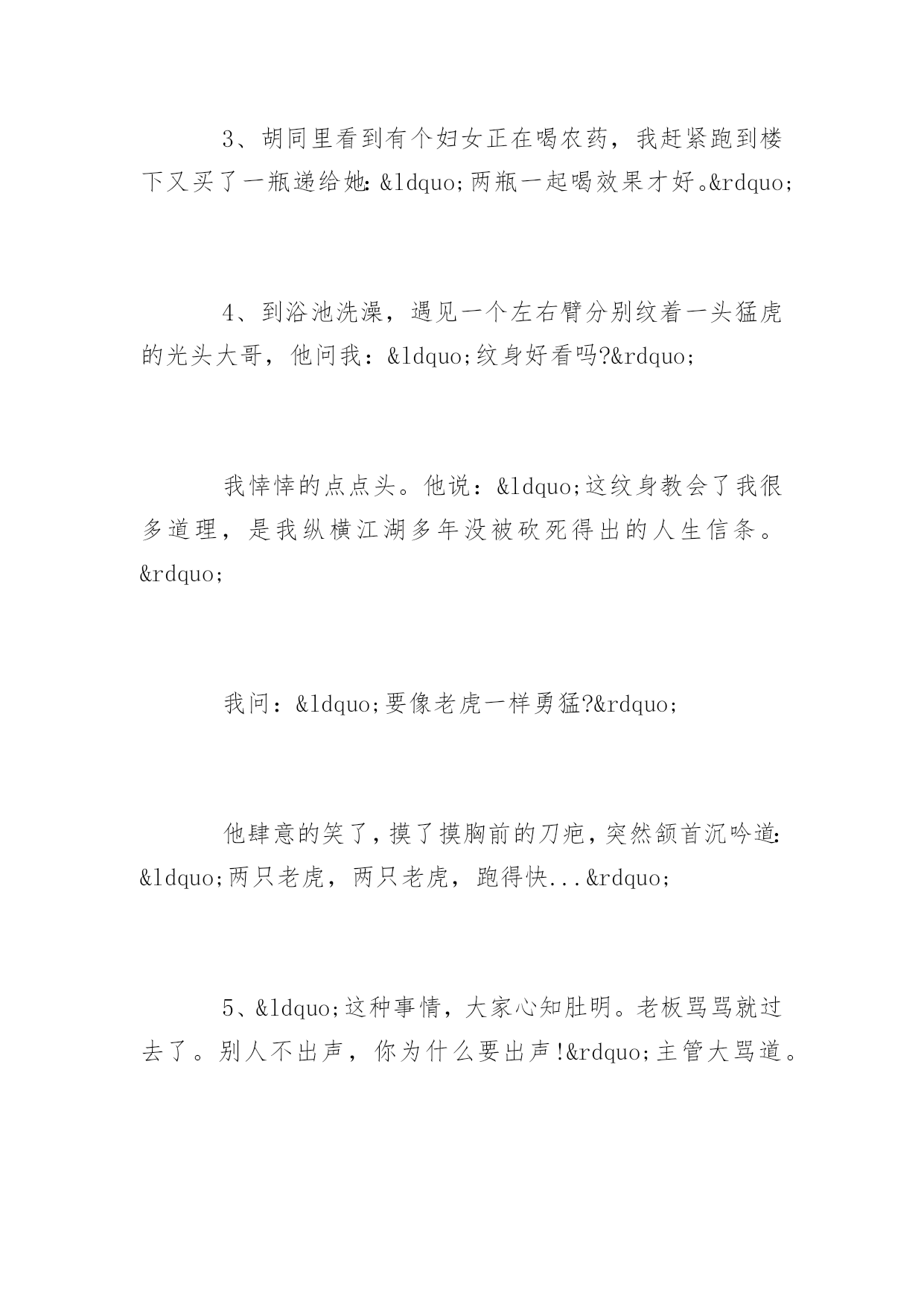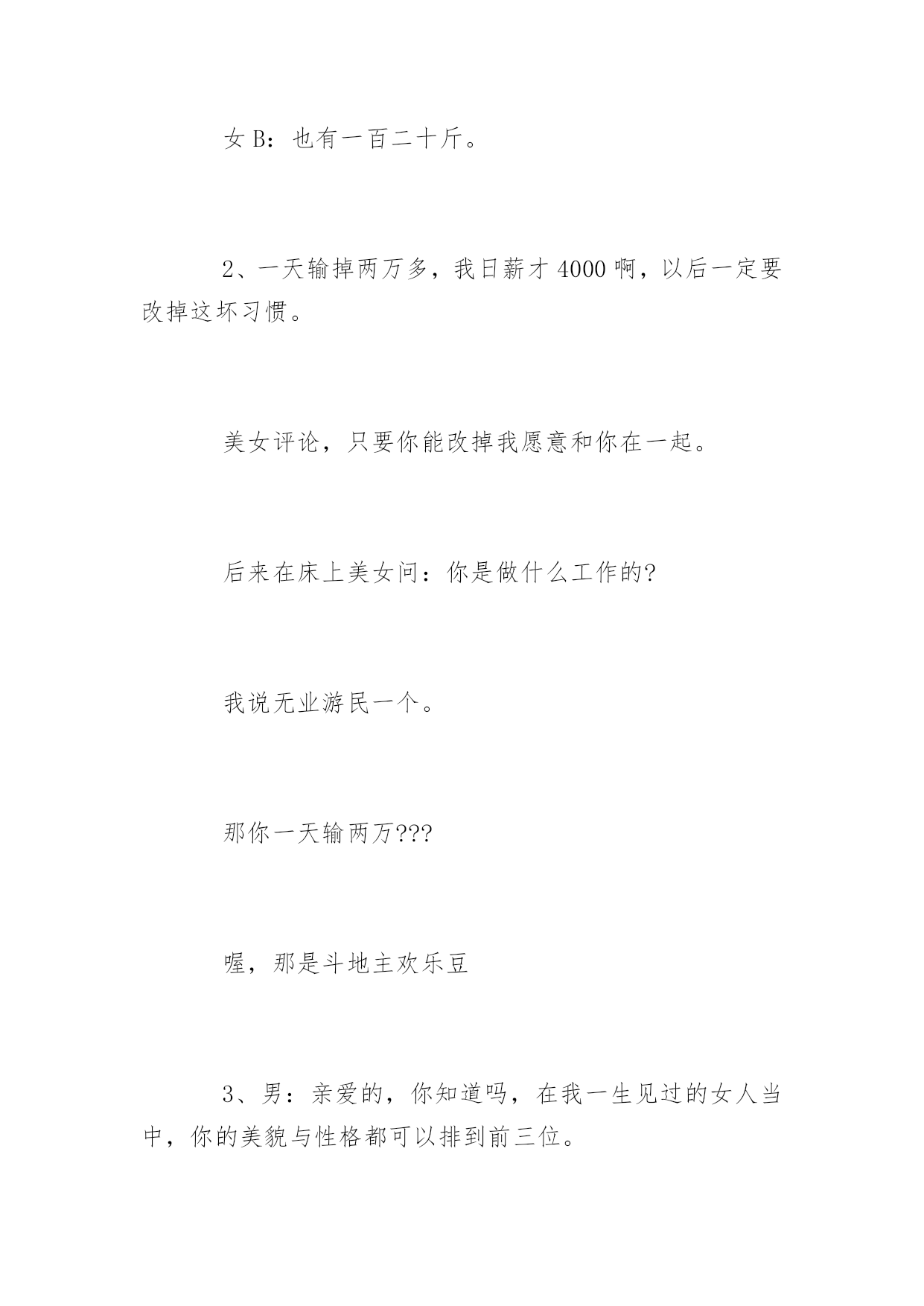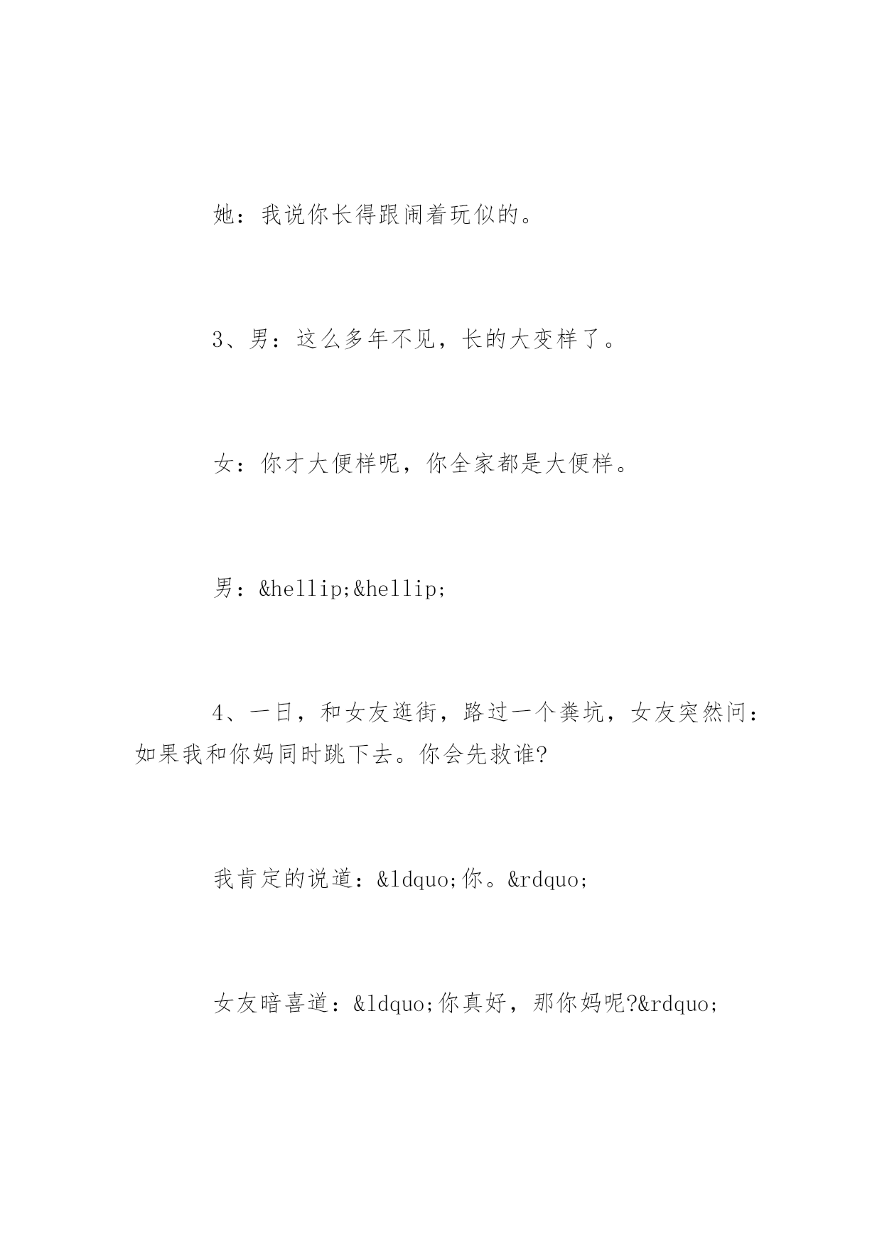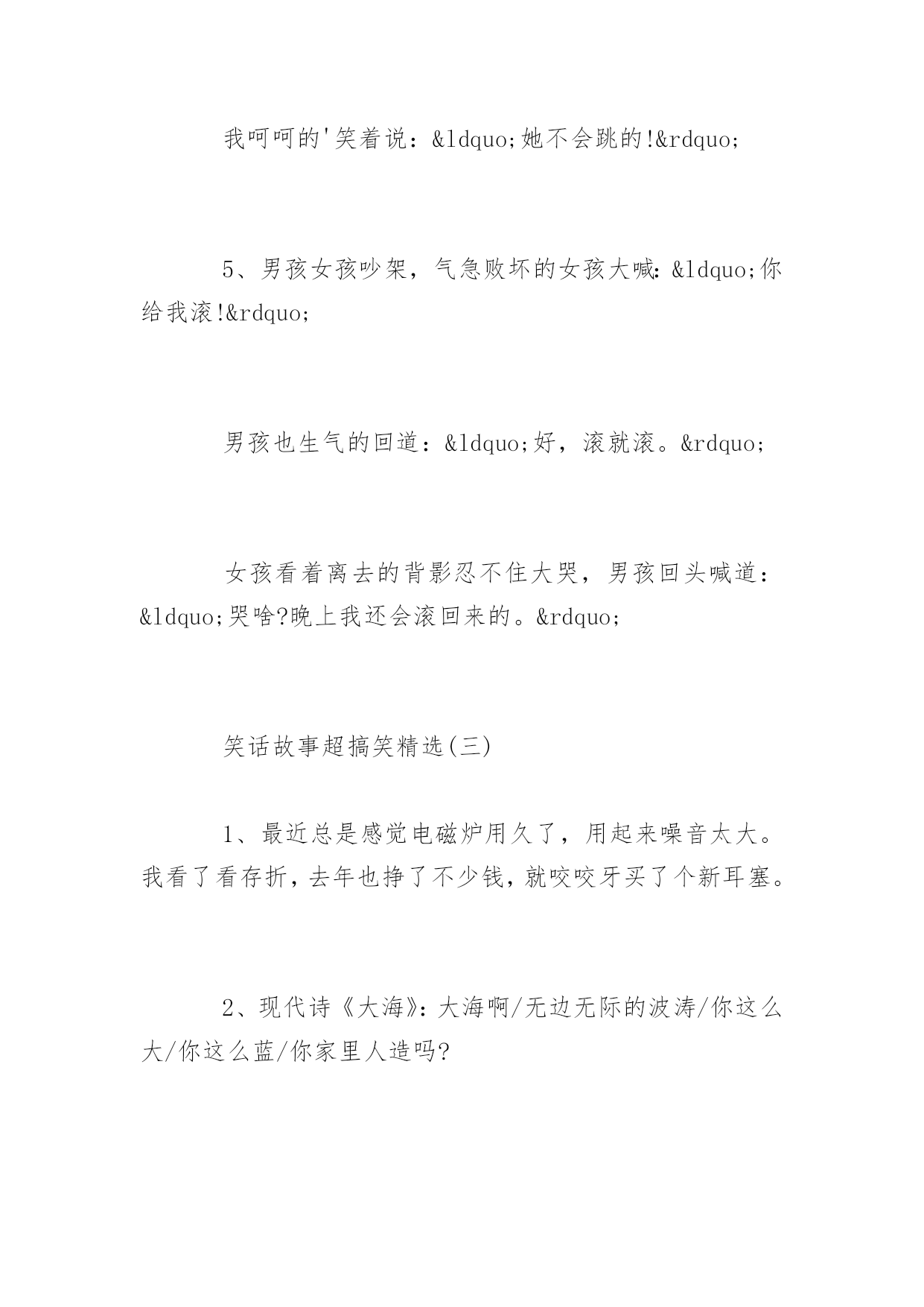 笑话故事超搞笑笑话故事超搞笑精选笑话故事超搞笑精选:和一妹子吵架,最后在我的苦苦哀求下她取得了胜利。于是我对妹子说:“没看出来啊吃软不吃硬。”没想到妹子来一句:“一般来说吃着吃着就硬了。”更多精彩笑话尽在YJBYS笑话栏目,欢迎欣赏!笑话故事超搞笑精选(一)1、女A:你猜猜我现在多重?女B:我估计没有一百斤……女A:你真会说话。女B:也有一百二十斤。2、一天输掉两万多,我日薪才4000啊,以后一定要改掉这坏习惯。美女评论,只要你能改掉我愿意和你在一起。后来在床上美女问:你是做什么工作的?我说无业游民一个。那你一天输两万???喔,那是斗地主欢乐豆3、男:亲爱的,你知道吗,在我一生见过的女人当中,你的美貌与性格都可以排到前三位。女:呵呵,是吗?谢谢夸奖,可我并不喜欢你。男:哦.....忘了告诉你,并列第二的有一百多位。4、女友坐在沙发上吃冰棍。只见她一边不断地舔着吮吸着,一边向我抛媚眼说:“怎么样,很诱惑吧?”“恩。”我点了点头,吞了吞口水盯着冰棍:“好吃吗?”5、一对儿小情侣上公园溜达,男的深情的对女的说“你就是我的优乐美,这样我就。。。。。”话没说完,直接迎来一大嘴巴子。。“老娘就值三块五毛钱呐?”。笑话故事超搞笑精选(二)1、男:我喜欢你,做我的女朋友好不好,我保证....女:还是不要了,我有病!男:什么病?我不在乎!女:我一看见你就头疼!2、跟网友、女的视频聊天,我说:觉得我怎么样?做你男朋友怎么样?她:你跟闹着玩似的。我:我是认真的。她:我说你长得跟闹着玩似的。3、男:这么多年不见,长的大变样了。女:你才大便样呢,你全家都是大便样。男:……4、一日,和女友逛街,路过一个粪坑,女友突然问:如果我和你妈同时跳下去。你会先救谁?我肯定的说道:“你。”女友暗喜道:“你真好,那你妈呢?”我呵呵的'笑着说:“她不会跳的!”5、男孩女孩吵架,气急败坏的女孩大喊:“你给我滚!”男孩也生气的回道:“好,滚就滚。”女孩看着离去的背影忍不住大哭,男孩回头喊道:“哭啥?晚上我还会滚回来的。”笑话故事超搞笑精选(三)1、最近总是感觉电磁炉用久了,用起来噪音太大。我看了看存折,去年也挣了不少钱,就咬咬牙买了个新耳塞。2、现代诗《大海》:大海啊/无边无际的波涛/你这么大/你这么蓝/你家里人造吗?3、胡同里看到有个妇女正在喝农药,我赶紧跑到楼下又买了一瓶递给她:“两瓶一起喝效果才好。”4、到浴池洗澡,遇见一个左右臂分别纹着一头猛虎的光头大哥,他问我:“纹身好看吗?”我悻悻的点点头。他说:“这纹身教会了我很多道理,是我纵横江湖多年没被砍死得出的人生信条。”我问:“要像老虎一样勇猛?”他肆意的笑了,摸了摸胸前的刀疤,突然颔首沉吟道:“两只老虎,两只老虎,跑得快...”5、“这种事情,大家心知肚明。老板骂骂就过去了。别人不出声,你为什么要出声!”主管大骂道。我也很委曲:“主管,一个屁实在憋不住了,不出声行吗?”