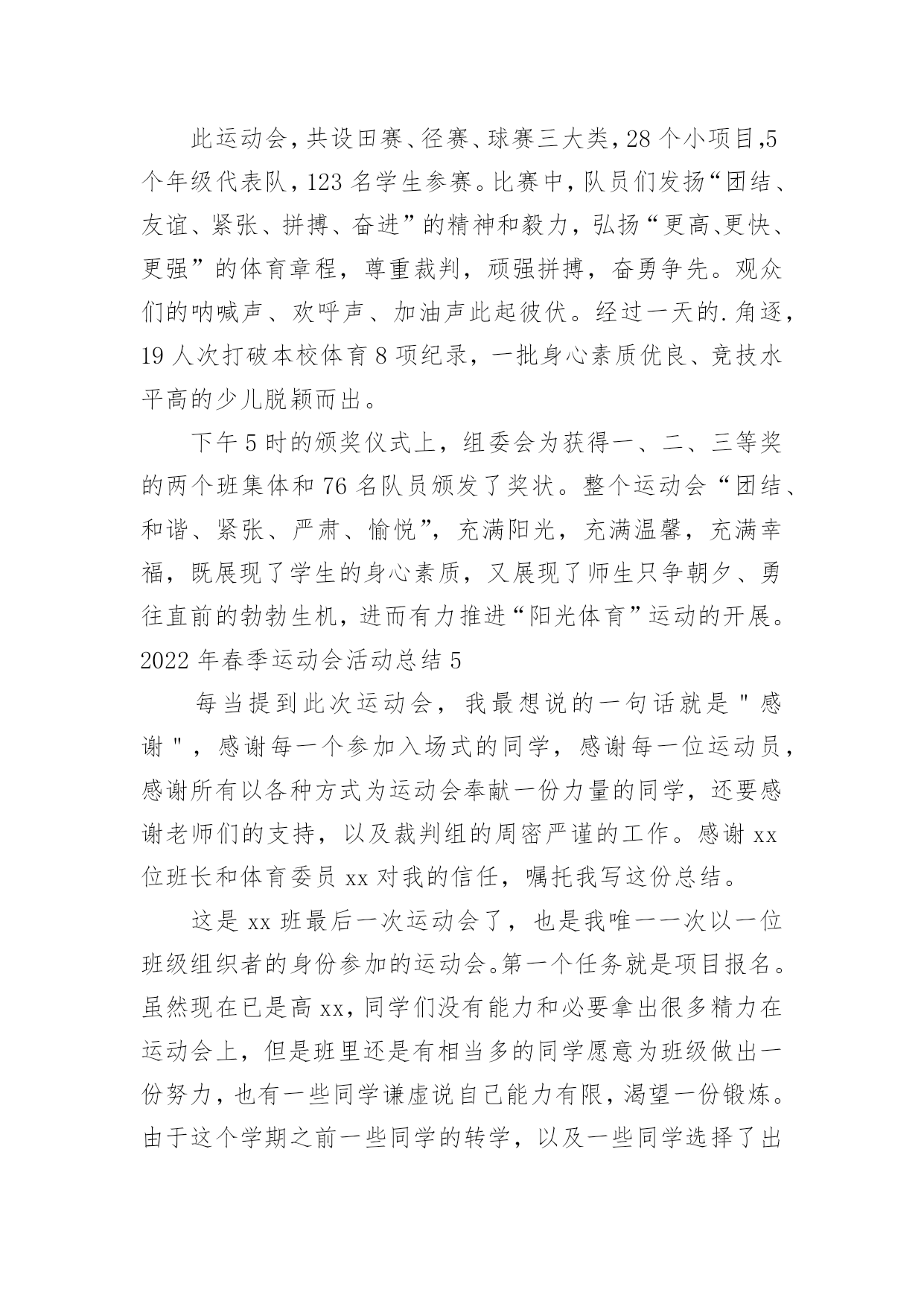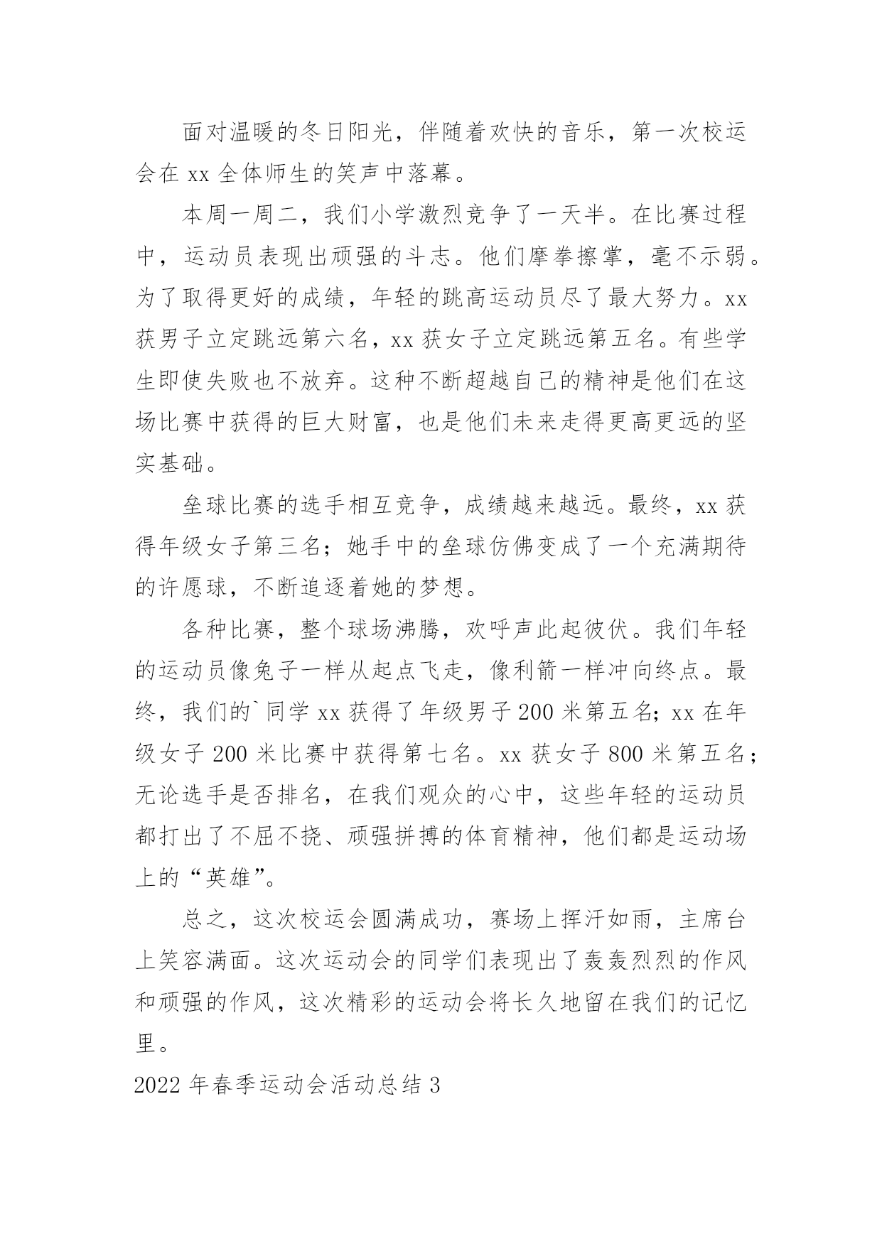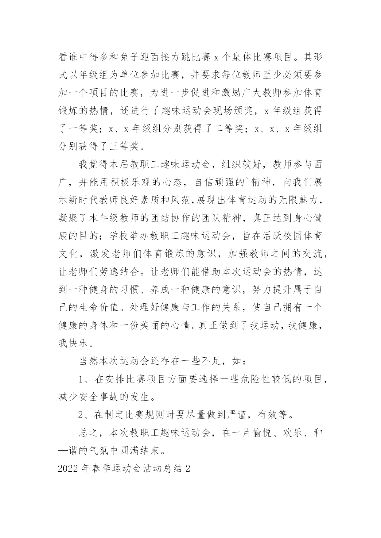 春季运动会活动总结2022年春季运动会活动总结总结是指社会团体、企业单位和个人对某一阶段的学习、工作或其完成情况加以回顾和分析,得出教训和一些规律性认识的一种书面材料,它可以给我们下一阶段的学习和工作生活做指导,让我们一起认真地写一份总结吧。那么你知道总结如何写吗?下面是小编精心整理的2022年春季运动会活动总结,仅供参考,大家一起来看看吧。2022年春季运动会活动总结120xx年春季田径运动会在学校领导的大力支持和关心下,通过各科室的协作和配合,以及全校师生的共同努力,各项工作已安全、顺利地结束了,达到了预期举办的目的,为了进一步改进和提高工作,现对本届运动会小结如下:一、组织有序、宣传有力1、制定和发布规程根据我校传统和现有的实际情况,依据田径运动的普及、发展与提高的原则。在三个星期前组织全体体育教师利用课余活动的时间,认真学习裁判规则和研究竞赛规程,包括比赛时间、比赛项目、计分办法、奖励办法、比赛的特定规则等。2、成立大会组委会及裁判员委员会组织机构由竞赛组、保卫组、后勤组、宣传组等组成,组织名单及裁判员名单确定后,学校领导及时召开了筹备协调会,会议邀请了全体体育教师参加,会上对各组、各项工作进行了具体细节的分工。接着又召开了一次全校性的教职工大会,对相关的工作人员和裁判员认真的作了培训。宣传组、保卫组、后勤组、均做了大量的赛前准备工作。3、本次比赛学校进行了大量的宣传工作,包括对参赛运动员的和运动会赛事的宣传,据统计,各班宣传报道40余篇,在全院范围内形成了一个良好的活围。二、赛事回顾、精彩无限本次运动会总成绩如下:第一名:一年一班二年二班三年三班四年一班五年二班六年三班第二名:一年三班二年三班三年一班四年三班五年一班六年一班精神文明班级:一年二班二年一班三年二班四年二班五年三班六年二班六年四班六年五班三、携手共进、展望未来本次运动会本着“趣味性”的原则,在全体裁判员及工作人员的努力下,为700多名运动员提供了一个公平、公正、充分发挥潜力、创造优异运动成绩的机会。为期一天的运动会,在取得优异比赛成绩的同时,使得本次运动会成为一个欢乐、团结、文明、进取的大会,充分展示了八小师生良好的精神风貌。也预示着八小的明天会更加辉煌。总之,春季田径运动会的圆满成功,与校领导的重视和师生的共同努力是分不开的,通过这次运动会的成功开展,我们相信,八小的明天会更好。当然,在本届校运动会中,我们还存在许多不足之处,期待我们去改正,我们将不断地总结经验,争取把全校性的大型活动搞得更加有声有色。为了进一步提高教职工的身体素质,丰富我校教职工的业余文化生活。校工会于x月x日下午x:xx在校运动场举行了教职工趣味运动会。今年趣味运动会项目是根据各工会设计推荐,工会主席、体育委员上下反复酝酿,逐步筛选,最后经校工会委员讨论确定的。x个比赛项目,分别为:投篮、乒乓球掷准、推铁环、保龄球、掷沙包、飞镖、托球跑、跳绳。赛场上各工会小组长认真组织,教职工积极踊跃参加。各工会在赛前利用课余时间反复练习,探讨比赛技巧,增强了参赛水平,全校领导亲自参赛,还为大家鼓劲助威,使本单位的教职工信心倍增,比赛成绩显著提高。本次运动会全体教职工都参加了比赛,获奖覆盖面xx%,有xx人次获奖。此次趣味运动会取得了预期的效果,展示了我校教职工的精神风貌,加强了教职工的互帮互助精神,增强了广大教职工的敢于拼搏的品质,增进友谊和交流。我校第五届教职工趣味运动会,经过两个下午的激烈角逐,在运动、健康、团结、和─谐、欢笑的氛围中落下帷幕。本次运动会共设有xx人xx足比赛、男、女组合背夹气球迎面接力比赛、x分钟跳长绳比赛、男、女组合定点投篮比赛、看谁中得多和兔子迎面接力跳比赛x个集体比赛项目。其形式以年级组为单位参加比赛,并要求每位教师至少必须要参加一个项目的比赛,为进一步促进和激励广大教师参加体育锻炼的热情,还进行了趣味运动会现场颁奖,x年级组获得了一等奖;x、x年级组分别获得了二等奖;x、x、x年级组分别获得了三等奖。我觉得本届教职工趣味运动会,组织较好,教师参与面广,并能用积极乐观的心态,自信顽强的`精神,向我们展示新时代教师良好素质和风范,展现出体育运动的无限魅力,凝聚了本年级教师的团结协作的团队精神,真正达到身心健康的目的;学校举办教职工趣味运动会,旨在活跃校园体育文化,激发老师们体育锻炼的意识,加强教师之间的交流,让老师们劳逸结合。让老师们能借助本次运动会的热情,达到一种健身的习惯、养成一种健康的意识,努力提升属于自己的生命价值。处理好健康与工作的关系,使自己拥有一个健康的身体和一份美丽的心情。真正做到了我运动,我健康,我快乐。当然本次运动会还存在一些不足,如:1、在安排比赛项目方面要选择一些危险性较低的项目,减少安全事故的发生。2、在制定比赛规则时要尽量做到严谨,有效等