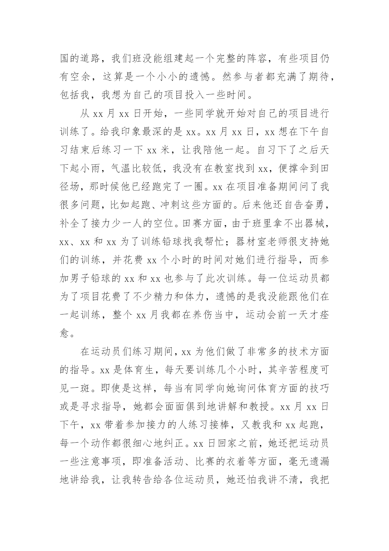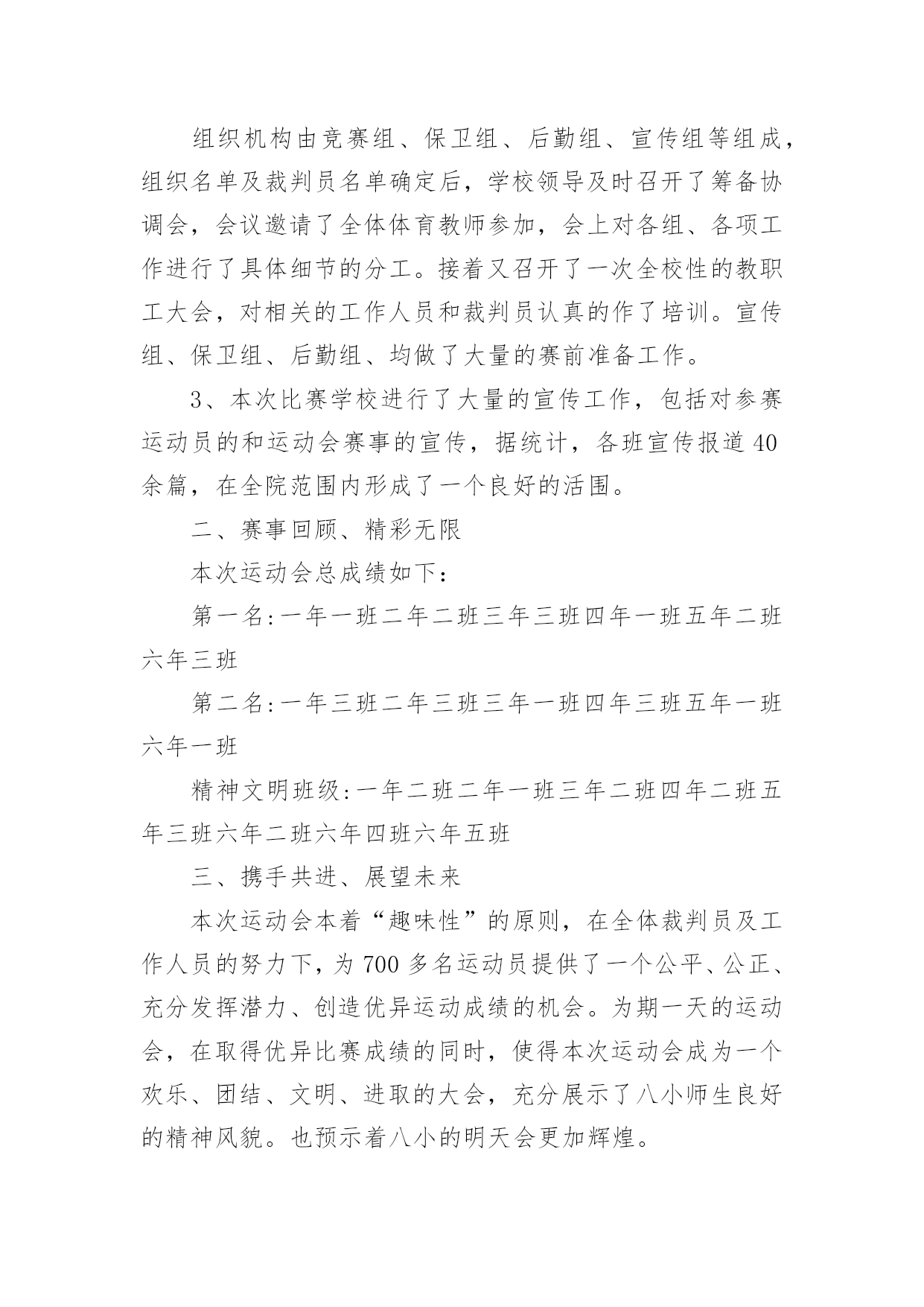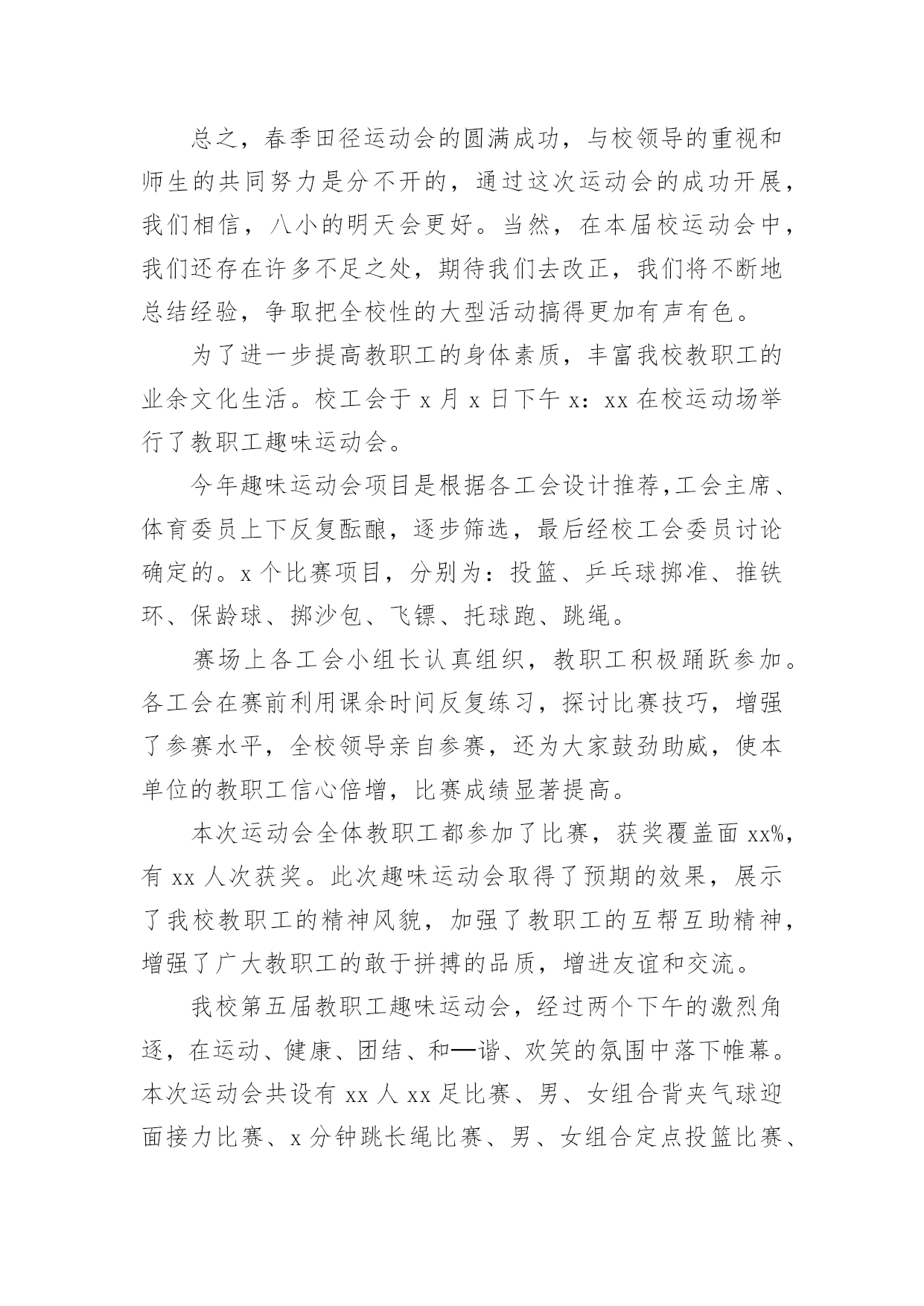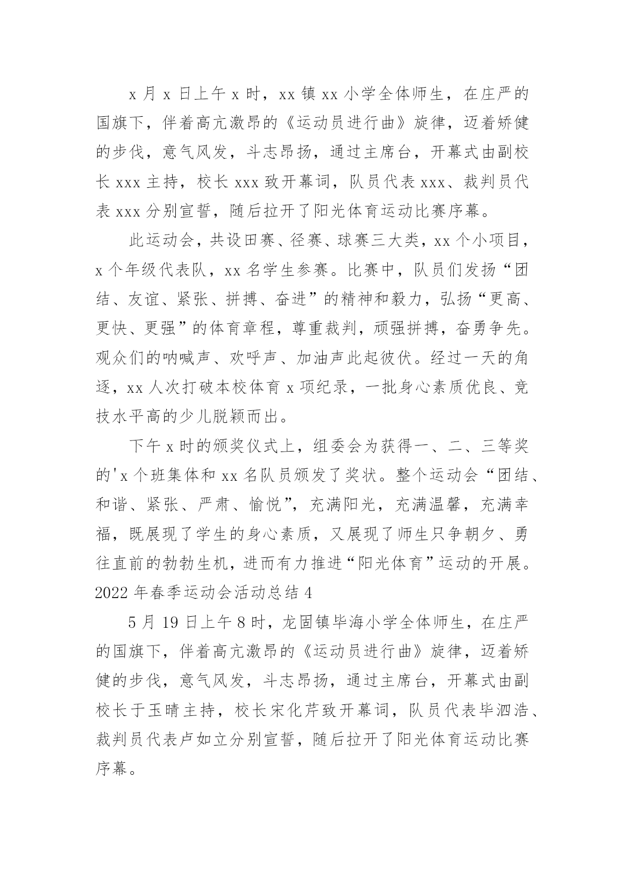 春季运动会活动总结2022年春季运动会活动总结总结是指社会团体、企业单位和个人对某一阶段的学习、工作或其完成情况加以回顾和分析,得出教训和一些规律性认识的一种书面材料,它可以给我们下一阶段的学习和工作生活做指导,让我们一起认真地写一份总结吧。那么你知道总结如何写吗?下面是小编精心整理的2022年春季运动会活动总结,仅供参考,大家一起来看看吧。2022年春季运动会活动总结120xx年春季田径运动会在学校领导的大力支持和关心下,通过各科室的协作和配合,以及全校师生的共同努力,各项工作已安全、顺利地结束了,达到了预期举办的目的,为了进一步改进和提高工作,现对本届运动会小结如下:一、组织有序、宣传有力1、制定和发布规程根据我校传统和现有的实际情况,依据田径运动的普及、发展与提高的原则。在三个星期前组织全体体育教师利用课余活动的时间,认真学习裁判规则和研究竞赛规程,包括比赛时间、比赛项目、计分办法、奖励办法、比赛的特定规则等。2、成立大会组委会及裁判员委员会组织机构由竞赛组、保卫组、后勤组、宣传组等组成,组织名单及裁判员名单确定后,学校领导及时召开了筹备协调会,会议邀请了全体体育教师参加,会上对各组、各项工作进行了具体细节的分工。接着又召开了一次全校性的教职工大会,对相关的工作人员和裁判员认真的作了培训。宣传组、保卫组、后勤组、均做了大量的赛前准备工作。3、本次比赛学校进行了大量的宣传工作,包括对参赛运动员的和运动会赛事的宣传,据统计,各班宣传报道40余篇,在全院范围内形成了一个良好的活围。二、赛事回顾、精彩无限本次运动会总成绩如下:第一名:一年一班二年二班三年三班四年一班五年二班六年三班第二名:一年三班二年三班三年一班四年三班五年一班六年一班精神文明班级:一年二班二年一班三年二班四年二班五年三班六年二班六年四班六年五班三、携手共进、展望未来本次运动会本着“趣味性”的原则,在全体裁判员及工作人员的努力下,为700多名运动员提供了一个公平、公正、充分发挥潜力、创造优异运动成绩的机会。为期一天的运动会,在取得优异比赛成绩的同时,使得本次运动会成为一个欢乐、团结、文明、进取的大会,充分展示了八小师生良好的精神风貌。也预示着八小的明天会更加辉煌。总之,春季田径运动会的圆满成功,与校领导的重视和师生的共同努力是分不开的,通过这次运动会的成功开展,我们相信,八小的明天会更好。当然,在本届校运动会中,我们还存在许多不足之处,期待我们去改正,我们将不断地总结经验,争取把全校性的大型活动搞得更加有声有色。为了进一步提高教职工的身体素质,丰富我校教职工的业余文化生活。校工会于x月x日下午x:xx在校运动场举行了教职工趣味运动会。今年趣味运动会项目是根据各工会设计推荐,工会主席、体育委员上下反复酝酿,逐步筛选,最后经校工会委员讨论确定的。x个比赛项目,分别为:投篮、乒乓球掷准、推铁环、保龄球、掷沙包、飞镖、托球跑、跳绳。赛场上各工会小组长认真组织,教职工积极踊跃参加。各工会在赛前利用课余时间反复练习,探讨比赛技巧,增强了参赛水平,全校领导亲自参赛,还为大家鼓劲助威,使本单位的教职工信心倍增,比赛成绩显著提高。本次运动会全体教职工都参加了比赛,获奖覆盖面xx%,有xx人次获奖。此次趣味运动会取得了预期的效果,展示了我校教职工的精神风貌,加强了教职工的互帮互助精神,增强了广大教职工的敢于拼搏的品质,增进友谊和交流。我校第五届教职工趣味运动会,经过两个下午的激烈角逐,在运动、健康、团结、和─谐、欢笑的氛围中落下帷幕。本次运动会共设有xx人xx足比赛、男、女组合背夹气球迎面接力比赛、x分钟跳长绳比赛、男、女组合定点投篮比赛、看谁中得多和兔子迎面接力跳比赛x个集体比赛项目。其形式以年级组为单位参加比赛,并要求每位教师至少必须要参加一个项目的比赛,为进一步促进和激励广大教师参加体育锻炼的热情,还进行了趣味运动会现场颁奖,x年级组获得了一等奖;x、x年级组分别获得了二等奖;x、x、x年级组分别获得了三等奖。我觉得本届教职工趣味运动会,组织较好,教师参与面广,并能用积极乐观的心态,自信顽强的`精神,向我们展示新时代教师良好素质和风范,展现出体育运动的无限魅力,凝聚了本年级教师的团结协作的团队精神,真正达到身心健康的目的;学校举办教职工趣味运动会,旨在活跃校园体育文化,激发老师们体育锻炼的意识,加强教师之间的交流,让老师们劳逸结合。让老师们能借助本次运动会的热情,达到一种健身的习惯、养成一种健康的意识,努力提升属于自己的生命价值。处理好健康与工作的关系,使自己拥有一个健康的身体和一份美丽的心情。真正做到了我运动,我健康,我快乐。当然本次运动会还存在一些不足,如:1、在安排比赛项目方面要选择一些危险性较低的项目,减少安全事故的发生。2、在制定比赛规则时要尽量做到严谨,有效等