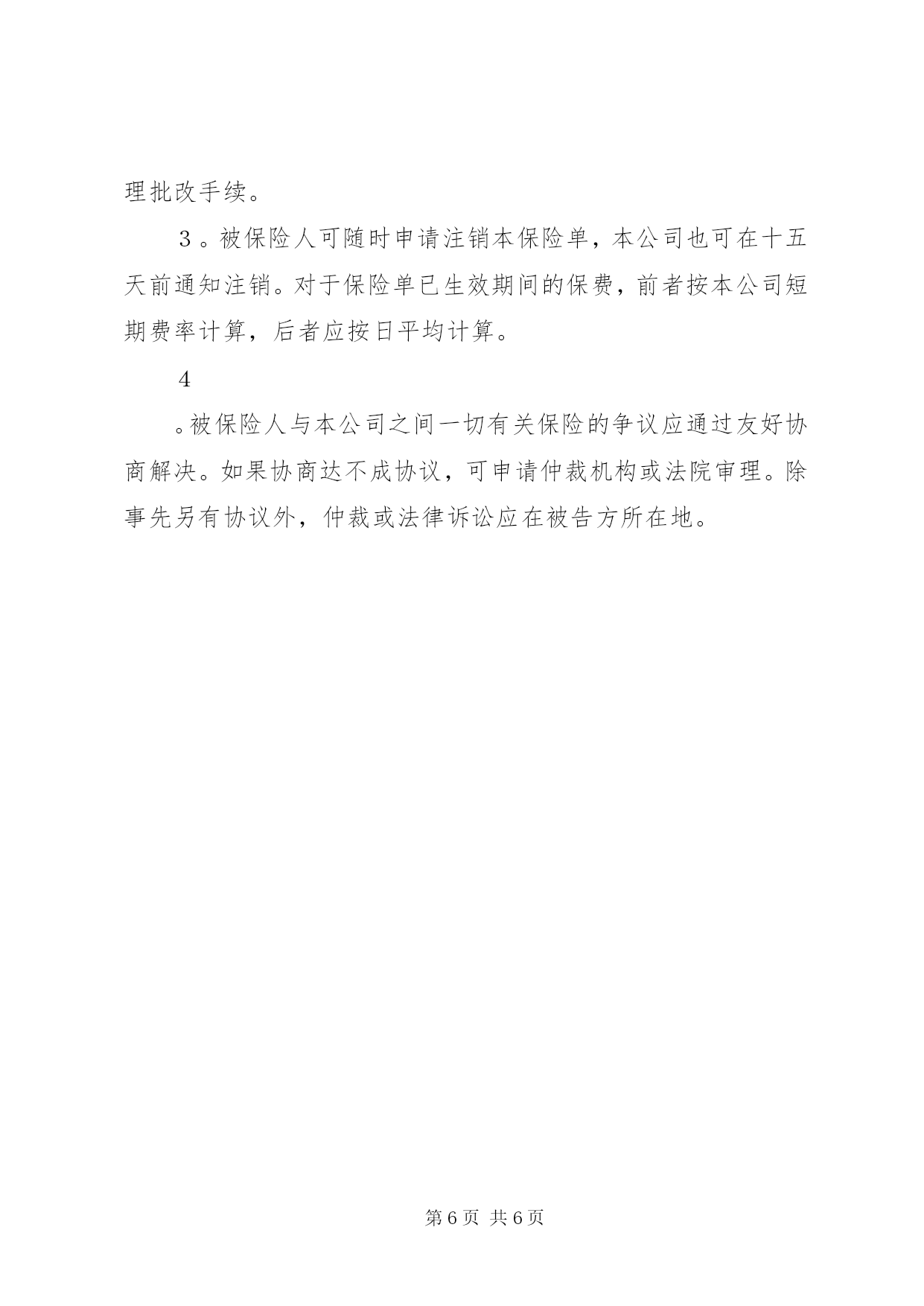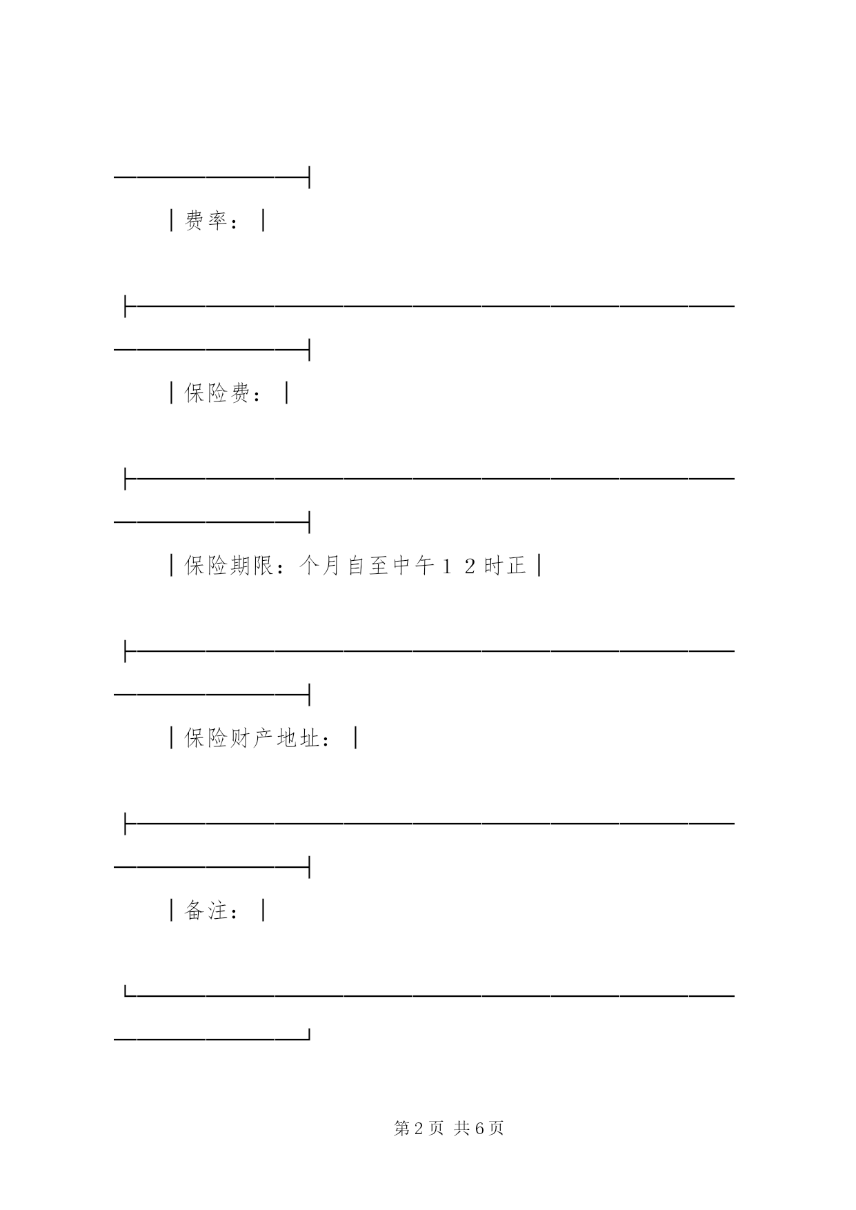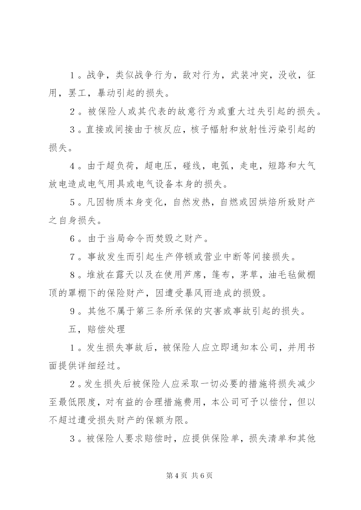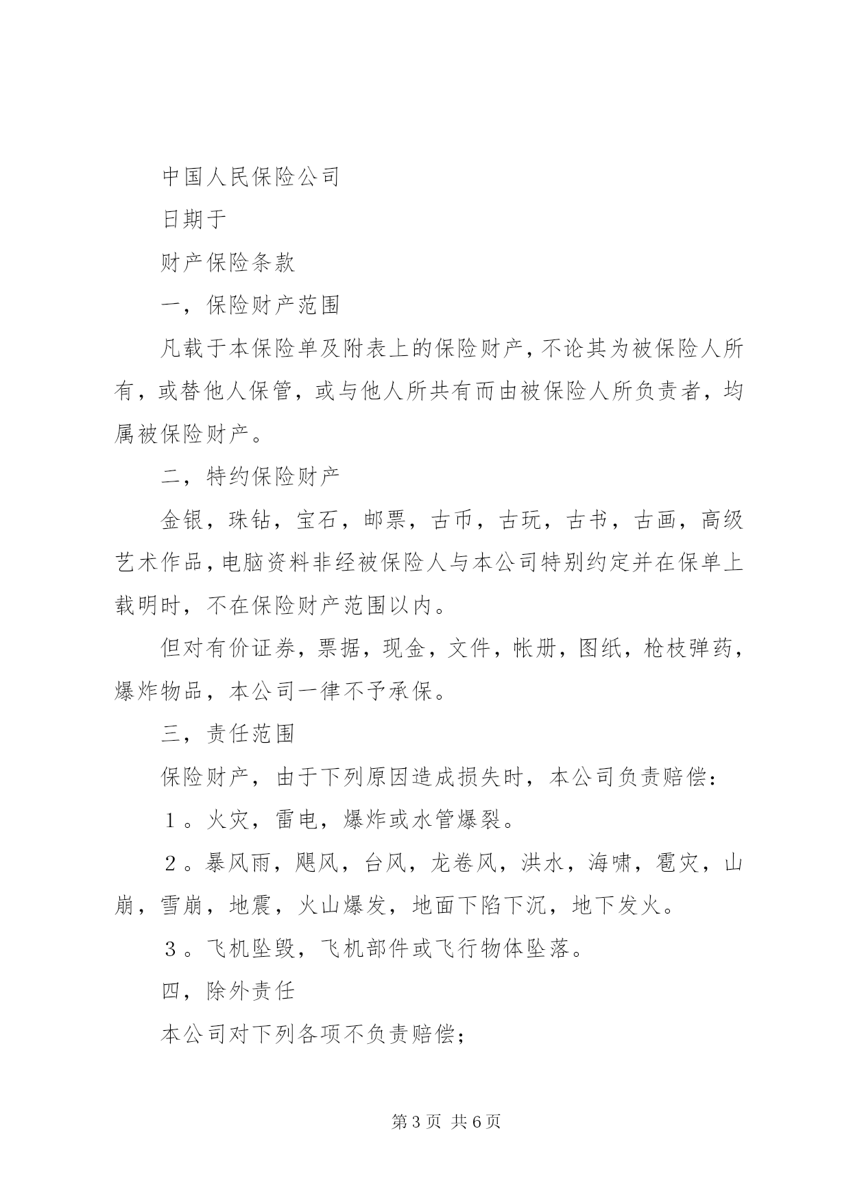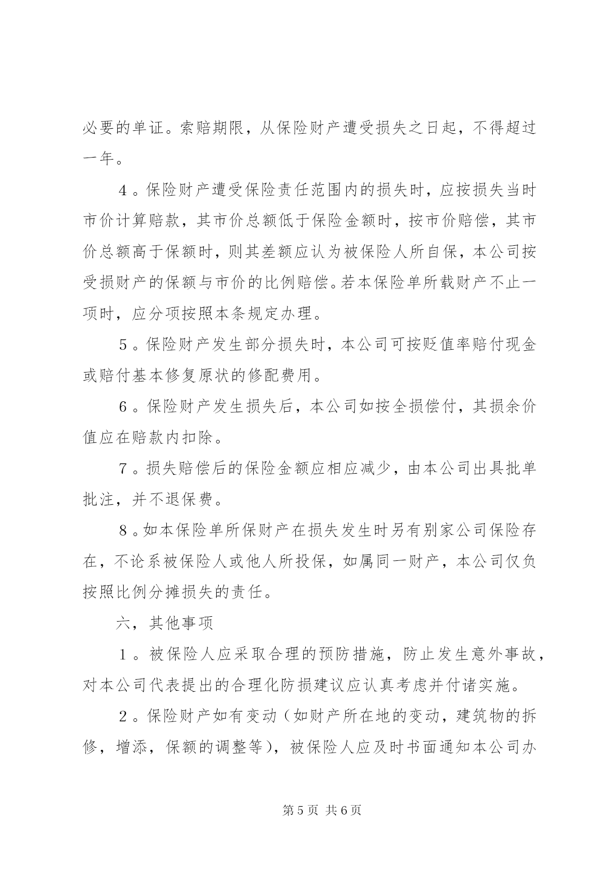第PAGE\*Arabic\*MERGEFORMAT6页共NUMPAGES\*MERGEFORMAT6页保险单(财产1)保险单(财产1)中国人民保险公司(总公司设于北京一九四九年创立)财产保险单保险单号次根据被保险人申请中国人民保险公司(以下简称本公司)在被保险人缴付约定的保险费后,按照背面所载条款和附加条款的规定,在本保险单期内,承保下述被保险人下列财产,特立本保险单。被保险人:┌──────────────────────────────────┐│保险财产及保险金额:│││├──────────────────────────────────┤│总保险金额:│├──────────────────────────────────┤│费率:│├──────────────────────────────────┤│保险费:│├──────────────────────────────────┤│保险期限:个月自至中午12时正│├──────────────────────────────────┤│保险财产地址:│├──────────────────────────────────┤│备注:│└──────────────────────────────────┘中国人民保险公司日期于财产保险条款一,保险财产范围凡载于本保险单及附表上的保险财产,不论其为被保险人所有,或替他人保管,或与他人所共有而由被保险人所负责者,均属被保险财产。二,特约保险财产金银,珠钻,宝石,邮票,古币,古玩,古书,古画,高级艺术作品,电脑资料非经被保险人与本公司特别约定并在保单上载明时,不在保险财产范围以内。但对有价证券,票据,现金,文件,帐册,图纸,枪枝弹药,爆炸物品,本公司一律不予承保。三,责任范围保险财产,由于下列原因造成损失时,本公司负责赔偿:1。火灾,雷电,爆炸或水管爆裂。2。暴风雨,飓风,台风,龙卷风,洪水,海啸,雹灾,山崩,雪崩,地震,火山爆发,地面下陷下沉,地下发火。3。飞机坠毁,飞机部件或飞行物体坠落。四,除外责任本公司对下列各项不负责赔偿;1。战争,类似战争行为,敌对行为,武装冲突,没收,征用,罢工,暴动引起的损失。2。被保险人或其代表的故意行为或重大过失引起的损失。3。直接或间接由于核反应,核子幅射和放射性污染引起的损失。4。由于超负荷,超电压,碰线,电弧,走电,短路和大气放电造成电气用具或电气设备本身的损失。5。凡因物质本身变化,自然发热,自燃或因烘焙所致财产之自身损失。6。由于当局命令而焚毁之财产。7。事故发生而引起生产停顿或营业中断等间接损失。8。堆放在露天以及在使用芦席,篷布,茅草,油毛毡做棚顶的罩棚下的保险财产,因遭受暴风雨造成的损毁。9。其他不属于第三条所承保的灾害或事故引起的损失。五,赔偿处理1。发生损失事故后,被保险人应立即通知本公司,并用书面提供详细经过。2。发生损失后被保险人应采取一切必要的措施将损失减少至最低限度,对有益的合理措施费用,本公司可予以偿付,但以不超过遭受损失财产的保额为限。3。被保险人要求赔偿时,应提供保险单,损失清单和其他必要的单证。索赔期限,从保险财产遭受损失之日起,不得超过一年。4。保险财产遭受保险责任范围内的损失时,应按损失当时市价计算赔款,其市价总额低于保险金额时,按市价赔偿,其市价总额高于保额时,则其差额应认为被保险人所自保,本公司按受损财产的保额与市价的比例赔偿。若本保险单所载财产不止一项时,应分项按照本条规定办理。5。保险财产发生部分损失时,本公司可按贬值率赔付现金或赔付基本修复原状的修配费用。6。保险财产发生损失后,本公司如按全损偿付,其损余价值应在赔款内扣除。7。损失赔偿后的保险金额应相应减少,由本公司出具批单批注,并不退保费。8。如本保险单所保财产在损失发生时另有别家公司保险存在,不论系被保险人或他人所投保,如属同一财产,本公司仅负按照比例分摊损失的责任。六,其他事项1。被保险人应采取合理的预防措施,防止发生意外事故,对本公司代表提出的合理化防损建议应认真考虑并付诸实施。2。保险财产如有变动(如财产所在地的变动,建筑物的拆修,增添,保额的调整等),被保险人应及时书面通知本公司办理批改手续。3。被保险人可随时申请注销本保险单,本公司也可在十五天前通知注销。对于保险单已生效期间的保费,前者按本公司短期费率计算,后者应按日平均计算。4。被保险人与本公司之间一切有关保险的争议应通过友好协商解决。如果协商达不成协议,可申请仲裁机构或法院审理。除事先另有协议外,仲裁或法律诉讼应在被告方所在地。