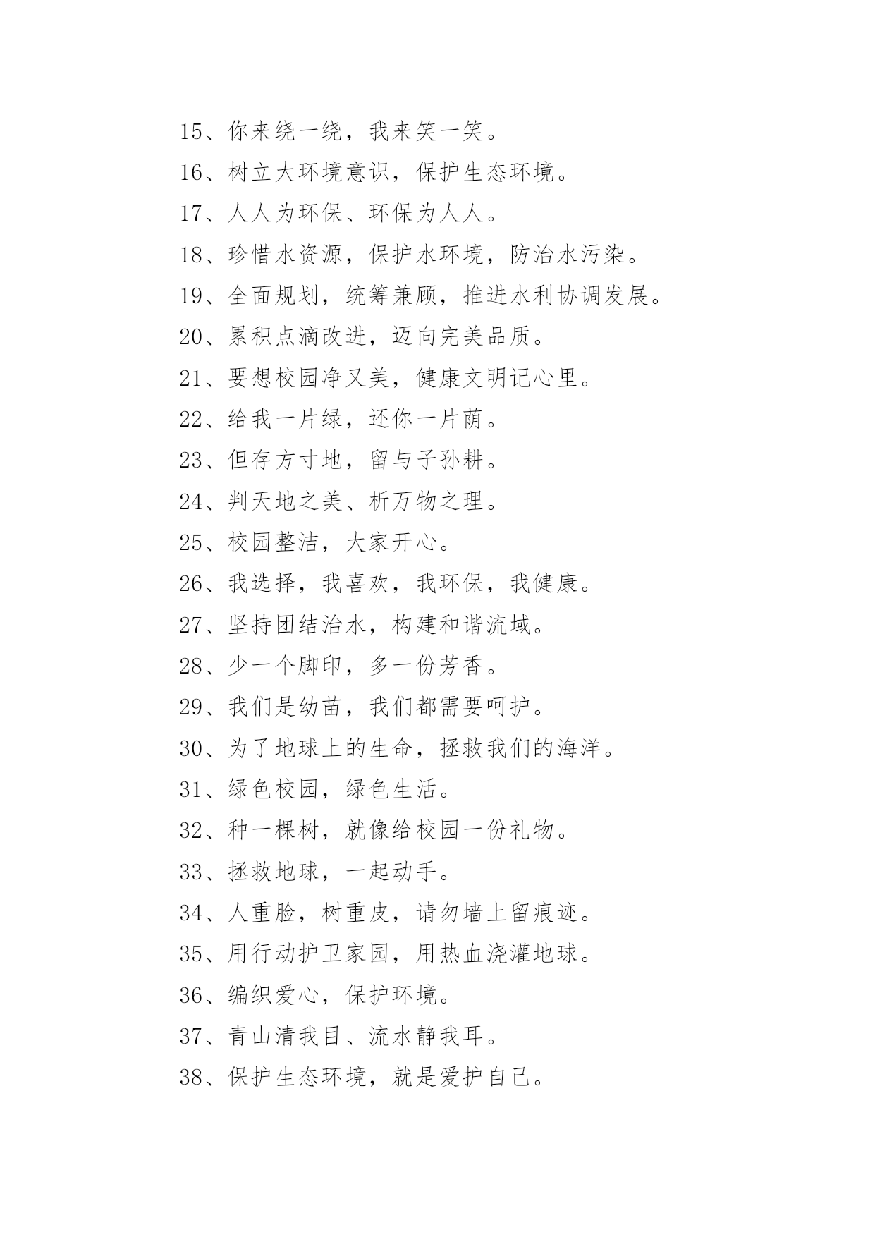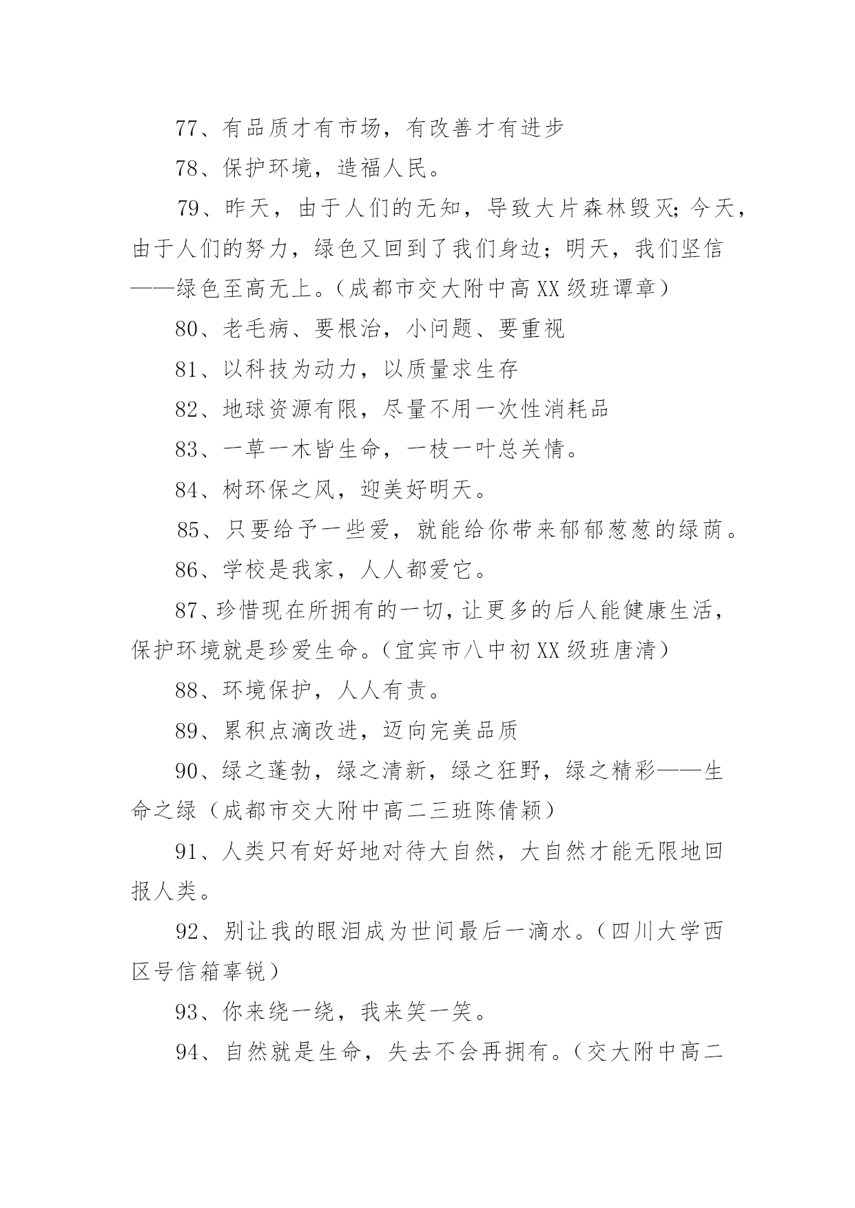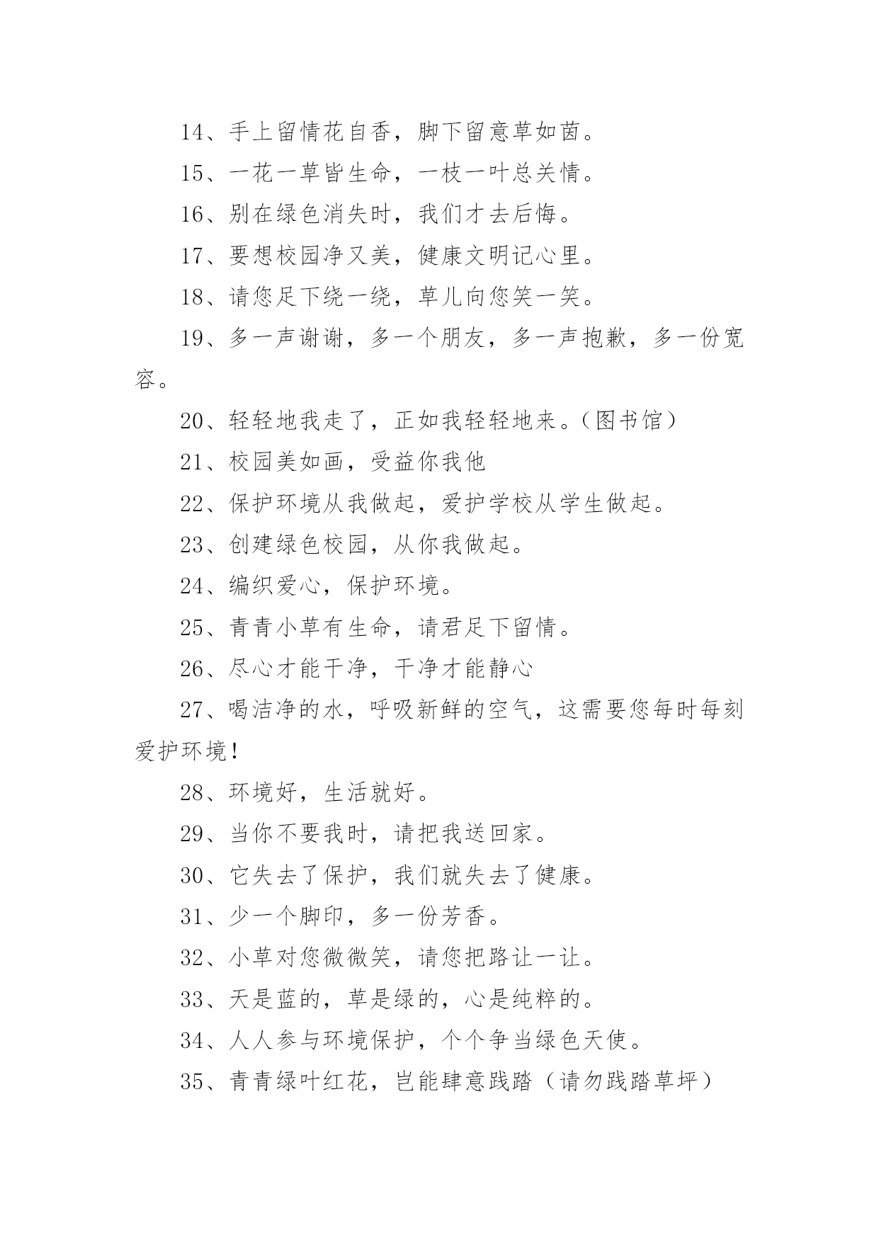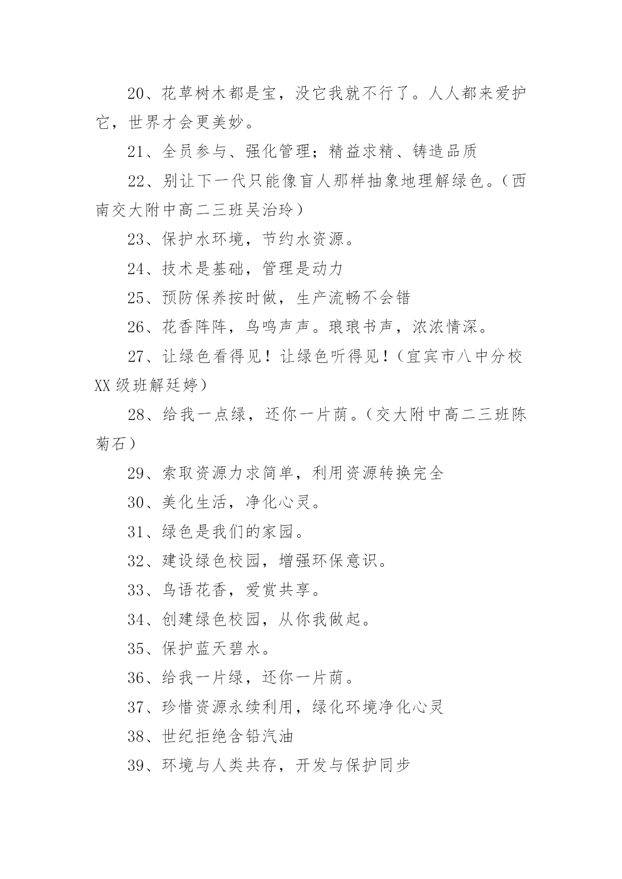 校园环保标语校园环保标语在平时的学习、工作或生活中,大家总少不了接触一些耳熟能详的标语吧,标语肩负着“社教”的使命,在影响社会舆论和文化传播中,对人们的社会行为起着不可忽视的导向作用。那什么样的标语才是经典的呢?下面是小编收集整理的校园环保标语,欢迎阅读与收藏。校园环保标语11、绿色象征生命,珍惜生命,环保第一。2、花木有情报春晖,同学爱护喜心扉。3、保护学校环境,共创学生圣地!4、给我一片绿,还你一片荫。5、让绿色看得见,让绿色听得见。6、绿色明亮了我们的眼睛,是为了让我们看清足下绿的生命。7、踏破青毡可惜,多行数步无妨。8、追求绿色时尚,拥抱绿色生活。9、手下留情花更艳,脚下留情草更翠。10、迈步留意地下草,掸指莫折枝头花。11、请您爱护绿色,绿是生命之源。12、保护环境,从我做起。13、心中有情,脚下留情。14、手上留情花自香,脚下留意草如茵。15、一花一草皆生命,一枝一叶总关情。16、别在绿色消失时,我们才去后悔。17、要想校园净又美,健康文明记心里。18、请您足下绕一绕,草儿向您笑一笑。19、多一声谢谢,多一个朋友,多一声抱歉,多一份宽容。20、轻轻地我走了,正如我轻轻地来。(图书馆)21、校园美如画,受益你我他22、保护环境从我做起,爱护学校从学生做起。23、创建绿色校园,从你我做起。24、编织爱心,保护环境。25、青青小草有生命,请君足下留情。26、尽心才能干净,干净才能静心27、喝洁净的水,呼吸新鲜的空气,这需要您每时每刻爱护环境!28、环境好,生活就好。29、当你不要我时,请把我送回家。30、它失去了保护,我们就失去了健康。31、少一个脚印,多一份芳香。32、小草对您微微笑,请您把路让一让。33、天是蓝的,草是绿的,心是纯粹的。34、人人参与环境保护,个个争当绿色天使。35、青青绿叶红花,岂能肆意践踏(请勿践踏草坪)36、请你足下绕一绕,草儿向你笑一笑!37、拯救地球,一起动手。38、劝君多走几步路,莫把草坪当马路。39、问坛哪得绿如许,为有大家来爱护!40、绿色,永恒的美;校园,永远的家!41、人人都来爱护它,世界才会更美妙。42、当你昂首阔步时,我在你脚下呻吟。43、让校园阳光普照,让绿色神圣美妙。44、你扔,我扔,无处扔;你净,我净,处处净。45、建设绿色校园,增强环保意识。46、如果没有树木,世界将会暗淡无光。47、赏花爱花花更美,观景惜景景更幽。48、同建绿色校园,共享鸟语花香。49、为了美丽家园,请从小事做起。50、我很怕羞,请别碰我!51、给我一份爱,送你一片绿。52、小草青青,花香飘飘;青草鲜花,应当爱惜。53、树环保之风,迎美好明天。54、爱护小草吧,它是春天的信使!55、注意了,每个人都看见你在这里的一举一动。(走廊)56、茵茵绿草地,脚下请留情。57、草儿绿、花儿香,环境优美人健康!58、小草正睡觉,请你勿打扰。59、鸟儿渴望洁净的天空,人类渴望绿色的家园。60、垃圾箱:请你近距离投篮。校园环保标语21、绿色校园,绿色生活。2、问坛哪得绿如许,为有大家来爱护!3、环境好,生活就好。4、小花小草传芳香,请你把路绕一绕。5、绿水青山是我家,大家不要破坏他6、要想校园净又美,健康文明记心里。7、保护环境,少说多做,让校园成为绿色的殿堂。8、青青小草有生命,请君足下留情。9、用我们的双手,爱护地球家园。(攀枝花市华山小学三二班田郑涛)10、爱无限,绿无边。11、树立大环境意识,保护生态环境。12、推动全员品质活动,提高全员工作士气13、珍爱生灵、节约资源、抵制污染、植树护绿。14、垃圾是放错位置的资源15、时时寻求效率进步,事事讲究方法技术16、不要让我们现在拥有的,成为我们将来所羡慕的!(交大附中高二三班刘晓羽)17、多一份绿色,多一份健康。18、团队精神,是企业文化的核心19、清扫清洁坚持做,亮丽环境真不错20、花草树木都是宝,没它我就不行了。人人都来爱护它,世界才会更美妙。21、全员参与、强化管理;精益求精、铸造品质22、别让下一代只能像盲人那样抽象地理解绿色。(西南交大附中高二三班吴治玲)23、保护水环境,节约水资源。24、技术是基础,管理是动力25、预防保养按时做,生产流畅不会错26、花香阵阵,鸟鸣声声。琅琅书声,浓浓情深。27、让绿色看得见!让绿色听得见!(宜宾市八中分校XX级班解廷婷)28、给我一点绿,还你一片荫。(交大附中高二三班陈菊石)29、索取资源力求简单,利用资源转换完全30、美化生活,净化心灵。31、绿色是我们的家园。32、建设绿色校园,增强环保意识。33、鸟语花香,爱赏共享。34、创建绿色校园,从你我做起。35、保护蓝天碧水。36、给我一片绿,还你一片荫。37、珍惜资源永续利用,绿化环境净化心灵38、世纪拒绝含铅汽油39、环境与人类共存,开发与保护同步40、判天地之