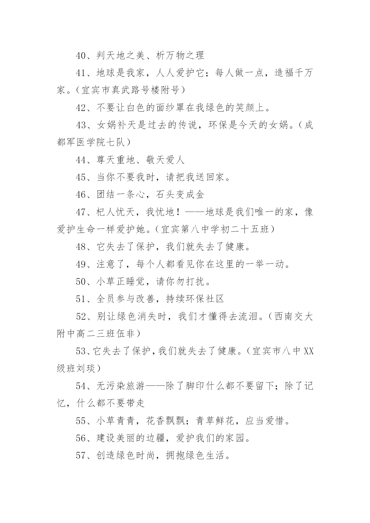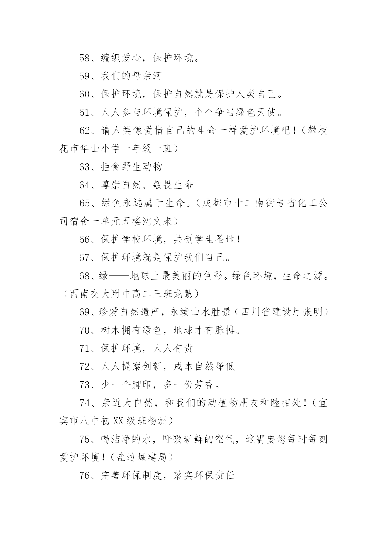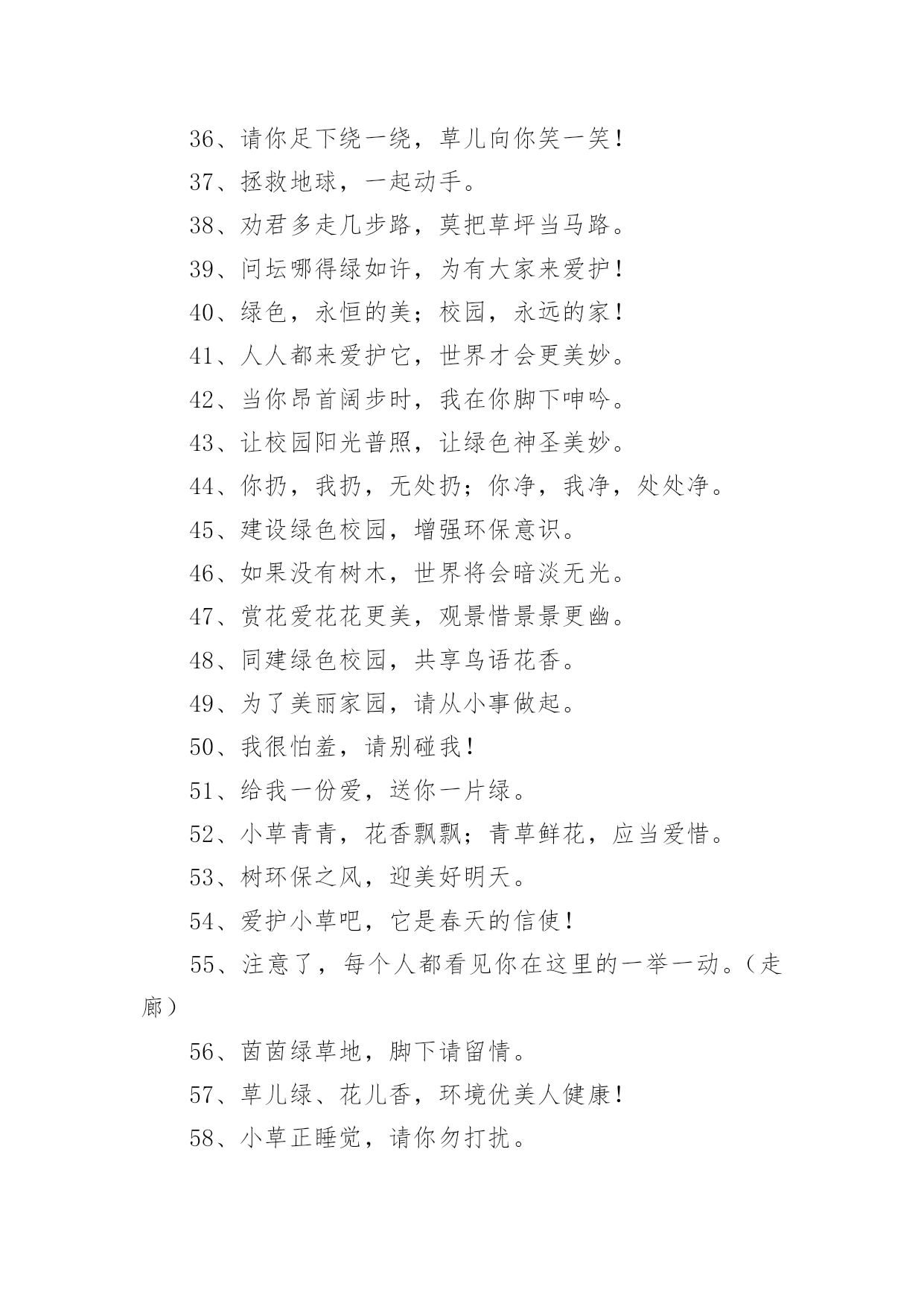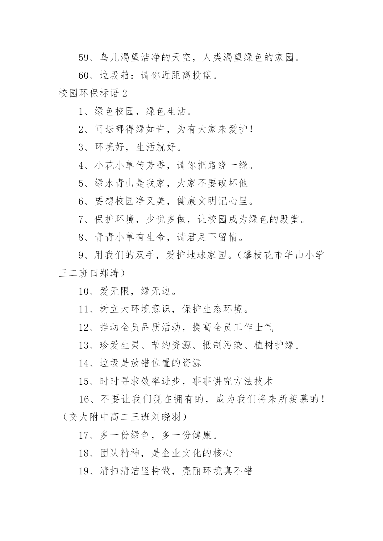 校园环保标语校园环保标语在平时的学习、工作或生活中,大家总少不了接触一些耳熟能详的标语吧,标语肩负着“社教”的使命,在影响社会舆论和文化传播中,对人们的社会行为起着不可忽视的导向作用。那什么样的标语才是经典的呢?下面是小编收集整理的校园环保标语,欢迎阅读与收藏。校园环保标语11、绿色象征生命,珍惜生命,环保第一。2、花木有情报春晖,同学爱护喜心扉。3、保护学校环境,共创学生圣地!4、给我一片绿,还你一片荫。5、让绿色看得见,让绿色听得见。6、绿色明亮了我们的眼睛,是为了让我们看清足下绿的生命。7、踏破青毡可惜,多行数步无妨。8、追求绿色时尚,拥抱绿色生活。9、手下留情花更艳,脚下留情草更翠。10、迈步留意地下草,掸指莫折枝头花。11、请您爱护绿色,绿是生命之源。12、保护环境,从我做起。13、心中有情,脚下留情。14、手上留情花自香,脚下留意草如茵。15、一花一草皆生命,一枝一叶总关情。16、别在绿色消失时,我们才去后悔。17、要想校园净又美,健康文明记心里。18、请您足下绕一绕,草儿向您笑一笑。19、多一声谢谢,多一个朋友,多一声抱歉,多一份宽容。20、轻轻地我走了,正如我轻轻地来。(图书馆)21、校园美如画,受益你我他22、保护环境从我做起,爱护学校从学生做起。23、创建绿色校园,从你我做起。24、编织爱心,保护环境。25、青青小草有生命,请君足下留情。26、尽心才能干净,干净才能静心27、喝洁净的水,呼吸新鲜的空气,这需要您每时每刻爱护环境!28、环境好,生活就好。29、当你不要我时,请把我送回家。30、它失去了保护,我们就失去了健康。31、少一个脚印,多一份芳香。32、小草对您微微笑,请您把路让一让。33、天是蓝的,草是绿的,心是纯粹的。34、人人参与环境保护,个个争当绿色天使。35、青青绿叶红花,岂能肆意践踏(请勿践踏草坪)36、请你足下绕一绕,草儿向你笑一笑!37、拯救地球,一起动手。38、劝君多走几步路,莫把草坪当马路。39、问坛哪得绿如许,为有大家来爱护!40、绿色,永恒的美;校园,永远的家!41、人人都来爱护它,世界才会更美妙。42、当你昂首阔步时,我在你脚下呻吟。43、让校园阳光普照,让绿色神圣美妙。44、你扔,我扔,无处扔;你净,我净,处处净。45、建设绿色校园,增强环保意识。46、如果没有树木,世界将会暗淡无光。47、赏花爱花花更美,观景惜景景更幽。48、同建绿色校园,共享鸟语花香。49、为了美丽家园,请从小事做起。50、我很怕羞,请别碰我!51、给我一份爱,送你一片绿。52、小草青青,花香飘飘;青草鲜花,应当爱惜。53、树环保之风,迎美好明天。54、爱护小草吧,它是春天的信使!55、注意了,每个人都看见你在这里的一举一动。(走廊)56、茵茵绿草地,脚下请留情。57、草儿绿、花儿香,环境优美人健康!58、小草正睡觉,请你勿打扰。59、鸟儿渴望洁净的天空,人类渴望绿色的家园。60、垃圾箱:请你近距离投篮。校园环保标语21、绿色校园,绿色生活。2、问坛哪得绿如许,为有大家来爱护!3、环境好,生活就好。4、小花小草传芳香,请你把路绕一绕。5、绿水青山是我家,大家不要破坏他6、要想校园净又美,健康文明记心里。7、保护环境,少说多做,让校园成为绿色的殿堂。8、青青小草有生命,请君足下留情。9、用我们的双手,爱护地球家园。(攀枝花市华山小学三二班田郑涛)10、爱无限,绿无边。11、树立大环境意识,保护生态环境。12、推动全员品质活动,提高全员工作士气13、珍爱生灵、节约资源、抵制污染、植树护绿。14、垃圾是放错位置的资源15、时时寻求效率进步,事事讲究方法技术16、不要让我们现在拥有的,成为我们将来所羡慕的!(交大附中高二三班刘晓羽)17、多一份绿色,多一份健康。18、团队精神,是企业文化的核心19、清扫清洁坚持做,亮丽环境真不错20、花草树木都是宝,没它我就不行了。人人都来爱护它,世界才会更美妙。21、全员参与、强化管理;精益求精、铸造品质22、别让下一代只能像盲人那样抽象地理解绿色。(西南交大附中高二三班吴治玲)23、保护水环境,节约水资源。24、技术是基础,管理是动力25、预防保养按时做,生产流畅不会错26、花香阵阵,鸟鸣声声。琅琅书声,浓浓情深。27、让绿色看得见!让绿色听得见!(宜宾市八中分校XX级班解廷婷)28、给我一点绿,还你一片荫。(交大附中高二三班陈菊石)29、索取资源力求简单,利用资源转换完全30、美化生活,净化心灵。31、绿色是我们的家园。32、建设绿色校园,增强环保意识。33、鸟语花香,爱赏共享。34、创建绿色校园,从你我做起。35、保护蓝天碧水。36、给我一片绿,还你一片荫。37、珍惜资源永续利用,绿化环境净化心灵38、世纪拒绝含铅汽油39、环境与人类共存,开发与保护同步40、判天地之