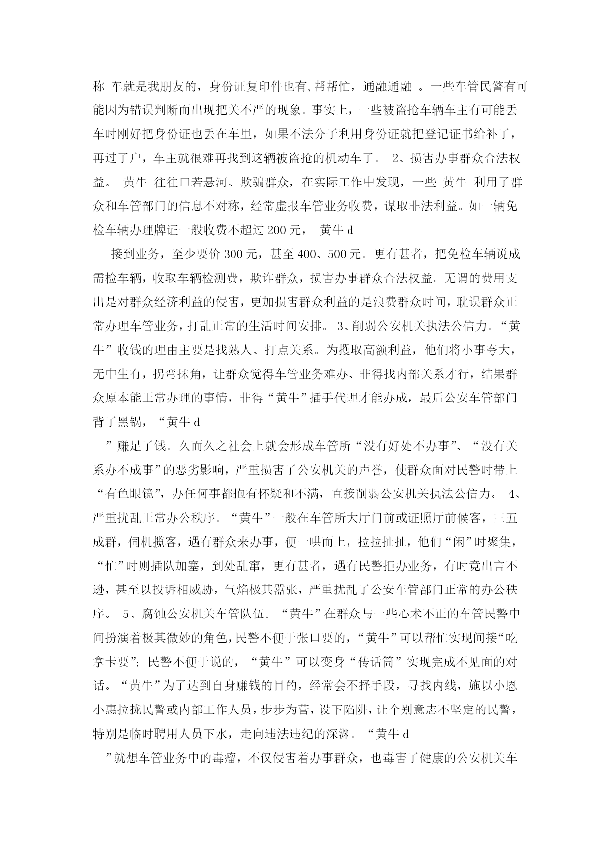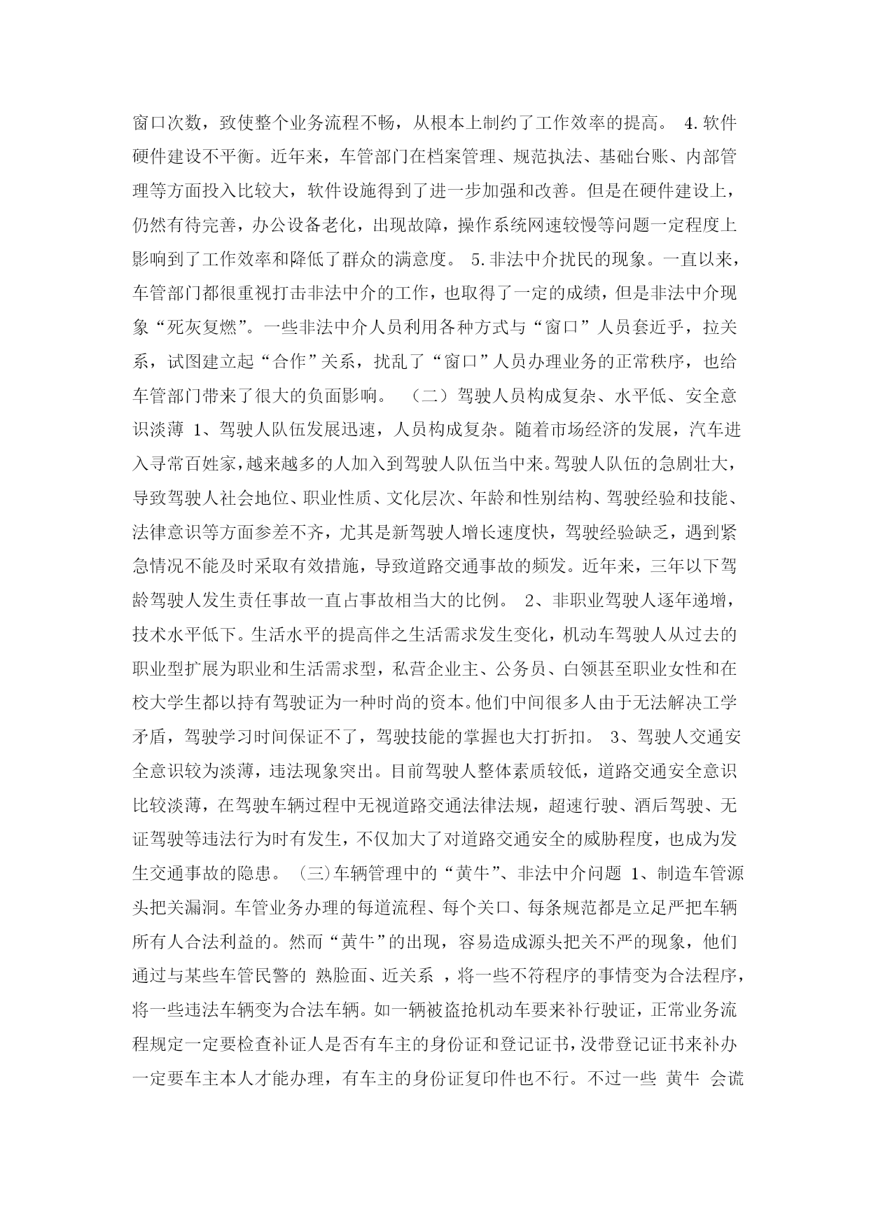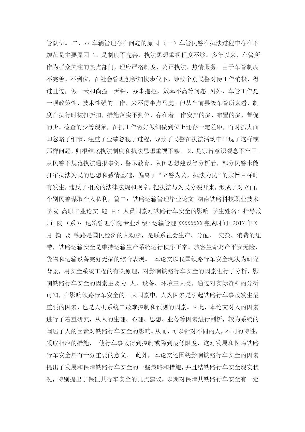 浅谈车辆运输管理论文篇一:浅谈xx市车辆管理问题论文中央广播电视大学人才培养模式改革和开放试点江苏广播电视大学行政管理专业毕业题目浅谈姓名xx学号指导教师职称中高教学点广播电视大学答辩日期xx市车辆管理浅谈xx车辆管理问题内容摘要:车辆管理是公安交通管理工作的重要组成部分,担负着为全市驾驶人的驾驶证发放、换证、验证和机动车的上牌、审验等工作,是公安机关对外的“窗口”,也是预防和减少道路交通事故的源头。在经济社会快速发展,车辆、驾驶人迅速增长的形式下,车管工作任务越来越繁重,车辆的管理日益成为日常事务中的一项重要的工作内容。通过进行探究,发现问题,理解问题,解决问题,不断创新,不断增强车管工作科学性和管理水平。关键词:车辆管理、一窗式、解决问题、科学性车管所的工作是公安交通管理工作的重要组成部分,是一项政策性、业务性、群众性较强的工作,车管所工作开展的好与否,越来越受到广大人民群众关注。随着我国经济社会快速发展,人民群众整体生活水平的逐步提高,机动车拥有量猛增,车管所的各项业务量大大增加,任务也越来越重。《道路交通安全法》的实施以及三基工程建设步伐的加快,对车管所工作的要求标准也越来越高,如何适应新形势要求,进一步转变观念,提升服务水平,对每个基层车管所都是一个新的课题。为此,根据我市的车管所工作实际,谈谈对提升车管服务效能的认识。一、xx车辆管理中存在的问题(一)车管所民警执法活动不规范1、服务意识淡薄。作为“窗口”部门,办事民警执法为民的思想不牢固、不端正,“冷、横、硬、推”现象还时有出现,对群众态度还不够热情,这些现象还没有彻底消除。2、辅警业务知识有待更新。车管辅警由于大量时间都忙于车辆检验、业务登记等工作,很少有时间参加相关的业务培训,还有些只是在上岗前通过简单的岗前培训,没有通过系统的学习,久而久之对相关法律法规只是不够熟悉的掌握,往往在工作中遇到办事群众咨询、办理业务和办事群众提出质疑时,不能给予及时有效的答复,有些工作还不能突破传统模式,部分只是被动的适应工作需要。3、车管工作窗口岗位流程设置不合理。“一窗式”服务的工作方式是车管工作中的一大特色,但在实际的车管作中在“一窗式”服务方面还存在着诸多不完善的因素,现实中还存在着群众由于受条件所限需要到另一个窗口完成缴费,然后再回到受理窗口继续办理后续业务的情况,增加了往返窗口次数,致使整个业务流程不畅,从根本上制约了工作效率的提高。4.软件硬件建设不平衡。近年来,车管部门在档案管理、规范执法、基础台账、内部管理等方面投入比较大,软件设施得到了进一步加强和改善。但是在硬件建设上,仍然有待完善,办公设备老化,出现故障,操作系统网速较慢等问题一定程度上影响到了工作效率和降低了群众的满意度。5.非法中介扰民的现象。一直以来,车管部门都很重视打击非法中介的工作,也取得了一定的成绩,但是非法中介现象“死灰复燃”。一些非法中介人员利用各种方式与“窗口”人员套近乎,拉关系,试图建立起“合作”关系,扰乱了“窗口”人员办理业务的正常秩序,也给车管部门带来了很大的负面影响。(二)驾驶人员构成复杂、水平低、安全意识淡薄1、驾驶人队伍发展迅速,人员构成复杂。随着市场经济的发展,汽车进入寻常百姓家,越来越多的人加入到驾驶人队伍当中来。驾驶人队伍的急剧壮大,导致驾驶人社会地位、职业性质、文化层次、年龄和性别结构、驾驶经验和技能、法律意识等方面参差不齐,尤其是新驾驶人增长速度快,驾驶经验缺乏,遇到紧急情况不能及时采取有效措施,导致道路交通事故的频发。近年来,三年以下驾龄驾驶人发生责任事故一直占事故相当大的比例。2、非职业驾驶人逐年递增,技术水平低下。生活水平的提高伴之生活需求发生变化,机动车驾驶人从过去的职业型扩展为职业和生活需求型,私营企业主、公务员、白领甚至职业女性和在校大学生都以持有驾驶证为一种时尚的资本。他们中间很多人由于无法解决工学矛盾,驾驶学习时间保证不了,驾驶技能的掌握也大打折扣。3、驾驶人交通安全意识较为淡薄,违法现象突出。目前驾驶人整体素质较低,道路交通安全意识比较淡薄,在驾驶车辆过程中无视道路交通法律法规,超速行驶、酒后驾驶、无证驾驶等违法行为时有发生,不仅加大了对道路交通安全的威胁程度,也成为发生交通事故的隐患。(三)车辆管理中的“黄牛”、非法中介问题1、制造车管源头把关漏洞。车管业务办理的每道流程、每个关口、每条规范都是立足严把车辆所有人合法利益的。然而“黄牛”的出现,容易造成源头把关不严的现象,他们通过与某些车管民警的熟脸面、近关系,将一些不符程序的事情变为合法程序,将一些违法车辆变为合法车辆。如一辆被盗抢机动车要来补行驶证,正常业务流程规定一定要检查补证人是否有车主的身份证和登记证书,没带登记证书来补办一定要车主本人才能办理,有车主的身份证复印件也不行。不过一些黄牛会