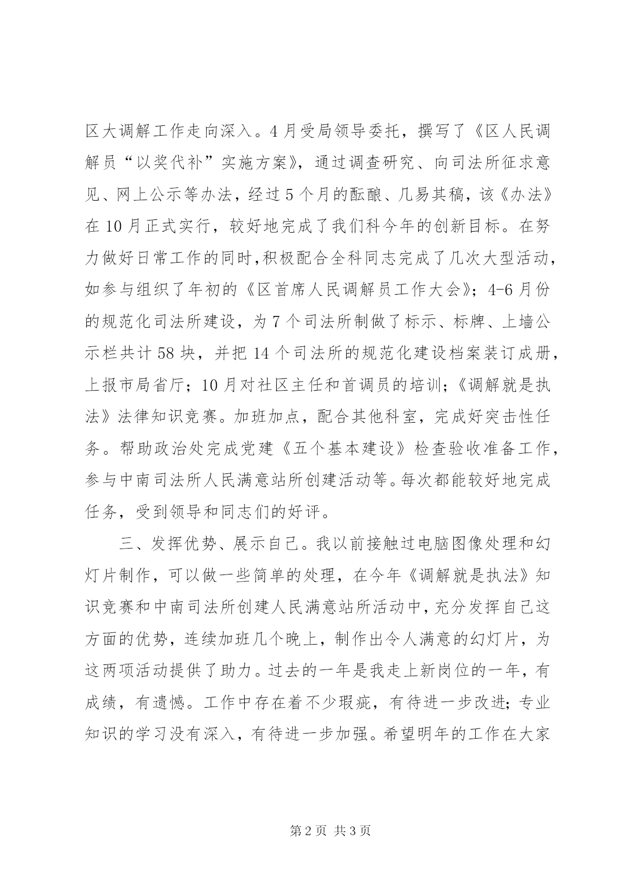 第PAGE\*Arabic\*MERGEFORMAT3页共NUMPAGES\*MERGEFORMAT3页司法局基层科述职述廉报告回顾匆匆走过的一年,在局领导的关心下,在我们科周科长、鲍科长的指导下,在在座的全体同事的帮助下,使我能够较快地溶入司法局这个大集体,尽快地适应自己的角色,初步掌握基层科的工作技能,较好地完成各项工作任务。下面我将一年来的学习、工作体会向大家做个汇报,不当之处,请大家指正。一、认真学习、学以致用。我在部队是从事通信工作,对司法系统根本就没有接触过,刚到司法局确实感到无所适从,怎么办。只有通过不断地学习。只有通过学习,才能了解司法工作的特点,适应司法工作的要求,掌握做好司法工作的能力。记得刚到司法局的时候,正好临近春节,工作相对不忙,科长把20xx年下半年的《中国司法》和《人民调解》、《司法工作实务》等资料拿来让我学习,经过半个多月的认真学习,对将要从事的行业有了初步印象。慢慢地接触科里的工作,经常和司法所的同志们打交道,对自己专业知识的欠缺也就有了一个明确的认识。通过在工作中查找资料、向老同志请教,不断丰富自己的知识积累,做到了在工作中学习、在学习中提升工作能力。二、努力工作、做出成绩。基层科的工作比较繁杂,任务也比较多,既要做好上级交办的任务,又要服务指导好司法所。一年来,我共撰写了各类文稿70余篇、信息10余篇,下司法所调研学习近30多次。为提高广大人民调解员的工作热情,引导全区大调解工作走向深入。4月受局领导委托,撰写了《区人民调解员“以奖代补”实施方案》,通过调查研究、向司法所征求意见、网上公示等办法,经过5个月的酝酿、几易其稿,该《办法》在10月正式实行,较好地完成了我们科今年的创新目标。在努力做好日常工作的同时,积极配合全科同志完成了几次大型活动,如参与组织了年初的《区首席人民调解员工作大会》;4-6月份的规范化司法所建设,为7个司法所制做了标示、标牌、上墙公示栏共计58块,并把14个司法所的规范化建设档案装订成册,上报市局省厅;10月对社区主任和首调员的培训;《调解就是执法》法律知识竞赛。加班加点,配合其他科室,完成好突击性任务。帮助政治处完成党建《五个基本建设》检查验收准备工作,参与中南司法所人民满意站所创建活动等。每次都能较好地完成任务,受到领导和同志们的好评。三、发挥优势、展示自己。我以前接触过电脑图像处理和幻灯片制作,可以做一些简单的处理,在今年《调解就是执法》知识竞赛和中南司法所创建人民满意站所活动中,充分发挥自己这方面的优势,连续加班几个晚上,制作出令人满意的幻灯片,为这两项活动提供了助力。过去的一年是我走上新岗位的一年,有成绩,有遗憾。工作中存在着不少瑕疵,有待进一步改进;专业知识的学习没有深入,有待进一步加强。希望明年的工作在大家的帮助指导下做得更好。谢谢大家。