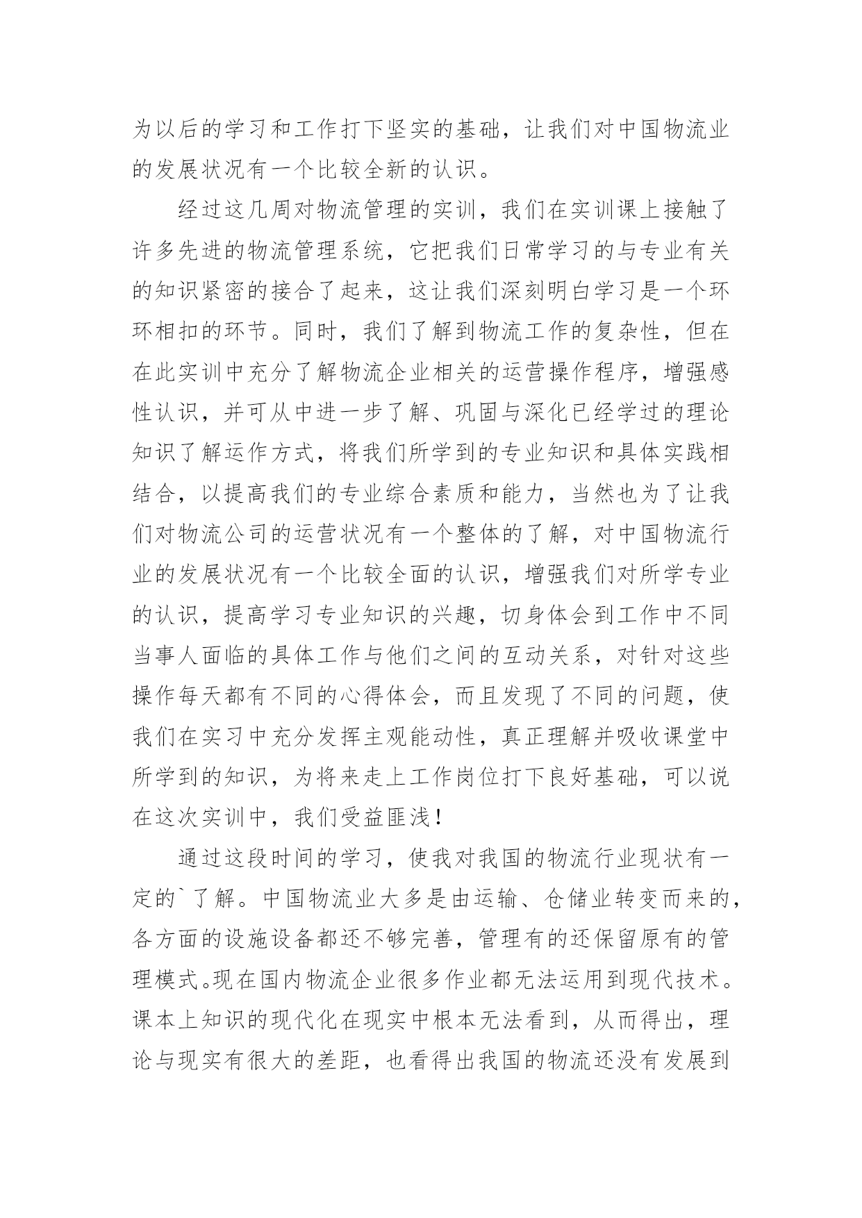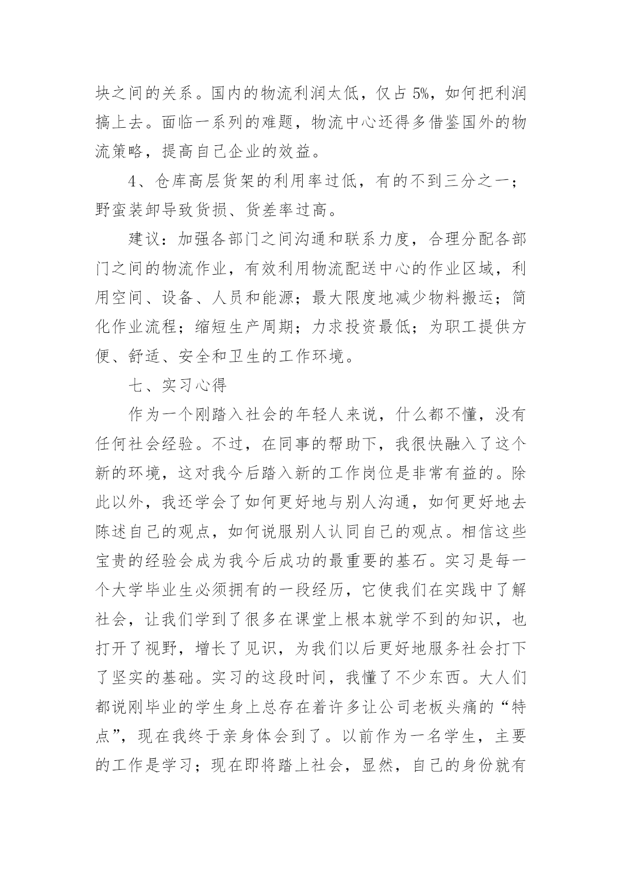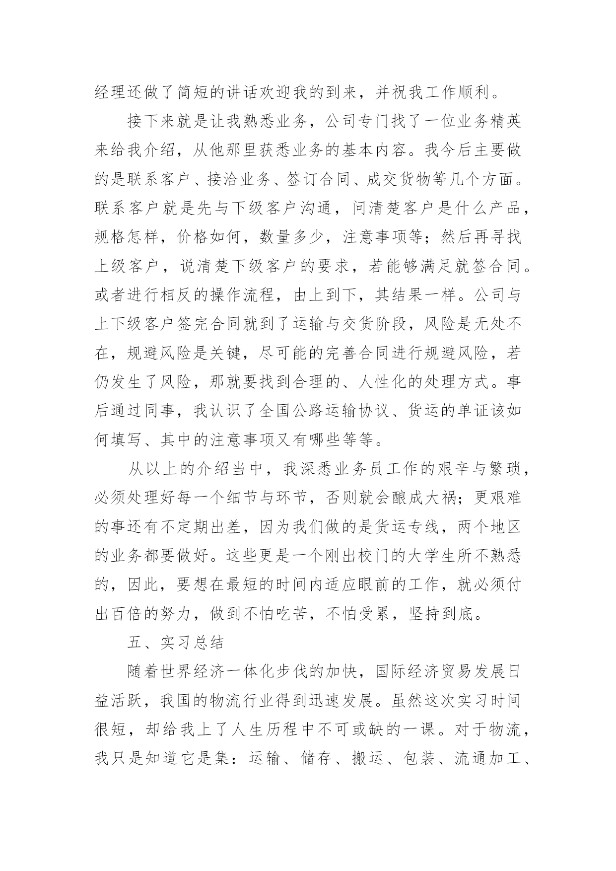 物流公司的实习心得体会物流公司的实习心得体会导语:初步认识社会,进一步了解货代以及物流运输组织与管理的相关识知,做到学以致用,下面是小编为大家整理的物流公司实习心得体会,欢迎参考。物流公司的实习心得体会1一、实习目的初步认识社会,进一步了解货代以及物流运输组织与管理的相关识知,做到学以致用,把从学校学到的理论识知与实际工作中的实践贯穿起来,从社会实践中,逐步完善自我、发展自我,最终完全融入现实生活当中,做一名言出必行、识知与能力兼备、符合社会主义发展目标的合格大学生。主要是为了了解物流的作业流程,以便对我国的物流业能有更深的了解。二、实习要求了解物流的特点,主要设备和作业流程,对其进行分析。并依据学习的理论提出自己的意见。四、实习过程第一天走进宽敞明亮的办公大楼,心情特别激动,期待着成为其中的一员。当走进办公室的一刹那,就遇见了我们的经理,他带着我认识了一下公司的业务人员,他们很热情地介绍了自已的职务和姓名,这使得我刚到非常温馨。简单聊了几句后就开始介绍我的工作性质和工作任务安排,最后经理还做了简短的讲话欢迎我的到来,并祝我工作顺利。接下来就是让我熟悉业务,公司专门找了一位业务精英来给我介绍,从他那里获悉业务的基本内容。我今后主要做的是联系客户、接洽业务、签订合同、成交货物等几个方面。联系客户就是先与下级客户沟通,问清楚客户是什么产品,规格怎样,价格如何,数量多少,注意事项等;然后再寻找上级客户,说清楚下级客户的要求,若能够满足就签合同。或者进行相反的操作流程,由上到下,其结果一样。公司与上下级客户签完合同就到了运输与交货阶段,风险是无处不在,规避风险是关键,尽可能的完善合同进行规避风险,若仍发生了风险,那就要找到合理的、人性化的处理方式。事后通过同事,我认识了全国公路运输协议、货运的单证该如何填写、其中的注意事项又有哪些等等。从以上的介绍当中,我深悉业务员工作的艰辛与繁琐,必须处理好每一个细节与环节,否则就会酿成大祸;更艰难的事还有不定期出差,因为我们做的是货运专线,两个地区的业务都要做好。这些更是一个刚出校门的大学生所不熟悉的,因此,要想在最短的时间内适应眼前的工作,就必须付出百倍的努力,做到不怕吃苦,不怕受累,坚持到底。五、实习总结随着世界经济一体化步伐的加快,国际经济贸易发展日益活跃,我国的物流行业得到迅速发展。虽然这次实习时间很短,却给我上了人生历程中不可或缺的一课。对于物流,我只是知道它是集:运输、储存、搬运、包装、流通加工、配送、信息处理等基本功能实施的有机结合。但没有想到它的实际操作却没有这么的简单。通过这一点作为国人的物流人士有着切肤的体会。货物运转速度慢,货差货损率高难以避免,高层货架利用率严天的简单了解,使我对于物流配送有了更加深刻的认识。中国的物流业虽然没有国外发达,但这并代表中国物流业的落后,一些原则性(譬如中国劳动力廉价的国情)严重的制约了中国物流业信息技术化的发展速度。野蛮的装卸态度更是制约中国物流业发展的瓶颈之一。这次实习让我从实践中了解到了物流,使实践与理论更好的结合。在这里我深刻的领悟到了一个观点:推动你的事业,不要让你的事业来推动你。六、实习结论及建议1、进货堆放货物时不能只顾着一时的方便,应该考虑到出货时的方便,不能耽误客户的时间,因此要按照标准把货物堆起,堆放要整齐合理,以免倒塌。2、要严格按照仓储管理的要求,对于过期的货物要及时与厂家联系,并得到应允后及时销毁,不要堆积在仓库中,浪费仓库容积,更不要和正常的商品同放一起,带给人一种杂乱无章的感觉。应该另外准备一间仓库,使那些一时无法销毁的商品有地方储存。3、目前物流中心正面临许多问题,批次越来越多而批量却越来越小,造成物流管理上的一个难点。产前物流,企业内部物流,销售物流,在供应链的管理上如何把握住这三块之间的关系。国内的物流利润太低,仅占5%,如何把利润搞上去。面临一系列的难题,物流中心还得多借鉴国外的物流策略,提高自己企业的效益。4、仓库高层货架的利用率过低,有的不到三分之一;野蛮装卸导致货损、货差率过高。建议:加强各部门之间沟通和联系力度,合理分配各部门之间的物流作业,有效利用物流配送中心的作业区域,利用空间、设备、人员和能源;最大限度地减少物料搬运;简化作业流程;缩短生产周期;力求投资最低;为职工提供方便、舒适、安全和卫生的工作环境。七、实习心得作为一个刚踏入社会的年轻人来说,什么都不懂,没有任何社会经验。不过,在同事的帮助下,我很快融入了这个新的环境,这对我今后踏入新的工作岗位是非常有益的。除此以外,我还学会了如何更好地与别人沟通,如何更好地去陈述自己的观点,如何说服别人认同自己的观点。相信这些宝贵的经验会成为我今后成功的最重要的基石。实习是每一个大学毕业生必须拥有的一段经历,它使我们在实践中了解社会,让我们学到了很多在