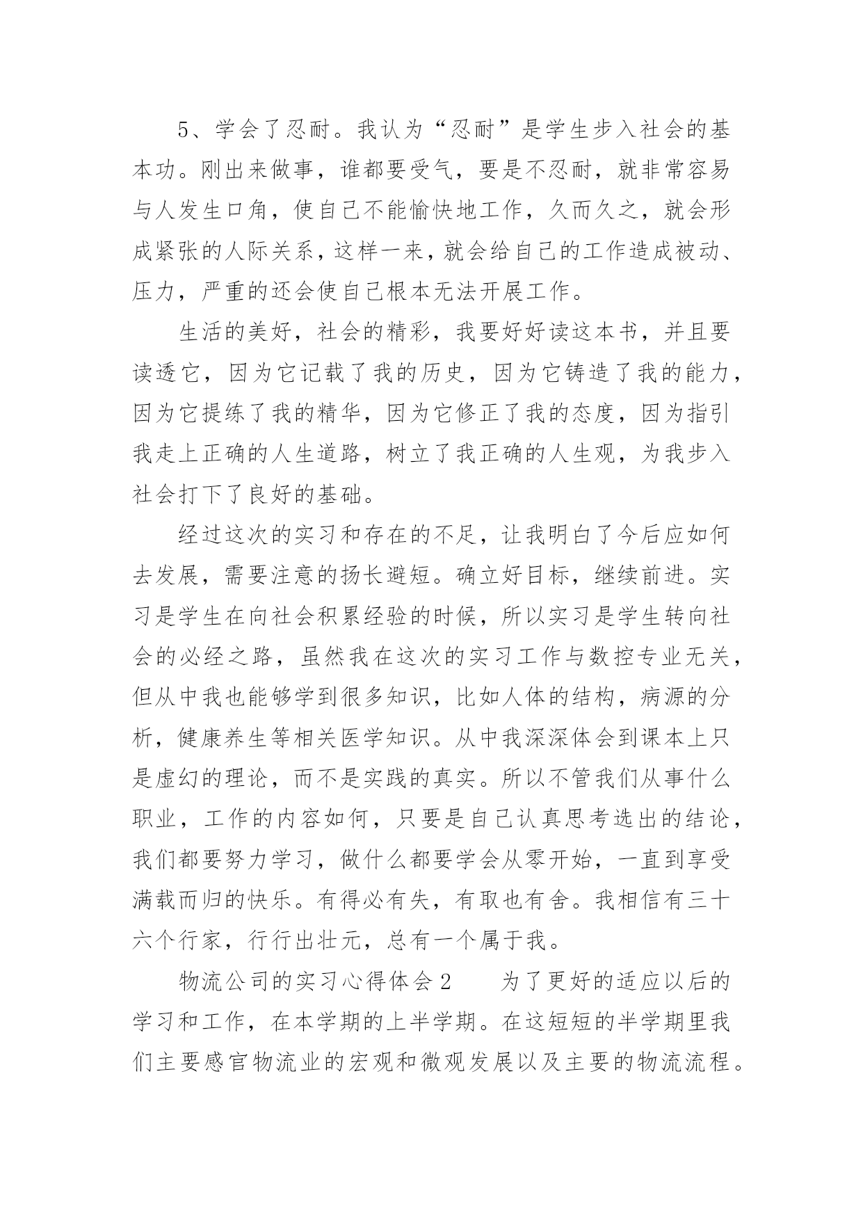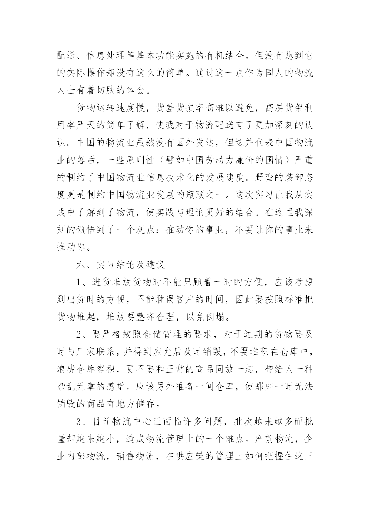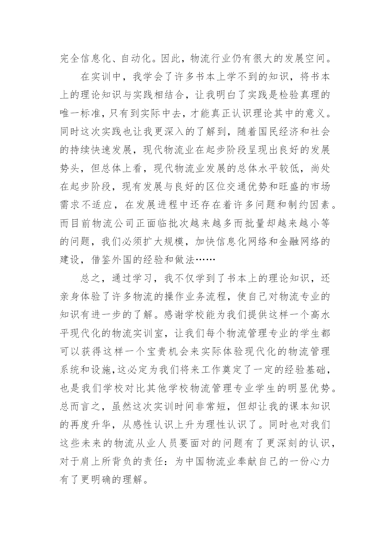 物流公司的实习心得体会物流公司的实习心得体会导语:初步认识社会,进一步了解货代以及物流运输组织与管理的相关识知,做到学以致用,下面是小编为大家整理的物流公司实习心得体会,欢迎参考。物流公司的实习心得体会1一、实习目的初步认识社会,进一步了解货代以及物流运输组织与管理的相关识知,做到学以致用,把从学校学到的理论识知与实际工作中的实践贯穿起来,从社会实践中,逐步完善自我、发展自我,最终完全融入现实生活当中,做一名言出必行、识知与能力兼备、符合社会主义发展目标的合格大学生。主要是为了了解物流的作业流程,以便对我国的物流业能有更深的了解。二、实习要求了解物流的特点,主要设备和作业流程,对其进行分析。并依据学习的理论提出自己的意见。四、实习过程第一天走进宽敞明亮的办公大楼,心情特别激动,期待着成为其中的一员。当走进办公室的一刹那,就遇见了我们的经理,他带着我认识了一下公司的业务人员,他们很热情地介绍了自已的职务和姓名,这使得我刚到非常温馨。简单聊了几句后就开始介绍我的工作性质和工作任务安排,最后经理还做了简短的讲话欢迎我的到来,并祝我工作顺利。接下来就是让我熟悉业务,公司专门找了一位业务精英来给我介绍,从他那里获悉业务的基本内容。我今后主要做的是联系客户、接洽业务、签订合同、成交货物等几个方面。联系客户就是先与下级客户沟通,问清楚客户是什么产品,规格怎样,价格如何,数量多少,注意事项等;然后再寻找上级客户,说清楚下级客户的要求,若能够满足就签合同。或者进行相反的操作流程,由上到下,其结果一样。公司与上下级客户签完合同就到了运输与交货阶段,风险是无处不在,规避风险是关键,尽可能的完善合同进行规避风险,若仍发生了风险,那就要找到合理的、人性化的处理方式。事后通过同事,我认识了全国公路运输协议、货运的单证该如何填写、其中的注意事项又有哪些等等。从以上的介绍当中,我深悉业务员工作的艰辛与繁琐,必须处理好每一个细节与环节,否则就会酿成大祸;更艰难的事还有不定期出差,因为我们做的是货运专线,两个地区的业务都要做好。这些更是一个刚出校门的大学生所不熟悉的,因此,要想在最短的时间内适应眼前的工作,就必须付出百倍的努力,做到不怕吃苦,不怕受累,坚持到底。五、实习总结随着世界经济一体化步伐的加快,国际经济贸易发展日益活跃,我国的物流行业得到迅速发展。虽然这次实习时间很短,却给我上了人生历程中不可或缺的一课。对于物流,我只是知道它是集:运输、储存、搬运、包装、流通加工、配送、信息处理等基本功能实施的有机结合。但没有想到它的实际操作却没有这么的简单。通过这一点作为国人的物流人士有着切肤的体会。货物运转速度慢,货差货损率高难以避免,高层货架利用率严天的简单了解,使我对于物流配送有了更加深刻的认识。中国的物流业虽然没有国外发达,但这并代表中国物流业的落后,一些原则性(譬如中国劳动力廉价的国情)严重的制约了中国物流业信息技术化的发展速度。野蛮的装卸态度更是制约中国物流业发展的瓶颈之一。这次实习让我从实践中了解到了物流,使实践与理论更好的结合。在这里我深刻的领悟到了一个观点:推动你的事业,不要让你的事业来推动你。六、实习结论及建议1、进货堆放货物时不能只顾着一时的方便,应该考虑到出货时的方便,不能耽误客户的时间,因此要按照标准把货物堆起,堆放要整齐合理,以免倒塌。2、要严格按照仓储管理的要求,对于过期的货物要及时与厂家联系,并得到应允后及时销毁,不要堆积在仓库中,浪费仓库容积,更不要和正常的商品同放一起,带给人一种杂乱无章的感觉。应该另外准备一间仓库,使那些一时无法销毁的商品有地方储存。3、目前物流中心正面临许多问题,批次越来越多而批量却越来越小,造成物流管理上的一个难点。产前物流,企业内部物流,销售物流,在供应链的管理上如何把握住这三块之间的关系。国内的物流利润太低,仅占5%,如何把利润搞上去。面临一系列的难题,物流中心还得多借鉴国外的物流策略,提高自己企业的效益。4、仓库高层货架的利用率过低,有的不到三分之一;野蛮装卸导致货损、货差率过高。建议:加强各部门之间沟通和联系力度,合理分配各部门之间的物流作业,有效利用物流配送中心的作业区域,利用空间、设备、人员和能源;最大限度地减少物料搬运;简化作业流程;缩短生产周期;力求投资最低;为职工提供方便、舒适、安全和卫生的工作环境。七、实习心得作为一个刚踏入社会的年轻人来说,什么都不懂,没有任何社会经验。不过,在同事的帮助下,我很快融入了这个新的环境,这对我今后踏入新的工作岗位是非常有益的。除此以外,我还学会了如何更好地与别人沟通,如何更好地去陈述自己的观点,如何说服别人认同自己的观点。相信这些宝贵的经验会成为我今后成功的最重要的基石。实习是每一个大学毕业生必须拥有的一段经历,它使我们在实践中了解社会,让我们学到了很多在