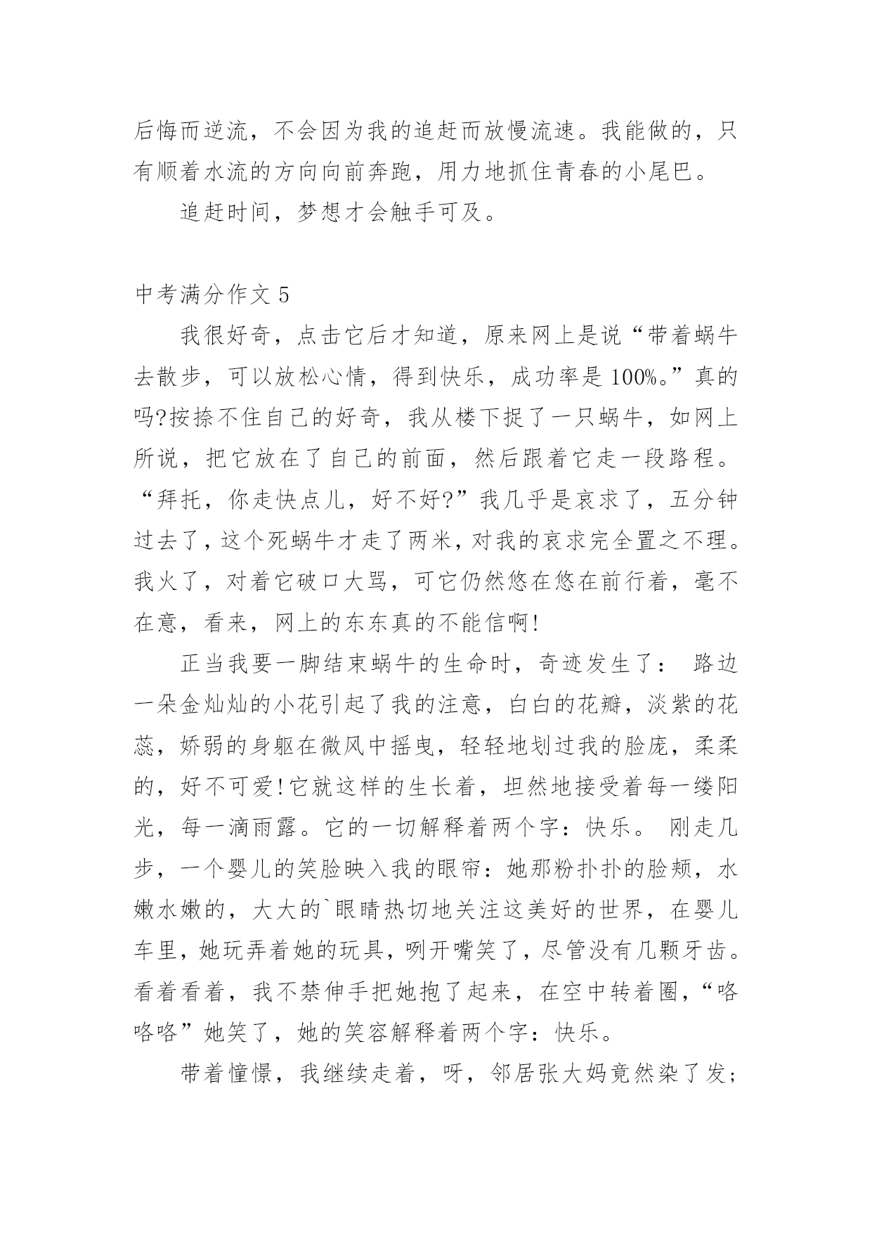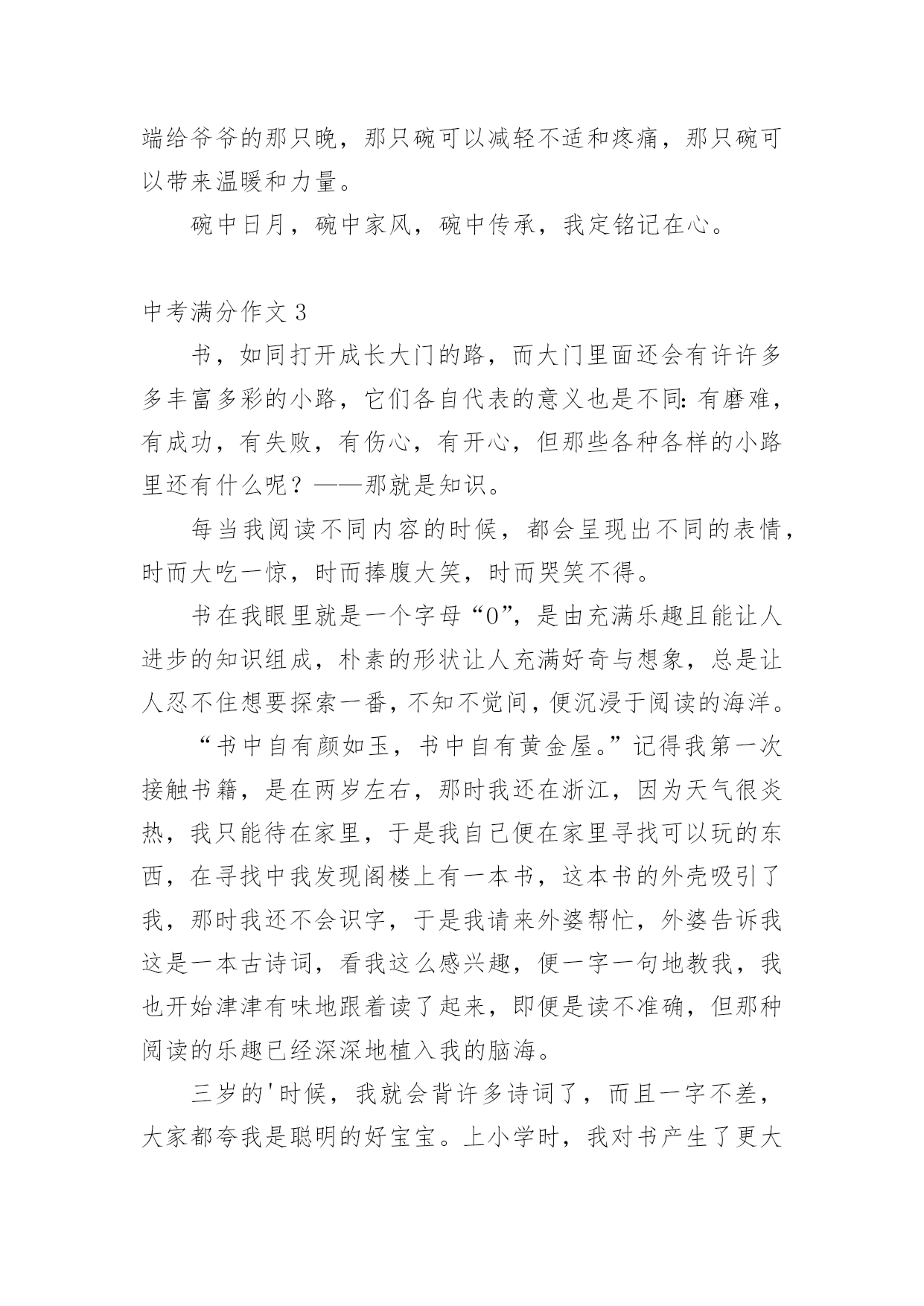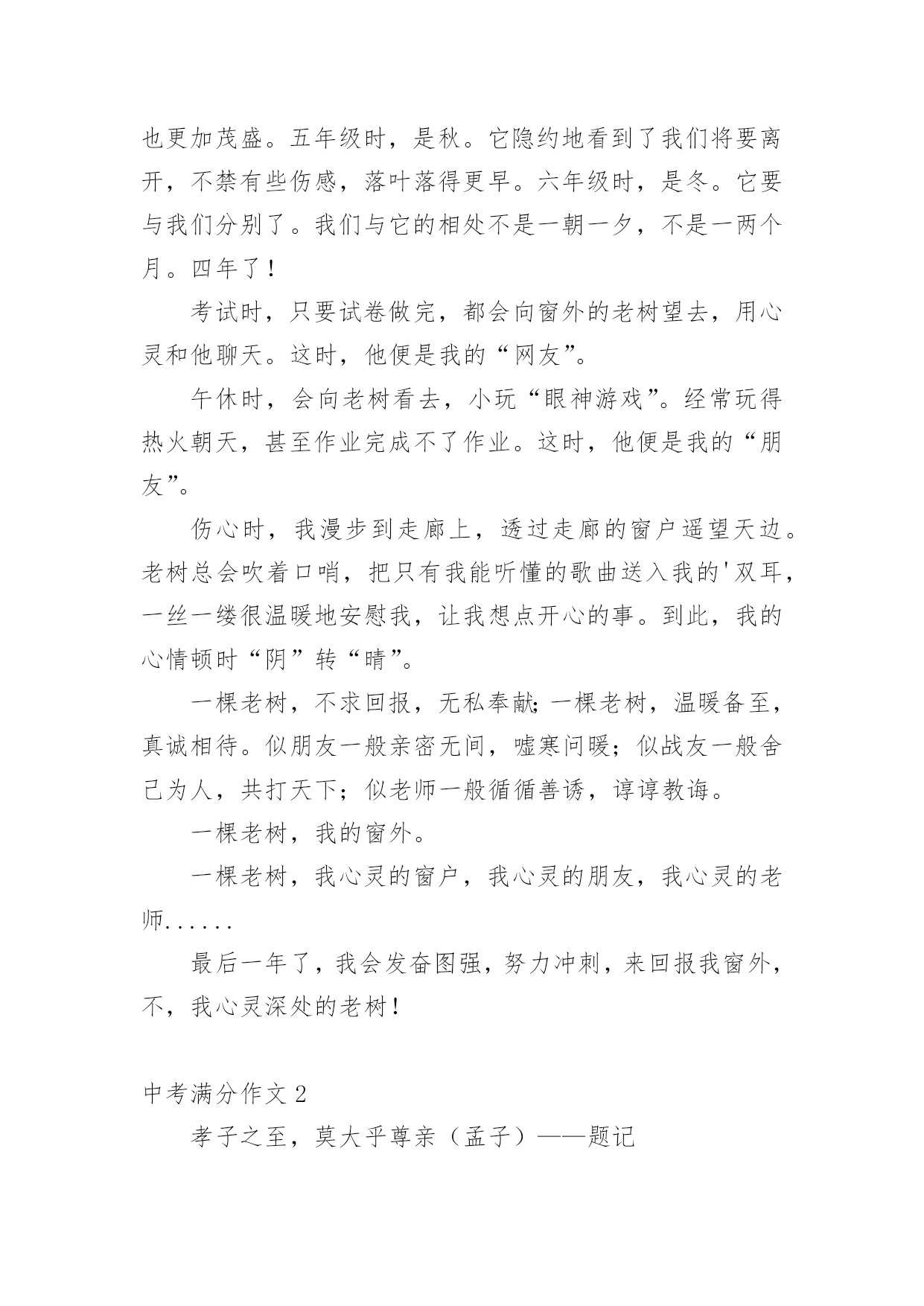 中考满分作文中考满分作文(优秀)在我们平凡的日常里,大家都不可避免地要接触到作文吧,作文是一种言语活动,具有高度的综合性和创造性。你知道作文怎样写才规范吗?下面是小编精心整理的中考满分作文,希望对大家有所帮助。中考满分作文1窗外,风景如画。我的窗外,一棵老树,风景中的特写。我爱戴,我敬畏,我成长的坐标,我要让他扎根在我的心中!春风,消融严寒,剪开束缚,他那嫩绿的枝条带着麦粒大小新芽,在我窗外曼舞;盛夏,蒸蒸日上,枝叶蓬勃,他那冠盖如云的树叶,为我遮风挡雨;深秋,风儿萧瑟,土儿干涸,他把片片绿叶打扮成金色时光的使者,催我读书,不负好时光;严冬,北风呼号,白雪皑皑,他银装素裹傲霜雪,提醒我修养品格,冰清玉洁。这,就是我的窗外,这就是我学校教室的窗外!你嫉妒吗?四年了,这棵老树一直就在窗外陪伴着我,春夏秋冬依旧,风姿绰约依旧,我想,他还将持续依旧到永远。三年级时,是春。它十分欣喜。寂寞了两年,终于又迎来了我们的回归。四年级时,是夏。它与我们的关系更加融洽,生长的也更加茂盛。五年级时,是秋。它隐约地看到了我们将要离开,不禁有些伤感,落叶落得更早。六年级时,是冬。它要与我们分别了。我们与它的相处不是一朝一夕,不是一两个月。四年了!考试时,只要试卷做完,都会向窗外的老树望去,用心灵和他聊天。这时,他便是我的“网友”。午休时,会向老树看去,小玩“眼神游戏”。经常玩得热火朝天,甚至作业完成不了作业。这时,他便是我的“朋友”。伤心时,我漫步到走廊上,透过走廊的窗户遥望天边。老树总会吹着口哨,把只有我能听懂的歌曲送入我的'双耳,一丝一缕很温暖地安慰我,让我想点开心的事。到此,我的心情顿时“阴”转“晴”。一棵老树,不求回报,无私奉献;一棵老树,温暖备至,真诚相待。似朋友一般亲密无间,嘘寒问暖;似战友一般舍己为人,共打天下;似老师一般循循善诱,谆谆教诲。一棵老树,我的窗外。一棵老树,我心灵的窗户,我心灵的朋友,我心灵的老师......最后一年了,我会发奋图强,努力冲刺,来回报我窗外,不,我心灵深处的老树!中考满分作文2孝子之至,莫大乎尊亲(孟子)——题记我四年级的时候,爷爷得了重病,出现吞咽困难的症状,只能吃流食。当时医院开出了一种叫“匀浆膳”的食物,从鼻腔插入一个胃管,每次这样直接打到胃里去,很不舒服;还有一种方案是静脉输注营养,副作用是味觉和胃肠动力会退化。爸爸不忍心爷爷这样,回去从网上下载了厚厚一搨关于营养流食的资料,跟医生同学请教,开始了他的营养餐制作。爸爸提前把每种蔬菜水果的配比、卡路里值、食盐的克数、橄榄油的克数,鸡蛋蛋白的含量等一一计算好。制作过程也无比细致,为了去渣大枣的枣皮要用剪刀一点点剪掉。为了保证新鲜,每次每种只做100ml。碗中时而是鲜绿的蔬菜汁、时而是香糯的大枣红薯汁、时而是鲜咸的番茄蛋白糊。碗中日月,爸爸像一位科学家一样每天为爷爷精心制作着。周末的`一大早,爸爸就开始在厨房里忙碌。点火,蓝色火苗舔着锅底;煎鱼,鲜嫩鱼肉展现淋漓;倒水,晶莹水珠肆意溅起;配料,各色佐料鲜香细腻;熬煮,鲜美味道弥漫四溢;关火,美味鱼汤沁人心脾;盛碗,白色汤汁浓浓爱意。爸爸端起盛满鱼汤的碗来到爷爷床前,我把爷爷扶起,垫好靠背,爸爸一勺一勺慢慢地喂着爷爷,我哽咽了,这碗里浓浓的汤汁,给了爷爷营养和健康,也给了我榜样和能力。日子一天天过去,爷爷的碗里也在一天天变化着,绿色的蔬果汁、浓白的鱼汤、黄色的南瓜粥,白白的米饭,五彩的炒时蔬……主治医生也惊讶这么大年纪的人没有插胃管和静脉输液,营养却得到了充分的保障。那是因为爸爸每日端给爷爷的那只晚,那只碗可以减轻不适和疼痛,那只碗可以带来温暖和力量。碗中日月,碗中家风,碗中传承,我定铭记在心。中考满分作文3书,如同打开成长大门的路,而大门里面还会有许许多多丰富多彩的小路,它们各自代表的意义也是不同:有磨难,有成功,有失败,有伤心,有开心,但那些各种各样的小路里还有什么呢?——那就是知识。每当我阅读不同内容的时候,都会呈现出不同的表情,时而大吃一惊,时而捧腹大笑,时而哭笑不得。书在我眼里就是一个字母“O”,是由充满乐趣且能让人进步的知识组成,朴素的形状让人充满好奇与想象,总是让人忍不住想要探索一番,不知不觉间,便沉浸于阅读的海洋。“书中自有颜如玉,书中自有黄金屋。”记得我第一次接触书籍,是在两岁左右,那时我还在浙江,因为天气很炎热,我只能待在家里,于是我自己便在家里寻找可以玩的东西,在寻找中我发现阁楼上有一本书,这本书的外壳吸引了我,那时我还不会识字,于是我请来外婆帮忙,外婆告诉我这是一本古诗词,看我这么感兴趣,便一字一句地教我,我也开始津津有味地跟着读了起来,即便是读不准确,但那种阅读的乐趣已经深深地植入我的脑海。三岁的'时候,我就会背许多诗词了,而且一字不差,大家都夸我是聪明的好宝宝。上小学时,我对书产