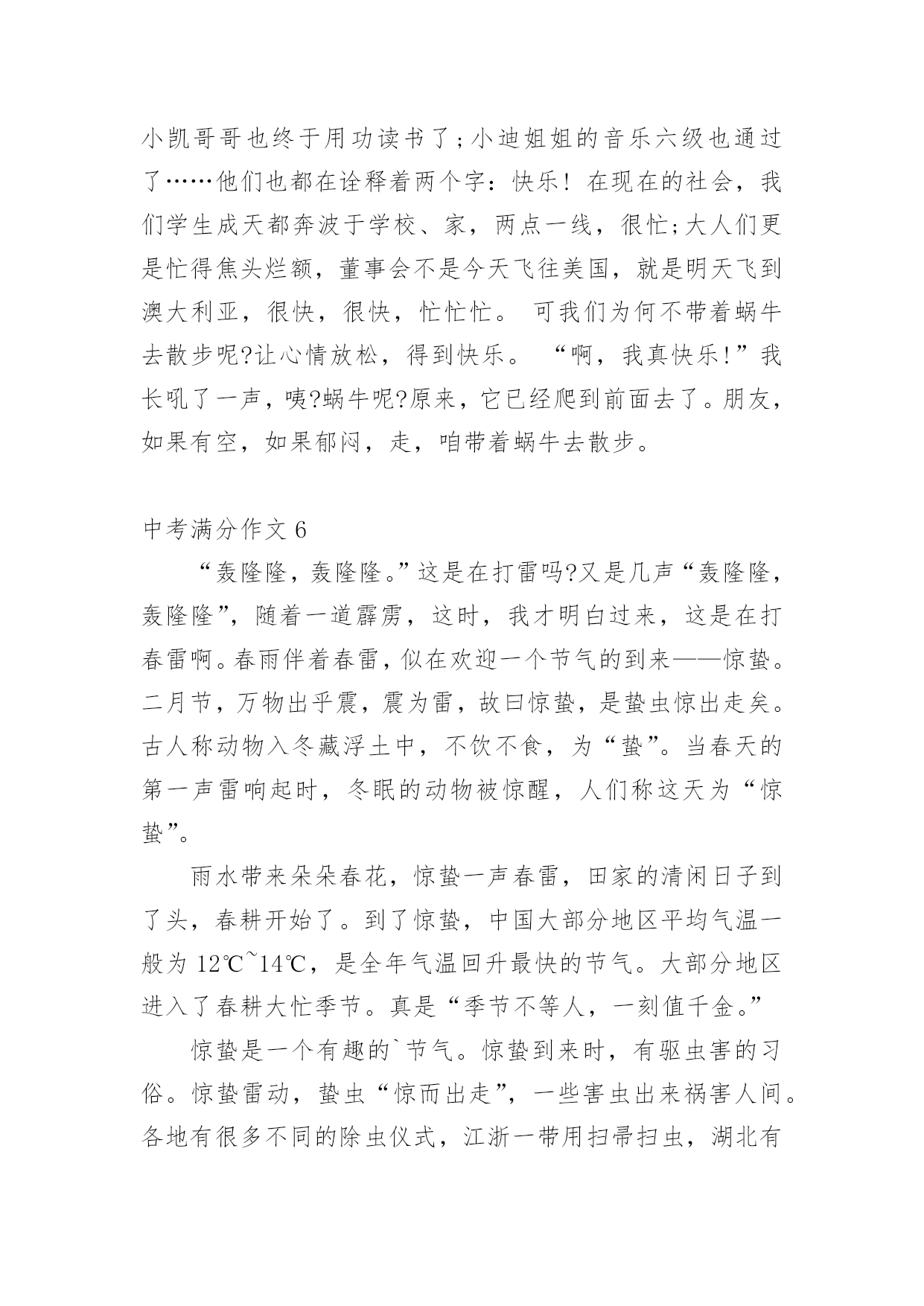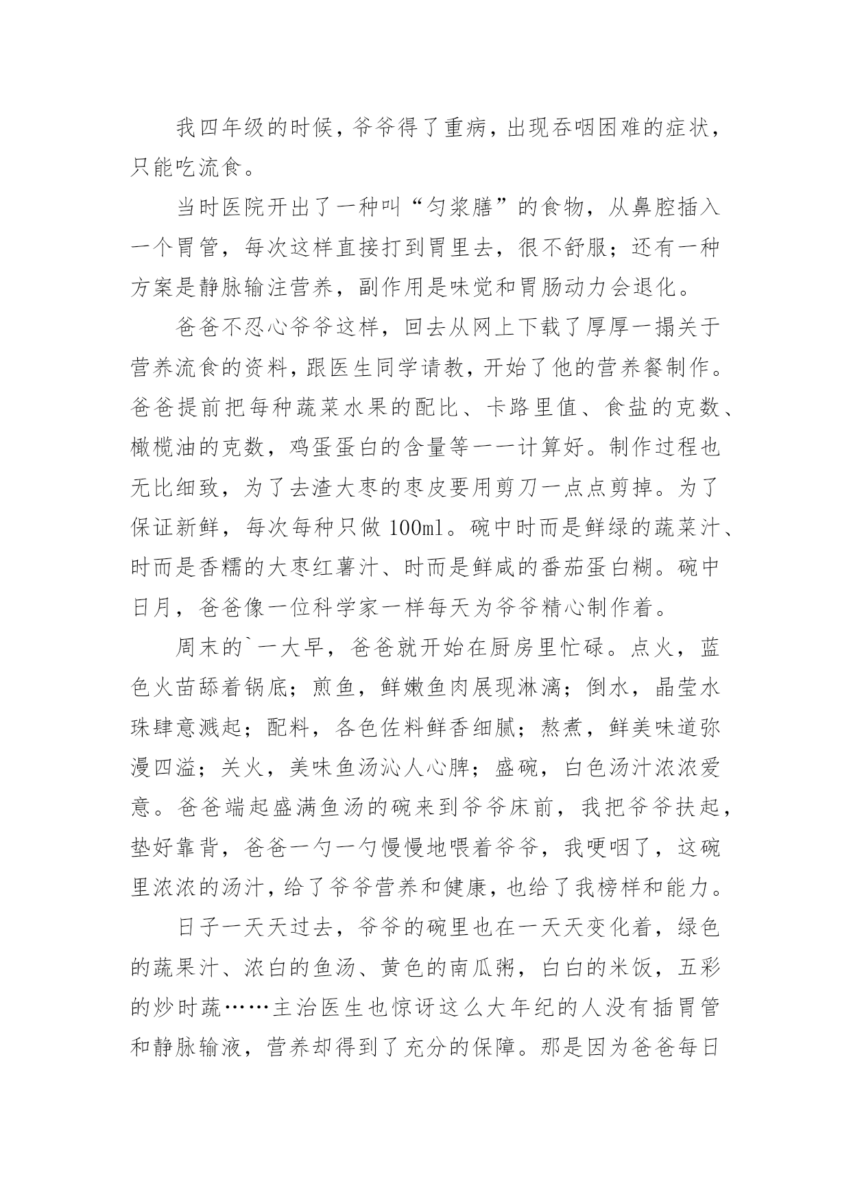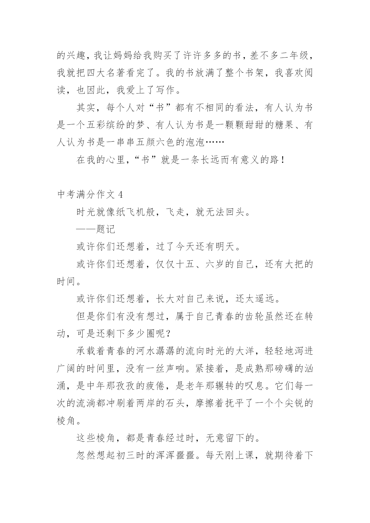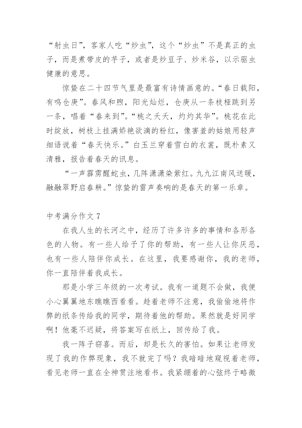 中考满分作文中考满分作文(优秀)在我们平凡的日常里,大家都不可避免地要接触到作文吧,作文是一种言语活动,具有高度的综合性和创造性。你知道作文怎样写才规范吗?下面是小编精心整理的中考满分作文,希望对大家有所帮助。中考满分作文1窗外,风景如画。我的窗外,一棵老树,风景中的特写。我爱戴,我敬畏,我成长的坐标,我要让他扎根在我的心中!春风,消融严寒,剪开束缚,他那嫩绿的枝条带着麦粒大小新芽,在我窗外曼舞;盛夏,蒸蒸日上,枝叶蓬勃,他那冠盖如云的树叶,为我遮风挡雨;深秋,风儿萧瑟,土儿干涸,他把片片绿叶打扮成金色时光的使者,催我读书,不负好时光;严冬,北风呼号,白雪皑皑,他银装素裹傲霜雪,提醒我修养品格,冰清玉洁。这,就是我的窗外,这就是我学校教室的窗外!你嫉妒吗?四年了,这棵老树一直就在窗外陪伴着我,春夏秋冬依旧,风姿绰约依旧,我想,他还将持续依旧到永远。三年级时,是春。它十分欣喜。寂寞了两年,终于又迎来了我们的回归。四年级时,是夏。它与我们的关系更加融洽,生长的也更加茂盛。五年级时,是秋。它隐约地看到了我们将要离开,不禁有些伤感,落叶落得更早。六年级时,是冬。它要与我们分别了。我们与它的相处不是一朝一夕,不是一两个月。四年了!考试时,只要试卷做完,都会向窗外的老树望去,用心灵和他聊天。这时,他便是我的“网友”。午休时,会向老树看去,小玩“眼神游戏”。经常玩得热火朝天,甚至作业完成不了作业。这时,他便是我的“朋友”。伤心时,我漫步到走廊上,透过走廊的窗户遥望天边。老树总会吹着口哨,把只有我能听懂的歌曲送入我的'双耳,一丝一缕很温暖地安慰我,让我想点开心的事。到此,我的心情顿时“阴”转“晴”。一棵老树,不求回报,无私奉献;一棵老树,温暖备至,真诚相待。似朋友一般亲密无间,嘘寒问暖;似战友一般舍己为人,共打天下;似老师一般循循善诱,谆谆教诲。一棵老树,我的窗外。一棵老树,我心灵的窗户,我心灵的朋友,我心灵的老师......最后一年了,我会发奋图强,努力冲刺,来回报我窗外,不,我心灵深处的老树!中考满分作文2孝子之至,莫大乎尊亲(孟子)——题记我四年级的时候,爷爷得了重病,出现吞咽困难的症状,只能吃流食。当时医院开出了一种叫“匀浆膳”的食物,从鼻腔插入一个胃管,每次这样直接打到胃里去,很不舒服;还有一种方案是静脉输注营养,副作用是味觉和胃肠动力会退化。爸爸不忍心爷爷这样,回去从网上下载了厚厚一搨关于营养流食的资料,跟医生同学请教,开始了他的营养餐制作。爸爸提前把每种蔬菜水果的配比、卡路里值、食盐的克数、橄榄油的克数,鸡蛋蛋白的含量等一一计算好。制作过程也无比细致,为了去渣大枣的枣皮要用剪刀一点点剪掉。为了保证新鲜,每次每种只做100ml。碗中时而是鲜绿的蔬菜汁、时而是香糯的大枣红薯汁、时而是鲜咸的番茄蛋白糊。碗中日月,爸爸像一位科学家一样每天为爷爷精心制作着。周末的`一大早,爸爸就开始在厨房里忙碌。点火,蓝色火苗舔着锅底;煎鱼,鲜嫩鱼肉展现淋漓;倒水,晶莹水珠肆意溅起;配料,各色佐料鲜香细腻;熬煮,鲜美味道弥漫四溢;关火,美味鱼汤沁人心脾;盛碗,白色汤汁浓浓爱意。爸爸端起盛满鱼汤的碗来到爷爷床前,我把爷爷扶起,垫好靠背,爸爸一勺一勺慢慢地喂着爷爷,我哽咽了,这碗里浓浓的汤汁,给了爷爷营养和健康,也给了我榜样和能力。日子一天天过去,爷爷的碗里也在一天天变化着,绿色的蔬果汁、浓白的鱼汤、黄色的南瓜粥,白白的米饭,五彩的炒时蔬……主治医生也惊讶这么大年纪的人没有插胃管和静脉输液,营养却得到了充分的保障。那是因为爸爸每日端给爷爷的那只晚,那只碗可以减轻不适和疼痛,那只碗可以带来温暖和力量。碗中日月,碗中家风,碗中传承,我定铭记在心。中考满分作文3书,如同打开成长大门的路,而大门里面还会有许许多多丰富多彩的小路,它们各自代表的意义也是不同:有磨难,有成功,有失败,有伤心,有开心,但那些各种各样的小路里还有什么呢?——那就是知识。每当我阅读不同内容的时候,都会呈现出不同的表情,时而大吃一惊,时而捧腹大笑,时而哭笑不得。书在我眼里就是一个字母“O”,是由充满乐趣且能让人进步的知识组成,朴素的形状让人充满好奇与想象,总是让人忍不住想要探索一番,不知不觉间,便沉浸于阅读的海洋。“书中自有颜如玉,书中自有黄金屋。”记得我第一次接触书籍,是在两岁左右,那时我还在浙江,因为天气很炎热,我只能待在家里,于是我自己便在家里寻找可以玩的东西,在寻找中我发现阁楼上有一本书,这本书的外壳吸引了我,那时我还不会识字,于是我请来外婆帮忙,外婆告诉我这是一本古诗词,看我这么感兴趣,便一字一句地教我,我也开始津津有味地跟着读了起来,即便是读不准确,但那种阅读的乐趣已经深深地植入我的脑海。三岁的'时候,我就会背许多诗词了,而且一字不差,大家都夸我是聪明的好宝宝。上小学时,我对书产