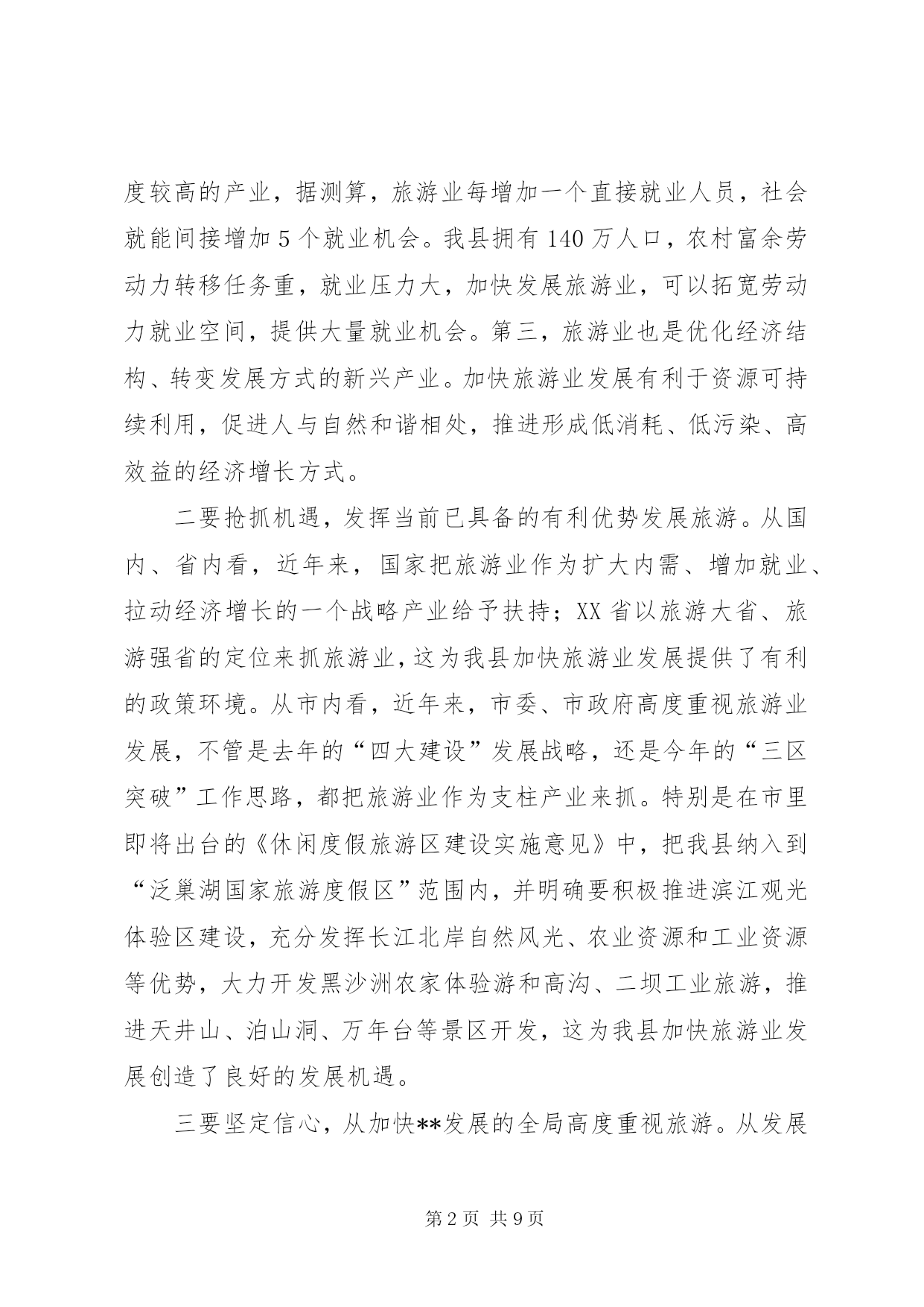 第PAGE\*Arabic\*MERGEFORMAT9页共NUMPAGES\*MERGEFORMAT9页旅游工作讲话稿一、发展旅游经济既富民又强县,必须摆到更加突出的位置工业化、城镇化、农业现代化的发展固然重要,同时也必须把现代旅游业作为重要战略产业、新兴产业、朝阳产业去发展。从我县来看,旅游业一直是“短腿”,还没有被摆上重要战略位置去对待,发展不足,相对滞后,推进不快,效果不明显。究其原因:一是发展的理念问题,没有把旅游业作为重要的战略性产业去培育,缺少全面协调、统筹发展的意识;二是工作停留在一般层面上,推进力度不够,工作落实不够,“讲起来重要,做起来不重要”;三是旅游招商的政策、氛围和力度也没有跟上。当前,省委、省政府把旅游业发展抓得紧而又紧,市委、市政府把休闲度假旅游区建设摆到“三区突破”的战略高度去对待。因此,我们必须站在全局高度,用战略眼光审时度势,更新观念,提高认识,坚定信心,切实把发展旅游业摆到更加突出的位置。一要更新观念,以抓旅游就是抓发展的理念看待旅游。首先,旅游业是朝阳产业、“无烟工厂”,是对经济发展具有拉动作用的综合性产业。据统计,旅游业收入每增加1元,第三产业产值就能增加4元以上,对经济拉动作用十分明显。其次,旅游业是一项效益显著的富民产业。发展旅游业是拓宽农民收入渠道、建设新农村的有效载体。我县大多数景区景点位于山区农村,通过旅游开发可带动当地农民增收致富。同时,旅游业又是劳动密集度较高的产业,据测算,旅游业每增加一个直接就业人员,社会就能间接增加5个就业机会。我县拥有140万人口,农村富余劳动力转移任务重,就业压力大,加快发展旅游业,可以拓宽劳动力就业空间,提供大量就业机会。第三,旅游业也是优化经济结构、转变发展方式的新兴产业。加快旅游业发展有利于资源可持续利用,促进人与自然和谐相处,推进形成低消耗、低污染、高效益的经济增长方式。二要抢抓机遇,发挥当前已具备的有利优势发展旅游。从国内、省内看,近年来,国家把旅游业作为扩大内需、增加就业、拉动经济增长的一个战略产业给予扶持;XX省以旅游大省、旅游强省的定位来抓旅游业,这为我县加快旅游业发展提供了有利的政策环境。从市内看,近年来,市委、市政府高度重视旅游业发展,不管是去年的“四大建设”发展战略,还是今年的“三区突破”工作思路,都把旅游业作为支柱产业来抓。特别是在市里即将出台的《休闲度假旅游区建设实施意见》中,把我县纳入到“泛巢湖国家旅游度假区”范围内,并明确要积极推进滨江观光体验区建设,充分发挥长江北岸自然风光、农业资源和工业资源等优势,大力开发黑沙洲农家体验游和高沟、二坝工业旅游,推进天井山、泊山洞、万年台等景区开发,这为我县加快旅游业发展创造了良好的发展机遇。三要坚定信心,从加快**发展的全局高度重视旅游。从发展空间看,我县旅游发展空间十分广阔。一方面,随着“十二五”时期经济社会的加快发展,全县交通、通讯等基础设施投入将进一步加大,发展旅游业的环境将进一步优化,必将为旅游业大发展奠定更为厚实的基础。另一方面,旅游需求必将随着经济社会发展而迅猛增长,旅游将成为人们生活中的重要组成部分,成为提高生活质量的重要内容。从发展潜力看,我县历史文化悠久,人文积淀丰厚,山水资源与人文景观交相辉映,生态旅游和红色旅游资源十分丰富,特别是独特的滨江旅游资源,独具特色魅力,发展休闲度假旅游潜力巨大。从发展基础看,近年来,我县通过出台政策文件、设立专项资金、成立专门机构,大力实施“文化旅游突破工程”,旅游业发展取得了一定成绩,奠定了发展基础。当前,要在规划的基础上整合资源,通过包装、策划、营销加快旅游业发展。可以说,我县加快发展旅游业既有难得机遇,又有丰富资源;既有良好环境,又有一定基础,我们没有任何理由不把旅游业搞上去。因此,全县各级各部门一定要紧紧抓住发展机遇,积极利用好中央、省、市的扶持政策,充分发挥好自身的发展优势,进一步解放思想、振奋精神,开拓创新、乘势前进,努力开创我县旅游工作新局面,不断推动全县经济社会加速跨越发展。二、壮大旅游产业既要重点突破又要彰显特色,必须坚定不移地强力推进要壮大旅游产业,就必须按照“超前规划、基础先行、重点突破、注重特色”的思路,紧紧抓住市里打造“泛巢湖国家旅游度假区”的机遇,主动融入,快速推动,根据我县资源特色,建设主题各异的旅游板块,努力构筑滨江旅游、生态旅游、红色旅游、工业旅游和人文景观旅游相融发展的格局,积极争创“全省、全国红色旅游县”和“全国工业旅游示范点”。(一)高起点规划,做大旅游。一方面,要坚持以规划为龙头,按照“多出精品,少留遗憾,不留败笔”的原则,根据我县旅游发展总体规划的要求,聘请专家高起点、高标准编制好黑沙洲、竹丝湖、米公祠、新四军七师旧址等景区控制性建设详规和无城、二坝、高沟等乡镇旅