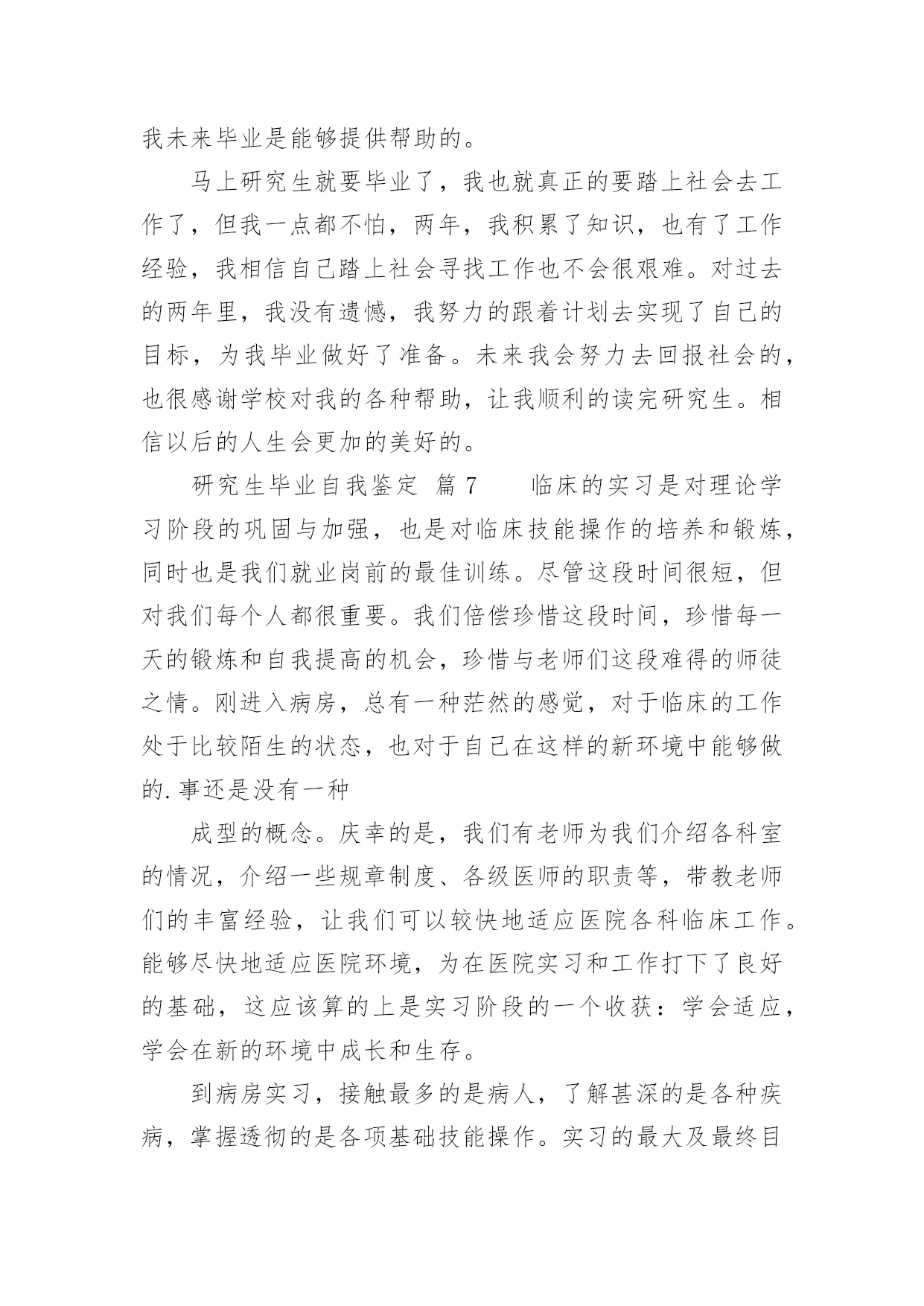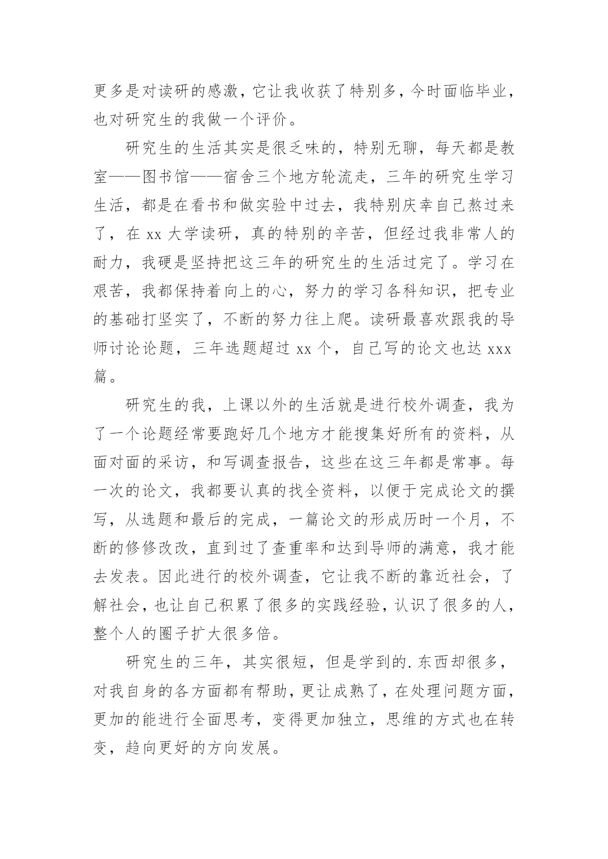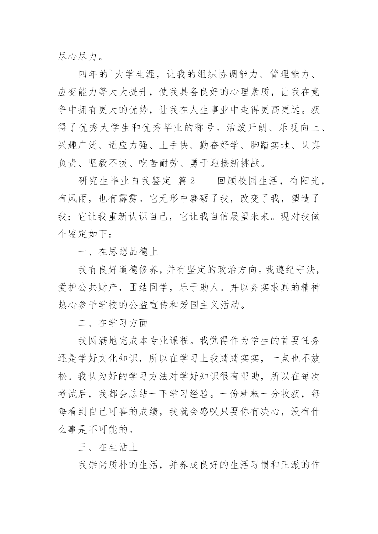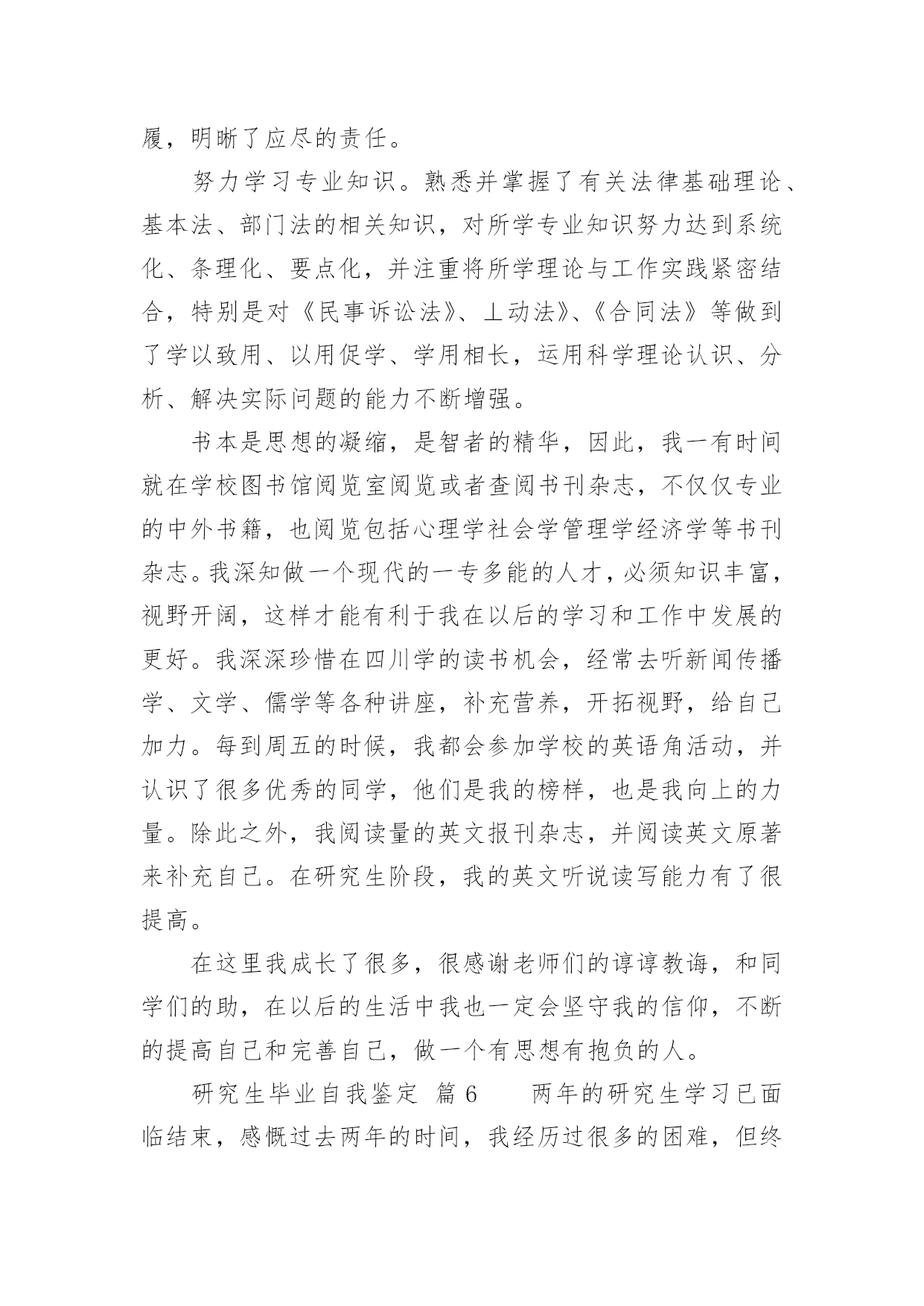 研究生毕业自我鉴定研究生毕业自我鉴定(精选15篇)自我鉴定就是把一个时间段的个人情况进行一次全面系统的总结,自我鉴定可以使我们更有效率,我想我们需要写一份自我鉴定了吧。自我鉴定怎么写才不会千篇一律呢?下面是小编帮大家整理的研究生毕业自我鉴定,欢迎阅读,希望大家能够喜欢。研究生毕业自我鉴定篇1本人性格热情开朗,待人友好,为人诚实谦虚。工作勤奋,认真负责,能吃苦耐劳,尽职尽责,有耐心。具有亲和力,平易近人,善于与人沟通。学习刻苦认真,成绩优秀,名列前茅。品学兼优,连续三年获得学院奖学金。曾担任系学生会外联部干部、系团总支组织部副部长、班级生活委员等,在学生工作和外出拉赞助与商家联系的过程中,大大提高了自己的办事和处事能力。此外,还积极参加课外文体活动,各种社会实践活动和兼职工作等,以增加自己的阅历,提高自己的能力。在工作中体会办事方式,锻炼口才和人际交往能力。曾连续两年获得学院暑期社会实践积极分子,学生会优秀干事等荣誉称号。在平时学校生活中,做过很多兼职。例如:家教、电话访问员、酒楼服务员、派传单、问卷调查,还到工厂打过暑期工,亲身体会了各种工作的不同运作程序和处事方法,锻炼成了吃苦耐劳的精神,并从工作中体会到乐趣,尽心尽力。四年的`大学生涯,让我的组织协调能力、管理能力、应变能力等大大提升,使我具备良好的心理素质,让我在竞争中拥有更大的优势,让我在人生事业中走得更高更远。获得了优秀大学生和优秀毕业的称号。活泼开朗、乐观向上、兴趣广泛、适应力强、上手快、勤奋好学、脚踏实地、认真负责、坚毅不拔、吃苦耐劳、勇于迎接新挑战。研究生毕业自我鉴定篇2回顾校园生活,有阳光,有风雨,也有霹雳。它无形中磨砺了我,改变了我,塑造了我;它让我重新认识自己,它让我自信展望未来。现对我做个鉴定如下:一、在思想品德上我有良好道德修养,并有坚定的政治方向。我遵纪守法,爱护公共财产,团结同学,乐于助人。并以务实求真的精神热心参予学校的公益宣传和爱国主义活动。二、在学习方面我圆满地完成本专业课程。我觉得作为学生的首要任务还是学好文化知识,所以在学习上我踏踏实实,一点也不放松。我认为好的学习方法对学好知识很有帮助,所以在每次考试后,我都会总结一下学习经验。一份耕耘一分收获,每每看到自己可喜的成绩,我就会感叹只要你有决心,没有什么事是不可能的。三、在生活上我崇尚质朴的生活,并养成良好的生活习惯和正派的作风。此外,对时间观念性十分重视。由于平易近人待人友好,所以一直以来与人相处甚是融洽。敢于拼搏刻苦耐劳将伴随我迎接未来新挑战。作为积极乐观新时代青年,我不会因为自己是大专文凭而失去自信心,反而我会更加迫切要求自己充实充实再充实。完善自我实现未来目标。我相信:努力一定能赢得精彩!塑造一个健康,充满自信的我,自信来自实力,但同时也要认识到,眼下社会变革迅速,对人才的要求也越来越高,社会是在不断变化,发展的,要用发展的眼光看问题,自身还有很多的缺点和不足,要适应社会的发展,得不断提高思想认识,完善自己,改正缺点。要学会学习,学会创新,学会适应社会的发展要求。这几年学到的专业知识必将应用到以后的工作之中,通过学习提高了工作能力。由于有丰富的知识储备,将会在以后的工作中得心应手,高人一筹。除了工作方面的'提高、毅力的锻炼,更重要的是为以后的人生提供了丰富的营养,将自己塑造成有用的人才,充分发挥个人的作用,有效地服务于社会。做一个有理想,有道德,有文化,有纪律的社会主义建设者和接班人。当一个人开始思考未来和责任的时候,就不能再被称为孩子。我会铭记学校中的所得所感,在以后的工作和生活中坚定自己的航向,认真做事,勇敢前行。研究生毕业自我鉴定篇3大学毕业选择了读研,现在在xxx大学的研究生生活也结束了,内心有感慨的同时,更多是对读研的感激,它让我收获了特别多,今时面临毕业,也对研究生的我做一个评价。研究生的生活其实是很乏味的,特别无聊,每天都是教室——图书馆——宿舍三个地方轮流走,三年的研究生学习生活,都是在看书和做实验中过去,我特别庆幸自己熬过来了,在xx大学读研,真的特别的辛苦,但经过我非常人的耐力,我硬是坚持把这三年的研究生的生活过完了。学习在艰苦,我都保持着向上的心,努力的学习各科知识,把专业的基础打坚实了,不断的努力往上爬。读研最喜欢跟我的导师讨论论题,三年选题超过xx个,自己写的论文也达xxx篇。研究生的我,上课以外的生活就是进行校外调查,我为了一个论题经常要跑好几个地方才能搜集好所有的资料,从面对面的采访,和写调查报告,这些在这三年都是常事。每一次的论文,我都要认真的找全资料,以便于完成论文的撰写,从选题和最后的完成,一篇论文的形成历时一个月,不断的修修改改,直到过了查重率和达到导师的满意,我才能去发表。因此进行的校外调查,它让我不断的靠近社会,了解社会,也让自己积累了