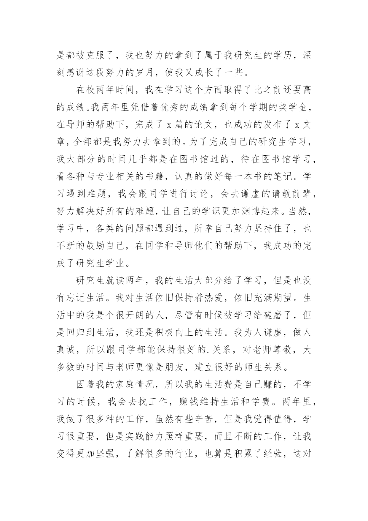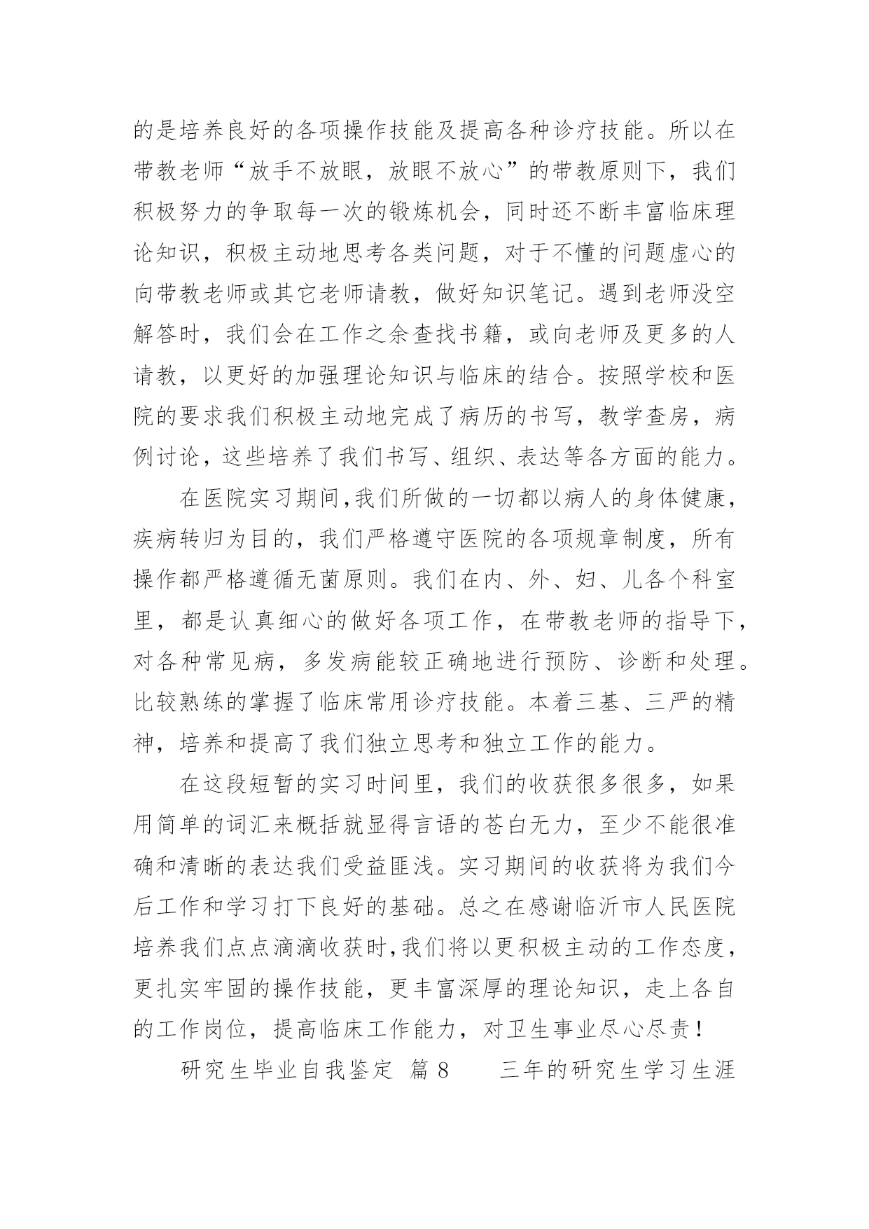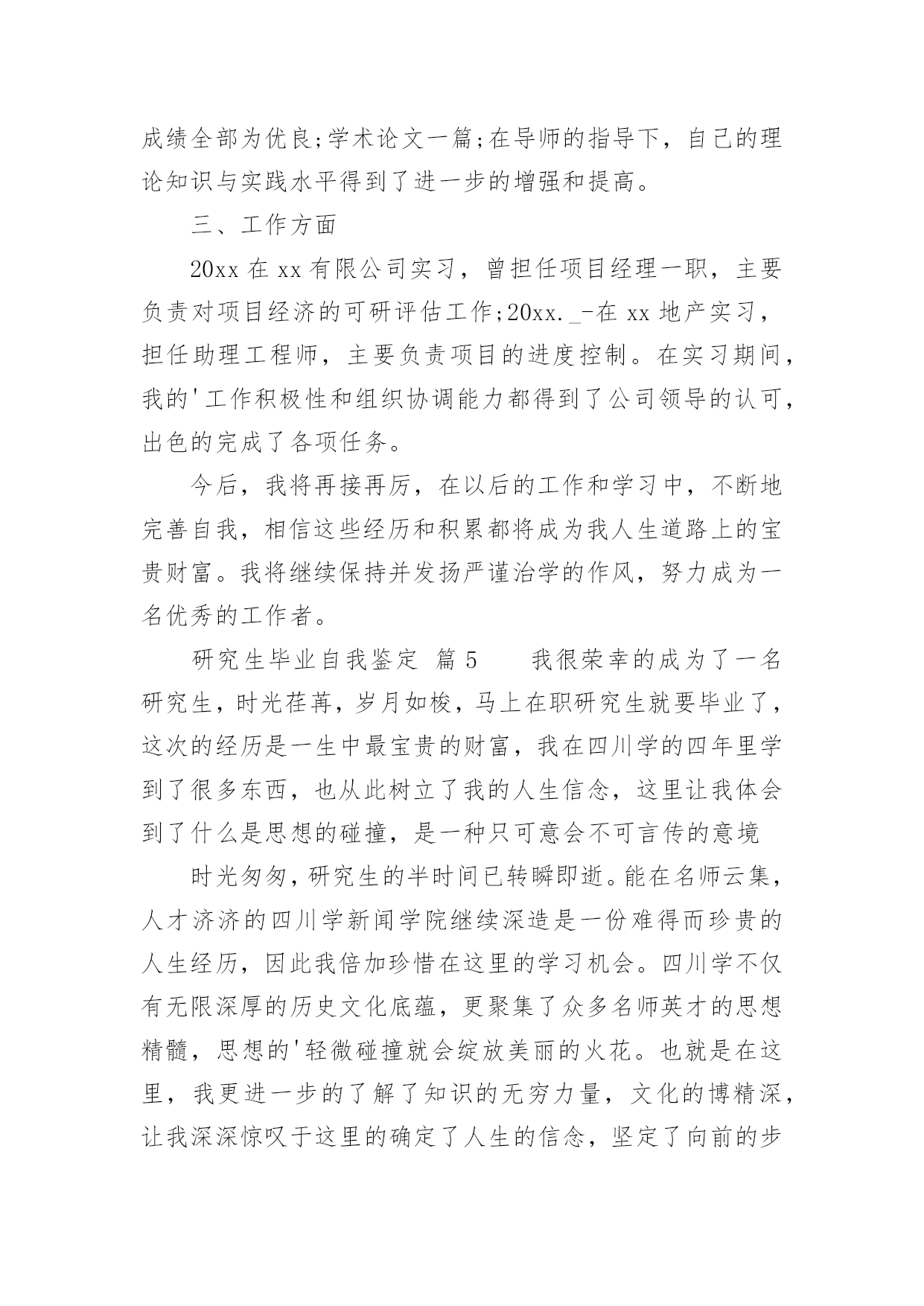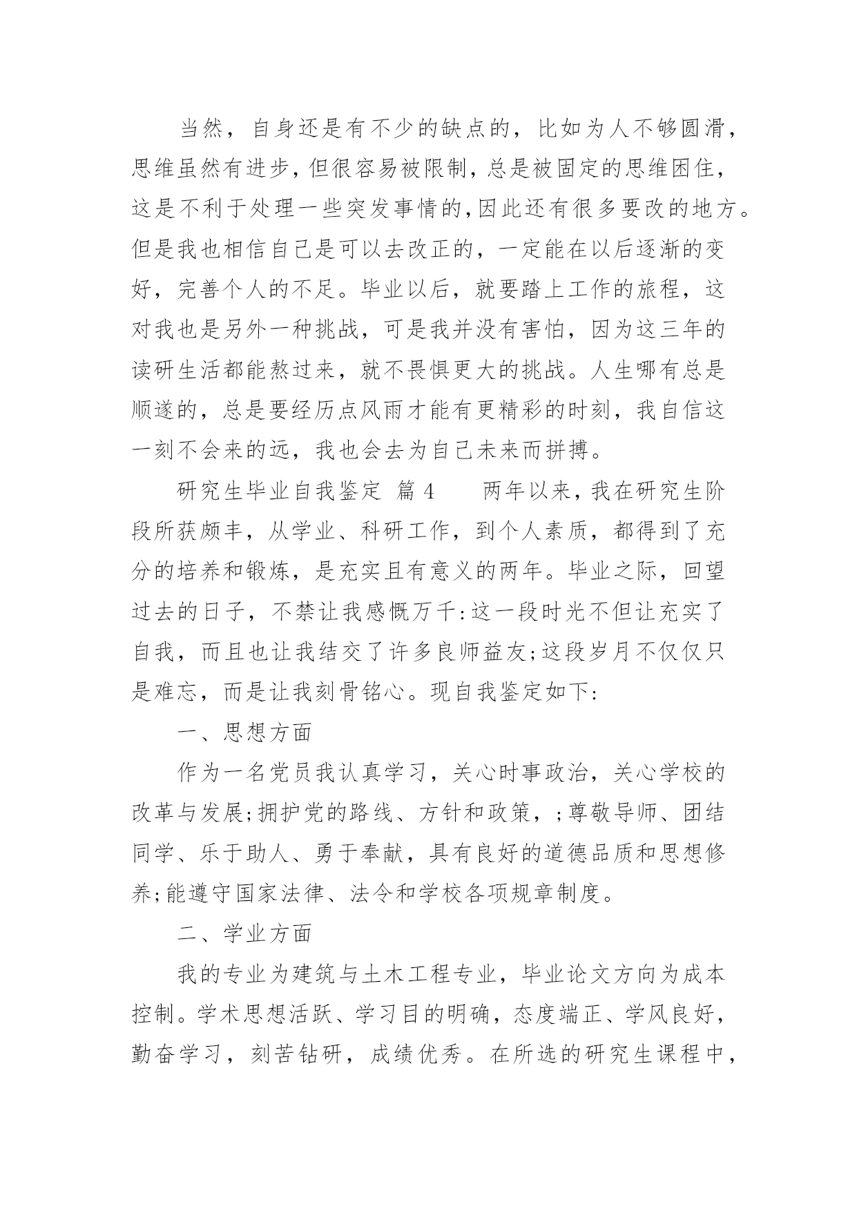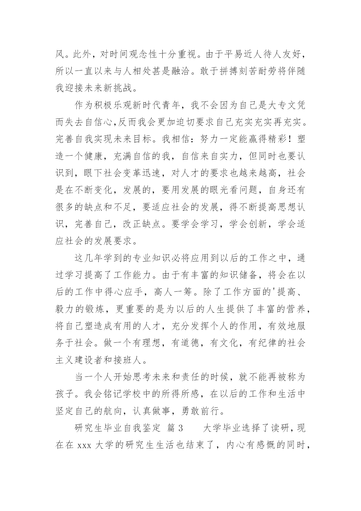 研究生毕业自我鉴定研究生毕业自我鉴定(精选15篇)自我鉴定就是把一个时间段的个人情况进行一次全面系统的总结,自我鉴定可以使我们更有效率,我想我们需要写一份自我鉴定了吧。自我鉴定怎么写才不会千篇一律呢?下面是小编帮大家整理的研究生毕业自我鉴定,欢迎阅读,希望大家能够喜欢。研究生毕业自我鉴定篇1本人性格热情开朗,待人友好,为人诚实谦虚。工作勤奋,认真负责,能吃苦耐劳,尽职尽责,有耐心。具有亲和力,平易近人,善于与人沟通。学习刻苦认真,成绩优秀,名列前茅。品学兼优,连续三年获得学院奖学金。曾担任系学生会外联部干部、系团总支组织部副部长、班级生活委员等,在学生工作和外出拉赞助与商家联系的过程中,大大提高了自己的办事和处事能力。此外,还积极参加课外文体活动,各种社会实践活动和兼职工作等,以增加自己的阅历,提高自己的能力。在工作中体会办事方式,锻炼口才和人际交往能力。曾连续两年获得学院暑期社会实践积极分子,学生会优秀干事等荣誉称号。在平时学校生活中,做过很多兼职。例如:家教、电话访问员、酒楼服务员、派传单、问卷调查,还到工厂打过暑期工,亲身体会了各种工作的不同运作程序和处事方法,锻炼成了吃苦耐劳的精神,并从工作中体会到乐趣,尽心尽力。四年的`大学生涯,让我的组织协调能力、管理能力、应变能力等大大提升,使我具备良好的心理素质,让我在竞争中拥有更大的优势,让我在人生事业中走得更高更远。获得了优秀大学生和优秀毕业的称号。活泼开朗、乐观向上、兴趣广泛、适应力强、上手快、勤奋好学、脚踏实地、认真负责、坚毅不拔、吃苦耐劳、勇于迎接新挑战。研究生毕业自我鉴定篇2回顾校园生活,有阳光,有风雨,也有霹雳。它无形中磨砺了我,改变了我,塑造了我;它让我重新认识自己,它让我自信展望未来。现对我做个鉴定如下:一、在思想品德上我有良好道德修养,并有坚定的政治方向。我遵纪守法,爱护公共财产,团结同学,乐于助人。并以务实求真的精神热心参予学校的公益宣传和爱国主义活动。二、在学习方面我圆满地完成本专业课程。我觉得作为学生的首要任务还是学好文化知识,所以在学习上我踏踏实实,一点也不放松。我认为好的学习方法对学好知识很有帮助,所以在每次考试后,我都会总结一下学习经验。一份耕耘一分收获,每每看到自己可喜的成绩,我就会感叹只要你有决心,没有什么事是不可能的。三、在生活上我崇尚质朴的生活,并养成良好的生活习惯和正派的作风。此外,对时间观念性十分重视。由于平易近人待人友好,所以一直以来与人相处甚是融洽。敢于拼搏刻苦耐劳将伴随我迎接未来新挑战。作为积极乐观新时代青年,我不会因为自己是大专文凭而失去自信心,反而我会更加迫切要求自己充实充实再充实。完善自我实现未来目标。我相信:努力一定能赢得精彩!塑造一个健康,充满自信的我,自信来自实力,但同时也要认识到,眼下社会变革迅速,对人才的要求也越来越高,社会是在不断变化,发展的,要用发展的眼光看问题,自身还有很多的缺点和不足,要适应社会的发展,得不断提高思想认识,完善自己,改正缺点。要学会学习,学会创新,学会适应社会的发展要求。这几年学到的专业知识必将应用到以后的工作之中,通过学习提高了工作能力。由于有丰富的知识储备,将会在以后的工作中得心应手,高人一筹。除了工作方面的'提高、毅力的锻炼,更重要的是为以后的人生提供了丰富的营养,将自己塑造成有用的人才,充分发挥个人的作用,有效地服务于社会。做一个有理想,有道德,有文化,有纪律的社会主义建设者和接班人。当一个人开始思考未来和责任的时候,就不能再被称为孩子。我会铭记学校中的所得所感,在以后的工作和生活中坚定自己的航向,认真做事,勇敢前行。研究生毕业自我鉴定篇3大学毕业选择了读研,现在在xxx大学的研究生生活也结束了,内心有感慨的同时,更多是对读研的感激,它让我收获了特别多,今时面临毕业,也对研究生的我做一个评价。研究生的生活其实是很乏味的,特别无聊,每天都是教室——图书馆——宿舍三个地方轮流走,三年的研究生学习生活,都是在看书和做实验中过去,我特别庆幸自己熬过来了,在xx大学读研,真的特别的辛苦,但经过我非常人的耐力,我硬是坚持把这三年的研究生的生活过完了。学习在艰苦,我都保持着向上的心,努力的学习各科知识,把专业的基础打坚实了,不断的努力往上爬。读研最喜欢跟我的导师讨论论题,三年选题超过xx个,自己写的论文也达xxx篇。研究生的我,上课以外的生活就是进行校外调查,我为了一个论题经常要跑好几个地方才能搜集好所有的资料,从面对面的采访,和写调查报告,这些在这三年都是常事。每一次的论文,我都要认真的找全资料,以便于完成论文的撰写,从选题和最后的完成,一篇论文的形成历时一个月,不断的修修改改,直到过了查重率和达到导师的满意,我才能去发表。因此进行的校外调查,它让我不断的靠近社会,了解社会,也让自己积累了