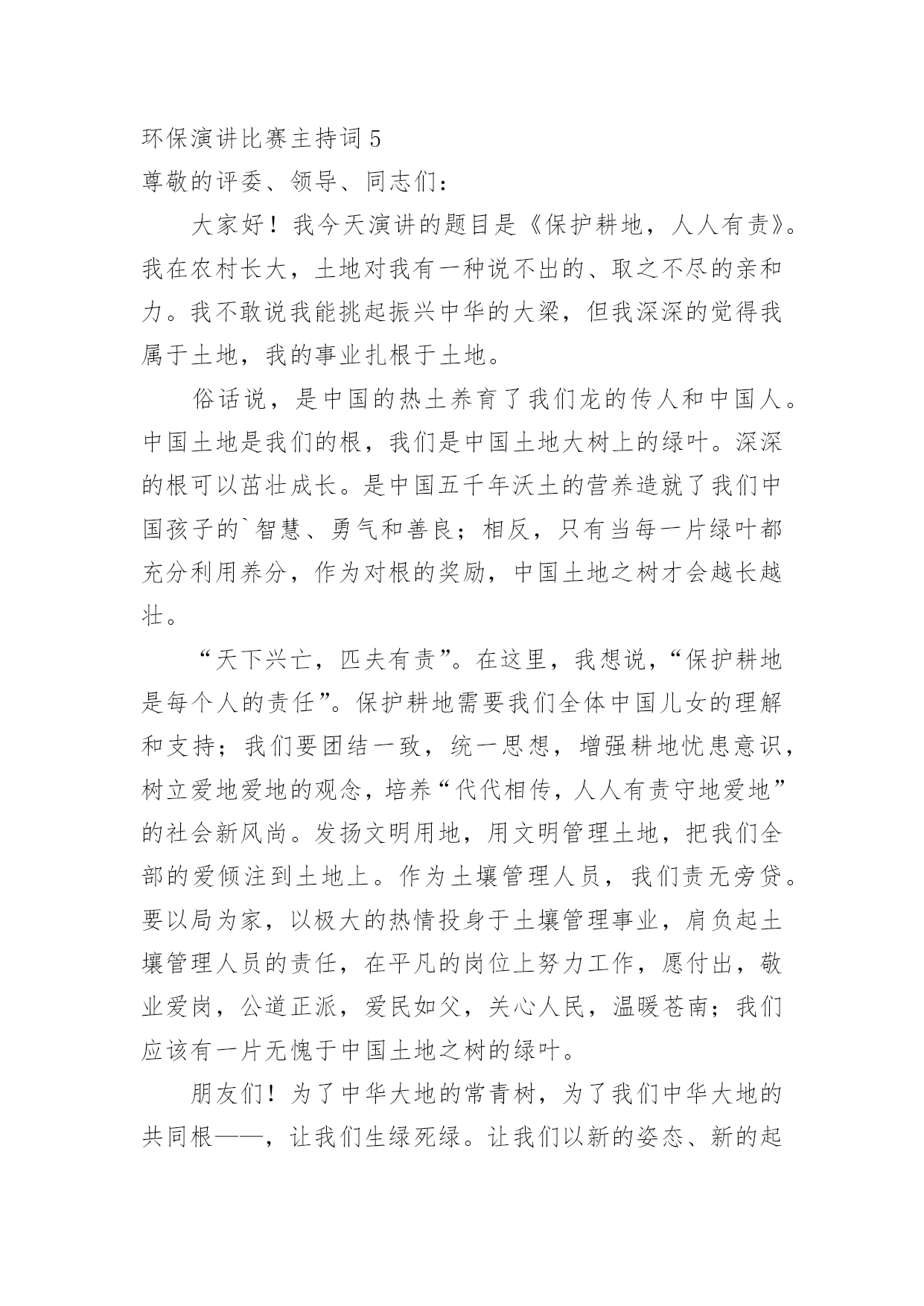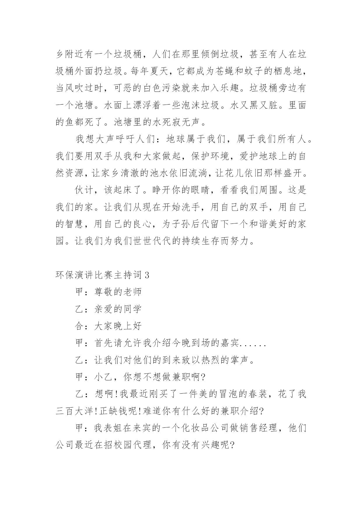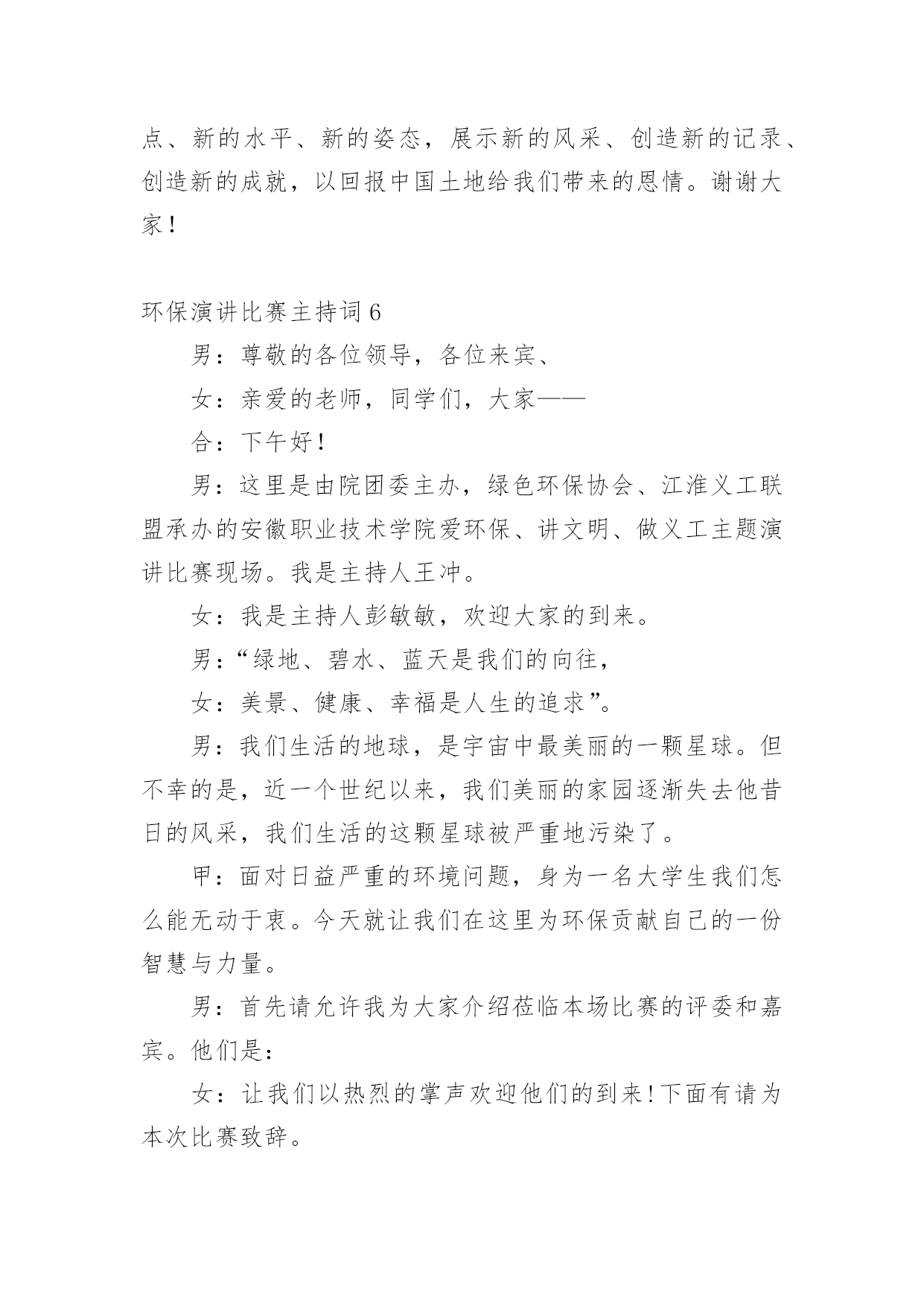 环保演讲比赛主持词主持词是各种演出活动和集会中主持人串联节目的串联词。在人们越来越多的参与各种活动的今天,主持人在各种场合变得越来越重要,现在你是否对主持词一筹莫展呢?以下是小编整理的环保演讲比赛主持词,欢迎阅读,希望大家能够喜欢。环保演讲比赛主持词1亲爱的老师们,亲爱的学生们:大家好!200万年前,地球在46亿年的历史长河中缓缓航行后,我们不平凡的生命诞生了。他的足迹开始踏上这个可爱的蓝色星球。地球母亲从未想过这是她荣耀和噩梦的开始。因为人类对自然无止境的需求,让我们曾经温柔善良的地球母亲变得暴虐任性。经过无数次的沧桑,她的美丽已经变成了过去,换成了陈旧、肮脏、面目全非。我无法想象如果有一天地球上没有绿色,人类文明会发生什么。到时候可能就这么消失了,一切都只会淹没在飞沙中。当碧波澎湃的森林被无边无际的.沙漠黄尘取代,当蓝天上自由飘浮的白云被黑烟取代,当遮挡着地球风雨的臭氧层被无情的氟利昂摧毁,我清晰地听到了森林的哭泣,白云的悲哀,臭氧层的叹息。思念是我们在大自然中学到的最纯粹的思念,但为什么要把它变成对绿色的永久思念呢?真的只能用相机把自然的、可怜的、悲伤的照片记录下来留给下一代回味吗?真的要等森林绿地变成为纪录片,闻不到绿意盎然,只享受到乌烟瘴气时才懂得觉悟?也许有人会说我只在这高谈阔论,也许有人会说环保离我们很远,那我们先来一个式子:“大自然——绿色——环保——人——你自己”看完后,你还会觉得它远吗?大自然就在我们周围,绿色就在我们身边,环保就在我们的心中,脑中,手中,行动中。我们不能说我们能为环保做什么,但最起码你开始在认识它,开始在感受我们的大自然,只为着我们共同的理念。显而易见,建造文明、美丽、和谐、平安的城市不仅要有相应的条例,公众积极的参与更为重要,还要让在提升执法者素质的同时全面提升市民的素质。同学们,赶快醒来吧,为了我们共同的家园和他长久的美好未来,从现在做起,从我做起,勇敢地站起来对大自然做出承诺,承诺用我们的双手使地球母亲恢复青春容颜,承诺用我们的行动来感动大自然,改造大自然。立志把我们的社会,我们的家园和校园建设的更加美丽。我的演讲完毕,谢谢大家!环保演讲比赛主持词2环保,题目,可以说是家喻户晓。但是在现实生活中,还是有人不太重视,认为它无足轻重。在我看来,环保要从小事做起。我经历过两个这样的小事:有一天我去超市买东西,来到超市门口,看到发了几份传单,看见人就给,看见车就放,但有些人不要,就扔在地上。我过去常常把纸扔进垃圾箱。我看到两个人用胶水在墙上贴传单。从远处看,他们像“牛皮癣”。在他们没注意的时候,我拿出了我的绝活“撕纸”。哈哈,我去掉了一大块“牛皮癣”。还有一次,我在楼底玩的时候,发现远处的草地上冒出一缕缕白烟。走近一看,原来是我们班的一群孩子在那里放火烧草,一大块草黑了。作为一个老大哥,我赶紧制止了,讲了火的危险,讲了环保的重要性。可耻的是,他们很快从附近带了水来灭火,结束了烧草行动。我们都生活在一个星球上,那就是地球。地球上有氧气供我们呼吸,茂密的森林,辽阔的草原,无边无际的'海洋,各种动物,构成了美丽的大自然。但是有些人不珍惜地球给我们的一切,破坏自然,杀死太多野生动物。此外,各种破坏环境的做法给我们的自然带来了越来越多的灾难。长长的黄沙取代了绿色的森林,波涛汹涌的河流变成了干涸的河床,美丽的景区变成了荒野。还有空气污染,臭氧层空洞等等,都是人们没有保护好环境的恶果。从前,我家乡的空气清新,天空湛蓝。它真的像一幅彩色的画。太美了!但此刻,汽车排放污染空气的黑烟。经过更多的工厂,排出污水,水变黑发臭,污染严重。我的家乡附近有一个垃圾桶,人们在那里倾倒垃圾,甚至有人在垃圾桶外面扔垃圾。每年夏天,它都成为苍蝇和蚊子的栖息地,当风吹过时,可恶的白色污染就来加入乐趣。垃圾桶旁边有一个池塘。水面上漂浮着一些泡沫垃圾。水又黑又脏。里面的鱼都死了。池塘里的水死寂无声。我想大声呼吁人们:地球属于我们,属于我们所有人。我们要用双手从我和大家做起,保护环境,爱护地球上的自然资源,让家乡清澈的池水依旧流淌,让花儿依旧那样盛开。伙计,该起床了。睁开你的眼睛,看看我们周围。这是我们的家。让我们从现在开始洗手,用自己的双手,用自己的智慧,用自己的良心,为子孙后代留下一个和谐美好的家园。让我们为我们世世代代的持续生存而努力。环保演讲比赛主持词3甲:尊敬的老师乙:亲爱的同学合:大家晚上好甲:首先请允许我介绍今晚到场的嘉宾......乙:让我们对他们的到来致以热烈的掌声。甲:小乙,你想不想做兼职啊?乙:想啊!我最近刚买了一件美的冒泡的春装,花了我三百大洋!正缺钱呢!难道你有什么好的兼职介绍?甲:我表姐在来宾的一个化妆品公司做销售经理,他们公司最近在招校园代理,你有没有兴趣呢?乙:化妆品?好啊!具体是怎样的?介绍一下。甲