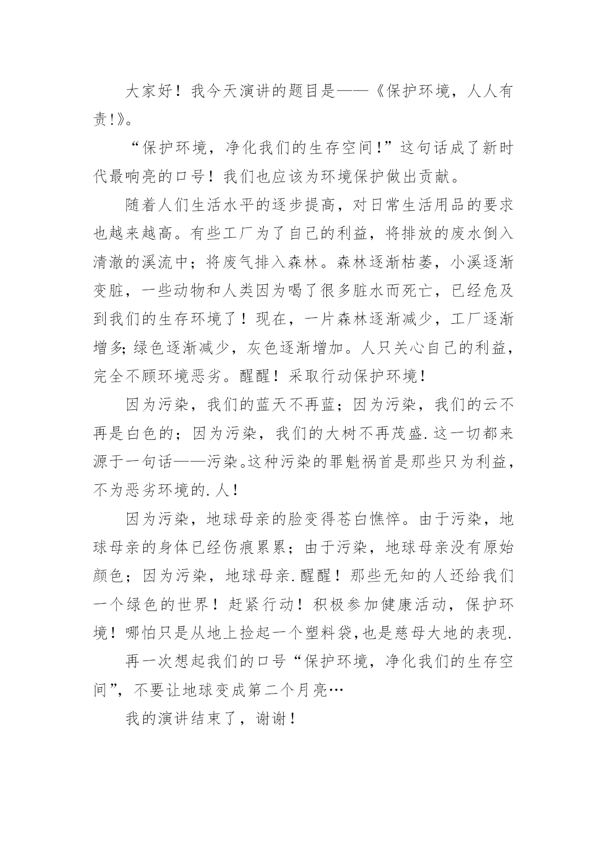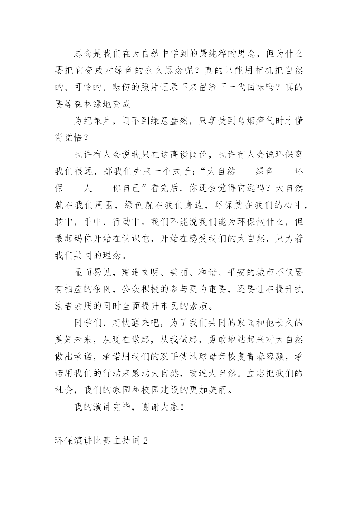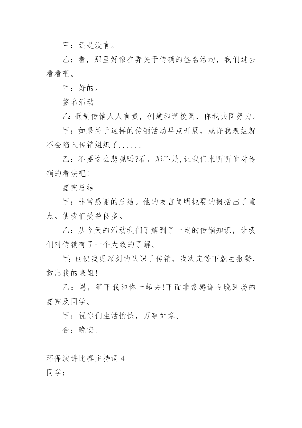 环保演讲比赛主持词主持词是各种演出活动和集会中主持人串联节目的串联词。在人们越来越多的参与各种活动的今天,主持人在各种场合变得越来越重要,现在你是否对主持词一筹莫展呢?以下是小编整理的环保演讲比赛主持词,欢迎阅读,希望大家能够喜欢。环保演讲比赛主持词1亲爱的老师们,亲爱的学生们:大家好!200万年前,地球在46亿年的历史长河中缓缓航行后,我们不平凡的生命诞生了。他的足迹开始踏上这个可爱的蓝色星球。地球母亲从未想过这是她荣耀和噩梦的开始。因为人类对自然无止境的需求,让我们曾经温柔善良的地球母亲变得暴虐任性。经过无数次的沧桑,她的美丽已经变成了过去,换成了陈旧、肮脏、面目全非。我无法想象如果有一天地球上没有绿色,人类文明会发生什么。到时候可能就这么消失了,一切都只会淹没在飞沙中。当碧波澎湃的森林被无边无际的.沙漠黄尘取代,当蓝天上自由飘浮的白云被黑烟取代,当遮挡着地球风雨的臭氧层被无情的氟利昂摧毁,我清晰地听到了森林的哭泣,白云的悲哀,臭氧层的叹息。思念是我们在大自然中学到的最纯粹的思念,但为什么要把它变成对绿色的永久思念呢?真的只能用相机把自然的、可怜的、悲伤的照片记录下来留给下一代回味吗?真的要等森林绿地变成为纪录片,闻不到绿意盎然,只享受到乌烟瘴气时才懂得觉悟?也许有人会说我只在这高谈阔论,也许有人会说环保离我们很远,那我们先来一个式子:“大自然——绿色——环保——人——你自己”看完后,你还会觉得它远吗?大自然就在我们周围,绿色就在我们身边,环保就在我们的心中,脑中,手中,行动中。我们不能说我们能为环保做什么,但最起码你开始在认识它,开始在感受我们的大自然,只为着我们共同的理念。显而易见,建造文明、美丽、和谐、平安的城市不仅要有相应的条例,公众积极的参与更为重要,还要让在提升执法者素质的同时全面提升市民的素质。同学们,赶快醒来吧,为了我们共同的家园和他长久的美好未来,从现在做起,从我做起,勇敢地站起来对大自然做出承诺,承诺用我们的双手使地球母亲恢复青春容颜,承诺用我们的行动来感动大自然,改造大自然。立志把我们的社会,我们的家园和校园建设的更加美丽。我的演讲完毕,谢谢大家!环保演讲比赛主持词2环保,题目,可以说是家喻户晓。但是在现实生活中,还是有人不太重视,认为它无足轻重。在我看来,环保要从小事做起。我经历过两个这样的小事:有一天我去超市买东西,来到超市门口,看到发了几份传单,看见人就给,看见车就放,但有些人不要,就扔在地上。我过去常常把纸扔进垃圾箱。我看到两个人用胶水在墙上贴传单。从远处看,他们像“牛皮癣”。在他们没注意的时候,我拿出了我的绝活“撕纸”。哈哈,我去掉了一大块“牛皮癣”。还有一次,我在楼底玩的时候,发现远处的草地上冒出一缕缕白烟。走近一看,原来是我们班的一群孩子在那里放火烧草,一大块草黑了。作为一个老大哥,我赶紧制止了,讲了火的危险,讲了环保的重要性。可耻的是,他们很快从附近带了水来灭火,结束了烧草行动。我们都生活在一个星球上,那就是地球。地球上有氧气供我们呼吸,茂密的森林,辽阔的草原,无边无际的'海洋,各种动物,构成了美丽的大自然。但是有些人不珍惜地球给我们的一切,破坏自然,杀死太多野生动物。此外,各种破坏环境的做法给我们的自然带来了越来越多的灾难。长长的黄沙取代了绿色的森林,波涛汹涌的河流变成了干涸的河床,美丽的景区变成了荒野。还有空气污染,臭氧层空洞等等,都是人们没有保护好环境的恶果。从前,我家乡的空气清新,天空湛蓝。它真的像一幅彩色的画。太美了!但此刻,汽车排放污染空气的黑烟。经过更多的工厂,排出污水,水变黑发臭,污染严重。我的家乡附近有一个垃圾桶,人们在那里倾倒垃圾,甚至有人在垃圾桶外面扔垃圾。每年夏天,它都成为苍蝇和蚊子的栖息地,当风吹过时,可恶的白色污染就来加入乐趣。垃圾桶旁边有一个池塘。水面上漂浮着一些泡沫垃圾。水又黑又脏。里面的鱼都死了。池塘里的水死寂无声。我想大声呼吁人们:地球属于我们,属于我们所有人。我们要用双手从我和大家做起,保护环境,爱护地球上的自然资源,让家乡清澈的池水依旧流淌,让花儿依旧那样盛开。伙计,该起床了。睁开你的眼睛,看看我们周围。这是我们的家。让我们从现在开始洗手,用自己的双手,用自己的智慧,用自己的良心,为子孙后代留下一个和谐美好的家园。让我们为我们世世代代的持续生存而努力。环保演讲比赛主持词3甲:尊敬的老师乙:亲爱的同学合:大家晚上好甲:首先请允许我介绍今晚到场的嘉宾......乙:让我们对他们的到来致以热烈的掌声。甲:小乙,你想不想做兼职啊?乙:想啊!我最近刚买了一件美的冒泡的春装,花了我三百大洋!正缺钱呢!难道你有什么好的兼职介绍?甲:我表姐在来宾的一个化妆品公司做销售经理,他们公司最近在招校园代理,你有没有兴趣呢?乙:化妆品?好啊!具体是怎样的?介绍一下。甲