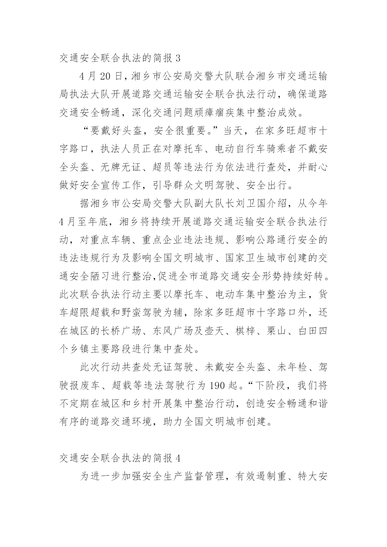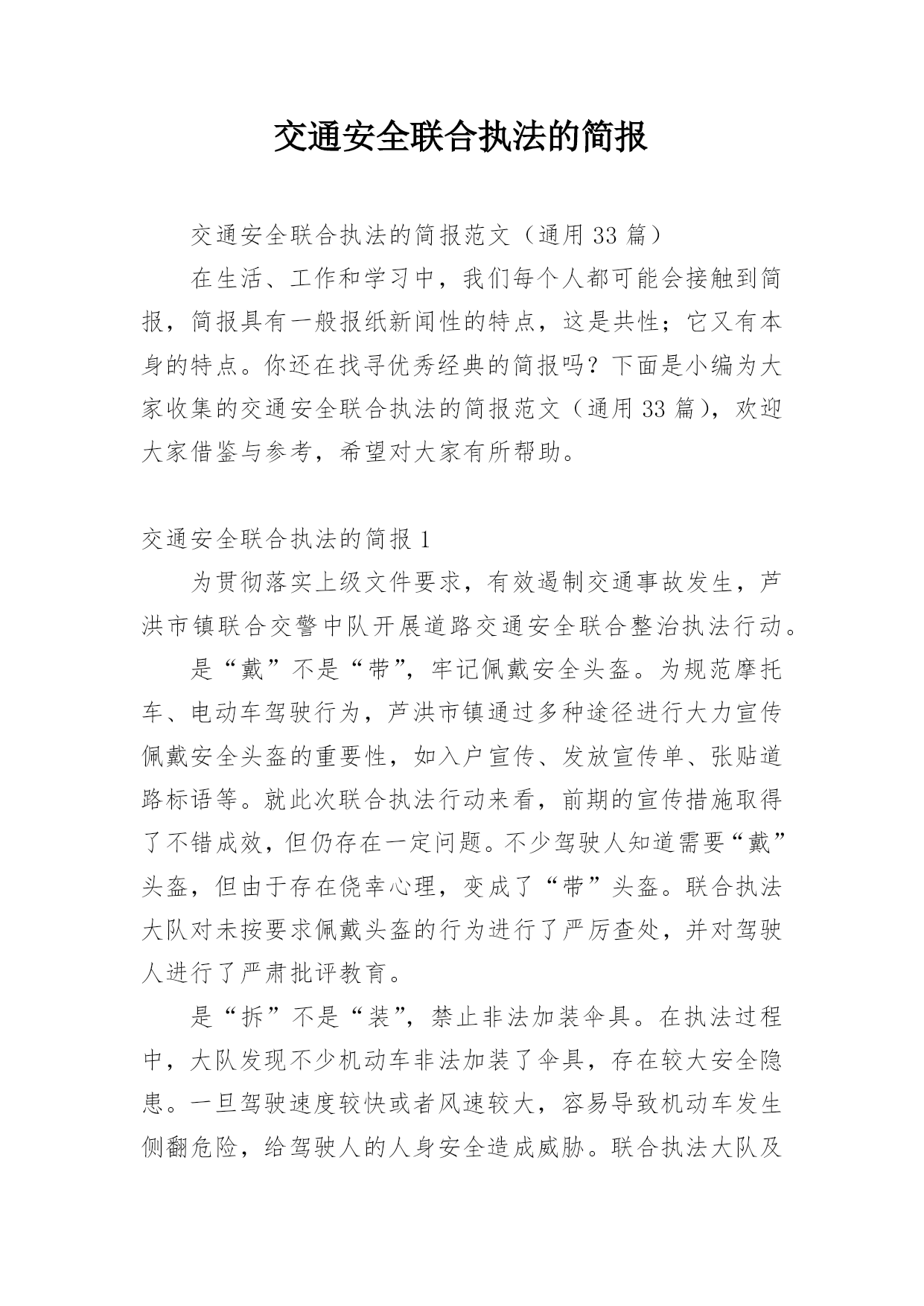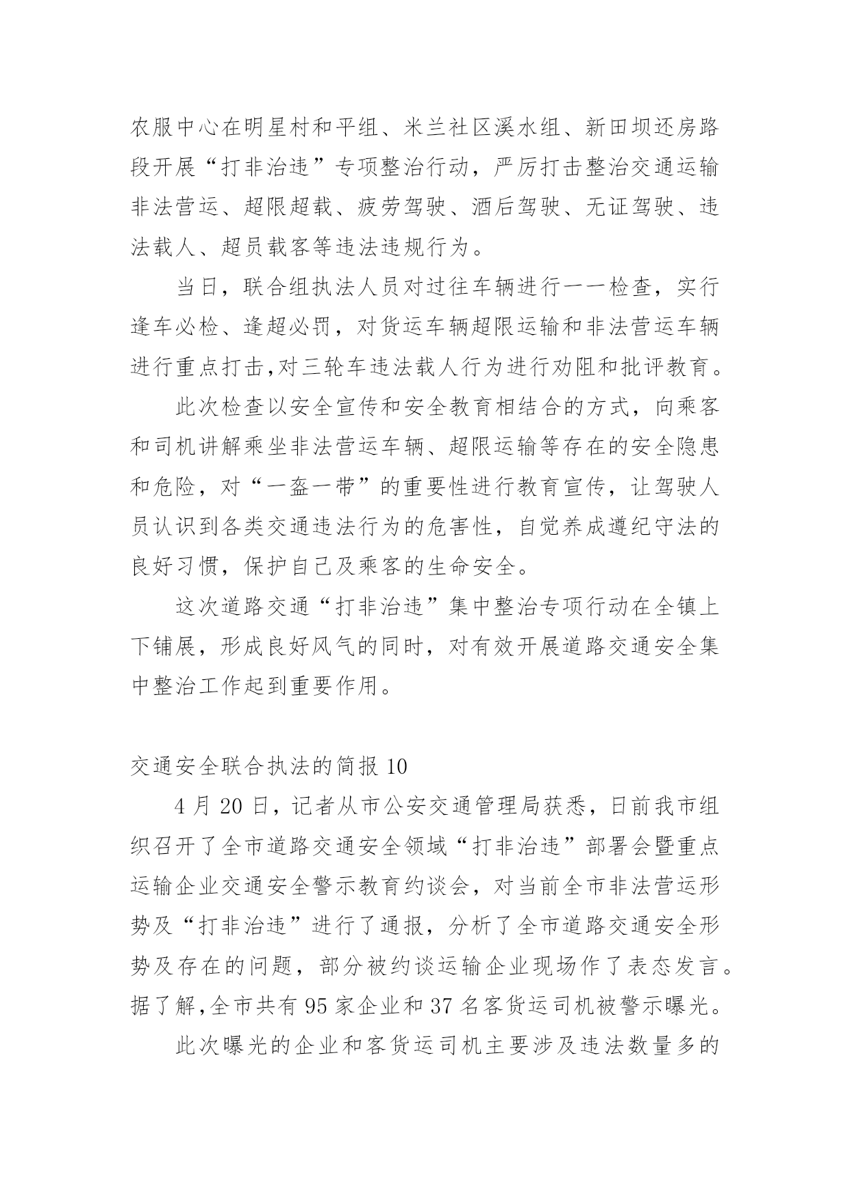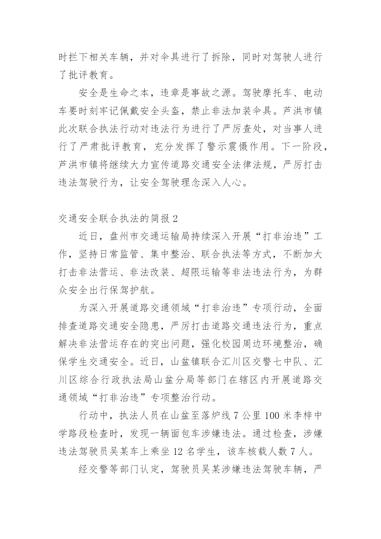 交通安全联合执法的简报交通安全联合执法的简报范文(通用33篇)在生活、工作和学习中,我们每个人都可能会接触到简报,简报具有一般报纸新闻性的特点,这是共性;它又有本身的特点。你还在找寻优秀经典的简报吗?下面是小编为大家收集的交通安全联合执法的简报范文(通用33篇),欢迎大家借鉴与参考,希望对大家有所帮助。交通安全联合执法的简报1为贯彻落实上级文件要求,有效遏制交通事故发生,芦洪市镇联合交警中队开展道路交通安全联合整治执法行动。是“戴”不是“带”,牢记佩戴安全头盔。为规范摩托车、电动车驾驶行为,芦洪市镇通过多种途径进行大力宣传佩戴安全头盔的重要性,如入户宣传、发放宣传单、张贴道路标语等。就此次联合执法行动来看,前期的宣传措施取得了不错成效,但仍存在一定问题。不少驾驶人知道需要“戴”头盔,但由于存在侥幸心理,变成了“带”头盔。联合执法大队对未按要求佩戴头盔的行为进行了严厉查处,并对驾驶人进行了严肃批评教育。是“拆”不是“装”,禁止非法加装伞具。在执法过程中,大队发现不少机动车非法加装了伞具,存在较大安全隐患。一旦驾驶速度较快或者风速较大,容易导致机动车发生侧翻危险,给驾驶人的人身安全造成威胁。联合执法大队及时拦下相关车辆,并对伞具进行了拆除,同时对驾驶人进行了批评教育。安全是生命之本,违章是事故之源。驾驶摩托车、电动车要时刻牢记佩戴安全头盔,禁止非法加装伞具。芦洪市镇此次联合执法行动对违法行为进行了严厉查处,对当事人进行了严肃批评教育,充分发挥了警示震慑作用。下一阶段,芦洪市镇将继续大力宣传道路交通安全法律法规,严厉打击违法驾驶行为,让安全驾驶理念深入人心。交通安全联合执法的简报2近日,盘州市交通运输局持续深入开展“打非治违”工作,坚持日常监管、集中整治、联合执法等方式,不断加大打击非法营运、非法改装、超限运输等非法违法行为,为群众安全出行保驾护航。为深入开展道路交通领域“打非治违”专项行动,全面排查道路交通安全隐患,严厉打击道路交通违法行为,重点解决非法营运存在的突出问题,强化校园周边环境整治,确保学生交通安全。近日,山盆镇联合汇川区交警七中队、汇川区综合行政执法局山盆分局等部门在辖区内开展道路交通领域“打非治违”专项整治行动。行动中,执法人员在山盆至落炉线7公里100米李梓中学路段检查时,发现一辆面包车涉嫌违法。通过检查,涉嫌违法驾驶员吴某车上乘坐12名学生,该车核载人数7人。经交警等部门认定,驾驶员吴某涉嫌违法驾驶车辆,严重违反《中华人民共和国道路交通法》第四十九条和《中华人民共和国道路交通安全法实施条例》第五十五条第一项,根据《中华人民共和国道路交通法》和《机动车驾驶证申领和使用规定》有关规定,对驾驶人吴某给予罚款200元、驾驶证记六分的处罚,车辆交由汇川区综合行政执法局山盆分局处理。随后,执法人员对驾驶人吴某宣讲接送中小学生超员的.危害性,以及近期交警部门出台的相关法规政策,提醒驾驶人杜绝违法,平安出行。同时联系营运车辆将学生进行转运。据悉,本次道路交通安全“打非治违”整治行动检查车辆40余辆,登记10余辆,共计查处道路交通违法行为15起。其中未戴头盔7起、超员载客1起、超重载货3起、未系安全带2起、违禁标志物1起、非法营运且超员1起,发放各类宣传资料(手册)约200余份,进一步提升群众道路交通安全意识,特别是在促进中小学生道路交通安全意识提升等方面取得实效。“下一步,我镇将持续加大道路交通领域“打非治违”专项行动,依法依规、依据政策,严厉打击超员、非法营运车辆,特别是接送学生车辆进行严厉查处,形成高压整治态势,及时发现和整改道路交通安全隐患,坚决防范和遏制非法违规行为导致的重特大安全事故,着力构建安全生产长效机制,切实维护人民群众生命财产安全。”山盆镇党委委员、副镇长李宗良说道。交通安全联合执法的简报34月20日,湘乡市公安局交警大队联合湘乡市交通运输局执法大队开展道路交通运输安全联合执法行动,确保道路交通安全畅通,深化交通问题顽瘴痼疾集中整治成效。“要戴好头盔,安全很重要。”当天,在家多旺超市十字路口,执法人员正在对摩托车、电动自行车骑乘者不戴安全头盔、无牌无证、超员等违法行为依法进行查处,并耐心做好安全宣传工作,引导群众文明驾驶、安全出行。据湘乡市公安局交警大队副大队长刘卫国介绍,从今年4月至年底,湘乡将持续开展道路交通运输安全联合执法行动,对重点车辆、重点企业违法违规、影响公路通行安全的违法违规行为及影响全国文明城市、国家卫生城市创建的交通安全陋习进行整治,促进全市道路交通安全形势持续好转。此次联合执法行动主要以摩托车、电动车集中整治为主,货车超限超载和野蛮驾驶为辅,除家多旺超市十字路口外,还在城区的长桥广场、东风广场及壶天、棋梓、栗山、白田四个乡镇主要路段进行集中查处。此次行动共查处无证驾驶、未戴安全头盔、未