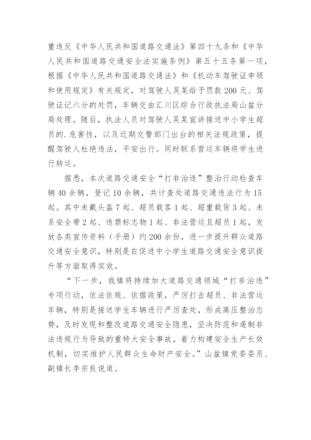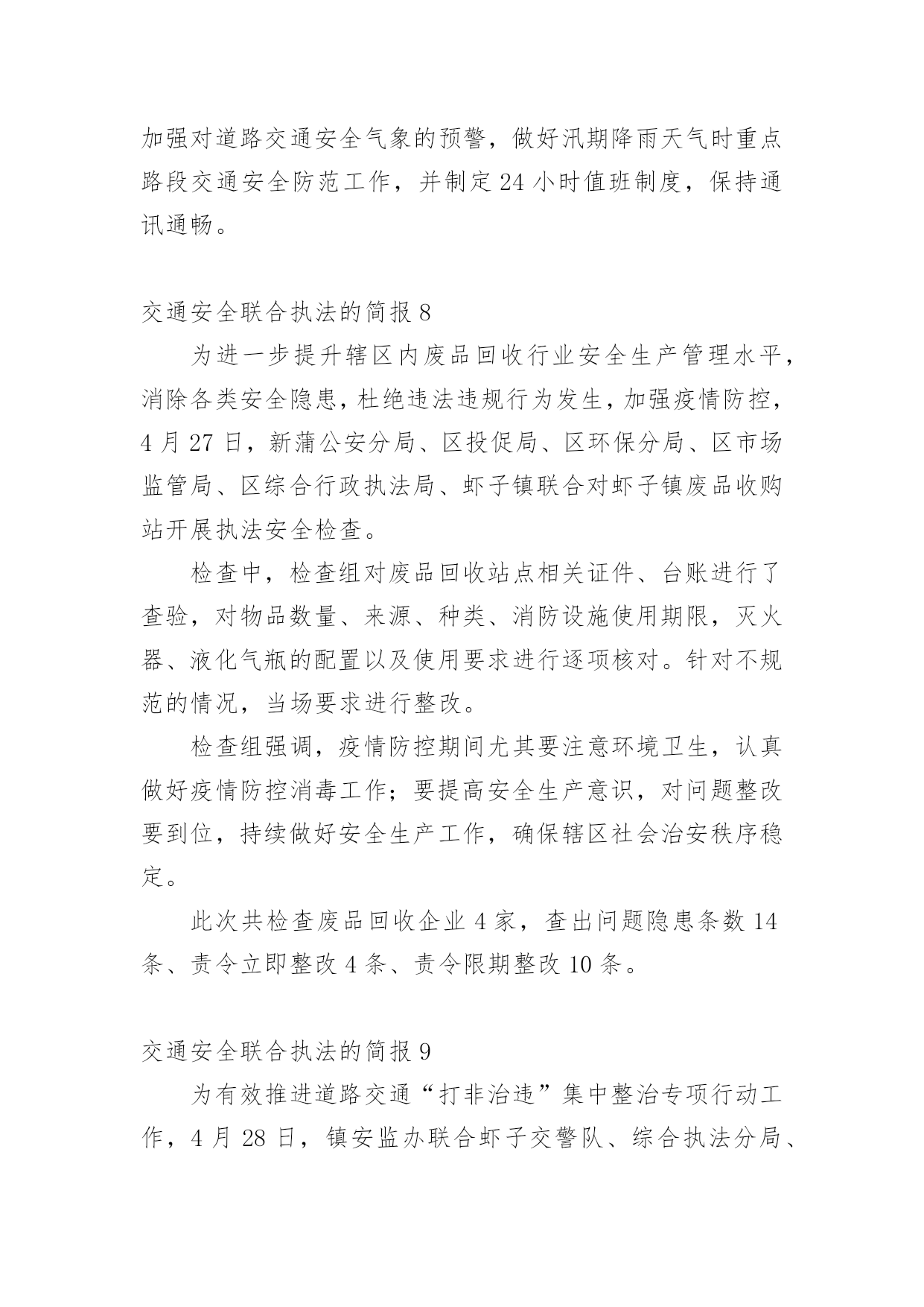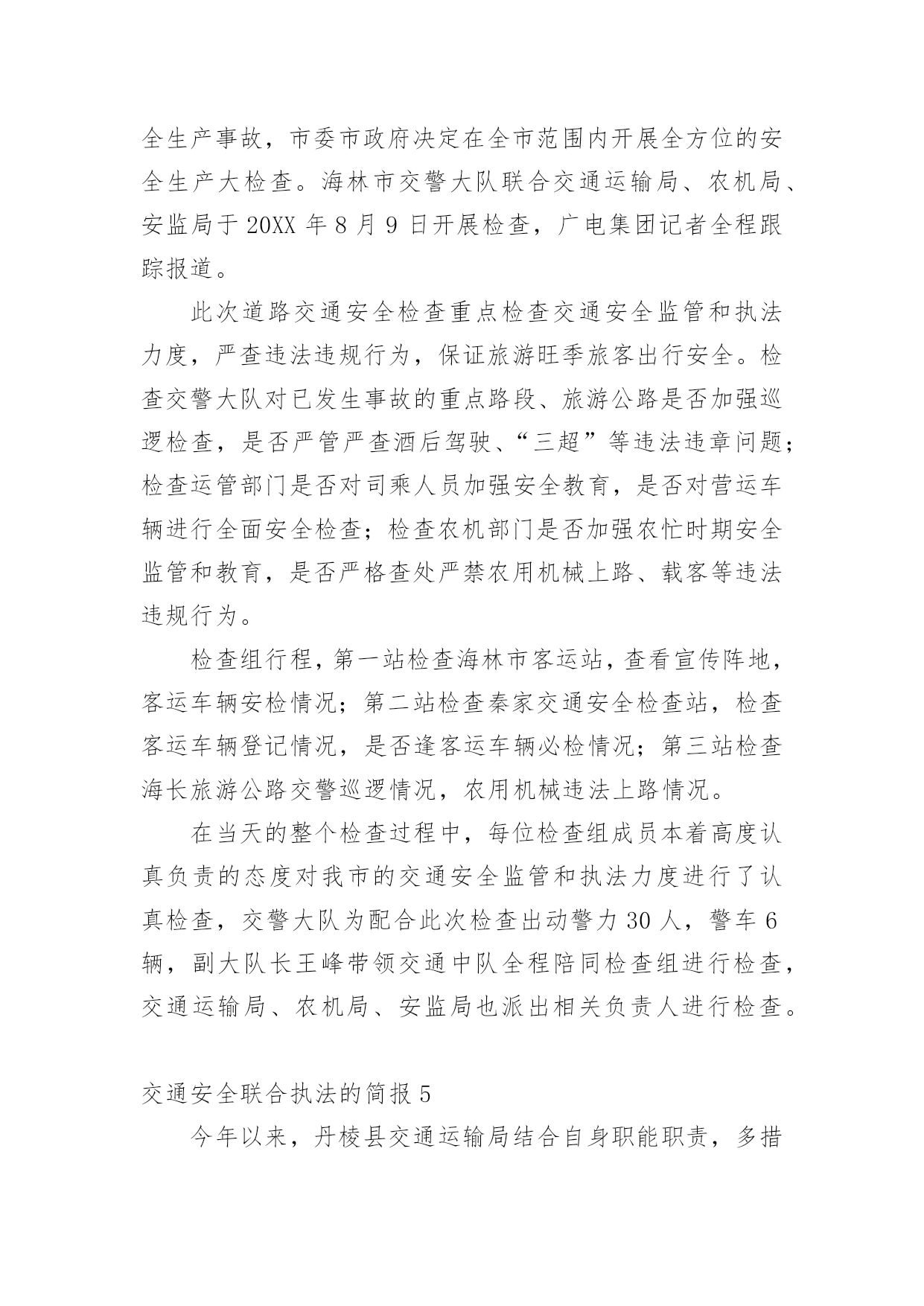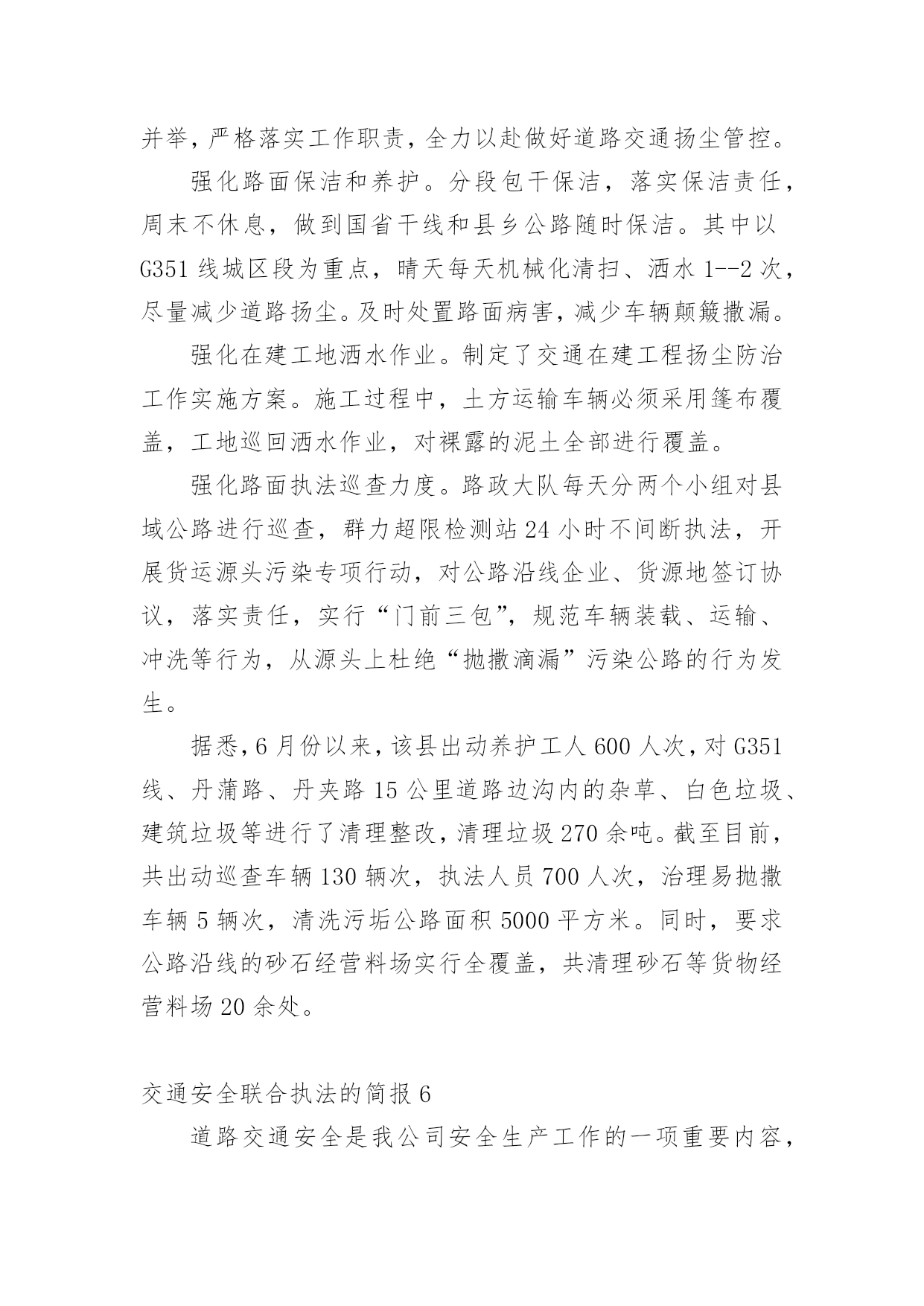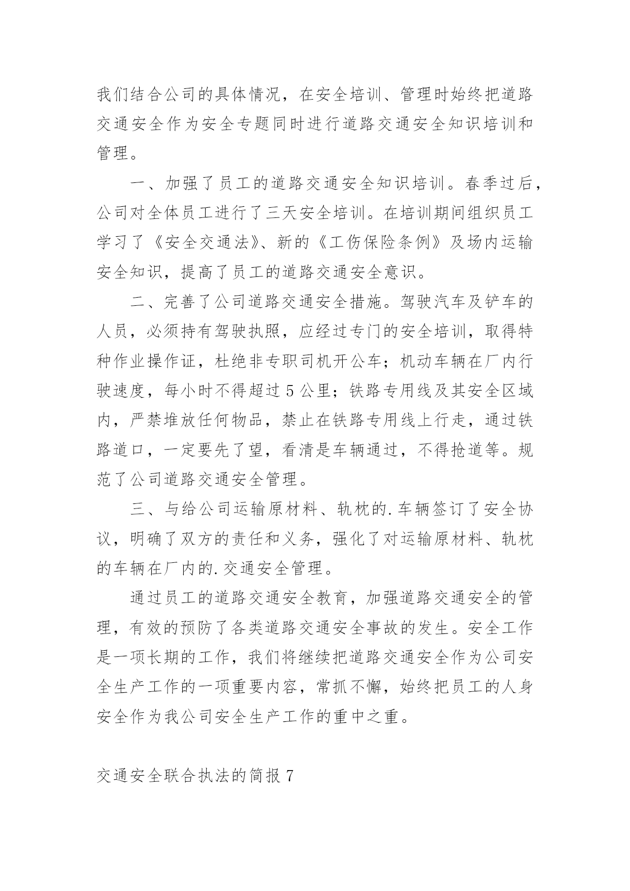 交通安全联合执法的简报交通安全联合执法的简报范文(通用33篇)在生活、工作和学习中,我们每个人都可能会接触到简报,简报具有一般报纸新闻性的特点,这是共性;它又有本身的特点。你还在找寻优秀经典的简报吗?下面是小编为大家收集的交通安全联合执法的简报范文(通用33篇),欢迎大家借鉴与参考,希望对大家有所帮助。交通安全联合执法的简报1为贯彻落实上级文件要求,有效遏制交通事故发生,芦洪市镇联合交警中队开展道路交通安全联合整治执法行动。是“戴”不是“带”,牢记佩戴安全头盔。为规范摩托车、电动车驾驶行为,芦洪市镇通过多种途径进行大力宣传佩戴安全头盔的重要性,如入户宣传、发放宣传单、张贴道路标语等。就此次联合执法行动来看,前期的宣传措施取得了不错成效,但仍存在一定问题。不少驾驶人知道需要“戴”头盔,但由于存在侥幸心理,变成了“带”头盔。联合执法大队对未按要求佩戴头盔的行为进行了严厉查处,并对驾驶人进行了严肃批评教育。是“拆”不是“装”,禁止非法加装伞具。在执法过程中,大队发现不少机动车非法加装了伞具,存在较大安全隐患。一旦驾驶速度较快或者风速较大,容易导致机动车发生侧翻危险,给驾驶人的人身安全造成威胁。联合执法大队及时拦下相关车辆,并对伞具进行了拆除,同时对驾驶人进行了批评教育。安全是生命之本,违章是事故之源。驾驶摩托车、电动车要时刻牢记佩戴安全头盔,禁止非法加装伞具。芦洪市镇此次联合执法行动对违法行为进行了严厉查处,对当事人进行了严肃批评教育,充分发挥了警示震慑作用。下一阶段,芦洪市镇将继续大力宣传道路交通安全法律法规,严厉打击违法驾驶行为,让安全驾驶理念深入人心。交通安全联合执法的简报2近日,盘州市交通运输局持续深入开展“打非治违”工作,坚持日常监管、集中整治、联合执法等方式,不断加大打击非法营运、非法改装、超限运输等非法违法行为,为群众安全出行保驾护航。为深入开展道路交通领域“打非治违”专项行动,全面排查道路交通安全隐患,严厉打击道路交通违法行为,重点解决非法营运存在的突出问题,强化校园周边环境整治,确保学生交通安全。近日,山盆镇联合汇川区交警七中队、汇川区综合行政执法局山盆分局等部门在辖区内开展道路交通领域“打非治违”专项整治行动。行动中,执法人员在山盆至落炉线7公里100米李梓中学路段检查时,发现一辆面包车涉嫌违法。通过检查,涉嫌违法驾驶员吴某车上乘坐12名学生,该车核载人数7人。经交警等部门认定,驾驶员吴某涉嫌违法驾驶车辆,严重违反《中华人民共和国道路交通法》第四十九条和《中华人民共和国道路交通安全法实施条例》第五十五条第一项,根据《中华人民共和国道路交通法》和《机动车驾驶证申领和使用规定》有关规定,对驾驶人吴某给予罚款200元、驾驶证记六分的处罚,车辆交由汇川区综合行政执法局山盆分局处理。随后,执法人员对驾驶人吴某宣讲接送中小学生超员的.危害性,以及近期交警部门出台的相关法规政策,提醒驾驶人杜绝违法,平安出行。同时联系营运车辆将学生进行转运。据悉,本次道路交通安全“打非治违”整治行动检查车辆40余辆,登记10余辆,共计查处道路交通违法行为15起。其中未戴头盔7起、超员载客1起、超重载货3起、未系安全带2起、违禁标志物1起、非法营运且超员1起,发放各类宣传资料(手册)约200余份,进一步提升群众道路交通安全意识,特别是在促进中小学生道路交通安全意识提升等方面取得实效。“下一步,我镇将持续加大道路交通领域“打非治违”专项行动,依法依规、依据政策,严厉打击超员、非法营运车辆,特别是接送学生车辆进行严厉查处,形成高压整治态势,及时发现和整改道路交通安全隐患,坚决防范和遏制非法违规行为导致的重特大安全事故,着力构建安全生产长效机制,切实维护人民群众生命财产安全。”山盆镇党委委员、副镇长李宗良说道。交通安全联合执法的简报34月20日,湘乡市公安局交警大队联合湘乡市交通运输局执法大队开展道路交通运输安全联合执法行动,确保道路交通安全畅通,深化交通问题顽瘴痼疾集中整治成效。“要戴好头盔,安全很重要。”当天,在家多旺超市十字路口,执法人员正在对摩托车、电动自行车骑乘者不戴安全头盔、无牌无证、超员等违法行为依法进行查处,并耐心做好安全宣传工作,引导群众文明驾驶、安全出行。据湘乡市公安局交警大队副大队长刘卫国介绍,从今年4月至年底,湘乡将持续开展道路交通运输安全联合执法行动,对重点车辆、重点企业违法违规、影响公路通行安全的违法违规行为及影响全国文明城市、国家卫生城市创建的交通安全陋习进行整治,促进全市道路交通安全形势持续好转。此次联合执法行动主要以摩托车、电动车集中整治为主,货车超限超载和野蛮驾驶为辅,除家多旺超市十字路口外,还在城区的长桥广场、东风广场及壶天、棋梓、栗山、白田四个乡镇主要路段进行集中查处。此次行动共查处无证驾驶、未戴安全头盔、未