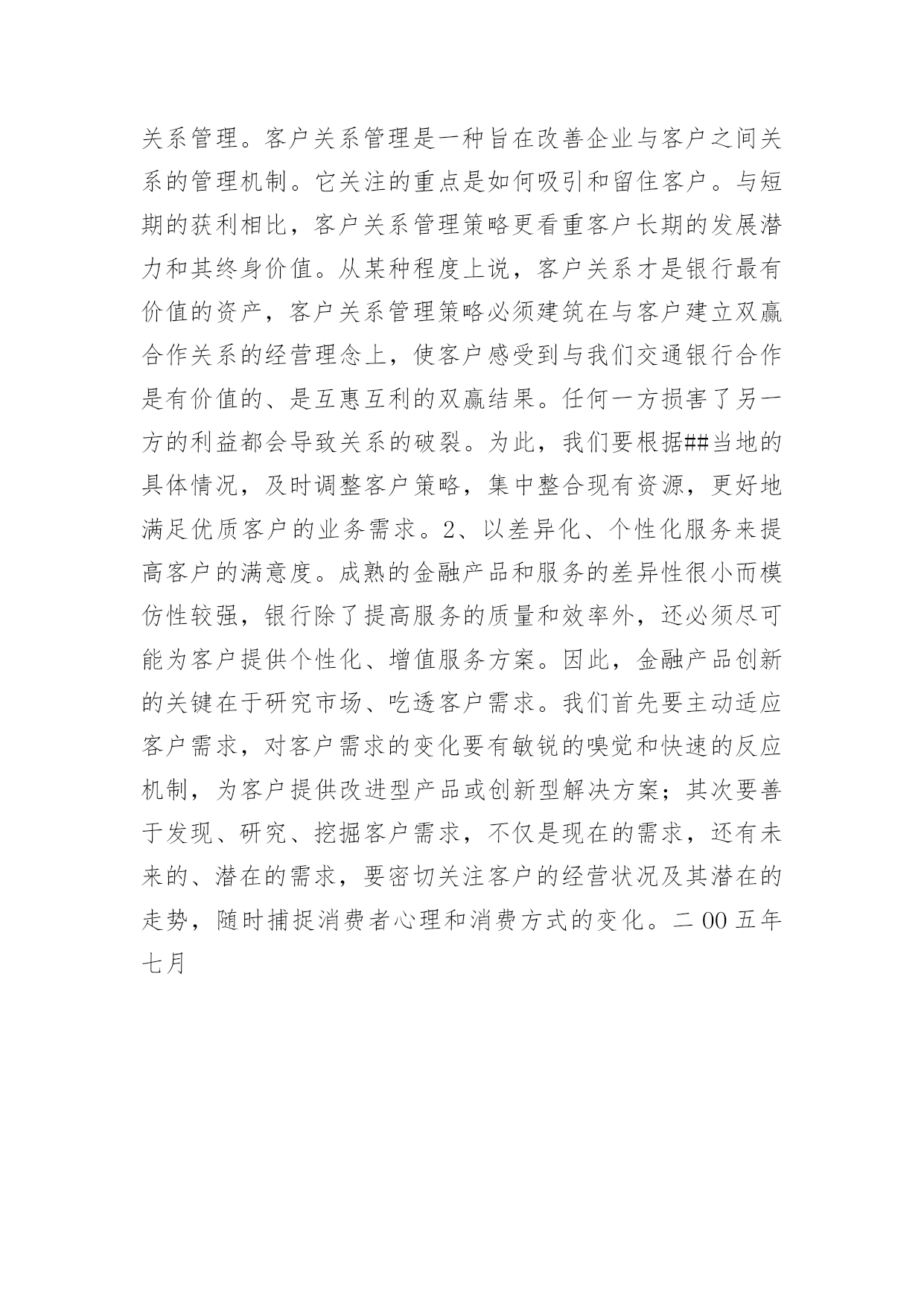 连通银企双赢路(交通银行)20xx年,交通银行##分行将根据国家宏观经济金融政策和货币信贷政策,认真分析本地区经济环境、资金运作特点和客户分布状况,进一步明确发展目标,加快各项业务发展,努力为全市的经济建设与发展提供优质金融产品与服务。一、创新先进的服务手段20xx年,交通银行将围绕“综合功能领先”战略,通过创新先进的服务手段,在质量和效率上提升我行的核心竞争能力。1、树立以市场为导向的创新观念。交通银行将注重对市场的研究,跟踪、分析、预测经济金融形势,关注区域经济、行业经济、要素市场的发展动态,认真分析市场环境中的新情况、新政策、新机遇;注重对客户的研究,重点研究那些成长性好、盈利性强的优质重点客户,关注重点行业中的重点企业、上市公司、跨国公司、高科技公司、公用事业类客户、金融同业客户以及优质个人客户群体,挖掘和创造金融需求,开展差别化服务;注重结合市场、客户需求和同业发展情况,明确自身的优势和劣势,科学合理地进行创新定位,以优质服务来吸引客户,从而增强客户对交通银行服务品牌的认知度。此外,我们的服务手段创新还要通过全面采集和分析市场客户信息,建立一个高效、科学的客户及服务资料数据库,进行互动的客户关系管理,实时查询和更新客户信息,随时根据市场客户的需求进行金融产品的创新设计。2、以高科技为依托,创新金融服务工具。交通银行要加快技术创新,一方面要为客户创造一个互动的信息沟通渠道;另一方面也有利于建立完善的客户资料数据库,并在此基础上进行目标市场细分,有的放矢地为客户提供细分化、个性化的金融创新产品。同时,交通银行还将大力推进中间业务产品的创新。如以银行卡为媒体,大力发展网上银行、电子货币、网上支付、代发工资、代扣代缴公用事业费等中间业务;利用先进的网络通讯技术,将交行网络同各种证券网络联网,通过银行网络进行证券交易、证券转帐、国债买卖、外汇买卖、结售汇等投资交易业务;利用银行信息处理技术,发展代客理财、企业财务顾问等业务,通过统计分析和运算为客户提供多种咨询服务和投资组合方案,全方位满足客户的理财需求;进一步发展证券基金、保险基金、基金托管等业务。利用IC卡功能,使交通银行的服务渗透到医疗保险、税收、公务采购等社会生活的各个方面。3、加强组织管理,健全产品创新机制。交通银行要通过深化体制改革,加快建立现代商业银行制度的步伐,健全创新机制,从根本上确立业务创新的主体地位,激发以创新求生存、图发展的内在动力,并充分调动分行员工和专业技术人员的潜能和积极性,激发其智慧和才能,使交通银行基于创新的核心竞争能力得以不断地提升。二、创造与客户共发展的双赢局面20xx年,交通银行在经营中,始终以满足客户的需求为出发点和立足点,将关注的重点从产品转移到客户需求上,致力于为其提供度身定制的解决问题方案,以此提升客户的满意度,与客户建立长期稳定的合作关系。1、客户关系管理重在提升客户价值、创造双赢局面。引入客户关系管理。客户关系管理是一种旨在改善企业与客户之间关系的管理机制。它关注的重点是如何吸引和留住客户。与短期的获利相比,客户关系管理策略更看重客户长期的发展潜力和其终身价值。从某种程度上说,客户关系才是银行最有价值的资产,客户关系管理策略必须建筑在与客户建立双赢合作关系的经营理念上,使客户感受到与我们交通银行合作是有价值的、是互惠互利的双赢结果。任何一方损害了另一方的利益都会导致关系的破裂。为此,我们要根据##当地的具体情况,及时调整客户策略,集中整合现有资源,更好地满足优质客户的业务需求。2、以差异化、个性化服务来提高客户的满意度。成熟的金融产品和服务的差异性很小而模仿性较强,银行除了提高服务的质量和效率外,还必须尽可能为客户提供个性化、增值服务方案。因此,金融产品创新的关键在于研究市场、吃透客户需求。我们首先要主动适应客户需求,对客户需求的变化要有敏锐的嗅觉和快速的反应机制,为客户提供改进型产品或创新型解决方案;其次要善于发现、研究、挖掘客户需求,不仅是现在的需求,还有未来的、潜在的需求,要密切关注客户的经营状况及其潜在的走势,随时捕捉消费者心理和消费方式的变化。二OO五年七月