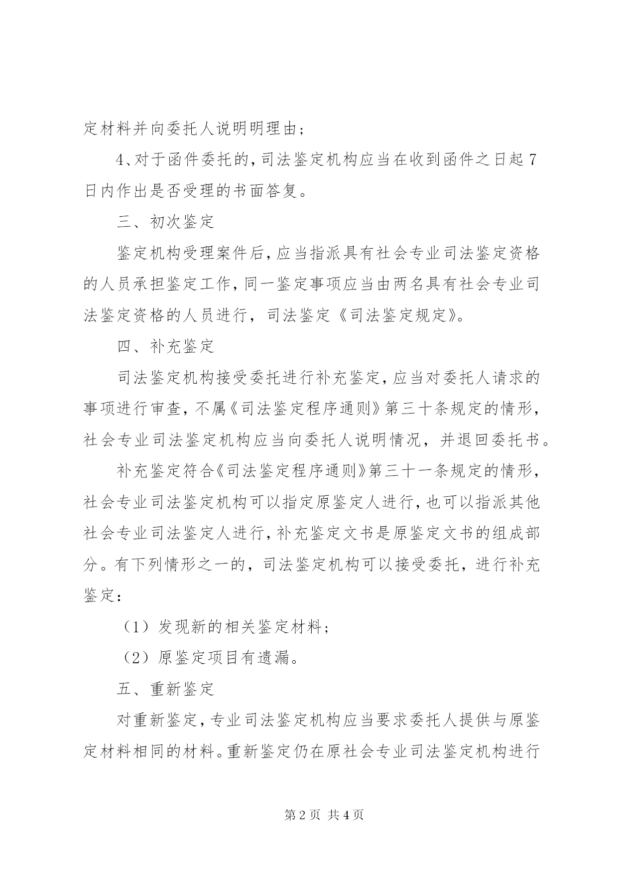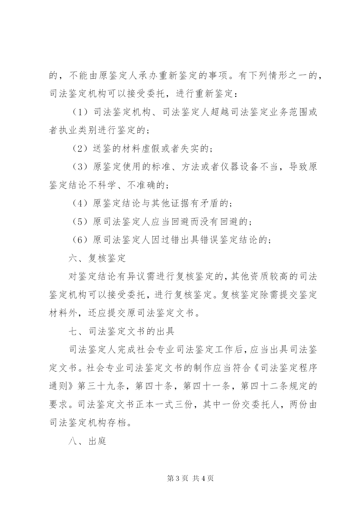 第PAGE\*Arabic\*MERGEFORMAT4页共NUMPAGES\*MERGEFORMAT4页司法鉴定教育培训规定司法鉴定规定司法鉴定程序规定根据《司法鉴定程序通则(试行)》规定,申请司法鉴定应遵循以下程序:一、委托司法鉴定机构和社会专业司法鉴定人接受司法机关的委托,从事委托请求事项的司法鉴定;非诉讼案件鉴定的受托从其行业规定,司法鉴定规定。1、司法鉴定机构接受司法机关、仲裁机构的司法鉴定委托。2、在诉讼案件中,在当事人负有举证责任的情况下,司法鉴定机构也可以接受当事人的司法鉴定委托。当事人委托司法鉴定时一般通过律师事务所进行。二、受理司法鉴定机构收到委托书后,应对委托人的委托事项进行审核,并作出如下决定:1、对于符合受理条件的,能够即时决定受理的,司法鉴定机构应当与委托人签订《司法鉴定委托受理合同》;2、不能即时决定受理的,应当向委托人出具《司法鉴定委托材料收领单》,在收领委托材料之日起7日内对是否受理作出决定;3、对于不符合受理条件的,决定不予受理的,应当退回鉴定材料并向委托人说明明理由;4、对于函件委托的,司法鉴定机构应当在收到函件之日起7日内作出是否受理的书面答复。三、初次鉴定鉴定机构受理案件后,应当指派具有社会专业司法鉴定资格的人员承担鉴定工作,同一鉴定事项应当由两名具有社会专业司法鉴定资格的人员进行,司法鉴定《司法鉴定规定》。四、补充鉴定司法鉴定机构接受委托进行补充鉴定,应当对委托人请求的事项进行审查,不属《司法鉴定程序通则》第三十条规定的情形,社会专业司法鉴定机构应当向委托人说明情况,并退回委托书。补充鉴定符合《司法鉴定程序通则》第三十一条规定的情形,社会专业司法鉴定机构可以指定原鉴定人进行,也可以指派其他社会专业司法鉴定人进行,补充鉴定文书是原鉴定文书的组成部分。有下列情形之一的,司法鉴定机构可以接受委托,进行补充鉴定:(1)发现新的相关鉴定材料;(2)原鉴定项目有遗漏。五、重新鉴定对重新鉴定,专业司法鉴定机构应当要求委托人提供与原鉴定材料相同的材料。重新鉴定仍在原社会专业司法鉴定机构进行的,不能由原鉴定人承办重新鉴定的事项。有下列情形之一的,司法鉴定机构可以接受委托,进行重新鉴定:(1)司法鉴定机构、司法鉴定人超越司法鉴定业务范围或者执业类别进行鉴定的;(2)送鉴的材料虚假或者失实的;(3)原鉴定使用的标准、方法或者仪器设备不当,导致原鉴定结论不科学、不准确的;(4)原鉴定结论与其他证据有矛盾的;(5)原司法鉴定人应当回避而没有回避的;(6)原司法鉴定人因过错出具错误鉴定结论的;六、复核鉴定对鉴定结论有异议需进行复核鉴定的,其他资质较高的司法鉴定机构可以接受委托,进行复核鉴定。复核鉴定除需提交鉴定材料外,还应提交原司法鉴定文书。七、司法鉴定文书的出具司法鉴定人完成社会专业司法鉴定工作后,应当出具司法鉴定文书。社会专业司法鉴定文书的制作应当符合《司法鉴定程序通则》第三十九条,第四十条,第四十一条,第四十二条规定的要求。司法鉴定文书正本一式三份,其中一份交委托人,两份由司法鉴定机构存档。八、出庭司法鉴定人应当按照司法机关或者仲裁机关的要求按时出庭。司法鉴定人出庭时,应当出示《司法鉴定人执业证书》,依法实事求是的对鉴定结论的依据进行说明,回答与鉴定相关的问题。