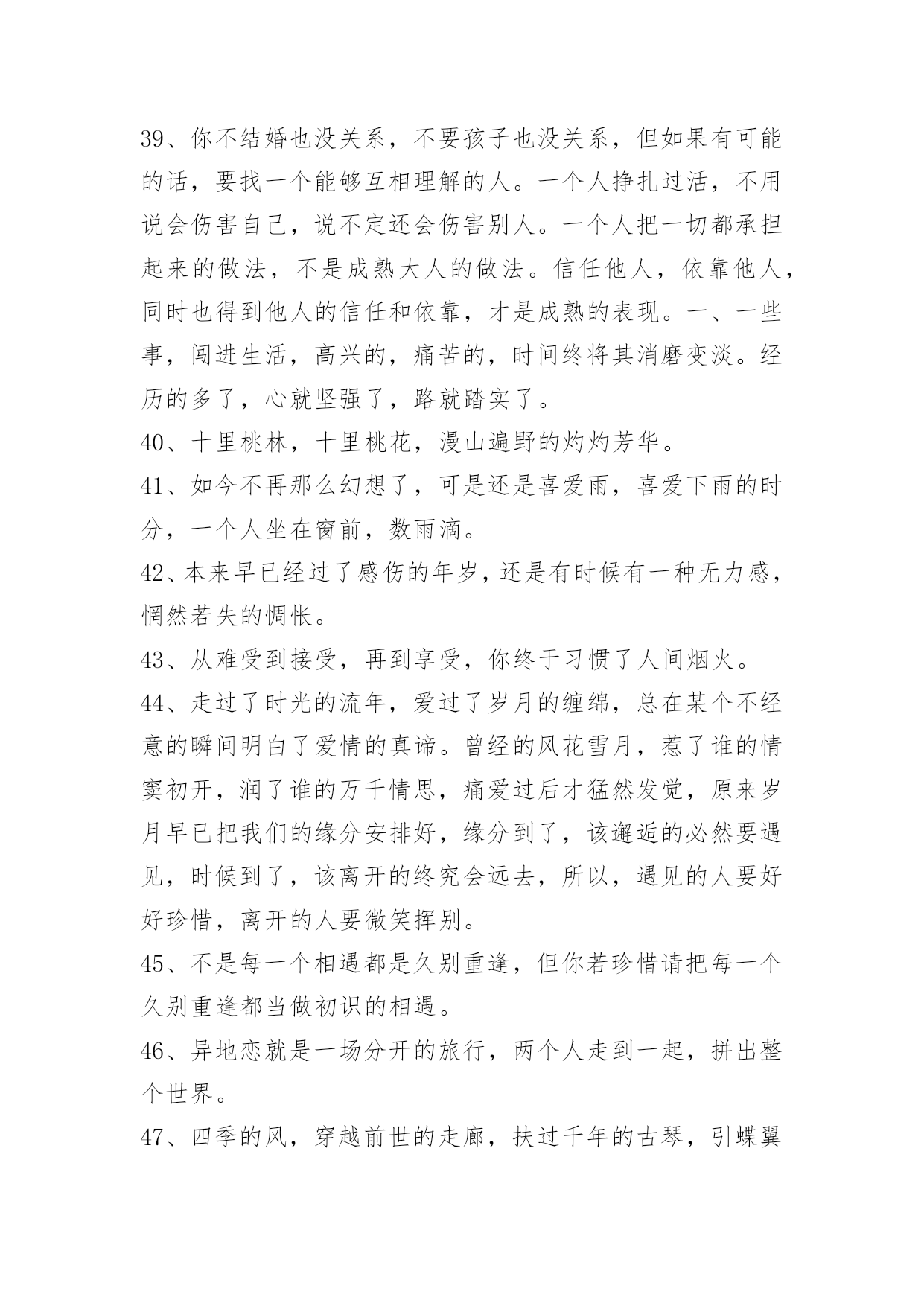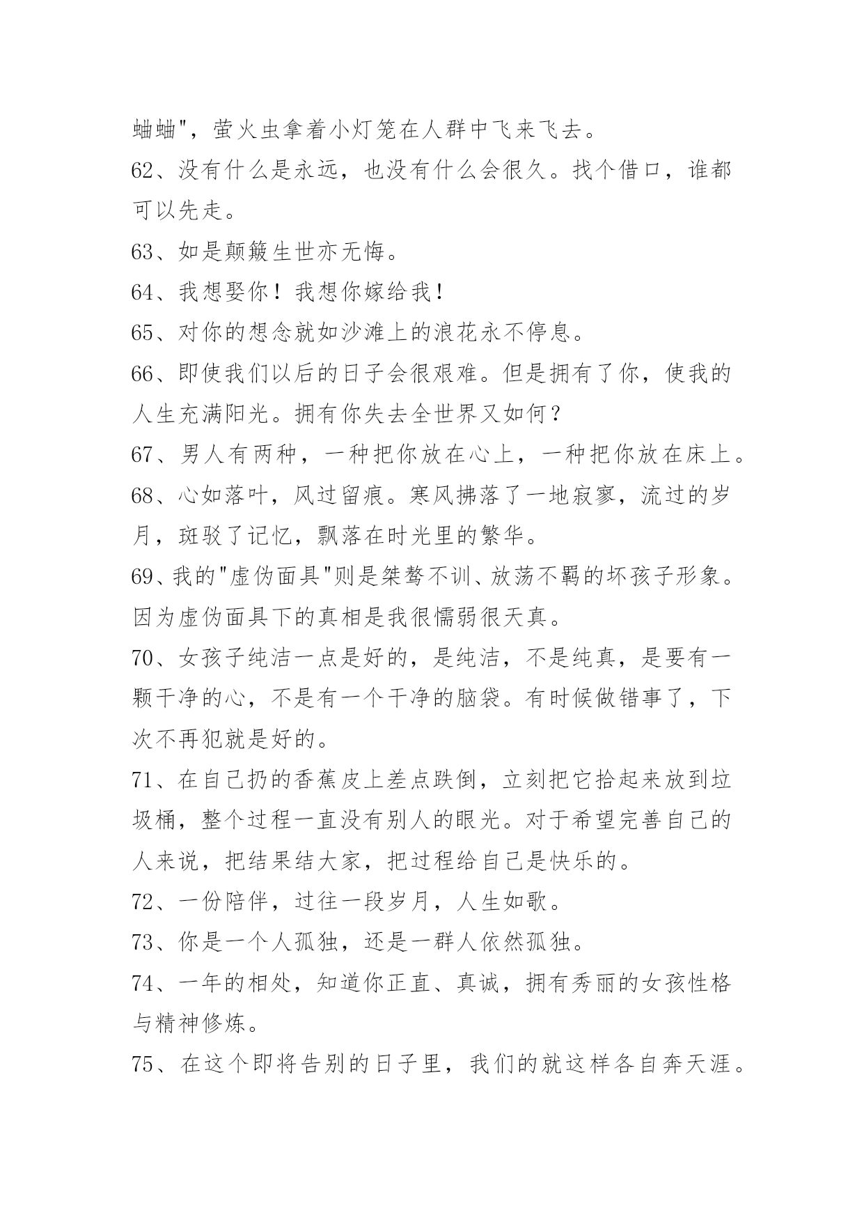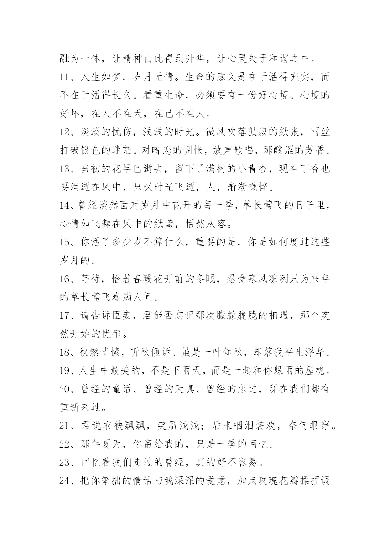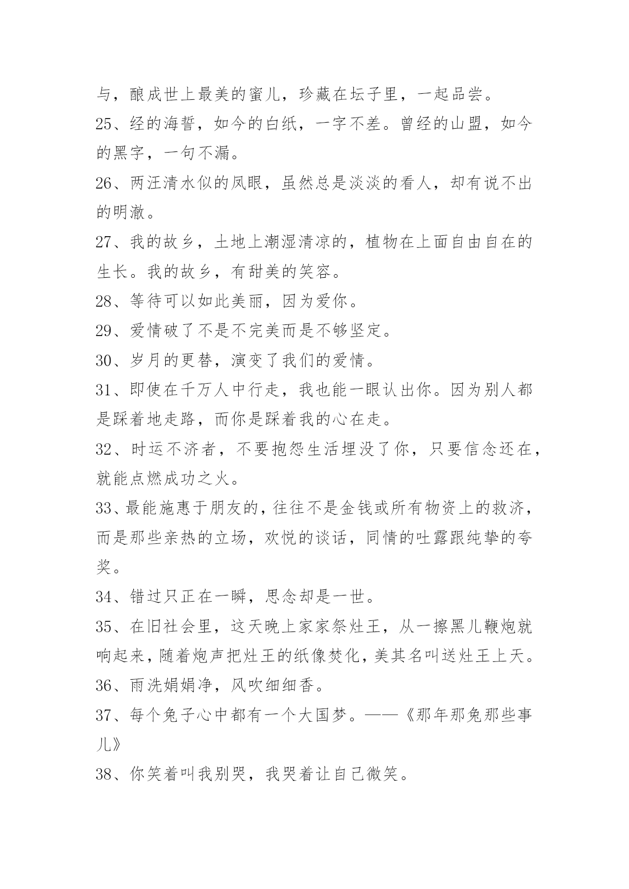 唯美经典句子98条精选唯美经典句子锦集98条人有时候就是需求太满了,从来不去留意那些微小的是,就算失去了,也摸不清头脑。以下是小编精心整理的唯美经典句子98条,一起来欣赏吧。1、曾以为,我是你。前世错过的那只百灵,曾以为,我是你今生无悔的追逐,曾以为,我是你来世预约的相守。暗立誓,这一生,最美的笑颜只为你绽放,做你生命里最后的风景。把自己揉入你怀中,飘逸的发丝只为你,而骄傲不已。只为你,而芳香不息。日月如梭,奈何来去太匆匆,世事变化太无常。苍白了的誓言,夭折了当年,你曾经亲口许给我的不离不弃。2、去为你的未来奔跑吧,那个甘愿为你停下脚步的人,只会在前方等着你,而不是在过去。3、初生的桐花或许知道自己的宿命,却还是会爬上高高的枝头,希望在无尘无嚣的空中竞相放香。就如现在,在我书房的窗外,两树桐花正热烈而沉静地开放。它们虽也离地凌空,而我却有了楼的举托,我和桐花便近在咫尺了,隔窗相望,那些沉静的异香,也仿佛伸手可掬了。4、穿过这茫茫人海,坐看云起时,拢一袭恬淡,相伴人间烟火。清颜凝霜,终将沉淀的心事,婉约成心头的过往。时光悠然如梭,于淡静中轻轻流淌。岁月如逝,心事层叠,回眸过往,总有些许心语,风过处,低吟浅唱,终是遗落。5、不管你经历多痛的事情,到最后都会渐渐遗忘。因为,没有什么能敌得过时光。一世的繁华转眼间便会尘埃落定。怀抱一种信仰坚信,只要保持自己最美好的一面,世界将与你同在。信我的人,我不需要解释,不信我的人,我没必要去解释。6、悲伤逆流成河,蔓延了我那过往的曾经,侵蚀着那段远走的岁月,十月已不是十月,而是蚀月。视线渐渐模糊,记忆慢慢远去,这个十月,我依然未能拾起那久违的快活,反而,蚀进了更多的伤悲。7、等你长大,成熟之后,这一切都会变,你会很怀念初恋时的纯,初恋时的冲动与义无反顾,初恋时的那种强烈在乎。然而因为种种原因,大多数人在初恋时受到了伤害,便一朝被蛇咬十年怕井绳。8、简单不是简陋,不是粗疏,更不是浅薄,简单是大千世界的规律,是红尘乱麻的头绪,是人生品位的精华。正的简单不在于物质而在于精神,不在于表面而在于心灵,不在于模仿而在于沉淀和感受。9、人生好比一趟火车。它的意义并不是要忙碌得停不下脚步,哐哐当当地跑到终点了事。既要到达目的地,也要看窗外的风景;既要朝前看,也需要常常回首从前。这样,人生的旅程才丰富多彩。10、沉思是一种思想的深奥。能让我们全部心思地去投入,使我们更加深刻地理解世间万物沉思会把自己与外部一切融为一体,让精神由此得到升华,让心灵处于和谐之中。11、人生如梦,岁月无情。生命的意义是在于活得充实,而不在于活得长久。看重生命,必须要有一份好心境。心境的好坏,在人不在天,在己不在人。12、淡淡的忧伤,浅浅的时光。微风吹落孤寂的纸张,雨丝打破银色的迷茫。对暗恋的惆怅,放声歌唱,那酸涩的芳香。13、当初的花早已逝去,留下了满树的小青杏,现在丁香也要消逝在风中,只叹时光飞逝,人,渐渐憔悴。14、曾经淡然面对岁月中花开的每一季,草长莺飞的日子里,心情如飞舞在风中的纸鸢,恬然从容。15、你活了多少岁不算什么,重要的是,你是如何度过这些岁月的。16、等待,恰若春暖花开前的冬眠,忍受寒风凛冽只为来年的草长莺飞春满人间。17、请告诉臣妾,君能否忘记那次朦朦胧胧的相遇,那个突然开始的忧郁。18、秋燃情愫,听秋倾诉。虽是一叶知秋,却落我半生浮华。19、人生中最美的,不是下雨天,而是一起和你躲雨的屋檐。20、曾经的童话、曾经的天真、曾经的恋过,现在我们都有重新来过。21、君说衣袂飘飘,笑靥浅浅;后来咽泪装欢,奈何眼穿。22、那年夏天,你留给我的,只是一季的回忆。23、回忆着我们走过的曾经,真的好不容易。24、把你笨拙的情话与我深深的爱意,加点玫瑰花瓣揉捏调与,酿成世上最美的蜜儿,珍藏在坛子里,一起品尝。25、经的海誓,如今的白纸,一字不差。曾经的山盟,如今的黑字,一句不漏。26、两汪清水似的凤眼,虽然总是淡淡的看人,却有说不出的明澈。27、我的故乡,土地上潮湿清凉的,植物在上面自由自在的生长。我的故乡,有甜美的笑容。28、等待可以如此美丽,因为爱你。29、爱情破了不是不完美而是不够坚定。30、岁月的更替,演变了我们的爱情。31、即使在千万人中行走,我也能一眼认出你。因为别人都是踩着地走路,而你是踩着我的心在走。32、时运不济者,不要抱怨生活埋没了你,只要信念还在,就能点燃成功之火。33、最能施惠于朋友的,往往不是金钱或所有物资上的救济,而是那些亲热的立场,欢悦的谈话,同情的吐露跟纯挚的夸奖。34、错过只正在一瞬,思念却是一世。35、在旧社会里,这天晚上家家祭灶王,从一擦黑儿鞭炮就响起来,随着炮声把灶王的纸像焚化,美其名叫送灶王上天。36、雨洗娟娟净,风吹细细香。37、每个兔子心中都有一个大国梦。——《那年那兔那些事儿》38