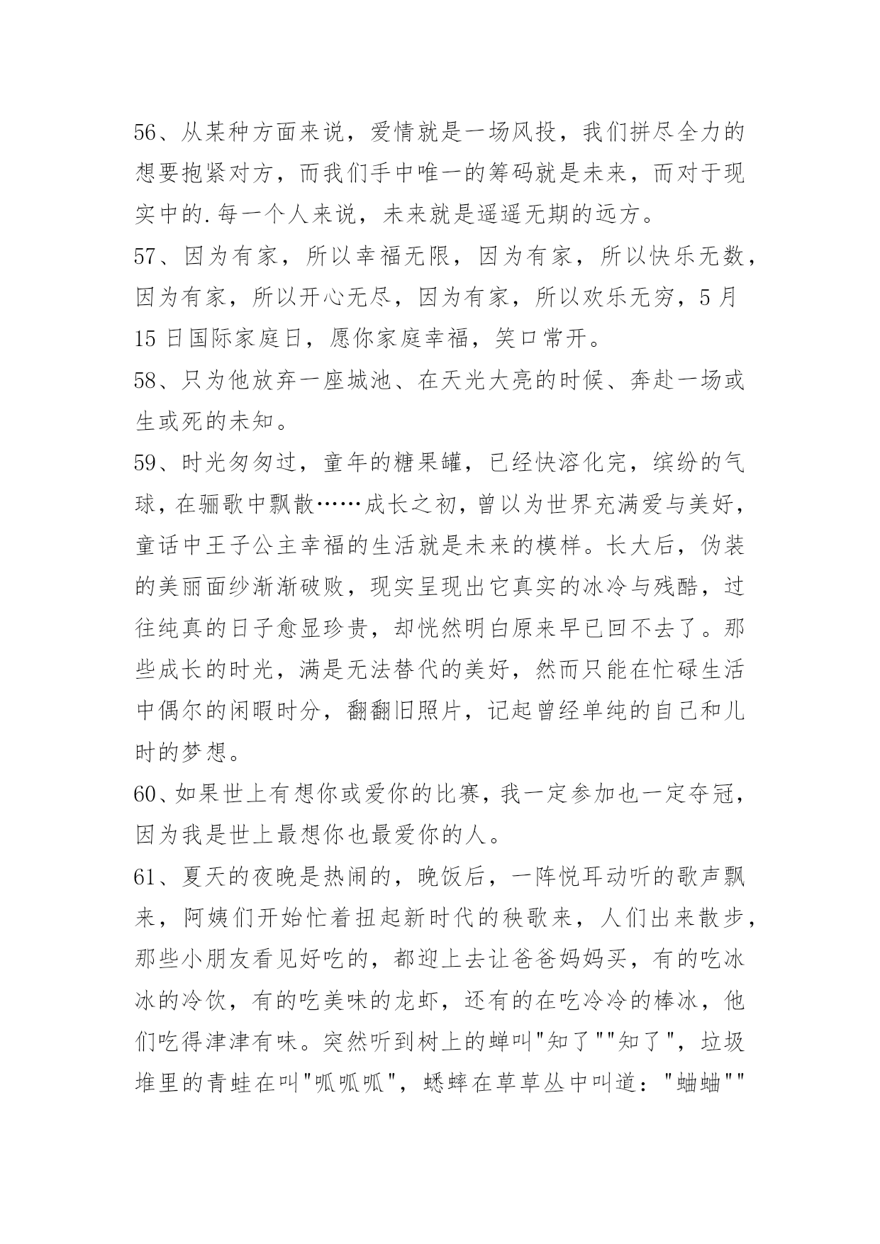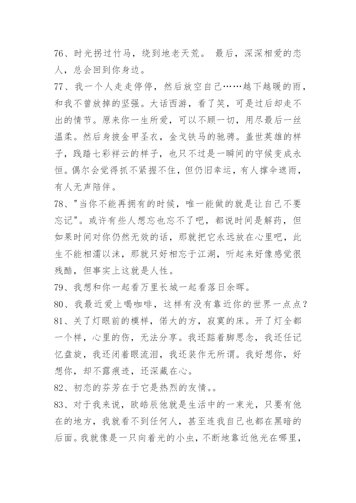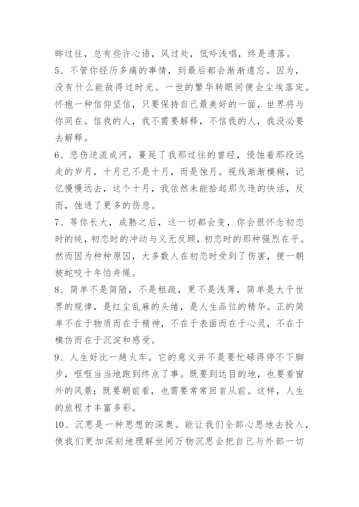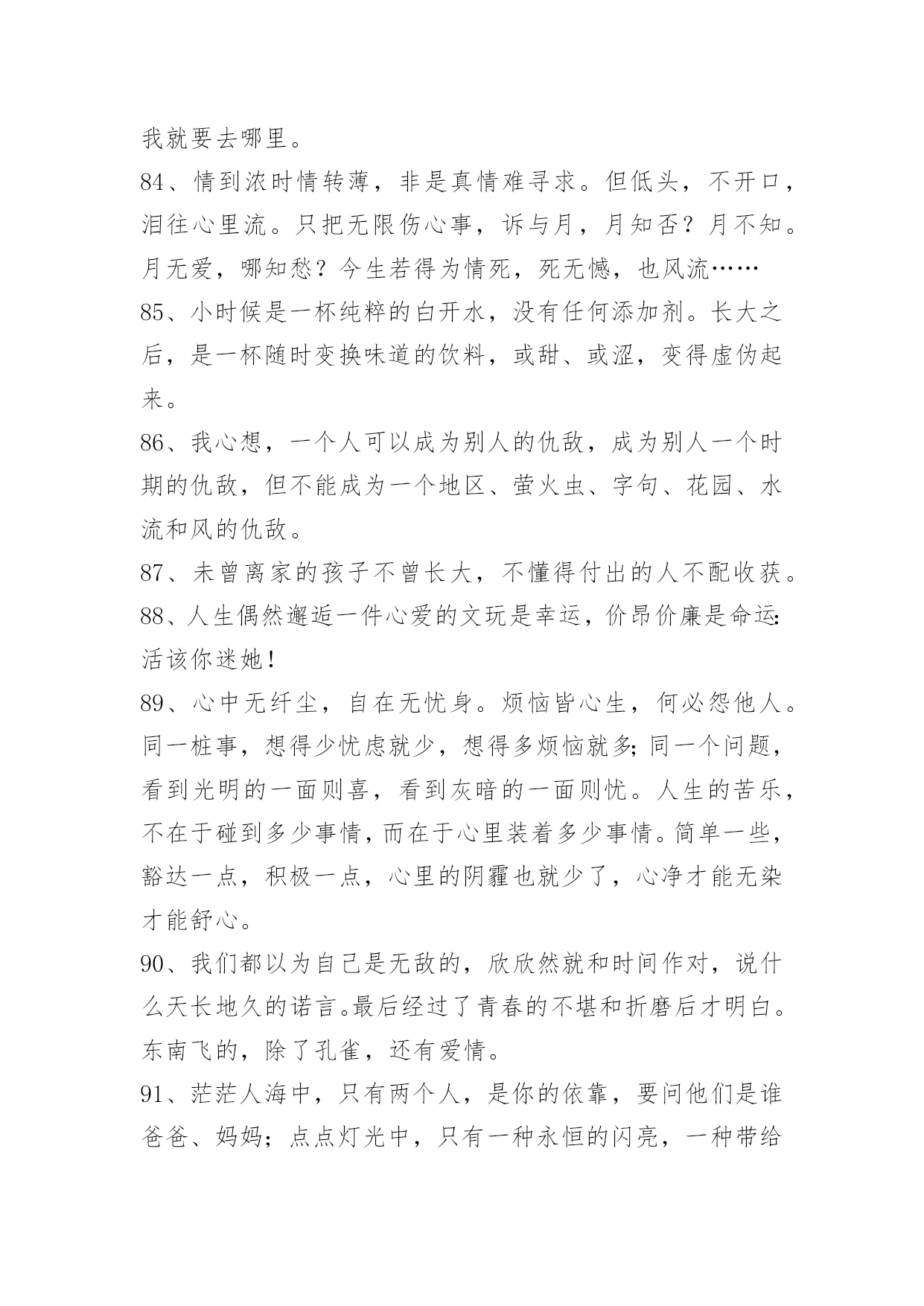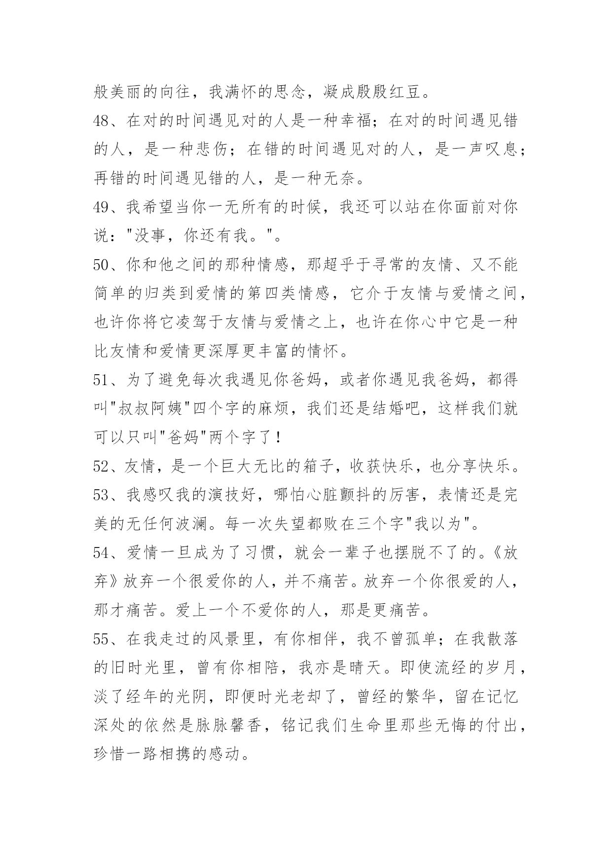唯美经典句子98条精选唯美经典句子锦集98条人有时候就是需求太满了,从来不去留意那些微小的是,就算失去了,也摸不清头脑。以下是小编精心整理的唯美经典句子98条,一起来欣赏吧。1、曾以为,我是你。前世错过的那只百灵,曾以为,我是你今生无悔的追逐,曾以为,我是你来世预约的相守。暗立誓,这一生,最美的笑颜只为你绽放,做你生命里最后的风景。把自己揉入你怀中,飘逸的发丝只为你,而骄傲不已。只为你,而芳香不息。日月如梭,奈何来去太匆匆,世事变化太无常。苍白了的誓言,夭折了当年,你曾经亲口许给我的不离不弃。2、去为你的未来奔跑吧,那个甘愿为你停下脚步的人,只会在前方等着你,而不是在过去。3、初生的桐花或许知道自己的宿命,却还是会爬上高高的枝头,希望在无尘无嚣的空中竞相放香。就如现在,在我书房的窗外,两树桐花正热烈而沉静地开放。它们虽也离地凌空,而我却有了楼的举托,我和桐花便近在咫尺了,隔窗相望,那些沉静的异香,也仿佛伸手可掬了。4、穿过这茫茫人海,坐看云起时,拢一袭恬淡,相伴人间烟火。清颜凝霜,终将沉淀的心事,婉约成心头的过往。时光悠然如梭,于淡静中轻轻流淌。岁月如逝,心事层叠,回眸过往,总有些许心语,风过处,低吟浅唱,终是遗落。5、不管你经历多痛的事情,到最后都会渐渐遗忘。因为,没有什么能敌得过时光。一世的繁华转眼间便会尘埃落定。怀抱一种信仰坚信,只要保持自己最美好的一面,世界将与你同在。信我的人,我不需要解释,不信我的人,我没必要去解释。6、悲伤逆流成河,蔓延了我那过往的曾经,侵蚀着那段远走的岁月,十月已不是十月,而是蚀月。视线渐渐模糊,记忆慢慢远去,这个十月,我依然未能拾起那久违的快活,反而,蚀进了更多的伤悲。7、等你长大,成熟之后,这一切都会变,你会很怀念初恋时的纯,初恋时的冲动与义无反顾,初恋时的那种强烈在乎。然而因为种种原因,大多数人在初恋时受到了伤害,便一朝被蛇咬十年怕井绳。8、简单不是简陋,不是粗疏,更不是浅薄,简单是大千世界的规律,是红尘乱麻的头绪,是人生品位的精华。正的简单不在于物质而在于精神,不在于表面而在于心灵,不在于模仿而在于沉淀和感受。9、人生好比一趟火车。它的意义并不是要忙碌得停不下脚步,哐哐当当地跑到终点了事。既要到达目的地,也要看窗外的风景;既要朝前看,也需要常常回首从前。这样,人生的旅程才丰富多彩。10、沉思是一种思想的深奥。能让我们全部心思地去投入,使我们更加深刻地理解世间万物沉思会把自己与外部一切融为一体,让精神由此得到升华,让心灵处于和谐之中。11、人生如梦,岁月无情。生命的意义是在于活得充实,而不在于活得长久。看重生命,必须要有一份好心境。心境的好坏,在人不在天,在己不在人。12、淡淡的忧伤,浅浅的时光。微风吹落孤寂的纸张,雨丝打破银色的迷茫。对暗恋的惆怅,放声歌唱,那酸涩的芳香。13、当初的花早已逝去,留下了满树的小青杏,现在丁香也要消逝在风中,只叹时光飞逝,人,渐渐憔悴。14、曾经淡然面对岁月中花开的每一季,草长莺飞的日子里,心情如飞舞在风中的纸鸢,恬然从容。15、你活了多少岁不算什么,重要的是,你是如何度过这些岁月的。16、等待,恰若春暖花开前的冬眠,忍受寒风凛冽只为来年的草长莺飞春满人间。17、请告诉臣妾,君能否忘记那次朦朦胧胧的相遇,那个突然开始的忧郁。18、秋燃情愫,听秋倾诉。虽是一叶知秋,却落我半生浮华。19、人生中最美的,不是下雨天,而是一起和你躲雨的屋檐。20、曾经的童话、曾经的天真、曾经的恋过,现在我们都有重新来过。21、君说衣袂飘飘,笑靥浅浅;后来咽泪装欢,奈何眼穿。22、那年夏天,你留给我的,只是一季的回忆。23、回忆着我们走过的曾经,真的好不容易。24、把你笨拙的情话与我深深的爱意,加点玫瑰花瓣揉捏调与,酿成世上最美的蜜儿,珍藏在坛子里,一起品尝。25、经的海誓,如今的白纸,一字不差。曾经的山盟,如今的黑字,一句不漏。26、两汪清水似的凤眼,虽然总是淡淡的看人,却有说不出的明澈。27、我的故乡,土地上潮湿清凉的,植物在上面自由自在的生长。我的故乡,有甜美的笑容。28、等待可以如此美丽,因为爱你。29、爱情破了不是不完美而是不够坚定。30、岁月的更替,演变了我们的爱情。31、即使在千万人中行走,我也能一眼认出你。因为别人都是踩着地走路,而你是踩着我的心在走。32、时运不济者,不要抱怨生活埋没了你,只要信念还在,就能点燃成功之火。33、最能施惠于朋友的,往往不是金钱或所有物资上的救济,而是那些亲热的立场,欢悦的谈话,同情的吐露跟纯挚的夸奖。34、错过只正在一瞬,思念却是一世。35、在旧社会里,这天晚上家家祭灶王,从一擦黑儿鞭炮就响起来,随着炮声把灶王的纸像焚化,美其名叫送灶王上天。36、雨洗娟娟净,风吹细细香。37、每个兔子心中都有一个大国梦。——《那年那兔那些事儿》38
