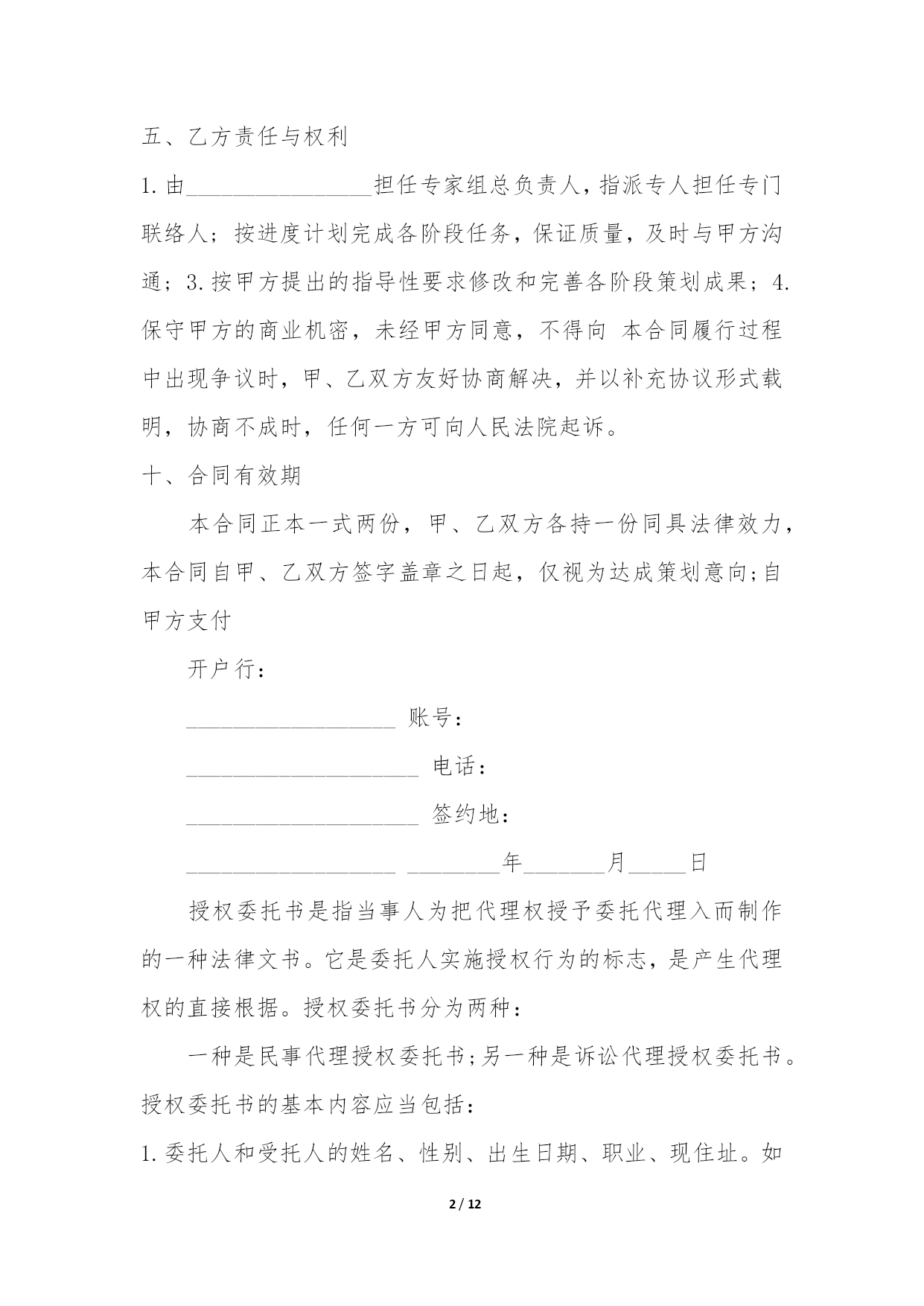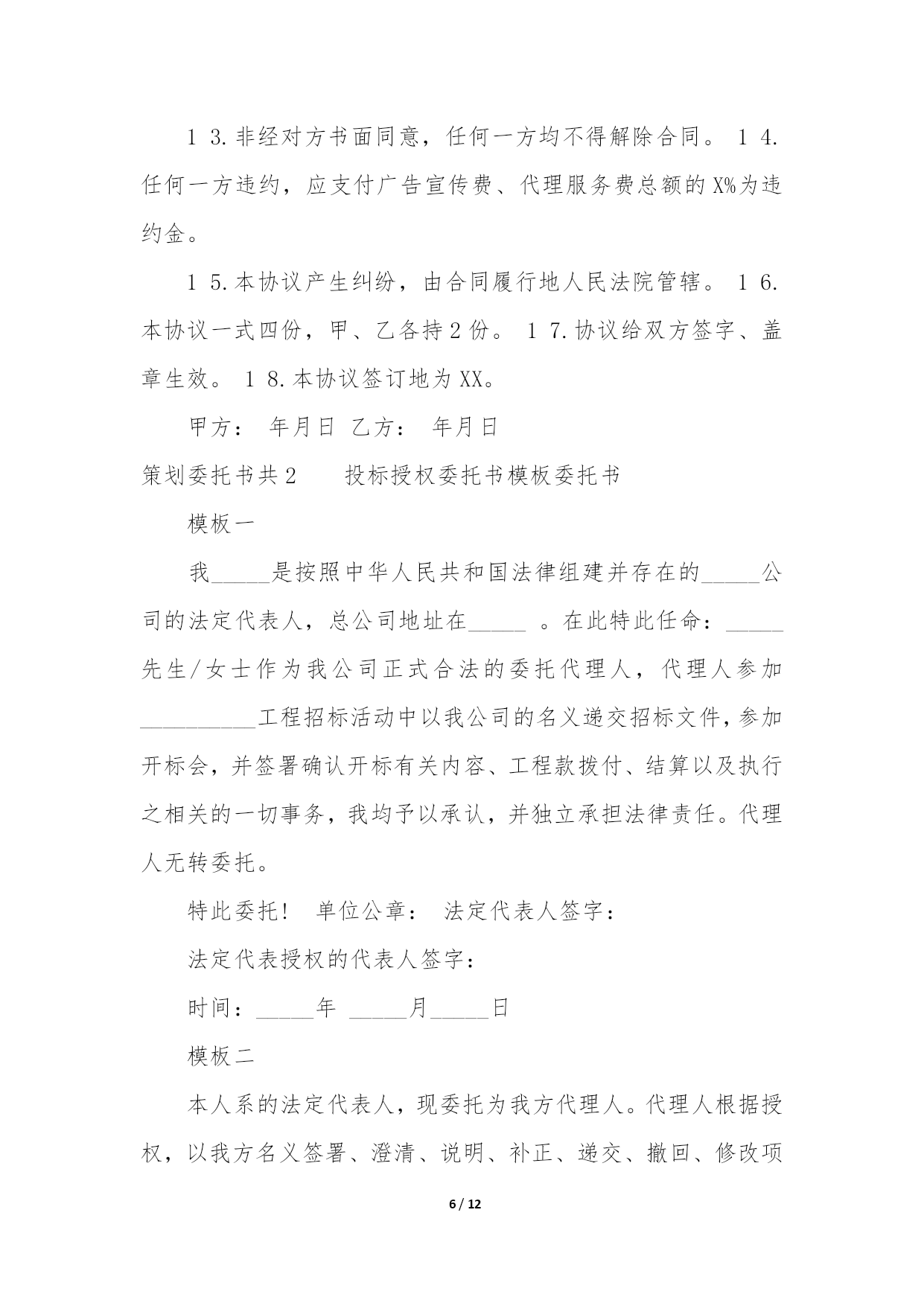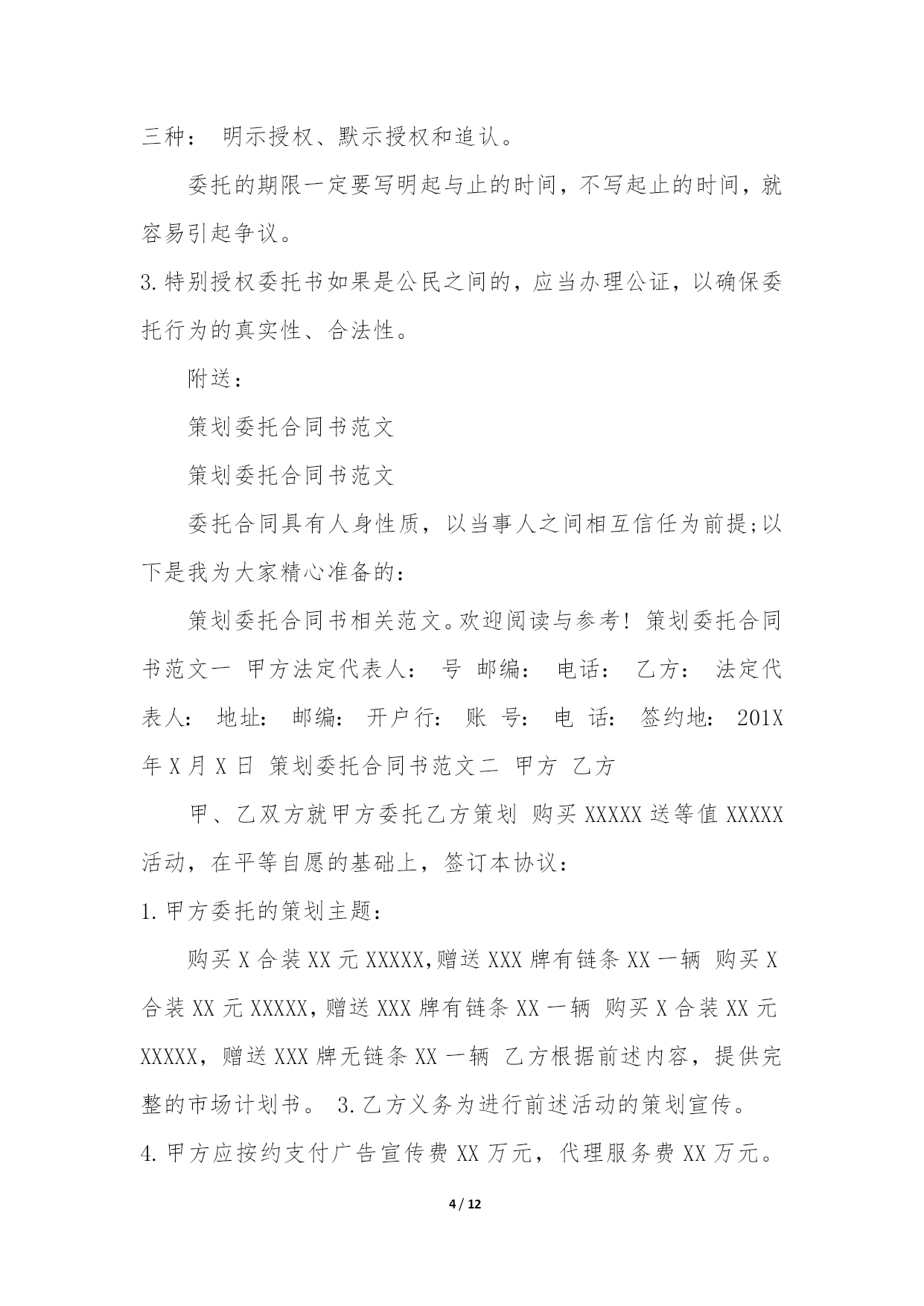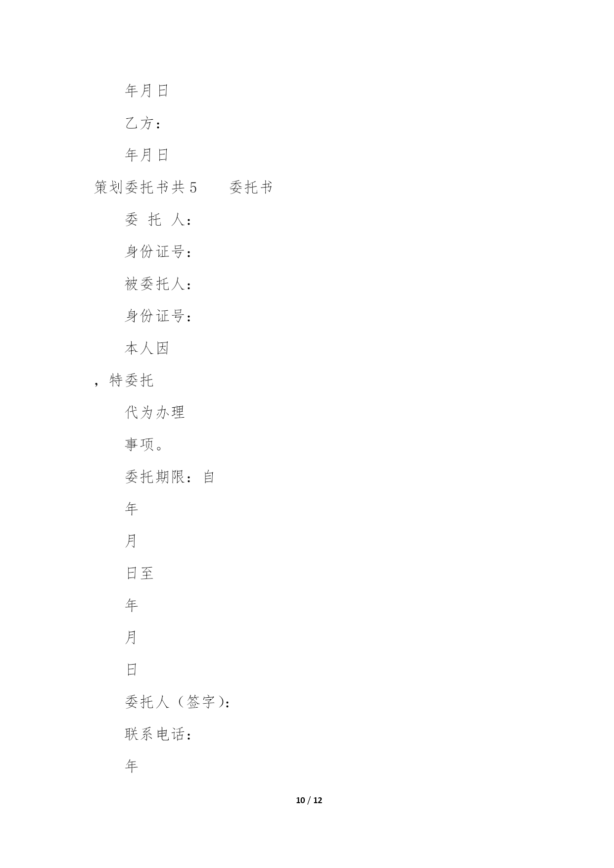 PAGE12/NUMPAGES12策划委托书共6篇(委托策划合同)下面是我编写的策划委托书共6篇,供大家品鉴。策划委托书共1策划委托书范文策划委托书范文大型企业经常会展开一些企业活动,而对于活动的策划又实在分身乏术,这时候他们就会委托专业的策划公司帮助他们策划,以下是我为大家精心准备的:策划委托书相关范文。欢迎参考阅读!策划委托书范文如下:甲方:______________乙方:______________为了甲方________________,根据国家有关法律、法规,甲、乙双方本着互相配合、讲求实效、诚实信用的原则,就甲方委托乙方完成________________________的有关事宜,签订本合同书。一、策划项目1._______________________________。_______________________________。二、委托项目进度策划工作分为两个阶段:1.《__________》的中期汇报演示文本,限期为自合同书生效之日起________至________个工作日。4.及时向乙方支付报酬;5.如果就委托项目内容、期限做出原则性改变的决策,应及时通知乙方,并采取适当措施,便于乙方及时调整工作。五、乙方责任与权利1.由________________担任专家组总负责人,指派专人担任专门联络人;按进度计划完成各阶段任务,保证质量,及时与甲方沟通;3.按甲方提出的指导性要求修改和完善各阶段策划成果;4.保守甲方的商业机密,未经甲方同意,不得向本合同履行过程中出现争议时,甲、乙双方友好协商解决,并以补充协议形式载明,协商不成时,任何一方可向人民法院起诉。十、合同有效期本合同正本一式两份,甲、乙双方各持一份同具法律效力,本合同自甲、乙双方签字盖章之日起,仅视为达成策划意向;自甲方支付开户行:__________________账号:____________________电话:____________________签约地:__________________________年_______月_____日授权委托书是指当事人为把代理权授予委托代理入而制作的一种法律文书。它是委托人实施授权行为的标志,是产生代理权的直接根据。授权委托书分为两种:一种是民事代理授权委托书;另一种是诉讼代理授权委托书。授权委托书的基本内容应当包括:1.委托人和受托人的姓名、性别、出生日期、职业、现住址。如果委托人是法人的,则应写明法人的全称、地址、法定代表人姓名等情况。委托的事项一定要写得明确、具体。应当注意的是,在民事代理中,代理人受托的事项必须是具有法律意义的,能够产生一定法律后果的民事行为。我国《民法通则》3.委托的权限范围,是代理人实施代理行为有效的依据,律师代书时一定要写明确。在民事代理中,委托人授予代理人代理权的范围有三种情况:A、一次委托,即代理人只能就受托的某一项事务办理民事法律行为;B、特别委托,即代理人受托在一定时期内连续反复办理同一类性质的民事法律行为;C、总委托,即代理人受托在一定时期内办理有关某类事务或某一种标的物多种民事法律行为。在民事诉讼代理中,委托代理权分为两种:一般委托,即委托代理人只能代当事人为一般的诉讼行为,如提出证据、进行辩论、申请财产保全等。特别委托,即委托代理人受托进行某些重大诉讼行为,如有权代理当事人承认、变更、放弃诉讼请求;有权提起上诉或反诉;有权与对方当事人和解等。理应注意的是,我国《民事诉讼法》针对婚姻案件的特殊性质,对当事人委托代理人时授予的代理权限作了限制性的规定,即离婚案件有诉讼代理人的,本人除不能表达意志的以外,仍应出庭;确因特殊情况无法出庭的,必须向人民法院提交书面意见。签订授权委托书时应当注意以下事项:1.授权委托方法有三种:明示授权、默示授权和追认。委托的期限一定要写明起与止的时间,不写起止的时间,就容易引起争议。3.特别授权委托书如果是公民之间的,应当办理公证,以确保委托行为的真实性、合法性。附送:策划委托合同书范文策划委托合同书范文委托合同具有人身性质,以当事人之间相互信任为前提;以下是我为大家精心准备的:策划委托合同书相关范文。欢迎阅读与参考!策划委托合同书范文一甲方法定代表人:号邮编:电话:乙方:法定代表人:地址:邮编:开户行:账号:电话:签约地:201X年X月X日策划委托合同书范文二甲方乙方甲、乙双方就甲方委托乙方策划购买XXXXX送等值XXXXX活动,在平等自愿的基础上,签订本协议:1.甲方委托的策划主题:购买X合装XX元XXXXX,赠送XXX牌有链条XX一辆购买X合装XX元XXXXX,赠送XXX牌有链条XX一辆购买X合装XX元XXXXX,赠送XXX牌无链条XX一辆乙方根据前述内容,提供完整的市场计划书。3.乙方义务为进行前述活