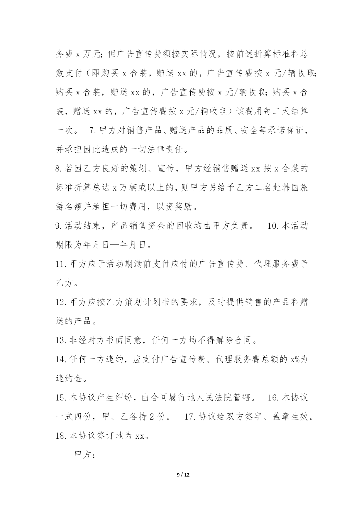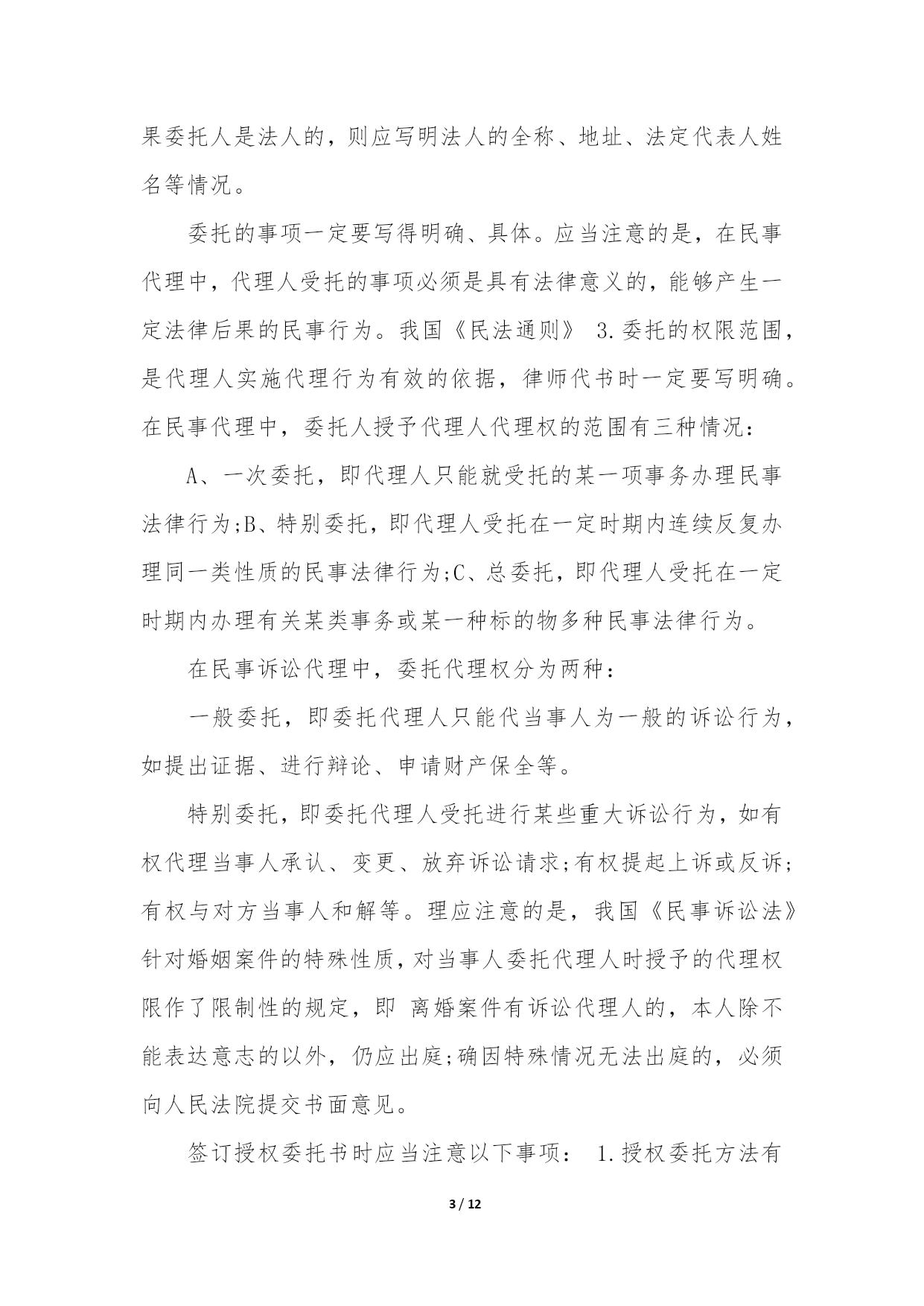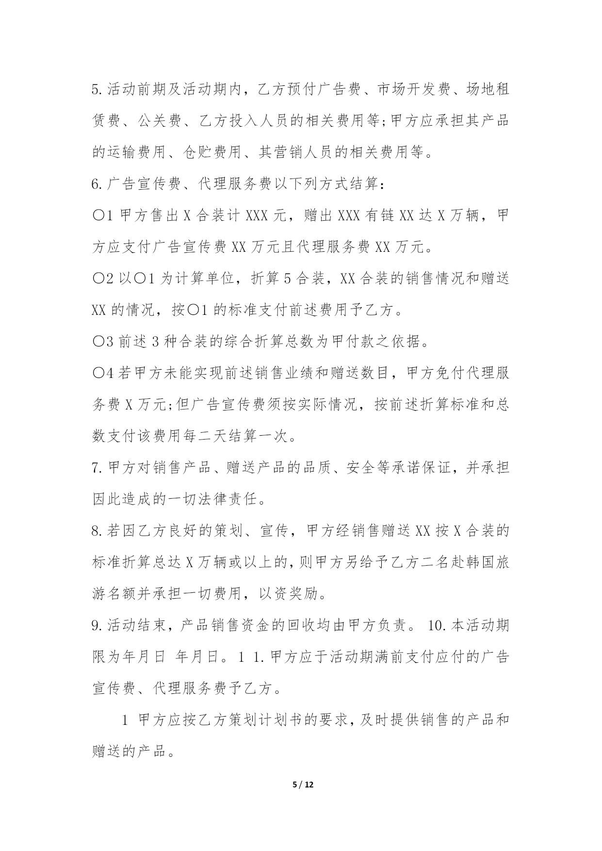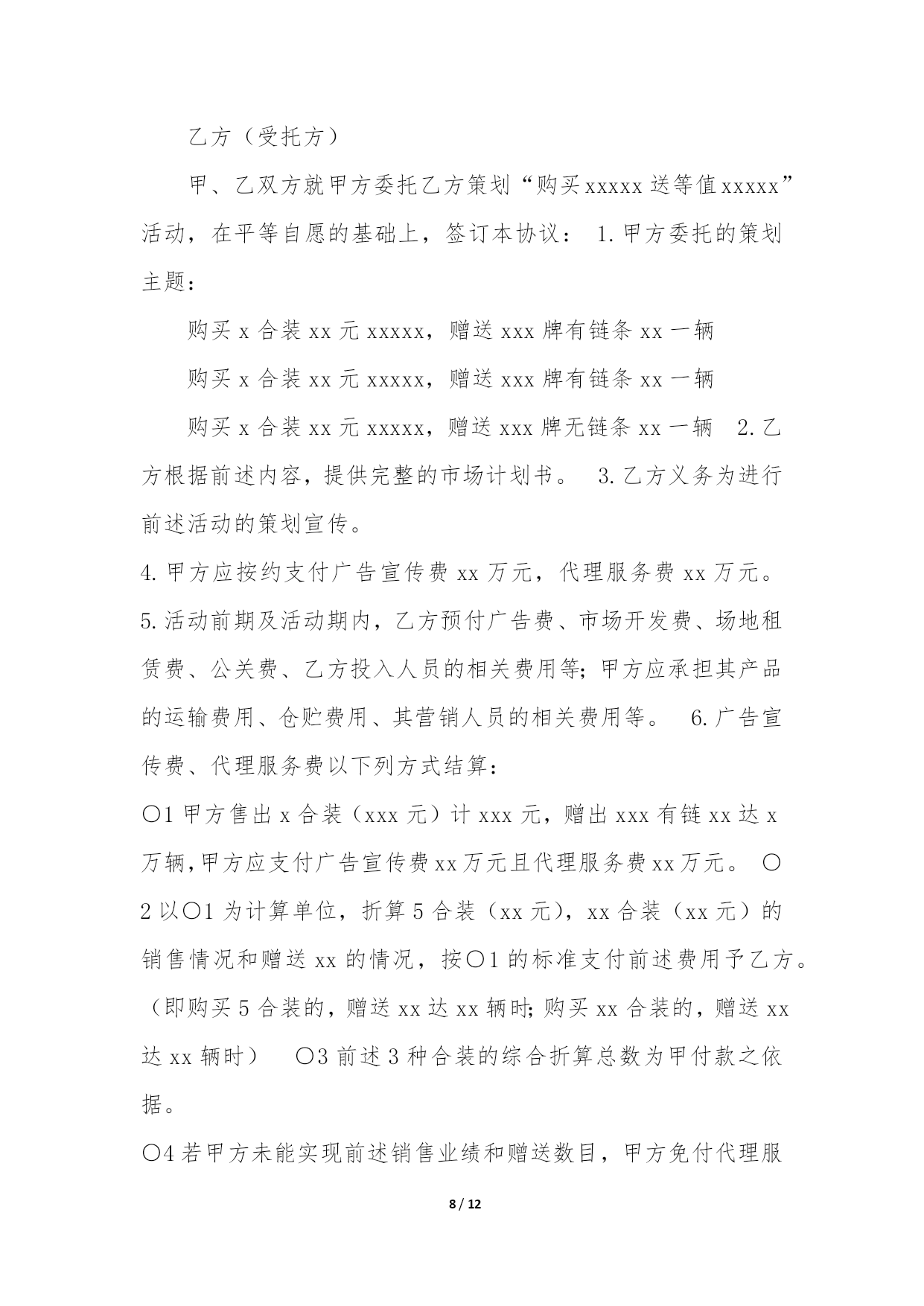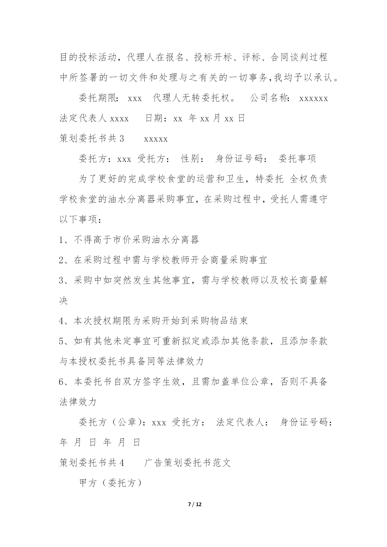 PAGE12/NUMPAGES12策划委托书共6篇(委托策划合同)下面是我编写的策划委托书共6篇,供大家品鉴。策划委托书共1策划委托书范文策划委托书范文大型企业经常会展开一些企业活动,而对于活动的策划又实在分身乏术,这时候他们就会委托专业的策划公司帮助他们策划,以下是我为大家精心准备的:策划委托书相关范文。欢迎参考阅读!策划委托书范文如下:甲方:______________乙方:______________为了甲方________________,根据国家有关法律、法规,甲、乙双方本着互相配合、讲求实效、诚实信用的原则,就甲方委托乙方完成________________________的有关事宜,签订本合同书。一、策划项目1._______________________________。_______________________________。二、委托项目进度策划工作分为两个阶段:1.《__________》的中期汇报演示文本,限期为自合同书生效之日起________至________个工作日。4.及时向乙方支付报酬;5.如果就委托项目内容、期限做出原则性改变的决策,应及时通知乙方,并采取适当措施,便于乙方及时调整工作。五、乙方责任与权利1.由________________担任专家组总负责人,指派专人担任专门联络人;按进度计划完成各阶段任务,保证质量,及时与甲方沟通;3.按甲方提出的指导性要求修改和完善各阶段策划成果;4.保守甲方的商业机密,未经甲方同意,不得向本合同履行过程中出现争议时,甲、乙双方友好协商解决,并以补充协议形式载明,协商不成时,任何一方可向人民法院起诉。十、合同有效期本合同正本一式两份,甲、乙双方各持一份同具法律效力,本合同自甲、乙双方签字盖章之日起,仅视为达成策划意向;自甲方支付开户行:__________________账号:____________________电话:____________________签约地:__________________________年_______月_____日授权委托书是指当事人为把代理权授予委托代理入而制作的一种法律文书。它是委托人实施授权行为的标志,是产生代理权的直接根据。授权委托书分为两种:一种是民事代理授权委托书;另一种是诉讼代理授权委托书。授权委托书的基本内容应当包括:1.委托人和受托人的姓名、性别、出生日期、职业、现住址。如果委托人是法人的,则应写明法人的全称、地址、法定代表人姓名等情况。委托的事项一定要写得明确、具体。应当注意的是,在民事代理中,代理人受托的事项必须是具有法律意义的,能够产生一定法律后果的民事行为。我国《民法通则》3.委托的权限范围,是代理人实施代理行为有效的依据,律师代书时一定要写明确。在民事代理中,委托人授予代理人代理权的范围有三种情况:A、一次委托,即代理人只能就受托的某一项事务办理民事法律行为;B、特别委托,即代理人受托在一定时期内连续反复办理同一类性质的民事法律行为;C、总委托,即代理人受托在一定时期内办理有关某类事务或某一种标的物多种民事法律行为。在民事诉讼代理中,委托代理权分为两种:一般委托,即委托代理人只能代当事人为一般的诉讼行为,如提出证据、进行辩论、申请财产保全等。特别委托,即委托代理人受托进行某些重大诉讼行为,如有权代理当事人承认、变更、放弃诉讼请求;有权提起上诉或反诉;有权与对方当事人和解等。理应注意的是,我国《民事诉讼法》针对婚姻案件的特殊性质,对当事人委托代理人时授予的代理权限作了限制性的规定,即离婚案件有诉讼代理人的,本人除不能表达意志的以外,仍应出庭;确因特殊情况无法出庭的,必须向人民法院提交书面意见。签订授权委托书时应当注意以下事项:1.授权委托方法有三种:明示授权、默示授权和追认。委托的期限一定要写明起与止的时间,不写起止的时间,就容易引起争议。3.特别授权委托书如果是公民之间的,应当办理公证,以确保委托行为的真实性、合法性。附送:策划委托合同书范文策划委托合同书范文委托合同具有人身性质,以当事人之间相互信任为前提;以下是我为大家精心准备的:策划委托合同书相关范文。欢迎阅读与参考!策划委托合同书范文一甲方法定代表人:号邮编:电话:乙方:法定代表人:地址:邮编:开户行:账号:电话:签约地:201X年X月X日策划委托合同书范文二甲方乙方甲、乙双方就甲方委托乙方策划购买XXXXX送等值XXXXX活动,在平等自愿的基础上,签订本协议:1.甲方委托的策划主题:购买X合装XX元XXXXX,赠送XXX牌有链条XX一辆购买X合装XX元XXXXX,赠送XXX牌有链条XX一辆购买X合装XX元XXXXX,赠送XXX牌无链条XX一辆乙方根据前述内容,提供完整的市场计划书。3.乙方义务为进行前述活