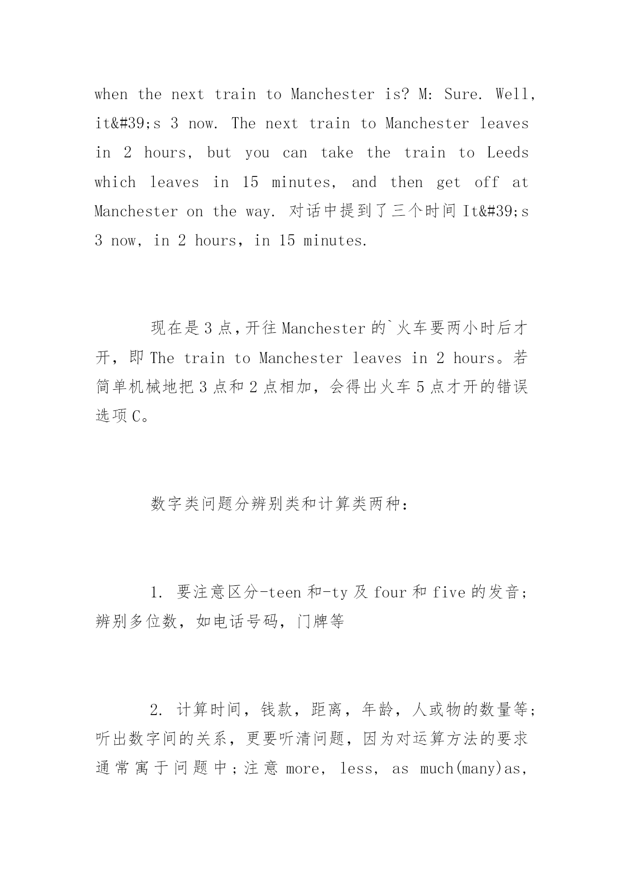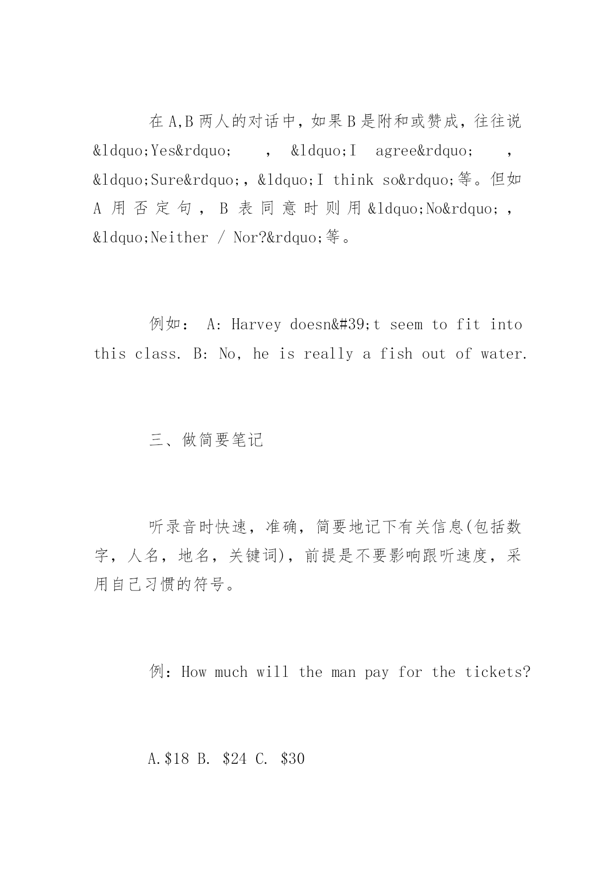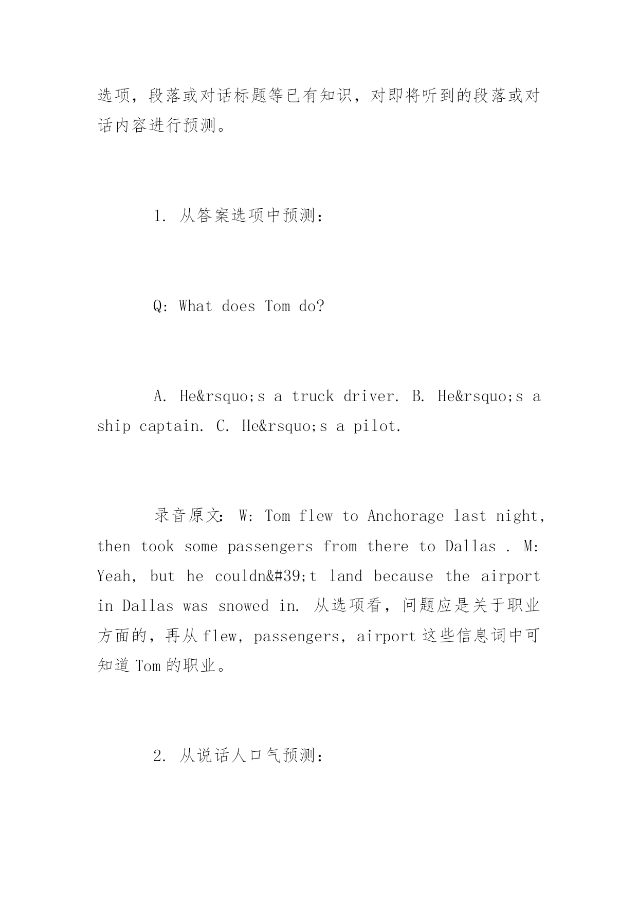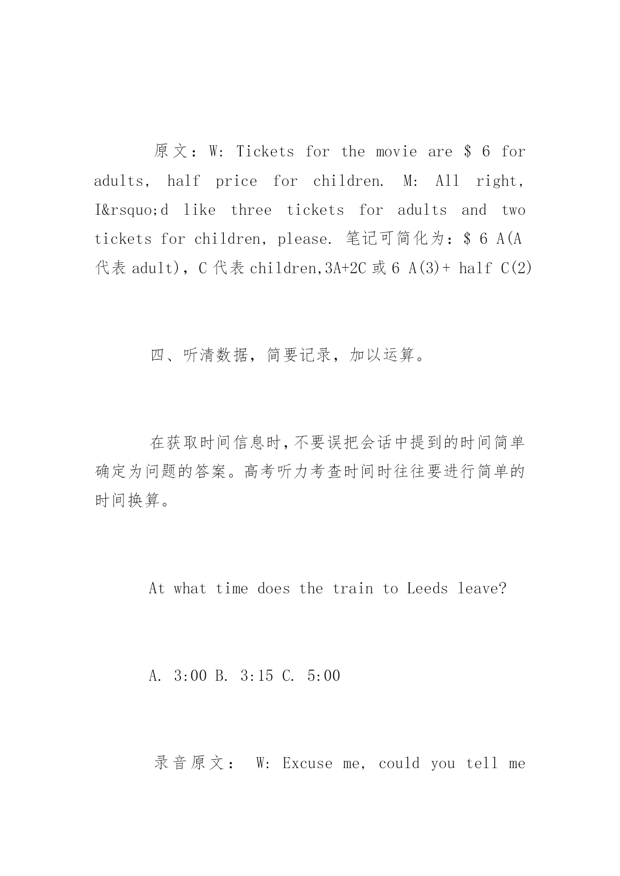 高考英语听力技巧高考英语听力技巧英语的听、说、读、写四项基本技能,听力首当其冲,在高考英语试卷中“首发”出场,地位可谓炙手可热。为了帮助大家备考,小编分享了一些高考英语听力技巧,欢迎阅读!一、果断选题,学会放弃相信第一感觉,当机立断,决不能反反复复,甚至影响后面的答题,切记不可因某个小题未听懂而患得患失,不可因一题失多题,造成一步跟不上,步步皆踏空的结果。二、学会预测预测是在做听力理解之前根据各种暗示,如所给答案选项,段落或对话标题等已有知识,对即将听到的段落或对话内容进行预测。1.从答案选项中预测:Q:WhatdoesTomdo?A.He’satruckdriver.B.He’sashipcaptain.C.He’sapilot.录音原文:W:TomflewtoAnchoragelastnight,thentooksomepassengersfromtheretoDallas.M:Yeah,buthecouldn'tlandbecausetheairportinDallaswassnowedin.从选项看,问题应是关于职业方面的,再从flew,passengers,airport这些信息词中可知道Tom的职业。2.从说话人口气预测:在A,B两人的对话中,如果B是附和或赞成,往往说“Yes”,“Iagree”,“Sure”,“Ithinkso”等。但如A用否定句,B表同意时则用“No”,“Neither/Nor?”等。例如:A:Harveydoesn'tseemtofitintothisclass.B:No,heisreallyafishoutofwater.三、做简要笔记听录音时快速,准确,简要地记下有关信息(包括数字,人名,地名,关键词),前提是不要影响跟听速度,采用自己习惯的符号。例:Howmuchwillthemanpayforthetickets?A.$18B.$24C.$30原文:W:Ticketsforthemovieare$6foradults,halfpriceforchildren.M:Allright,I’dlikethreeticketsforadultsandtwoticketsforchildren,please.笔记可简化为:$6A(A代表adult),C代表children,3A+2C或6A(3)+halfC(2)四、听清数据,简要记录,加以运算。在获取时间信息时,不要误把会话中提到的时间简单确定为问题的答案。高考听力考查时间时往往要进行简单的时间换算。AtwhattimedoesthetraintoLeedsleave?A.3:00B.3:15C.5:00录音原文:W:Excuseme,couldyoutellmewhenthenexttraintoManchesteris?M:Sure.Well,it's3now.ThenexttraintoManchesterleavesin2hours,butyoucantakethetraintoLeedswhichleavesin15minutes,andthengetoffatManchesterontheway.对话中提到了三个时间It's3now,in2hours,in15minutes.现在是3点,开往Manchester的`火车要两小时后才开,即ThetraintoManchesterleavesin2hours。若简单机械地把3点和2点相加,会得出火车5点才开的错误选项C。数字类问题分辨别类和计算类两种:1.要注意区分-teen和-ty及four和five的发音;辨别多位数,如电话号码,门牌等2.计算时间,钱款,距离,年龄,人或物的数量等;听出数字间的关系,更要听清问题,因为对运算方法的要求通常寓于问题中;注意more,less,asmuch(many)as,another,double,acoupleof;to,past,quarter;记住时间是60进制如出现几个数字,应注意鉴别问的是那一个。例:Atwhattimedoestheofficeopen?A.At8:15B.At8:30C.At7:45从常识判断,办公时间往往以整点开始,而不会在几点几分。听力原文:M:Iwonderwhytheofficeisstillnotopen.W:Butit'snotyeteight.Infact,it'sonlyaquar