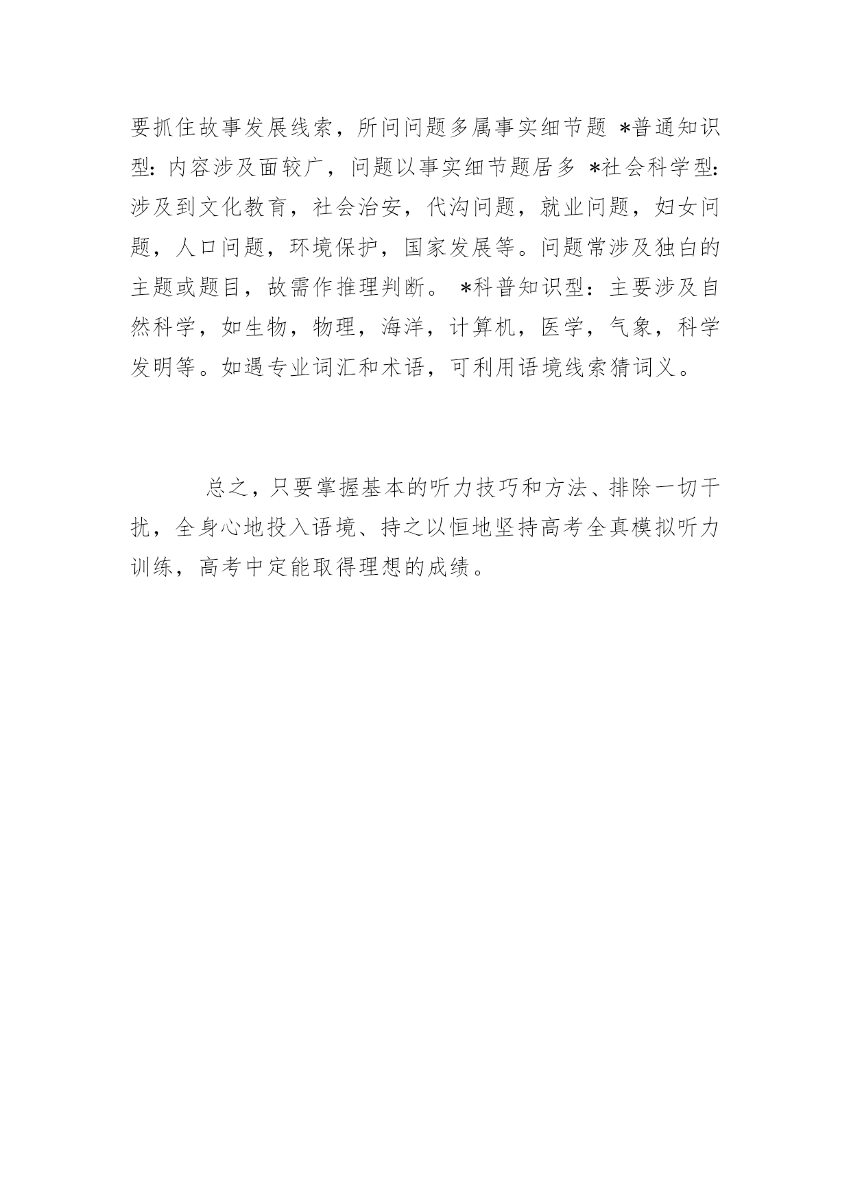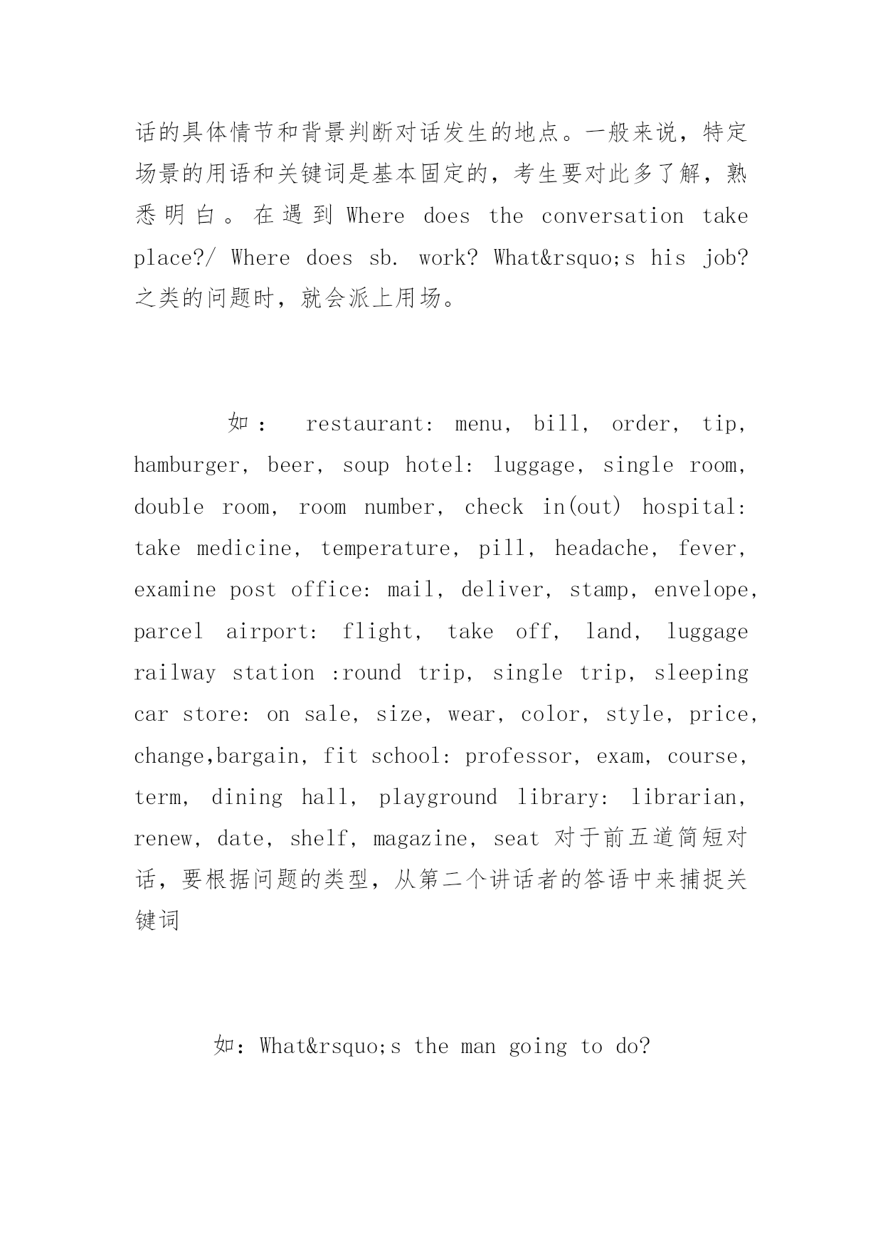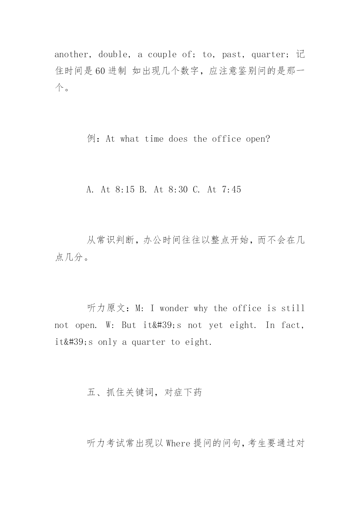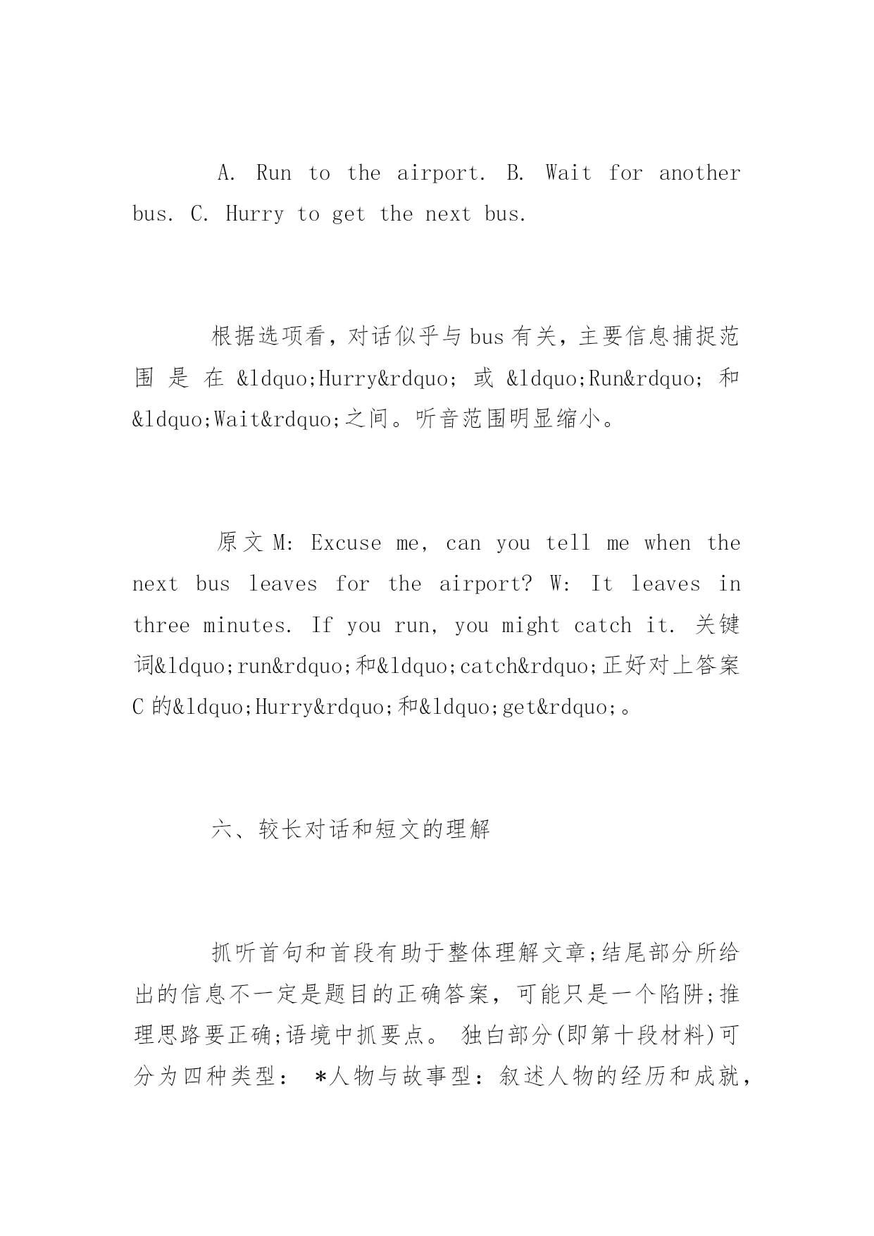 高考英语听力技巧高考英语听力技巧英语的听、说、读、写四项基本技能,听力首当其冲,在高考英语试卷中“首发”出场,地位可谓炙手可热。为了帮助大家备考,小编分享了一些高考英语听力技巧,欢迎阅读!一、果断选题,学会放弃相信第一感觉,当机立断,决不能反反复复,甚至影响后面的答题,切记不可因某个小题未听懂而患得患失,不可因一题失多题,造成一步跟不上,步步皆踏空的结果。二、学会预测预测是在做听力理解之前根据各种暗示,如所给答案选项,段落或对话标题等已有知识,对即将听到的段落或对话内容进行预测。1.从答案选项中预测:Q:WhatdoesTomdo?A.He’satruckdriver.B.He’sashipcaptain.C.He’sapilot.录音原文:W:TomflewtoAnchoragelastnight,thentooksomepassengersfromtheretoDallas.M:Yeah,buthecouldn'tlandbecausetheairportinDallaswassnowedin.从选项看,问题应是关于职业方面的,再从flew,passengers,airport这些信息词中可知道Tom的职业。2.从说话人口气预测:在A,B两人的对话中,如果B是附和或赞成,往往说“Yes”,“Iagree”,“Sure”,“Ithinkso”等。但如A用否定句,B表同意时则用“No”,“Neither/Nor?”等。例如:A:Harveydoesn'tseemtofitintothisclass.B:No,heisreallyafishoutofwater.三、做简要笔记听录音时快速,准确,简要地记下有关信息(包括数字,人名,地名,关键词),前提是不要影响跟听速度,采用自己习惯的符号。例:Howmuchwillthemanpayforthetickets?A.$18B.$24C.$30原文:W:Ticketsforthemovieare$6foradults,halfpriceforchildren.M:Allright,I’dlikethreeticketsforadultsandtwoticketsforchildren,please.笔记可简化为:$6A(A代表adult),C代表children,3A+2C或6A(3)+halfC(2)四、听清数据,简要记录,加以运算。在获取时间信息时,不要误把会话中提到的时间简单确定为问题的答案。高考听力考查时间时往往要进行简单的时间换算。AtwhattimedoesthetraintoLeedsleave?A.3:00B.3:15C.5:00录音原文:W:Excuseme,couldyoutellmewhenthenexttraintoManchesteris?M:Sure.Well,it's3now.ThenexttraintoManchesterleavesin2hours,butyoucantakethetraintoLeedswhichleavesin15minutes,andthengetoffatManchesterontheway.对话中提到了三个时间It's3now,in2hours,in15minutes.现在是3点,开往Manchester的`火车要两小时后才开,即ThetraintoManchesterleavesin2hours。若简单机械地把3点和2点相加,会得出火车5点才开的错误选项C。数字类问题分辨别类和计算类两种:1.要注意区分-teen和-ty及four和five的发音;辨别多位数,如电话号码,门牌等2.计算时间,钱款,距离,年龄,人或物的数量等;听出数字间的关系,更要听清问题,因为对运算方法的要求通常寓于问题中;注意more,less,asmuch(many)as,another,double,acoupleof;to,past,quarter;记住时间是60进制如出现几个数字,应注意鉴别问的是那一个。例:Atwhattimedoestheofficeopen?A.At8:15B.At8:30C.At7:45从常识判断,办公时间往往以整点开始,而不会在几点几分。听力原文:M:Iwonderwhytheofficeisstillnotopen.W:Butit'snotyeteight.Infact,it'sonlyaquar