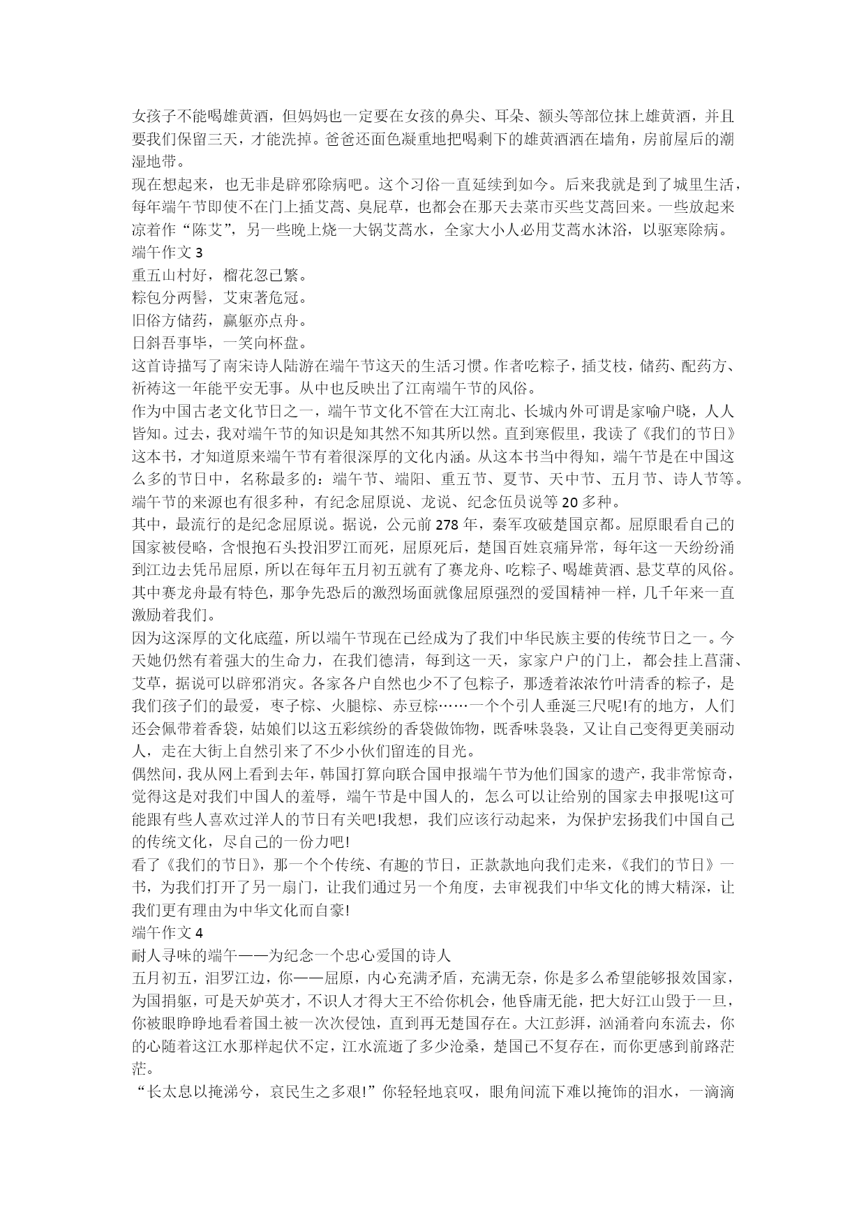 端午高考作文范文节分难午自谁言,万古传闻为屈原。堪笑楚江空渺渺,不能洗得直臣冤。下面是xx给大家带来的端午作文,欢迎大家阅读参考,我们一起来看看吧!端午作文1舒城人为了让日子过得和和美美,他们寄希望于做糯米饭。糯米饭做得好,就象征着日子好。到了端午这天,我见过妈妈亲手做过糯米饭。做这种饭是很有讲究的。为了不煮成稀饭,做糯米饭的水应该比做米饭的水少30%。将水和糯米配好后不要立刻开电饭煲,要等糯米呛一下水,等吸水20分钟均匀后再通电。对于细粒长糯米,等待10分钟后再加电煮饭。对于粗粒短糯米,等待20分钟小时后再开电饭煲。电饭煲跳闸后,等待10分钟再开锅吃糯米饭。小时候我问妈妈:“为什么要这样做呢”?她说因为糯米比较结实,不长饭,因此加的水比做米饭要少三分之一左右。这个时候如果立刻上电做饭,可能会受水不匀,无法煮熟糯米饭。因为水比较少,在沸腾的情况下水分挥发比较快,很快就会跳闸,导致糯米饭煮不熟。有时下面糊了,上面可能还是夹生的。因此,要根据糯米粒的大小让糯米在水中泡足够时间,让水在常温下进入糯米粒内部。等这个过程完成后,再加电煮饭,就可以煮熟糯米饭。由于水比较少,糯米饭是一粒粒亮晶晶的,特别好看,很香,也很诱人,又有胃口。饭好,心情好,图个吉利,一家人团团圆圆吃一顿饭,亲亲热热过一个节,其乐融融,和和美美,觉得这样的端午节才热闹,才完美,才算美满。我们重温历史,可以看到,祖国各地那么多的端午传说,端午习俗,端午文化,其核心无非就是两方面,一方是纪念屈原,歌颂爱国精神;人们永远地怀念屈原这是与他的高尚人格是分不开的。两千多年以来,他的作品引起人们的普遍共鸣,他的精神引起世代敬仰。正是这两者的结合,成就了伟大的屈原,成了端午节永久纪念的一座丰碑!另一面,在很大程度上,人们通过这个传统的节日,寄托的是一种精神,传递着的是一种习俗文化。人们过这个节日,图的是吉祥,送的是平安,共建的是和谐,传递的是温馨,洋溢着的是浓浓的乡情、亲情。为了家庭的和睦,为了亲人的幸福,人们都特别注重这个习俗。彼此间也是通过一次次的交往,让亲戚更亲,让感情更浓,让生活更美好,让日子过得更加火红!端午作文2农历五月,古称“毒月”,因时值盛夏,蚊蝇孽生,百虫活跃,威胁人们健康。长江以南广大地区多用雄黄、蒜头、菖蒲根浸酒在墙角等阴暗潮湿处杀灭虫蚊,点燃艾条烟熏蚊蝇,并用艾火炙熟蒜头食之以杀菌防感冒。舒城。六安一带民间多用红纸剪成“五毒”(蜈松、蝎子、壁虎、蜘珠、蛇)及老虎形状,贴于室内镇恶驱邪。也有贴端午符,悬挂钟馗画像镇邪的。我的家乡“舒城”人一直还有上山“采百草”的习俗,采集中草药以辟邪疗疾。在我的记忆里,舒城、六安一带,有个习俗:年轻人在新婚前,都要用“陈艾”泡水沐浴;新生儿满月,也一定要用“陈艾”洗澡;体弱浮肿的人,也都要用“陈艾”水泡澡,用“陈艾”熏炙病体。记得我七八岁时,就按妈妈的要求,在端午节那天,一早就挎着竹篮,拿着镰刀,到河边去割艾蒿,臭屁草(应该叫菖蒲)。割满一大篮子,回来以后,就由哥哥站到凳子上,我做助手,把艾蒿、臭屁草插到门缝里。然后留下一部分,不能曝晒,只能阴干。当时,我们不知道是为什么要做这些,只知道按大人意图做。几次问妈妈为什么要在门上插着想这些东东,妈妈的回答都让我有些似懂非懂。虽然不是很明白,但从妈妈的表情里可以看出,这件事很严肃,也很重大。孩子们不需要懂,只需要去做就是了。家乡还有一个喝雄黄酒的习俗。每到端午节的中午,在吃午饭时,爸爸会用一个土碗,调上雄黄酒,一家人都得喝一小口。我看那个表情,雄黄酒定是难以下咽,但都要强忍着呡一口。女孩子不能喝雄黄酒,但妈妈也一定要在女孩的鼻尖、耳朵、额头等部位抹上雄黄酒,并且要我们保留三天,才能洗掉。爸爸还面色凝重地把喝剩下的雄黄酒洒在墙角,房前屋后的潮湿地带。现在想起来,也无非是辟邪除病吧。这个习俗一直延续到如今。后来我就是到了城里生活,每年端午节即使不在门上插艾蒿、臭屁草,也都会在那天去菜市买些艾蒿回来。一些放起来凉着作“陈艾”,另一些晚上烧一大锅艾蒿水,全家大小人必用艾蒿水沐浴,以驱寒除病。端午作文3重五山村好,榴花忽已繁。粽包分两髻,艾束著危冠。旧俗方储药,赢躯亦点舟。日斜吾事毕,一笑向杯盘。这首诗描写了南宋诗人陆游在端午节这天的生活习惯。作者吃粽子,插艾枝,储药、配药方、祈祷这一年能平安无事。从中也反映出了江南端午节的风俗。作为中国古老文化节日之一,端午节文化不管在大江南北、长城内外可谓是家喻户晓,人人皆知。过去,我对端午节的知识是知其然不知其所以然。直到寒假里,我读了《我们的节日》这本书,才知道原来端午节有着很深厚的文化内涵。从这本书当中得知,端午节是在中国这么多的节日中,名称最多的:端午节、端阳、重五节、夏节、天中节、五月节、诗人节等。端午节的