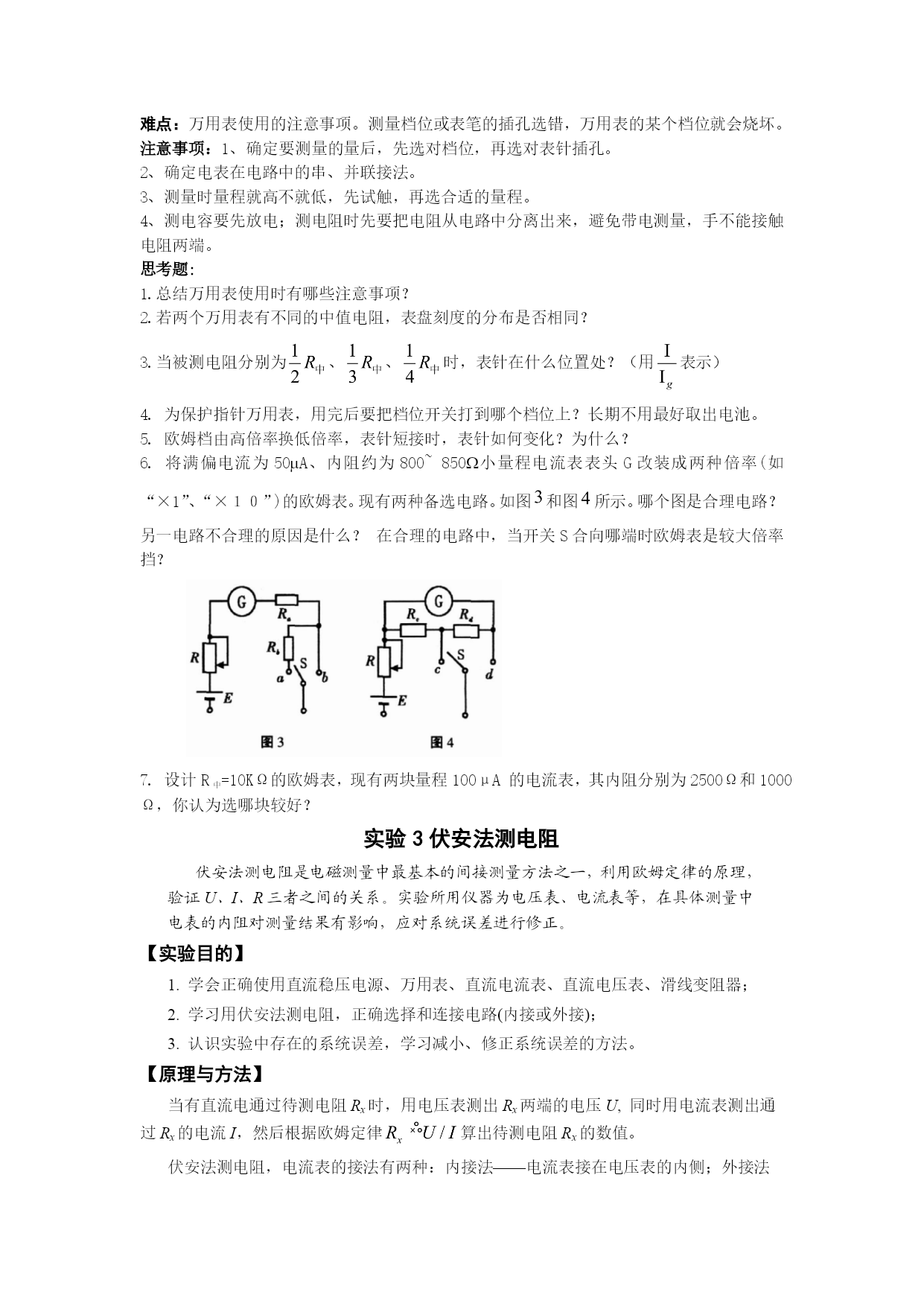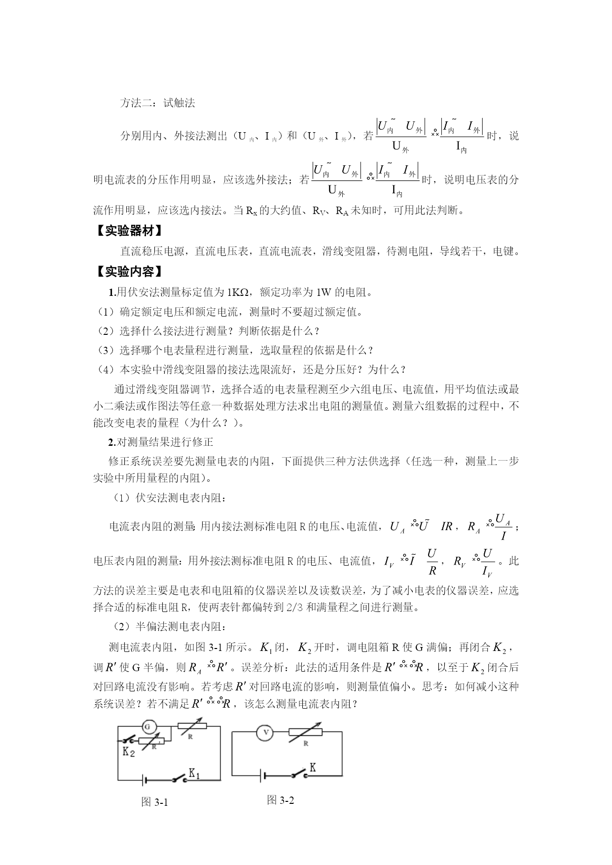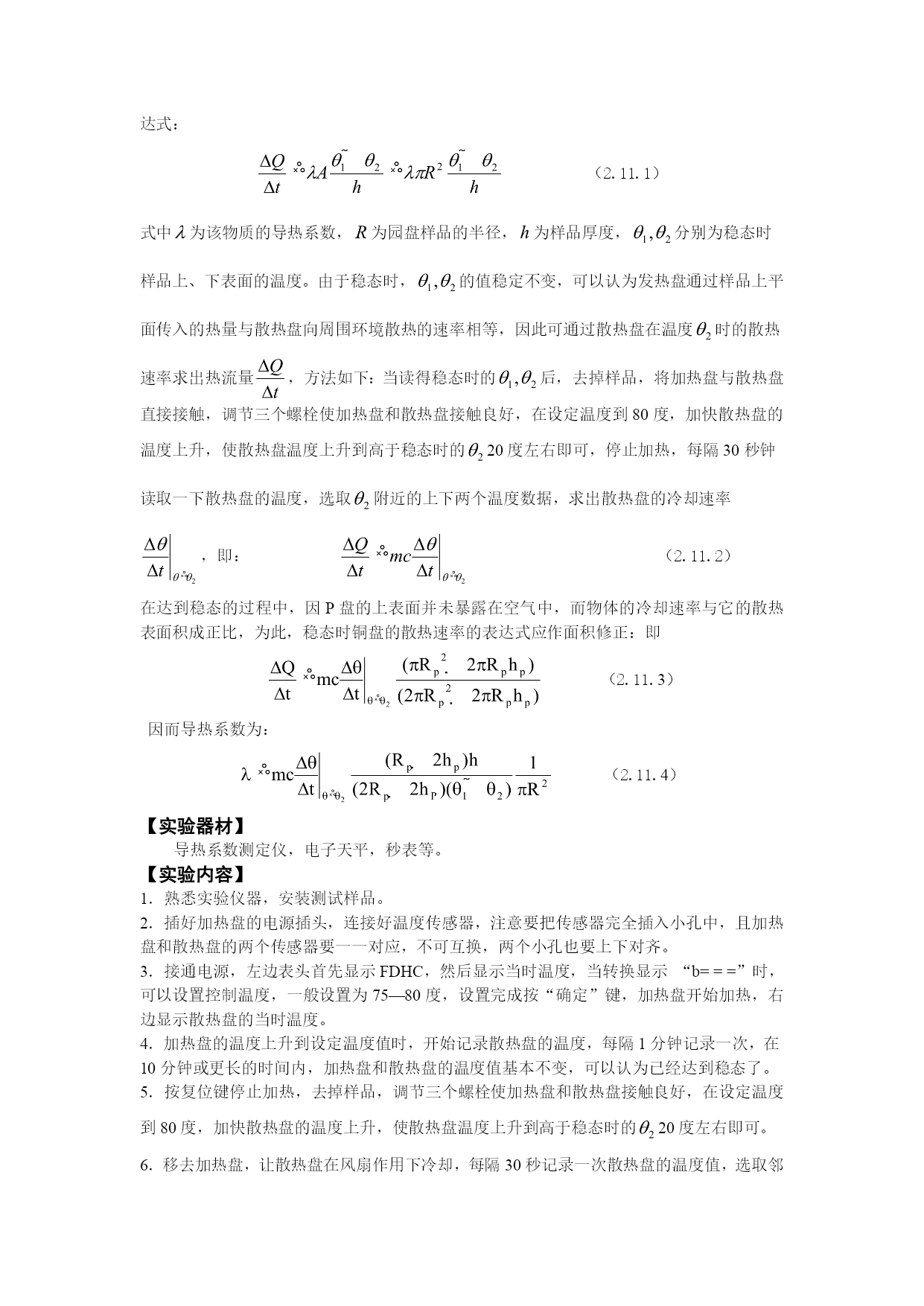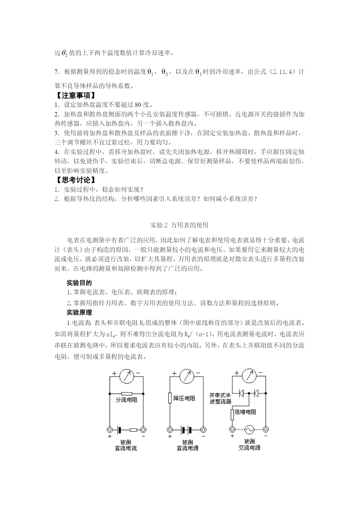 大学物理实验评分标准成绩构成:预习情况约占20%,课堂表现约占40%,实验报告约占40%。实验报告上给出五分制成绩,最终折算成百分制平均成绩。实验内容分为基本要求和提高要求。出色的完成基本要求,得分约在70-85分;在完成基本要求的基础上再完成提高要求,得分在85-100分。要根据课程表提前进行预习,否则不允许上实验课。各实验的预习要求:1、万用表的使用:实验原理应介绍电流表、电压表、欧姆表的结构原理,不同量程对应电表内阻的变化规律。根据实验要求,设计出合理的实验步骤。2、伏安法测电阻:实验原理应明确系统误差的来源,如何减小系统误差。明确电流表内、外接法的选择依据。根据实验要求,设计出合理的实验步骤。3、单臂电桥:实验原理应介绍单臂电桥测量电阻的原理,如何消除比例臂造成的测量误差,理解电桥灵敏度的概念。根据实验要求,设计出合理的实验步骤。4、示波器的使用:实验原理应包括示波器显示原理(扫描、同步等过程),如何测量电压、周期。本实验步骤可以在实验课上总结记录。5、RLC谐振特性:实验原理应介绍清楚RLC谐振原理和谐振特点。根据实验要求,设计出合理的实验步骤。6、动态磁滞回线的测量:实验原理应介绍本实验中用示波器显示磁滞回线的原理。根据实验要求,设计出合理的实验步骤。7、静电场的描绘:实验原理应包括为什么能用电流场模拟静电场,两者有哪些相似之处;模拟的条件是什么。实验1导热系数的测定导热系数是描述物质导热能力大小的物理量,不同的物质有不同导热系数。根据导热系数的大小,物质可分为良导体和不良导体。本实验用稳态法测量不良导体的导热系数。【实验目的】1.学习温度传感器和控温装置的使用;2.测量不良导体的导热系数。【实验原理】根据热传导定律:在物体内部,垂直于导热方向上,两个相距为,面积为,温度分别为的平行平面,在时间内,从一个平面传到另一个平面的热量满足下述表达式:(2.11.1)式中为该物质的导热系数,为园盘样品的半径,为样品厚度,分别为稳态时样品上、下表面的温度。由于稳态时,的值稳定不变,可以认为发热盘通过样品上平面传入的热量与散热盘向周围环境散热的速率相等,因此可通过散热盘在温度时的散热速率求出热流量,方法如下:当读得稳态时的后,去掉样品,将加热盘与散热盘直接接触,调节三个螺栓使加热盘和散热盘接触良好,在设定温度到80度,加快散热盘的温度上升,使散热盘温度上升到高于稳态时的20度左右即可,停止加热,每隔30秒钟读取一下散热盘的温度,选取附近的上下两个温度数据,求出散热盘的冷却速率,即:(2.11.2)在达到稳态的过程中,因P盘的上表面并未暴露在空气中,而物体的冷却速率与它的散热表面积成正比,为此,稳态时铜盘的散热速率的表达式应作面积修正:即(2.11.3)因而导热系数为:(2.11.4)【实验器材】导热系数测定仪,电子天平,秒表等。【实验内容】1.熟悉实验仪器,安装测试样品。2.插好加热盘的电源插头,连接好温度传感器,注意要把传感器完全插入小孔中,且加热盘和散热盘的两个传感器要一一对应,不可互换,两个小孔也要上下对齐。3.接通电源,左边表头首先显示FDHC,然后显示当时温度,当转换显示“b===”时,可以设置控制温度,一般设置为75—80度,设置完成按“确定”键,加热盘开始加热,右边显示散热盘的当时温度。4.加热盘的温度上升到设定温度值时,开始记录散热盘的温度,每隔1分钟记录一次,在10分钟或更长的时间内,加热盘和散热盘的温度值基本不变,可以认为已经达到稳态了。5.按复位键停止加热,去掉样品,调节三个螺栓使加热盘和散热盘接触良好,在设定温度到80度,加快散热盘的温度上升,使散热盘温度上升到高于稳态时的20度左右即可。6.移去加热盘,让散热盘在风扇作用下冷却,每隔30秒记录一次散热盘的温度值,选取邻近值的上下两个温度数值计算冷却速率。7.根据测量得到的稳态时的温度,,以及在时的冷却速率,由公式(2.11.4)计算不良导体样品的导热系数。【注意事项】1.设定加热盘温度不要超过80度。2.加热盘和散热盘侧面的两个小孔安装温度传感器,不可插错。近电源开关的接插件为加热传感器,应插入加热盘内,另一个插入散热盘内。3.使用前将加热盘和散热盘及样品的表面擦干净,在固定安装加热盘、散热盘和样品时,三个调节螺丝不宜过紧过松,用力要均匀。4.在实验过程中,需移开加热盘时,请先关闭加热电源,移开热圆筒时,手应握住固定轴转动,以免烫伤手,实验结束后,切断总电源,保管好测量样品,不要使样品两端面划伤,以至影响实验精度。【思考讨论】1.实验过程中,稳态如何实现?2.根据导热仪的结构,分析哪些因素引入系统误差?如何减小系统误差?实验2万用表的使用电表在电测量中有着广泛