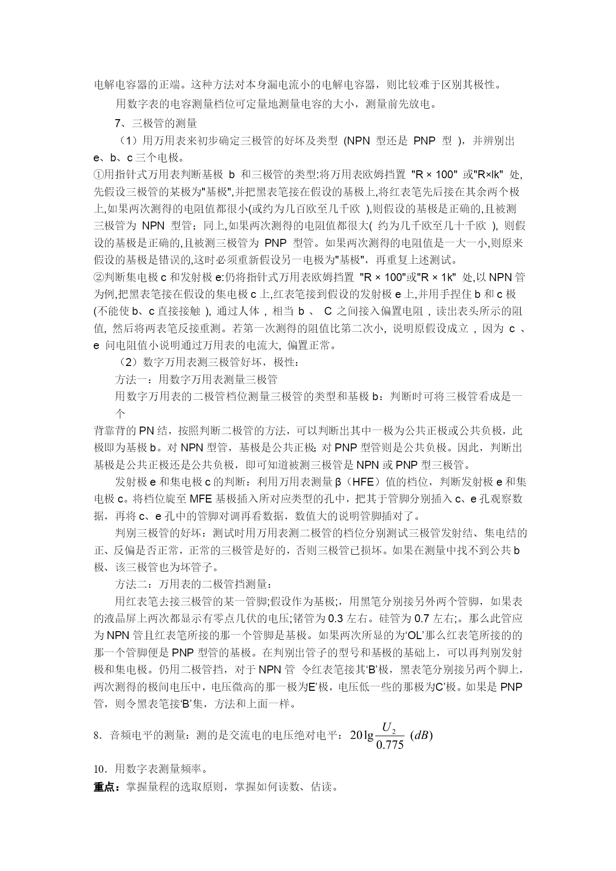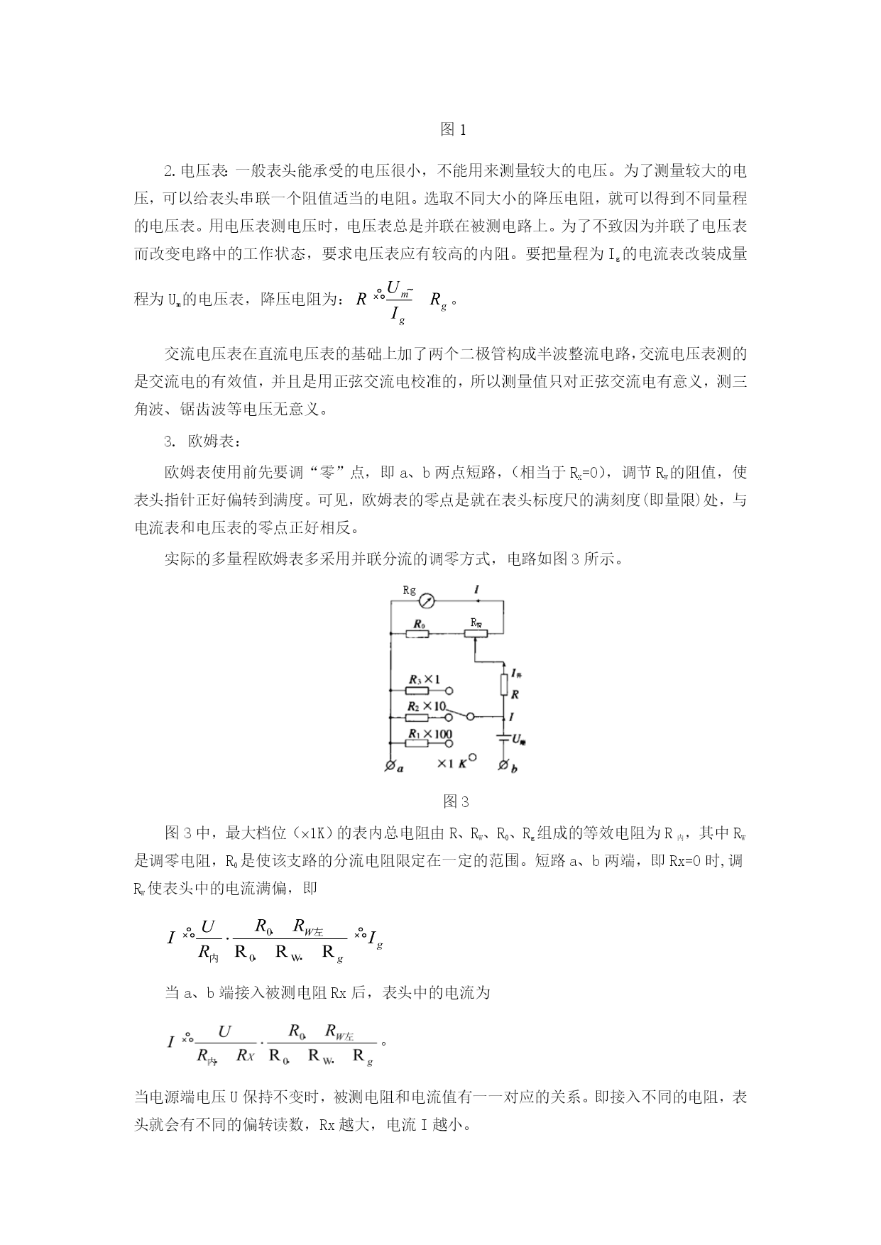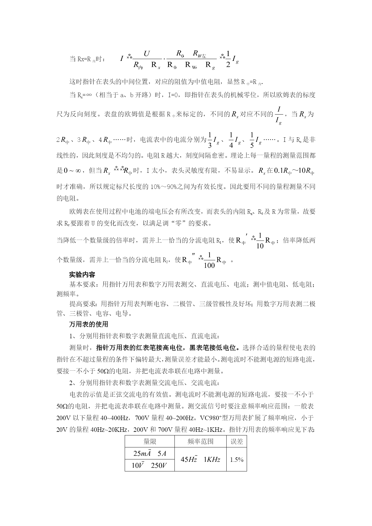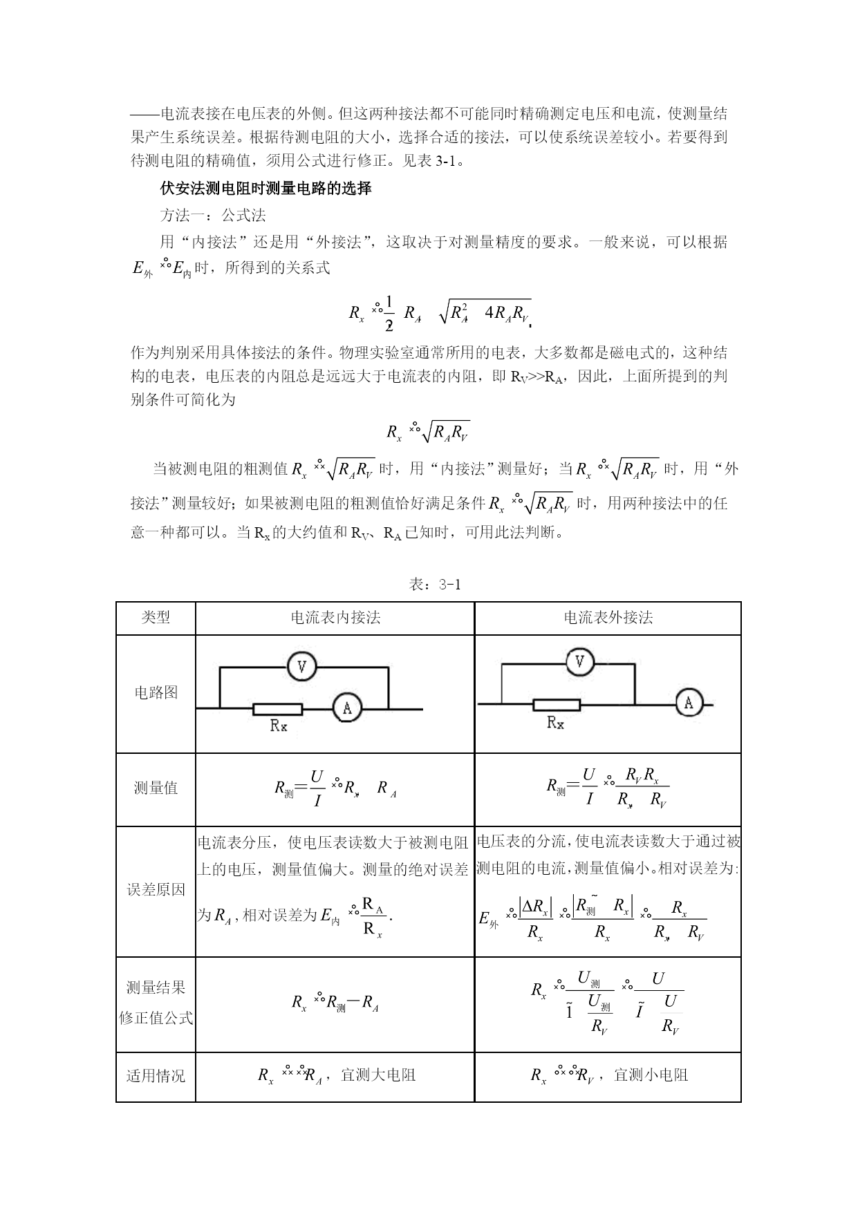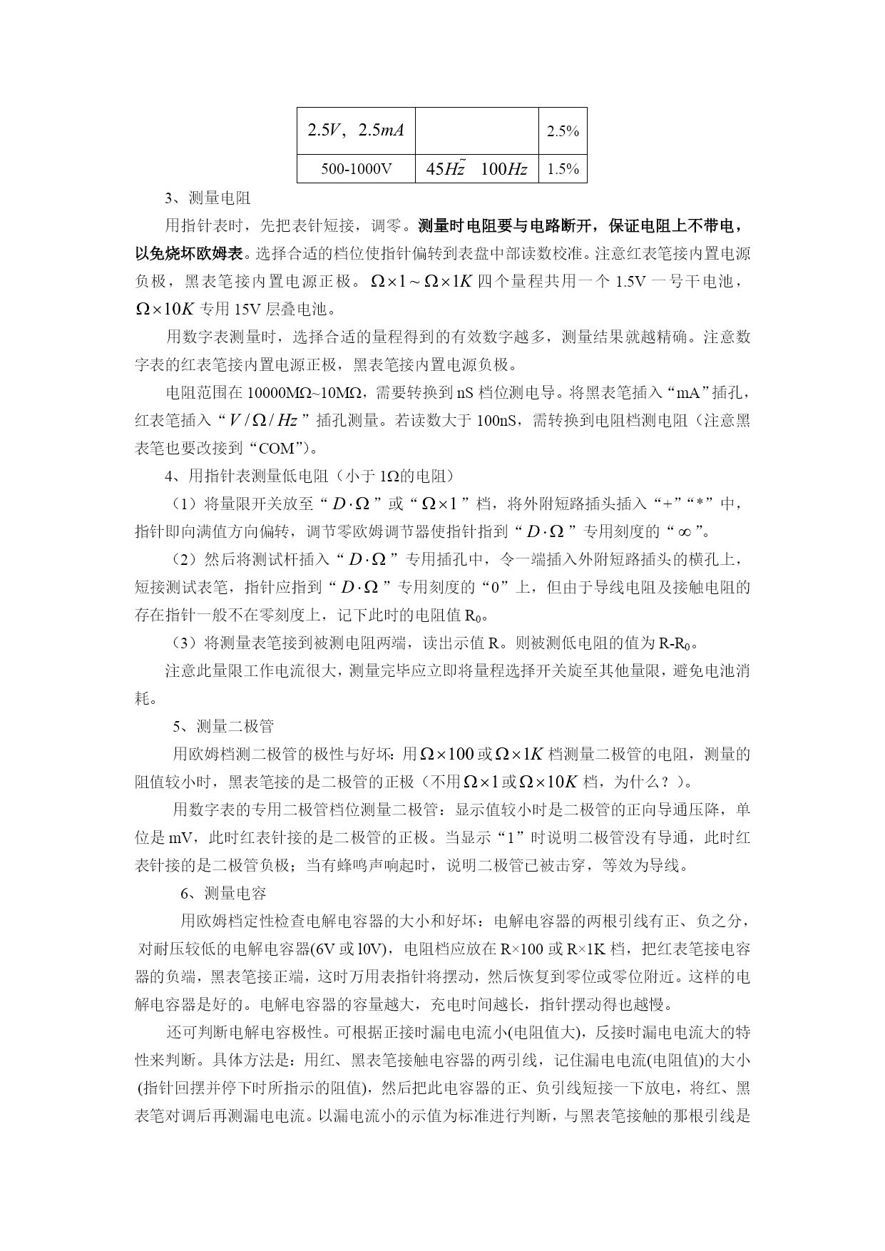 大学物理实验评分标准成绩构成:预习情况约占20%,课堂表现约占40%,实验报告约占40%。实验报告上给出五分制成绩,最终折算成百分制平均成绩。实验内容分为基本要求和提高要求。出色的完成基本要求,得分约在70-85分;在完成基本要求的基础上再完成提高要求,得分在85-100分。要根据课程表提前进行预习,否则不允许上实验课。各实验的预习要求:1、万用表的使用:实验原理应介绍电流表、电压表、欧姆表的结构原理,不同量程对应电表内阻的变化规律。根据实验要求,设计出合理的实验步骤。2、伏安法测电阻:实验原理应明确系统误差的来源,如何减小系统误差。明确电流表内、外接法的选择依据。根据实验要求,设计出合理的实验步骤。3、单臂电桥:实验原理应介绍单臂电桥测量电阻的原理,如何消除比例臂造成的测量误差,理解电桥灵敏度的概念。根据实验要求,设计出合理的实验步骤。4、示波器的使用:实验原理应包括示波器显示原理(扫描、同步等过程),如何测量电压、周期。本实验步骤可以在实验课上总结记录。5、RLC谐振特性:实验原理应介绍清楚RLC谐振原理和谐振特点。根据实验要求,设计出合理的实验步骤。6、动态磁滞回线的测量:实验原理应介绍本实验中用示波器显示磁滞回线的原理。根据实验要求,设计出合理的实验步骤。7、静电场的描绘:实验原理应包括为什么能用电流场模拟静电场,两者有哪些相似之处;模拟的条件是什么。实验1导热系数的测定导热系数是描述物质导热能力大小的物理量,不同的物质有不同导热系数。根据导热系数的大小,物质可分为良导体和不良导体。本实验用稳态法测量不良导体的导热系数。【实验目的】1.学习温度传感器和控温装置的使用;2.测量不良导体的导热系数。【实验原理】根据热传导定律:在物体内部,垂直于导热方向上,两个相距为,面积为,温度分别为的平行平面,在时间内,从一个平面传到另一个平面的热量满足下述表达式:(2.11.1)式中为该物质的导热系数,为园盘样品的半径,为样品厚度,分别为稳态时样品上、下表面的温度。由于稳态时,的值稳定不变,可以认为发热盘通过样品上平面传入的热量与散热盘向周围环境散热的速率相等,因此可通过散热盘在温度时的散热速率求出热流量,方法如下:当读得稳态时的后,去掉样品,将加热盘与散热盘直接接触,调节三个螺栓使加热盘和散热盘接触良好,在设定温度到80度,加快散热盘的温度上升,使散热盘温度上升到高于稳态时的20度左右即可,停止加热,每隔30秒钟读取一下散热盘的温度,选取附近的上下两个温度数据,求出散热盘的冷却速率,即:(2.11.2)在达到稳态的过程中,因P盘的上表面并未暴露在空气中,而物体的冷却速率与它的散热表面积成正比,为此,稳态时铜盘的散热速率的表达式应作面积修正:即(2.11.3)因而导热系数为:(2.11.4)【实验器材】导热系数测定仪,电子天平,秒表等。【实验内容】1.熟悉实验仪器,安装测试样品。2.插好加热盘的电源插头,连接好温度传感器,注意要把传感器完全插入小孔中,且加热盘和散热盘的两个传感器要一一对应,不可互换,两个小孔也要上下对齐。3.接通电源,左边表头首先显示FDHC,然后显示当时温度,当转换显示“b===”时,可以设置控制温度,一般设置为75—80度,设置完成按“确定”键,加热盘开始加热,右边显示散热盘的当时温度。4.加热盘的温度上升到设定温度值时,开始记录散热盘的温度,每隔1分钟记录一次,在10分钟或更长的时间内,加热盘和散热盘的温度值基本不变,可以认为已经达到稳态了。5.按复位键停止加热,去掉样品,调节三个螺栓使加热盘和散热盘接触良好,在设定温度到80度,加快散热盘的温度上升,使散热盘温度上升到高于稳态时的20度左右即可。6.移去加热盘,让散热盘在风扇作用下冷却,每隔30秒记录一次散热盘的温度值,选取邻近值的上下两个温度数值计算冷却速率。7.根据测量得到的稳态时的温度,,以及在时的冷却速率,由公式(2.11.4)计算不良导体样品的导热系数。【注意事项】1.设定加热盘温度不要超过80度。2.加热盘和散热盘侧面的两个小孔安装温度传感器,不可插错。近电源开关的接插件为加热传感器,应插入加热盘内,另一个插入散热盘内。3.使用前将加热盘和散热盘及样品的表面擦干净,在固定安装加热盘、散热盘和样品时,三个调节螺丝不宜过紧过松,用力要均匀。4.在实验过程中,需移开加热盘时,请先关闭加热电源,移开热圆筒时,手应握住固定轴转动,以免烫伤手,实验结束后,切断总电源,保管好测量样品,不要使样品两端面划伤,以至影响实验精度。【思考讨论】1.实验过程中,稳态如何实现?2.根据导热仪的结构,分析哪些因素引入系统误差?如何减小系统误差?实验2万用表的使用电表在电测量中有着广泛