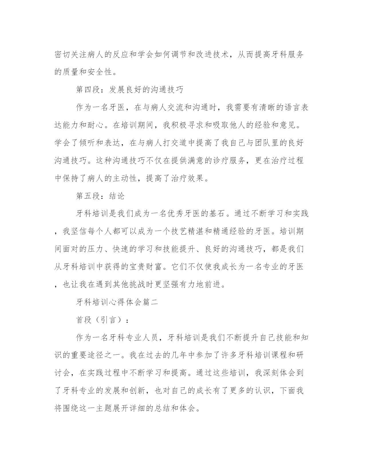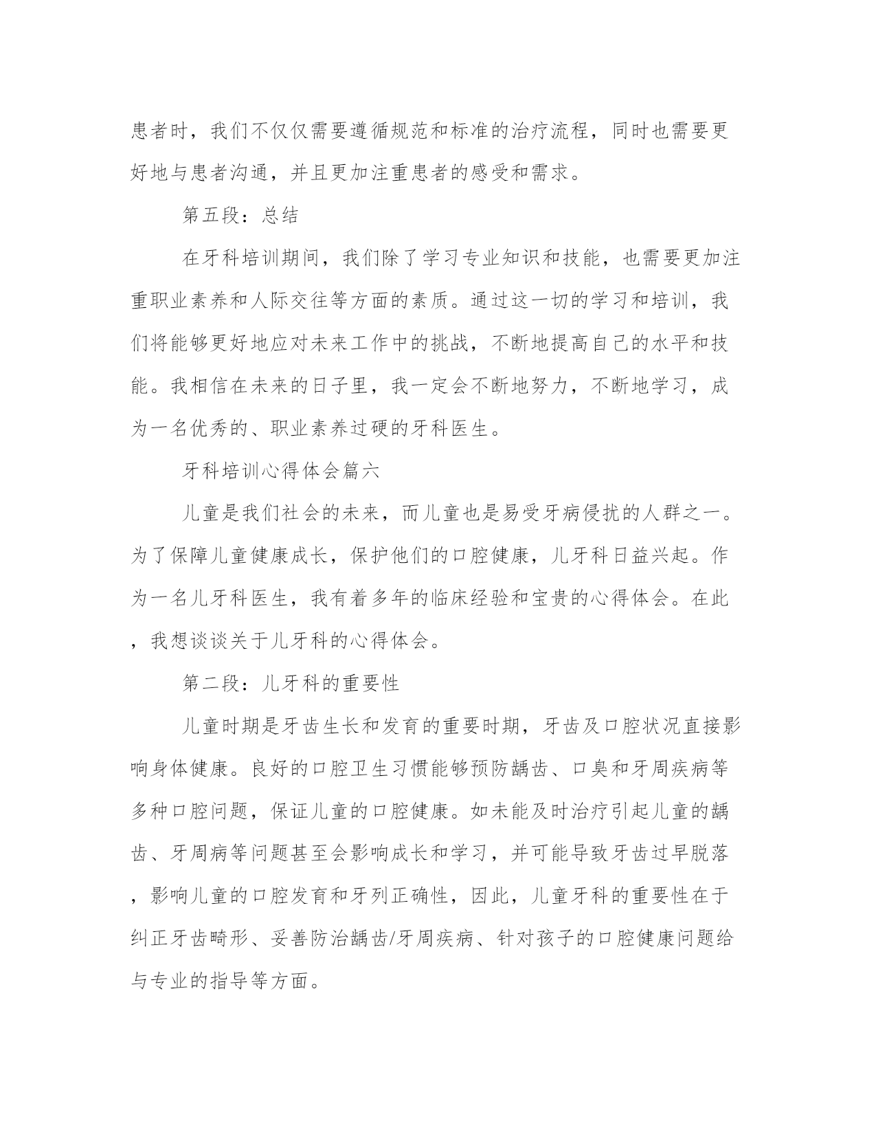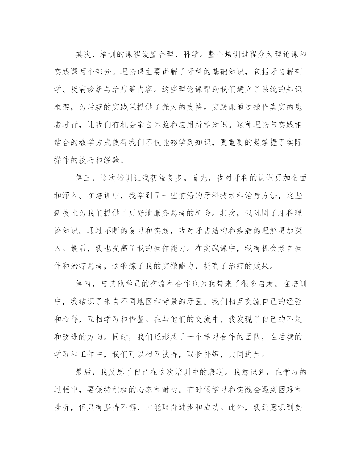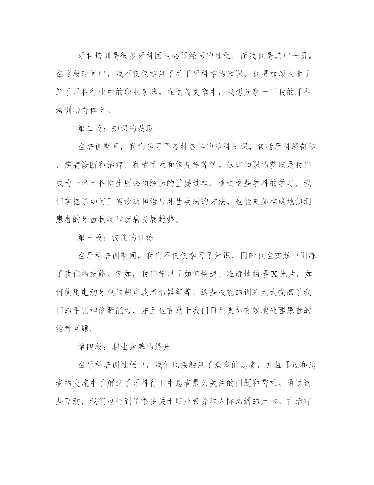 优质牙科培训心得体会(模板14篇)人生的每一个阶段都需要总结心得体会,这是我们成长进步的重要方式之一。写心得体会时,可以借鉴他人的观点和经验,但不要简单照搬,要根据自己的实际情况进行思考和总结。以下是一些心得体会的分享,希望能给大家提供一些参考。牙科培训心得体会篇一牙科培训是每个牙医或即将成为牙医的人必须经历的阶段。除了面对丰富的知识和技能要求,还要应对各种挑战和压力。在我进行牙科培训的几年里,我经历了许多的体验和收获。在培训的过程中,我学到了很多技能和技巧,同时也汲取了许多关于自己成长和提高的经验与教训。在这篇文章中,我将分享我的牙科培训心得与体会。第二段:克服压力在牙科培训过程中,我经常会面对高度紧张和充满压力的情境。如何应对这些压力成为了我必须要面对的挑战。我找到了一种办法,就是把更多能量用在工作和培训上,尽量转移注意力,提高专注度来减轻心理压力和不适。另外,也学会了采取积极的态度和心理平衡来减少压力,并把失败视为成长的机会,而不是打击自尊心的打击。第三段:快速学习和技能提升牙科培训是一个高效和快速学习的过程。我必须通过高质量的学习和训练来掌握并提高所需的技能和知识。一旦我获得技能,我就会密切关注病人的反应和学会如何调节和改进技术,从而提高牙科服务的质量和安全性。第四段:发展良好的沟通技巧作为一名牙医,在与病人交流和沟通时,我需要有清晰的语言表达能力和耐心。在培训期间,我积极寻求和吸取他人的经验和意见。学会了倾听和表达,在与病人打交道中提高了我自己与团队里的良好沟通技巧。这种沟通技巧不仅在提供满意的诊疗服务,更在治疗过程中保持了病人的主动性,提高了治疗效果。第五段:结论牙科培训是我们成为一名优秀牙医的基石。通过不断学习和实践,我坚信每个人都可以成为一个技艺精湛和精通经验的牙医。培训期间面对的压力、快速的学习和技能提升、良好的沟通技巧,都是我们从牙科培训中获得的宝贵财富。它们不仅使我成长为一名专业的牙医,也让我在遇到其他挑战时更坚强有力地前进。牙科培训心得体会篇二首段(引言):作为一名牙科专业人员,牙科培训是我们不断提升自己技能和知识的重要途径之一。我在过去的几年中参加了许多牙科培训课程和研讨会,在实践过程中不断学习和提高。通过这些培训,我深刻体会到了牙科专业的发展和创新,也对自己的成长有了更多的认识,下面我将围绕这一主题展开详细的总结和体会。二段(培训的收获):在牙科培训中,我获得了丰富的知识和技能,其中最大的收获是对牙科技术和器械的了解和运用。通过培训,我学习到了最新的牙科技术,包括数字化牙科、激光治疗等。这些新技术使我们的工作更加精准和高效。另外,培训还使我了解了一些先进的牙科器械,如口腔摄影仪、口腔扫描仪等。通过合理运用这些器械,我们可以提高病人的体验,同时也为我们的工作带来了便利和效益。三段(技能的提升):在参加牙科培训后,我发现自己的临床技能有了显著提升。通过与来自不同地区和不同经验的专业人士的交流和互动,我了解到了一些新的治疗方案和技巧。比如,在充填治疗中,我学到了一种新的充填材料,它具有更好的耐久性和美观度,为患者提供了更好的牙齿修复效果。另外,培训还加强了我在牙齿矫正、牙周病治疗等方面的专业技能。这些新的技能和知识让我更有信心和能力面对各种临床挑战,并为患者提供更好的治疗效果。四段(心得感悟):在牙科培训中,我深刻认识到专业的学习和实践是我们成长和发展的关键。只有不断学习和提高,才能跟上行业的发展和创新,才能为患者提供更好的牙齿健康服务。同时,培训也让我明确了自己的职业目标和规划,知道了自己需要提升的方面和需要学习的知识和技能。我将继续参加更多的培训课程和研讨会,不断充实自己,并积极应用所学知识于实践中。五段(总结):通过牙科培训,我不仅获得了丰富的知识和技能,还提升了自己的临床能力和专业素养。我深刻认识到只有不断学习和实践,才能保持竞争力和提高自己的职业水平。我将继续致力于学习和实践,为患者提供更好的牙齿健康服务,并为行业的发展做出贡献。最后,我要感谢所有为培训付出努力的人员和组织,他们为我们提供了一个优秀的学习平台,让我们能够不断学习和成长。牙科培训心得体会篇三作为一名牙科行业的从业者,我有幸参加了一次专业的牙科培训。在这次培训中,我不仅学到了很多牙科技术和知识,也收获了许多宝贵的体会和感悟。下面我将从培训组织、课程设置、学习收获、交流与合作和自我反思五个方面进行总结和体会。首先,培训的组织工作非常出色。整个培训以小班授课的形式进行,每个班级分别由一位经验丰富的牙医带领。这样的安排使得每位学员能够获得更充分的指导和关注。同时,培训机构还为学员们提供了优秀的学习环境,每个班级都配备了先进的实验室设备和专业的学习材料。这些举措为我们提供了一个良好的学习平