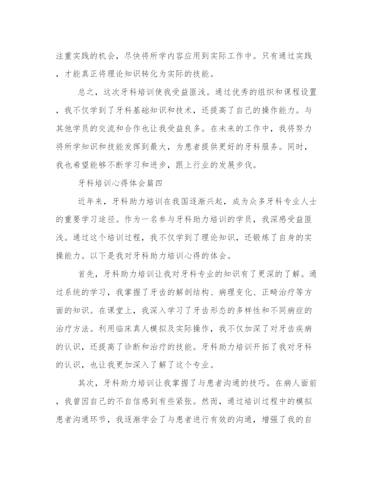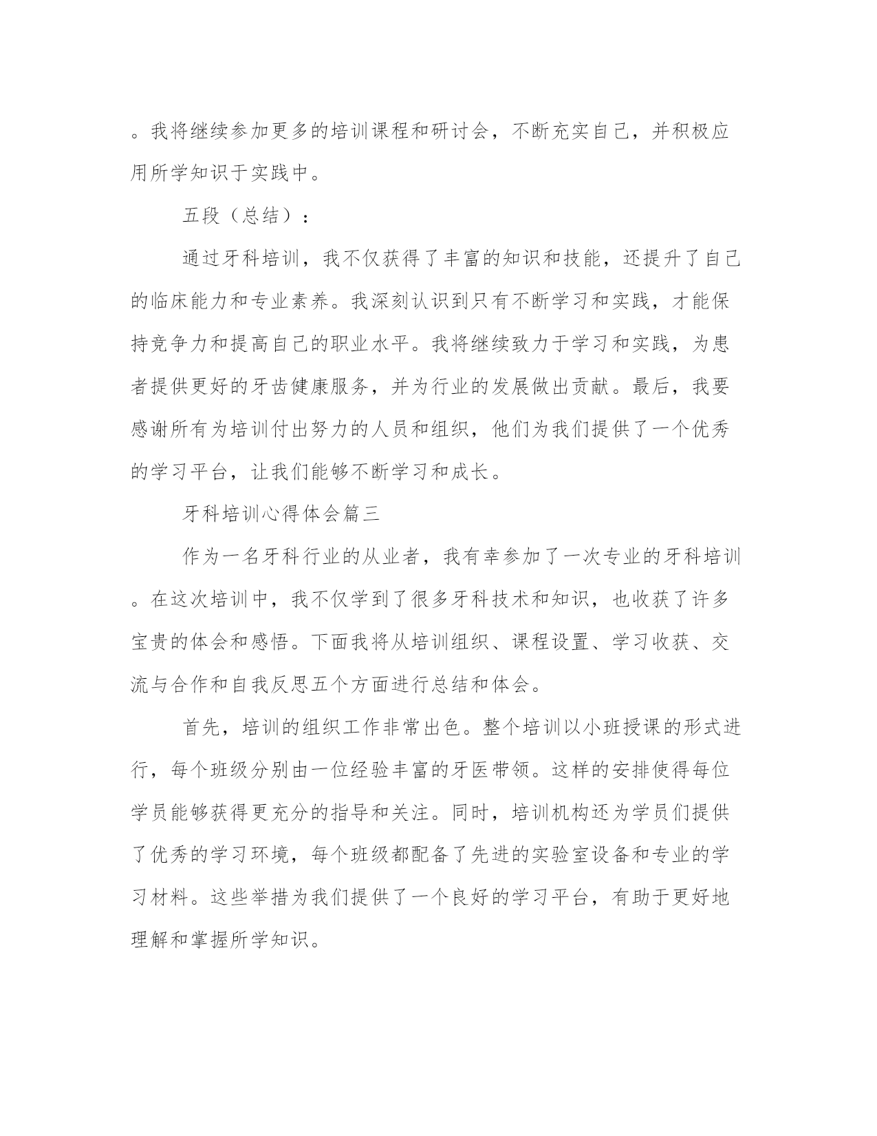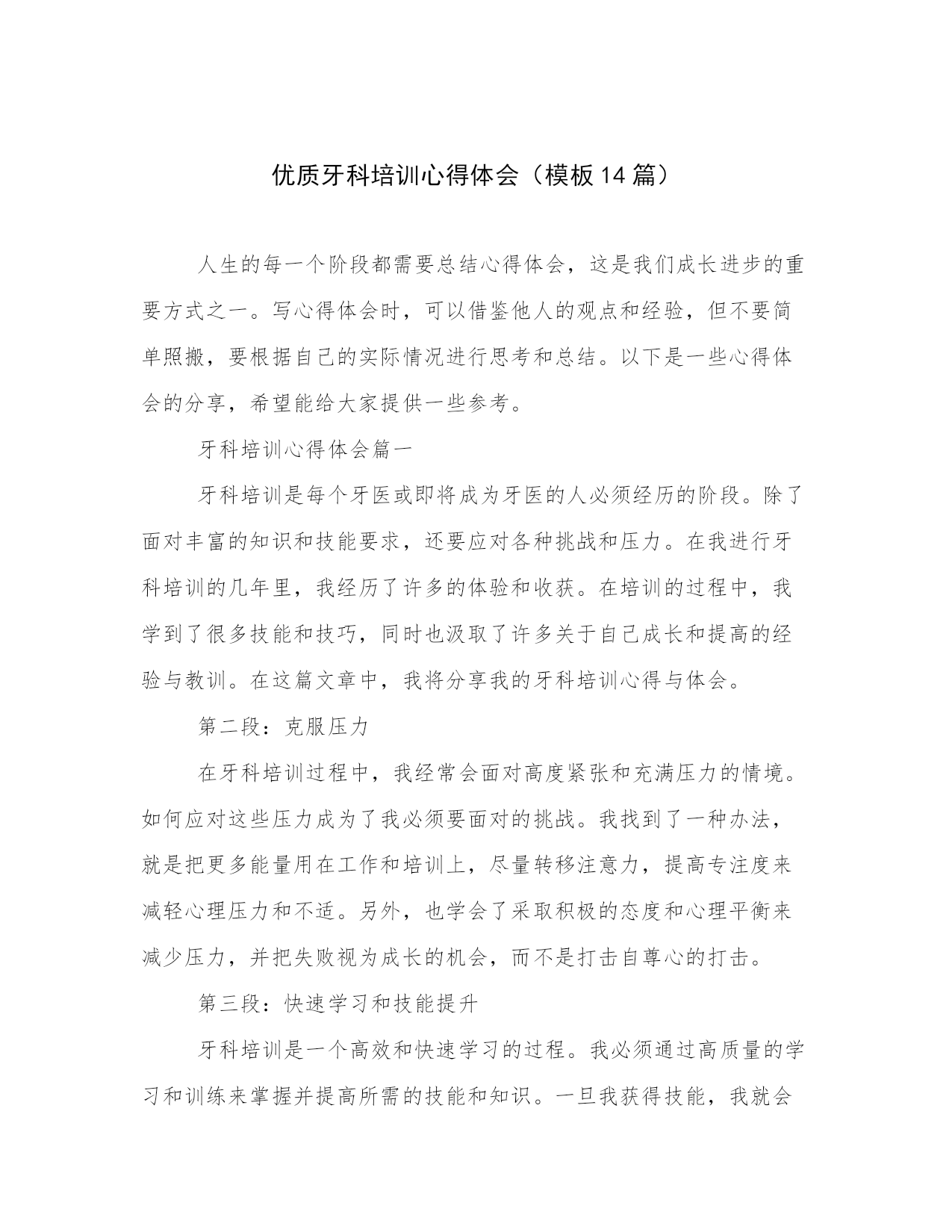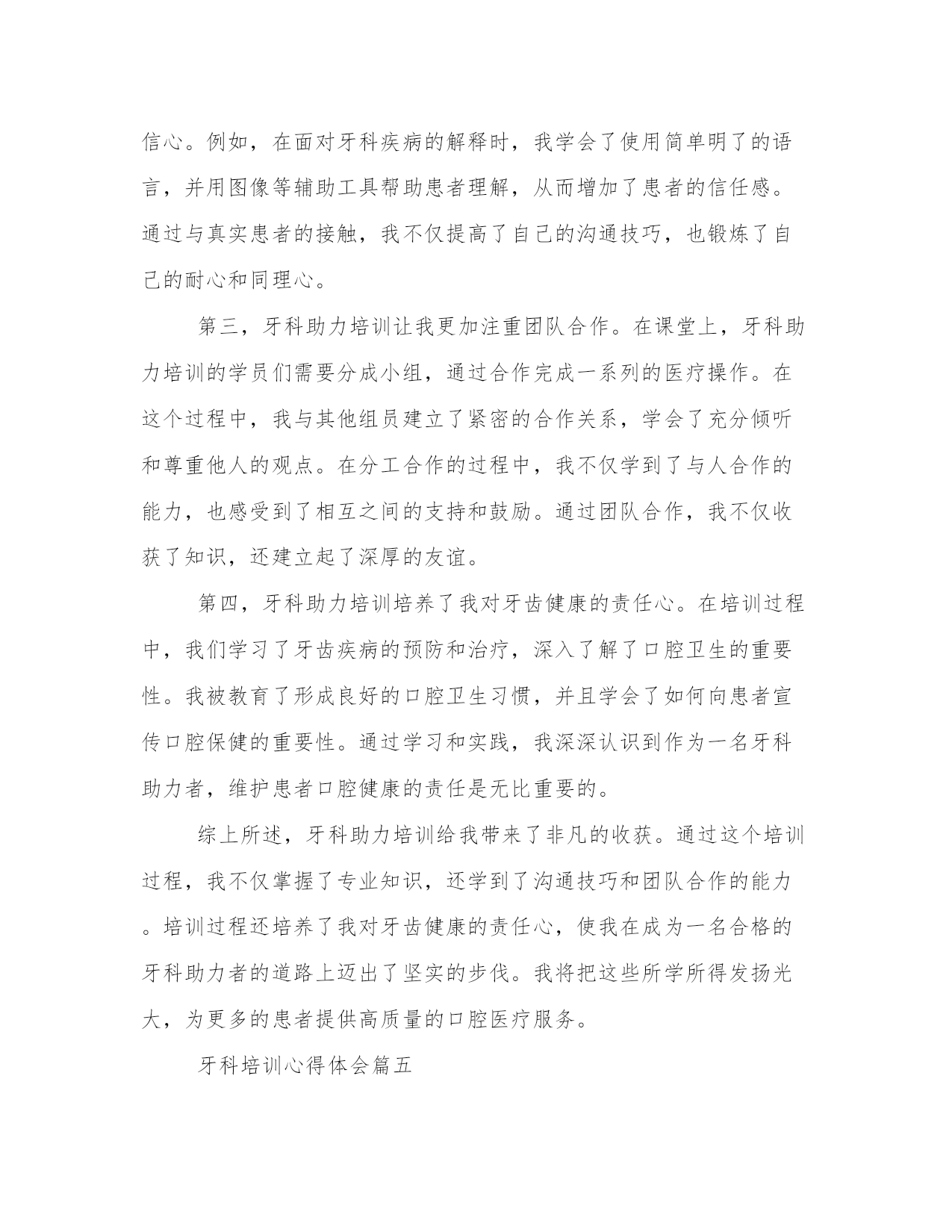 优质牙科培训心得体会(模板14篇)人生的每一个阶段都需要总结心得体会,这是我们成长进步的重要方式之一。写心得体会时,可以借鉴他人的观点和经验,但不要简单照搬,要根据自己的实际情况进行思考和总结。以下是一些心得体会的分享,希望能给大家提供一些参考。牙科培训心得体会篇一牙科培训是每个牙医或即将成为牙医的人必须经历的阶段。除了面对丰富的知识和技能要求,还要应对各种挑战和压力。在我进行牙科培训的几年里,我经历了许多的体验和收获。在培训的过程中,我学到了很多技能和技巧,同时也汲取了许多关于自己成长和提高的经验与教训。在这篇文章中,我将分享我的牙科培训心得与体会。第二段:克服压力在牙科培训过程中,我经常会面对高度紧张和充满压力的情境。如何应对这些压力成为了我必须要面对的挑战。我找到了一种办法,就是把更多能量用在工作和培训上,尽量转移注意力,提高专注度来减轻心理压力和不适。另外,也学会了采取积极的态度和心理平衡来减少压力,并把失败视为成长的机会,而不是打击自尊心的打击。第三段:快速学习和技能提升牙科培训是一个高效和快速学习的过程。我必须通过高质量的学习和训练来掌握并提高所需的技能和知识。一旦我获得技能,我就会密切关注病人的反应和学会如何调节和改进技术,从而提高牙科服务的质量和安全性。第四段:发展良好的沟通技巧作为一名牙医,在与病人交流和沟通时,我需要有清晰的语言表达能力和耐心。在培训期间,我积极寻求和吸取他人的经验和意见。学会了倾听和表达,在与病人打交道中提高了我自己与团队里的良好沟通技巧。这种沟通技巧不仅在提供满意的诊疗服务,更在治疗过程中保持了病人的主动性,提高了治疗效果。第五段:结论牙科培训是我们成为一名优秀牙医的基石。通过不断学习和实践,我坚信每个人都可以成为一个技艺精湛和精通经验的牙医。培训期间面对的压力、快速的学习和技能提升、良好的沟通技巧,都是我们从牙科培训中获得的宝贵财富。它们不仅使我成长为一名专业的牙医,也让我在遇到其他挑战时更坚强有力地前进。牙科培训心得体会篇二首段(引言):作为一名牙科专业人员,牙科培训是我们不断提升自己技能和知识的重要途径之一。我在过去的几年中参加了许多牙科培训课程和研讨会,在实践过程中不断学习和提高。通过这些培训,我深刻体会到了牙科专业的发展和创新,也对自己的成长有了更多的认识,下面我将围绕这一主题展开详细的总结和体会。二段(培训的收获):在牙科培训中,我获得了丰富的知识和技能,其中最大的收获是对牙科技术和器械的了解和运用。通过培训,我学习到了最新的牙科技术,包括数字化牙科、激光治疗等。这些新技术使我们的工作更加精准和高效。另外,培训还使我了解了一些先进的牙科器械,如口腔摄影仪、口腔扫描仪等。通过合理运用这些器械,我们可以提高病人的体验,同时也为我们的工作带来了便利和效益。三段(技能的提升):在参加牙科培训后,我发现自己的临床技能有了显著提升。通过与来自不同地区和不同经验的专业人士的交流和互动,我了解到了一些新的治疗方案和技巧。比如,在充填治疗中,我学到了一种新的充填材料,它具有更好的耐久性和美观度,为患者提供了更好的牙齿修复效果。另外,培训还加强了我在牙齿矫正、牙周病治疗等方面的专业技能。这些新的技能和知识让我更有信心和能力面对各种临床挑战,并为患者提供更好的治疗效果。四段(心得感悟):在牙科培训中,我深刻认识到专业的学习和实践是我们成长和发展的关键。只有不断学习和提高,才能跟上行业的发展和创新,才能为患者提供更好的牙齿健康服务。同时,培训也让我明确了自己的职业目标和规划,知道了自己需要提升的方面和需要学习的知识和技能。我将继续参加更多的培训课程和研讨会,不断充实自己,并积极应用所学知识于实践中。五段(总结):通过牙科培训,我不仅获得了丰富的知识和技能,还提升了自己的临床能力和专业素养。我深刻认识到只有不断学习和实践,才能保持竞争力和提高自己的职业水平。我将继续致力于学习和实践,为患者提供更好的牙齿健康服务,并为行业的发展做出贡献。最后,我要感谢所有为培训付出努力的人员和组织,他们为我们提供了一个优秀的学习平台,让我们能够不断学习和成长。牙科培训心得体会篇三作为一名牙科行业的从业者,我有幸参加了一次专业的牙科培训。在这次培训中,我不仅学到了很多牙科技术和知识,也收获了许多宝贵的体会和感悟。下面我将从培训组织、课程设置、学习收获、交流与合作和自我反思五个方面进行总结和体会。首先,培训的组织工作非常出色。整个培训以小班授课的形式进行,每个班级分别由一位经验丰富的牙医带领。这样的安排使得每位学员能够获得更充分的指导和关注。同时,培训机构还为学员们提供了优秀的学习环境,每个班级都配备了先进的实验室设备和专业的学习材料。这些举措为我们提供了一个良好的学习平