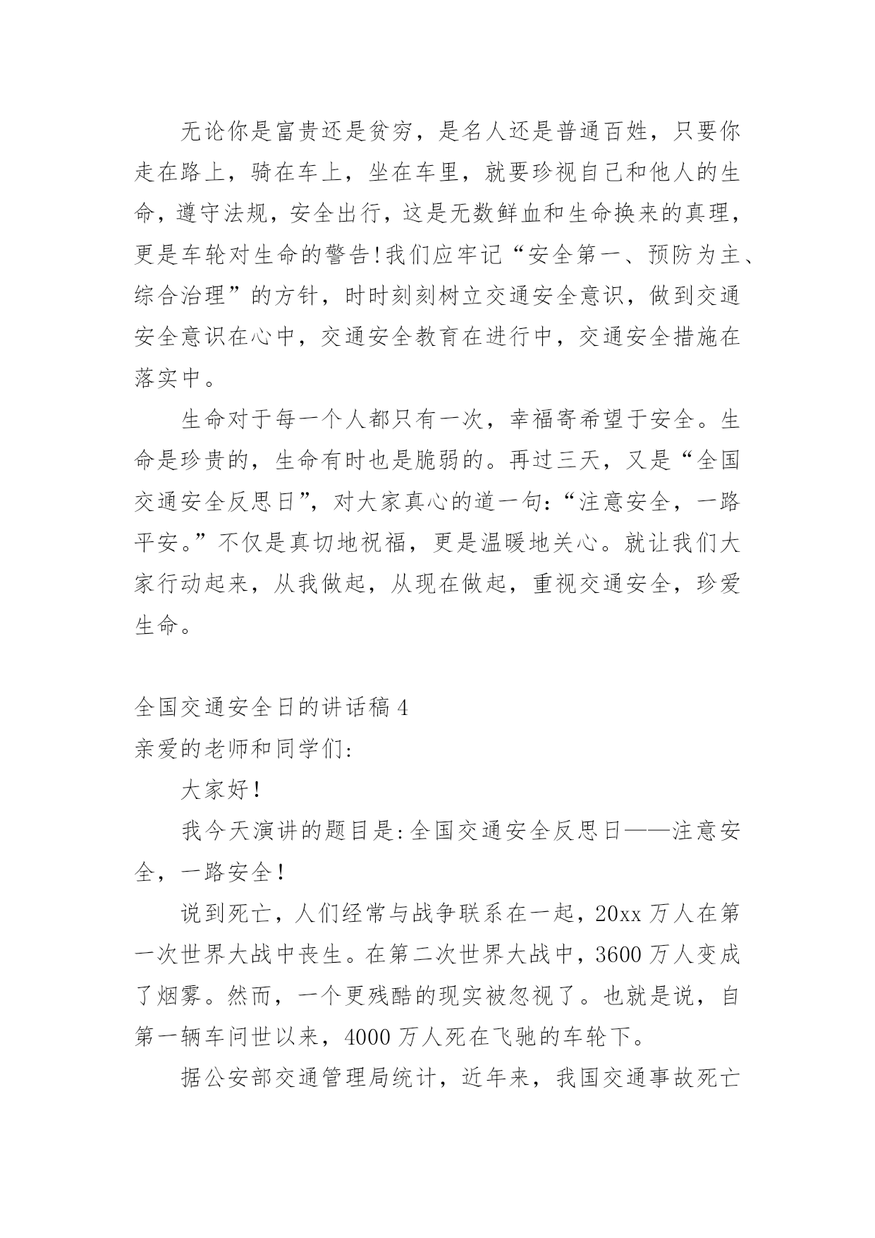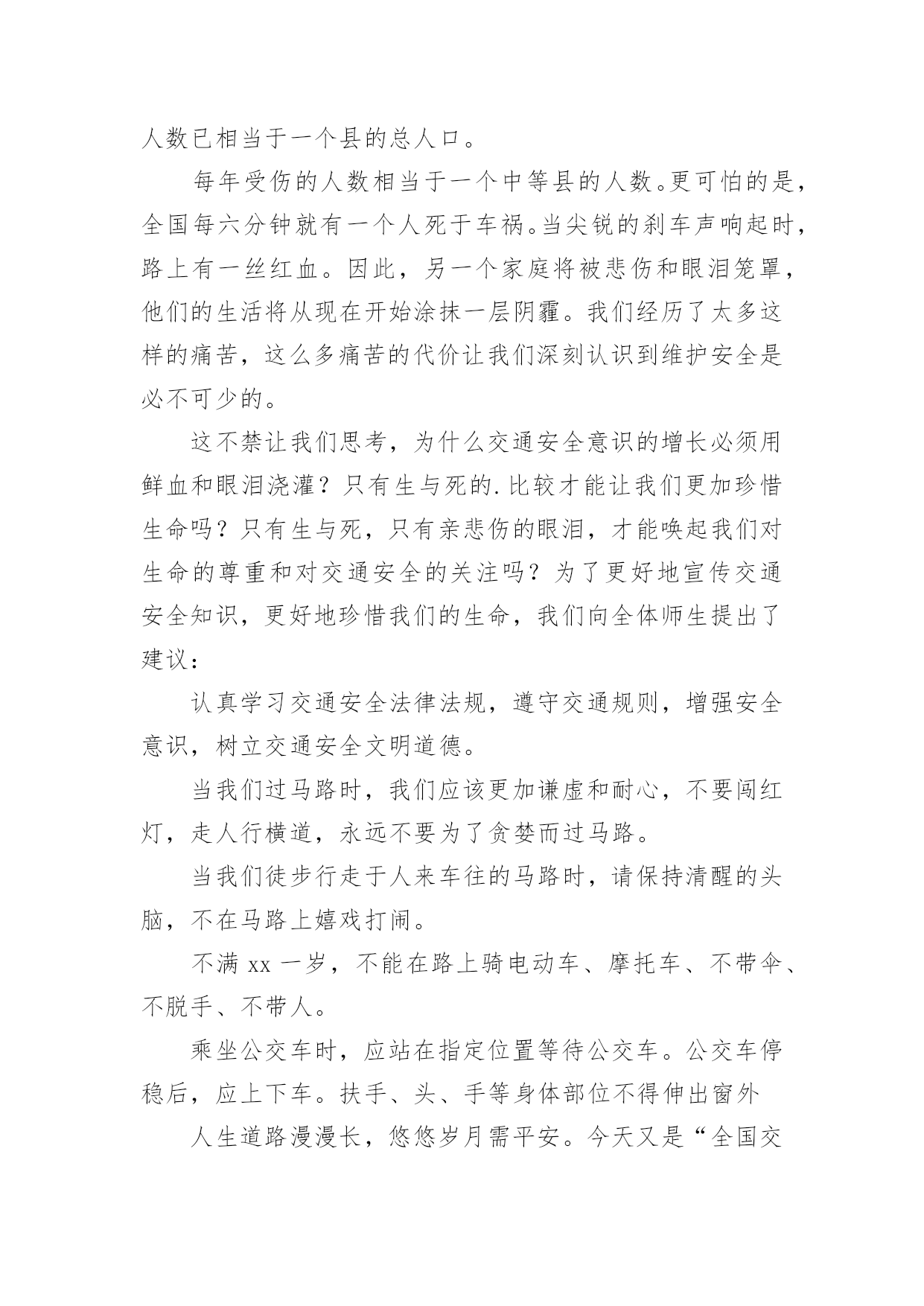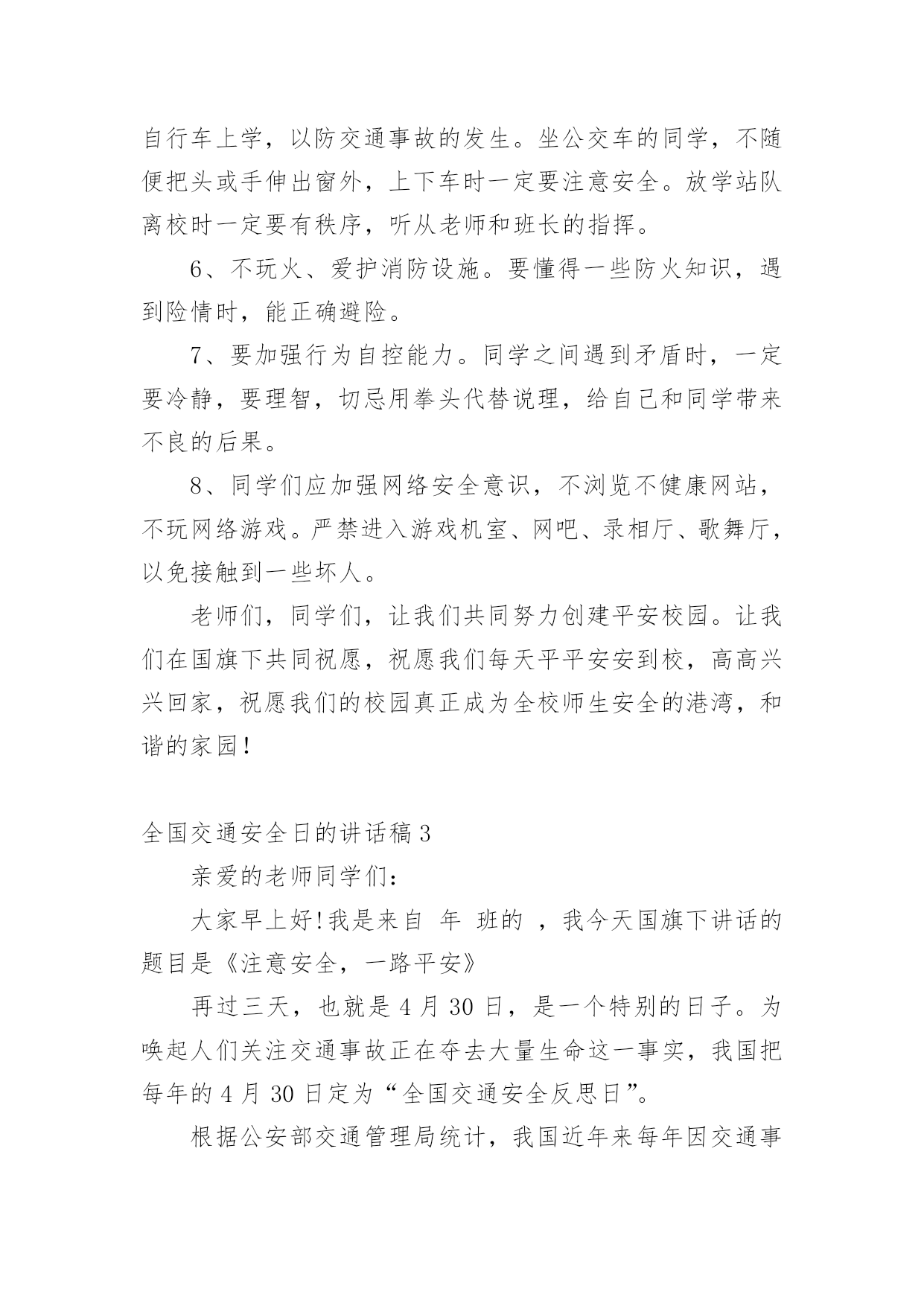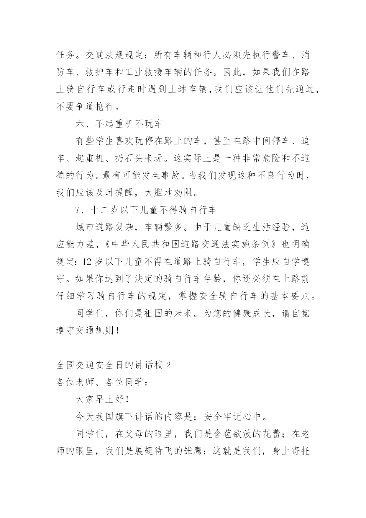 全国交通安全日的讲话稿在生活中,我们用到讲话稿的地方越来越多,讲话稿的作用是辅助讲话者集中有效地围绕会议议题把话讲好,不至于走题或者把话讲错。那么问题来了,到底应如何写好一份讲话稿呢?下面是小编为大家收集的全国交通安全日的讲话稿,仅供参考,希望能够帮助到大家。全国交通安全日的讲话稿1同学们:你们好!今天主要给同学讲交通安全常识。随着社会的发展,交通安全越来越重要,我们每个学生都是社会参与者,也就是说,我们每天在路上或旅行,只要道路参与交通,因为道路拥挤,交通参与者往往因为不注意规则或疏忽和交通事故,汽车碰撞,汽车碰撞,因此,我今天告诉学生交通安全知识:1、安全走路走路,你可能会认为这是一件简单的事情。事实上,如果我们不注意交通安全,走路也会造成麻烦。因此,在繁忙的交通道路上,我们应该遵守交通规则,增强自我保护意识。我们走在人行道上。在没有人行道的地方,走在路的右边。走路时,要集中注意力,不要环顾四周,不边走边玩,不要边走边看书,不要三五成群地走,不要乱过马路,不要追车玩。不要在路上踢足球,跳橡皮筋,溜冰,玩游戏。一旦被车辆撞倒,后果非常严重。2.汽车一刹车停不下来。有的同学认为乱过马路没有什么关系,反正驾驶员会刹车的。事实上,汽车不会在一瞬间停下来。由于惯性,刹车后汽车会向前滑一段路,这就是力的惯性。就像人们在跑步时突然停下来,忍不住冲了几步。此外,能是司机不注意,刹车不好等等。因此,乱穿马路是非常危险的,许多交通事故都是由行人乱穿马路造成的。血的教训应引以为戒。3.不要在车前车后急穿马路有些人总是喜欢在车前后匆匆过马路,这很危险。司机眼睛看不见的地方叫视线死角。如果有人在车前车后驾驶员眼中看不到的视线死角内急穿马路,就会造成车祸。因此,我们应该注意左右过马路的`车辆。我们应该先向左看,然后向右看。当我们看到没有车来时,我们应该过马路。走在有人行横道和人行天桥的地方更安全。4、文明乘车当我们等公共汽车时,我们应该有序地在站台上等待。等车停稳后,让车上的人先下来,然后依次下车。车辆行驶时,应坐好或站稳,抓住扶手,防止紧急刹车时摔倒。不要将身体的任何部位伸出车外,注意安全,不要突然穿过或跑过马路,以免发生伤亡事故。5.让特种车辆先行在路上,我们经常可以看到闪亮的警灯和警报车辆,如警车、消防车、救护车或工程车辆。特种车辆承担特殊紧急任务。交通法规规定;所有车辆和行人必须先执行警车、消防车、救护车和工业救援车辆的任务。因此,如果我们在路上骑自行车或行走时遇到上述车辆,我们应该让他们先通过,不要争道抢行。六、不起重机不玩车有些学生喜欢玩停在路上的车,甚至在路中间停车、追车、起重机、扔石头来玩。这实际上是一种非常危险和不道德的行为。最有可能发生事故。当我们发现这种不良行为时,我们应该及时提醒,大胆地劝阻。7、十二岁以下儿童不得骑自行车城市道路复杂,车辆繁多。由于儿童缺乏生活经验,适应能力差,《中华人民共和国道路交通法实施条例》也明确规定:12岁以下儿童不得在道路上骑自行车,学生应自学遵守。如果你达到了法定的骑自行车年龄,你还必须在上路前仔细学习骑自行车的规定,掌握安全骑自行车的基本要点。同学们,你们是祖国的未来。为您的健康成长,请自觉遵守交通规则!全国交通安全日的讲话稿2各位老师、各位同学:大家早上好!今天我国旗下讲话的内容是:安全牢记心中。同学们,在父母的眼里,我们是含苞欲放的花蕾;在老师的眼里,我们是展翅待飞的雏鹰;这就是我们,身上寄托着父母、老师、祖国的`希望。大家处在这美好的环境里,可有的同学不注意“安全”二字,给自己带来了痛苦,痛心之余,我们苦苦反思,在紧张的学习之后,在快乐的玩耍时刻,有些同学忽视了安全问题,让关心我们的老师、家长很担心。虽然我校一直非常重视安全教育,但是同样出现了一些碰破头、跌落牙、摔断胳膊的事情呀。一旦受伤了,会造成身体的痛苦,影响了学习,再严重点可能给家庭造成毁灭性伤害。人的生命只有一次,请同学们每时每刻都要注意安全。日常生活中涉及到我们生活和学习方面的安全隐患有20多种,包括食物中毒、体育运动损伤、网络交友安全、交通事故、火灾火险等,这些都时刻威胁着我们的健康和安全。为了进一步做好我校的安全教育工作,我给大家提几条建议:1、要时刻保持安全意识,利用晨会、班会在班主任的带领下认真学习安全自护自救知识,从而提高自我防护力。2、要注意运动安全。上体育课前要作好准备活动,运动时要遵照老师的要求,不剧烈碰撞,不违规运动。防止运动器材伤人。3、要注意用电安全,不乱动教室内的电源插座,不要用湿布擦电器开关。信息课上要按规定程序操作电脑。4、要注意食品安全。不到小摊小贩购买食物,不吃不洁食物,不食过期食品。5、要注意交通安全。未满十二周岁的同学不要擅自骑自行车上学,以防交通事故的发生。坐公交车的同学,不随便把头或手