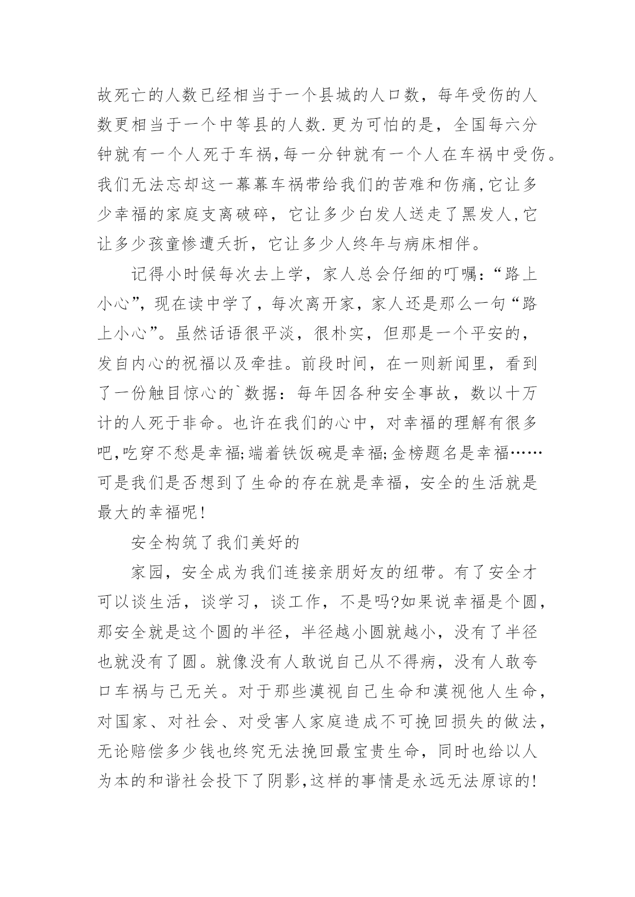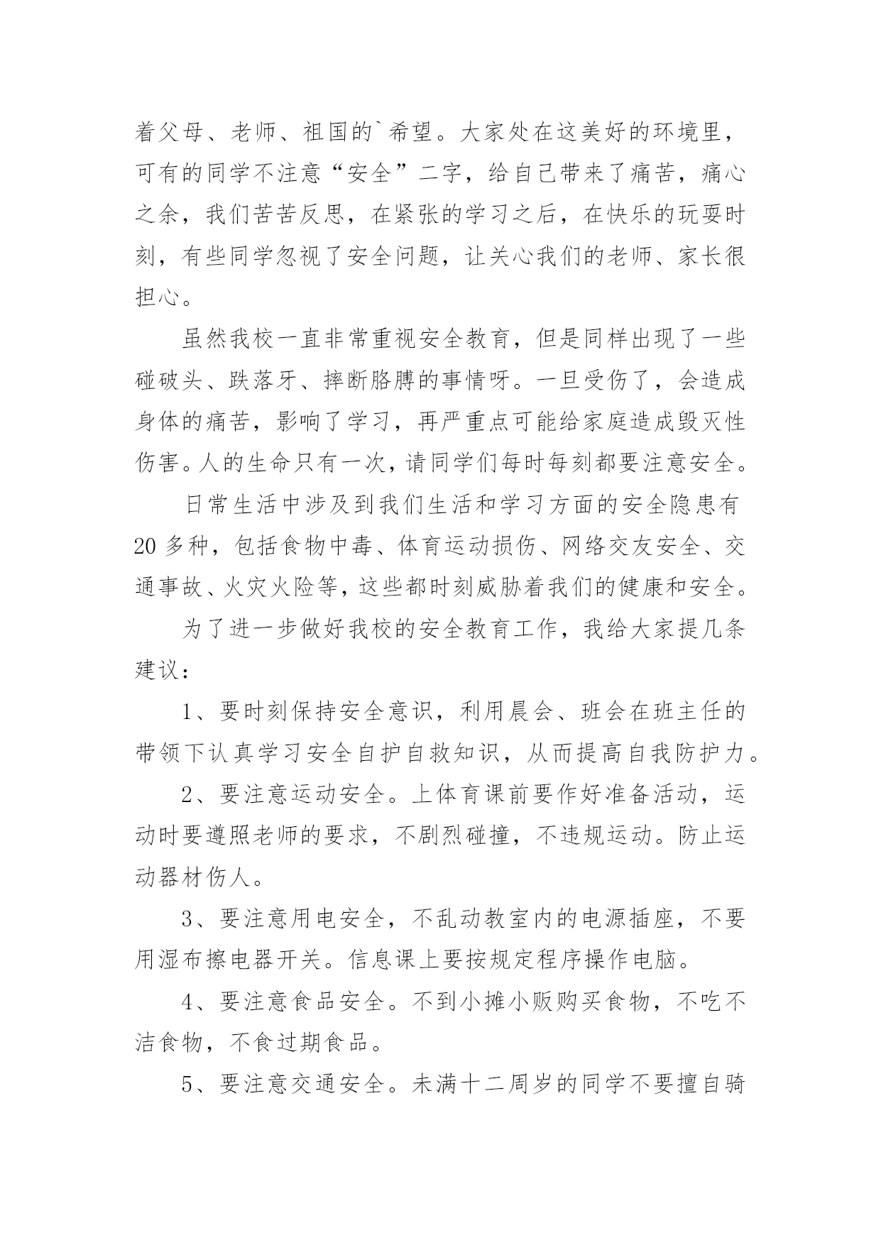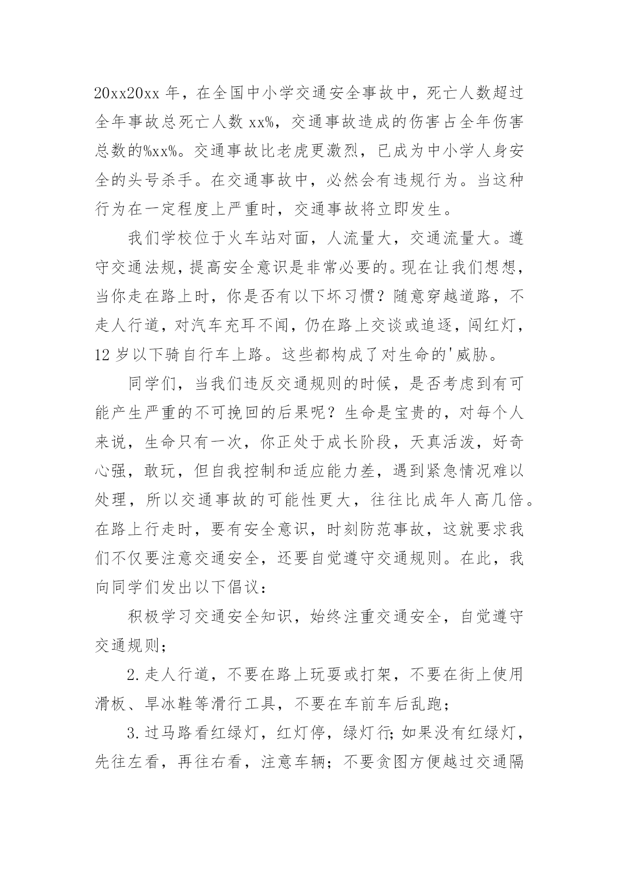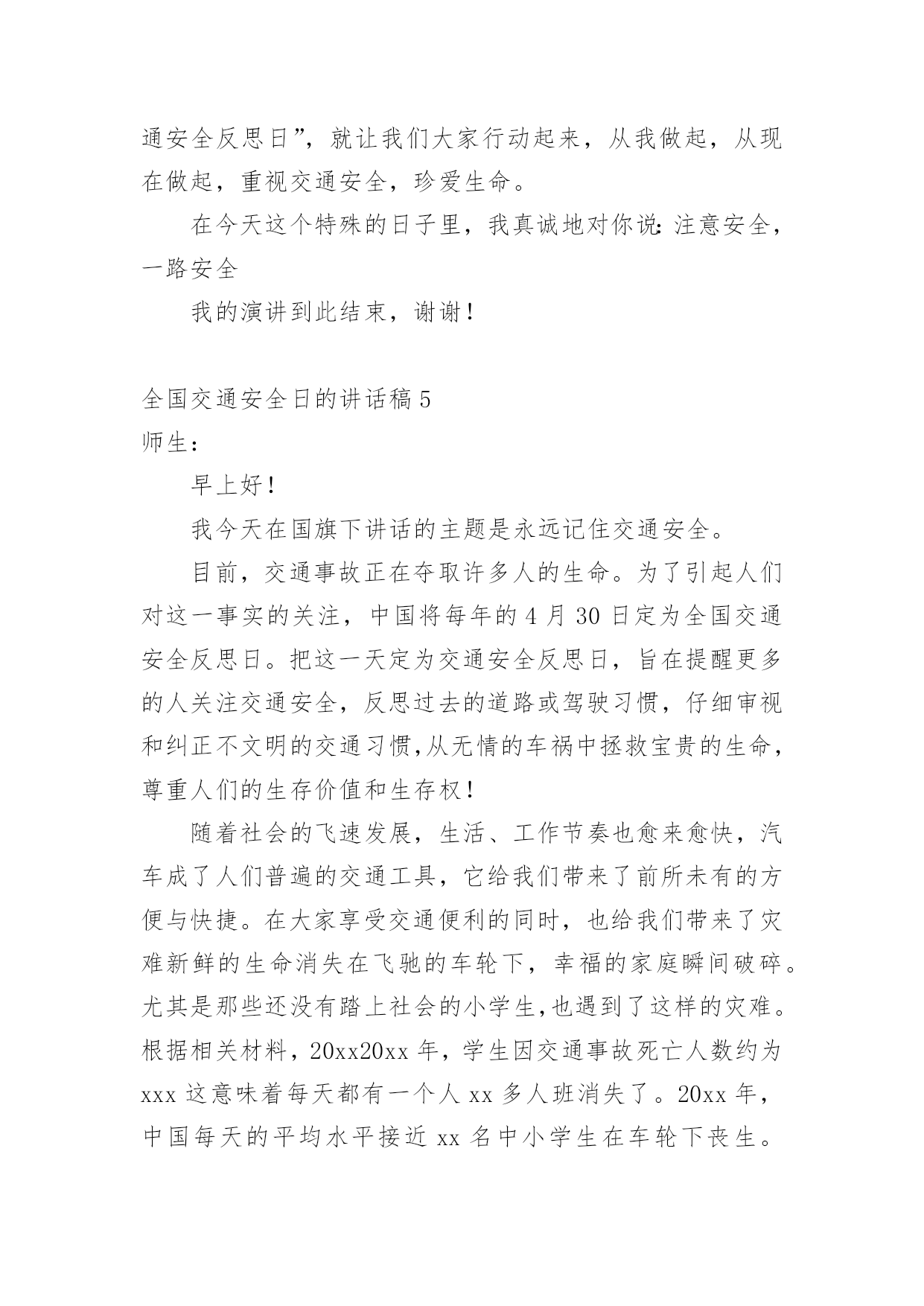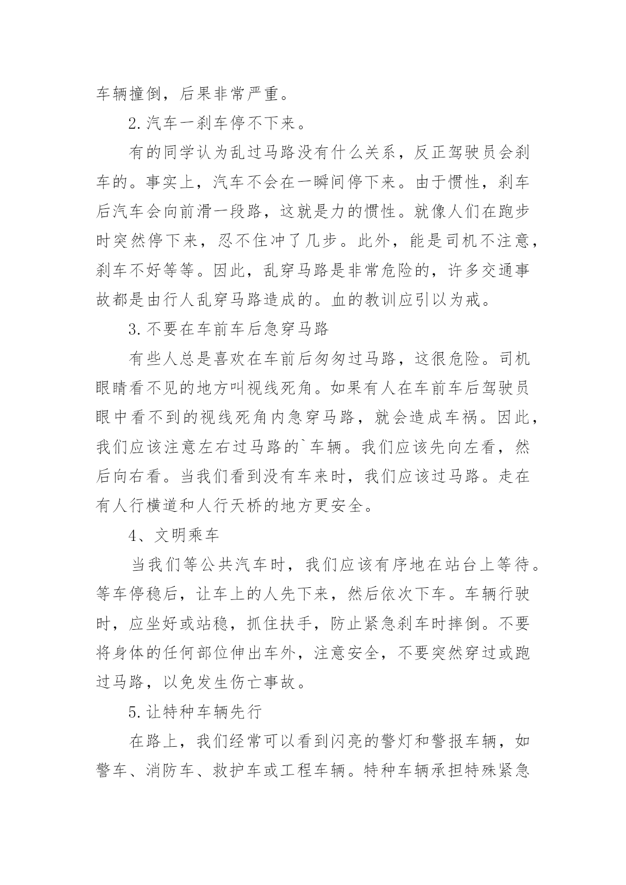 全国交通安全日的讲话稿在生活中,我们用到讲话稿的地方越来越多,讲话稿的作用是辅助讲话者集中有效地围绕会议议题把话讲好,不至于走题或者把话讲错。那么问题来了,到底应如何写好一份讲话稿呢?下面是小编为大家收集的全国交通安全日的讲话稿,仅供参考,希望能够帮助到大家。全国交通安全日的讲话稿1同学们:你们好!今天主要给同学讲交通安全常识。随着社会的发展,交通安全越来越重要,我们每个学生都是社会参与者,也就是说,我们每天在路上或旅行,只要道路参与交通,因为道路拥挤,交通参与者往往因为不注意规则或疏忽和交通事故,汽车碰撞,汽车碰撞,因此,我今天告诉学生交通安全知识:1、安全走路走路,你可能会认为这是一件简单的事情。事实上,如果我们不注意交通安全,走路也会造成麻烦。因此,在繁忙的交通道路上,我们应该遵守交通规则,增强自我保护意识。我们走在人行道上。在没有人行道的地方,走在路的右边。走路时,要集中注意力,不要环顾四周,不边走边玩,不要边走边看书,不要三五成群地走,不要乱过马路,不要追车玩。不要在路上踢足球,跳橡皮筋,溜冰,玩游戏。一旦被车辆撞倒,后果非常严重。2.汽车一刹车停不下来。有的同学认为乱过马路没有什么关系,反正驾驶员会刹车的。事实上,汽车不会在一瞬间停下来。由于惯性,刹车后汽车会向前滑一段路,这就是力的惯性。就像人们在跑步时突然停下来,忍不住冲了几步。此外,能是司机不注意,刹车不好等等。因此,乱穿马路是非常危险的,许多交通事故都是由行人乱穿马路造成的。血的教训应引以为戒。3.不要在车前车后急穿马路有些人总是喜欢在车前后匆匆过马路,这很危险。司机眼睛看不见的地方叫视线死角。如果有人在车前车后驾驶员眼中看不到的视线死角内急穿马路,就会造成车祸。因此,我们应该注意左右过马路的`车辆。我们应该先向左看,然后向右看。当我们看到没有车来时,我们应该过马路。走在有人行横道和人行天桥的地方更安全。4、文明乘车当我们等公共汽车时,我们应该有序地在站台上等待。等车停稳后,让车上的人先下来,然后依次下车。车辆行驶时,应坐好或站稳,抓住扶手,防止紧急刹车时摔倒。不要将身体的任何部位伸出车外,注意安全,不要突然穿过或跑过马路,以免发生伤亡事故。5.让特种车辆先行在路上,我们经常可以看到闪亮的警灯和警报车辆,如警车、消防车、救护车或工程车辆。特种车辆承担特殊紧急任务。交通法规规定;所有车辆和行人必须先执行警车、消防车、救护车和工业救援车辆的任务。因此,如果我们在路上骑自行车或行走时遇到上述车辆,我们应该让他们先通过,不要争道抢行。六、不起重机不玩车有些学生喜欢玩停在路上的车,甚至在路中间停车、追车、起重机、扔石头来玩。这实际上是一种非常危险和不道德的行为。最有可能发生事故。当我们发现这种不良行为时,我们应该及时提醒,大胆地劝阻。7、十二岁以下儿童不得骑自行车城市道路复杂,车辆繁多。由于儿童缺乏生活经验,适应能力差,《中华人民共和国道路交通法实施条例》也明确规定:12岁以下儿童不得在道路上骑自行车,学生应自学遵守。如果你达到了法定的骑自行车年龄,你还必须在上路前仔细学习骑自行车的规定,掌握安全骑自行车的基本要点。同学们,你们是祖国的未来。为您的健康成长,请自觉遵守交通规则!全国交通安全日的讲话稿2各位老师、各位同学:大家早上好!今天我国旗下讲话的内容是:安全牢记心中。同学们,在父母的眼里,我们是含苞欲放的花蕾;在老师的眼里,我们是展翅待飞的雏鹰;这就是我们,身上寄托着父母、老师、祖国的`希望。大家处在这美好的环境里,可有的同学不注意“安全”二字,给自己带来了痛苦,痛心之余,我们苦苦反思,在紧张的学习之后,在快乐的玩耍时刻,有些同学忽视了安全问题,让关心我们的老师、家长很担心。虽然我校一直非常重视安全教育,但是同样出现了一些碰破头、跌落牙、摔断胳膊的事情呀。一旦受伤了,会造成身体的痛苦,影响了学习,再严重点可能给家庭造成毁灭性伤害。人的生命只有一次,请同学们每时每刻都要注意安全。日常生活中涉及到我们生活和学习方面的安全隐患有20多种,包括食物中毒、体育运动损伤、网络交友安全、交通事故、火灾火险等,这些都时刻威胁着我们的健康和安全。为了进一步做好我校的安全教育工作,我给大家提几条建议:1、要时刻保持安全意识,利用晨会、班会在班主任的带领下认真学习安全自护自救知识,从而提高自我防护力。2、要注意运动安全。上体育课前要作好准备活动,运动时要遵照老师的要求,不剧烈碰撞,不违规运动。防止运动器材伤人。3、要注意用电安全,不乱动教室内的电源插座,不要用湿布擦电器开关。信息课上要按规定程序操作电脑。4、要注意食品安全。不到小摊小贩购买食物,不吃不洁食物,不食过期食品。5、要注意交通安全。未满十二周岁的同学不要擅自骑自行车上学,以防交通事故的发生。坐公交车的同学,不随便把头或手