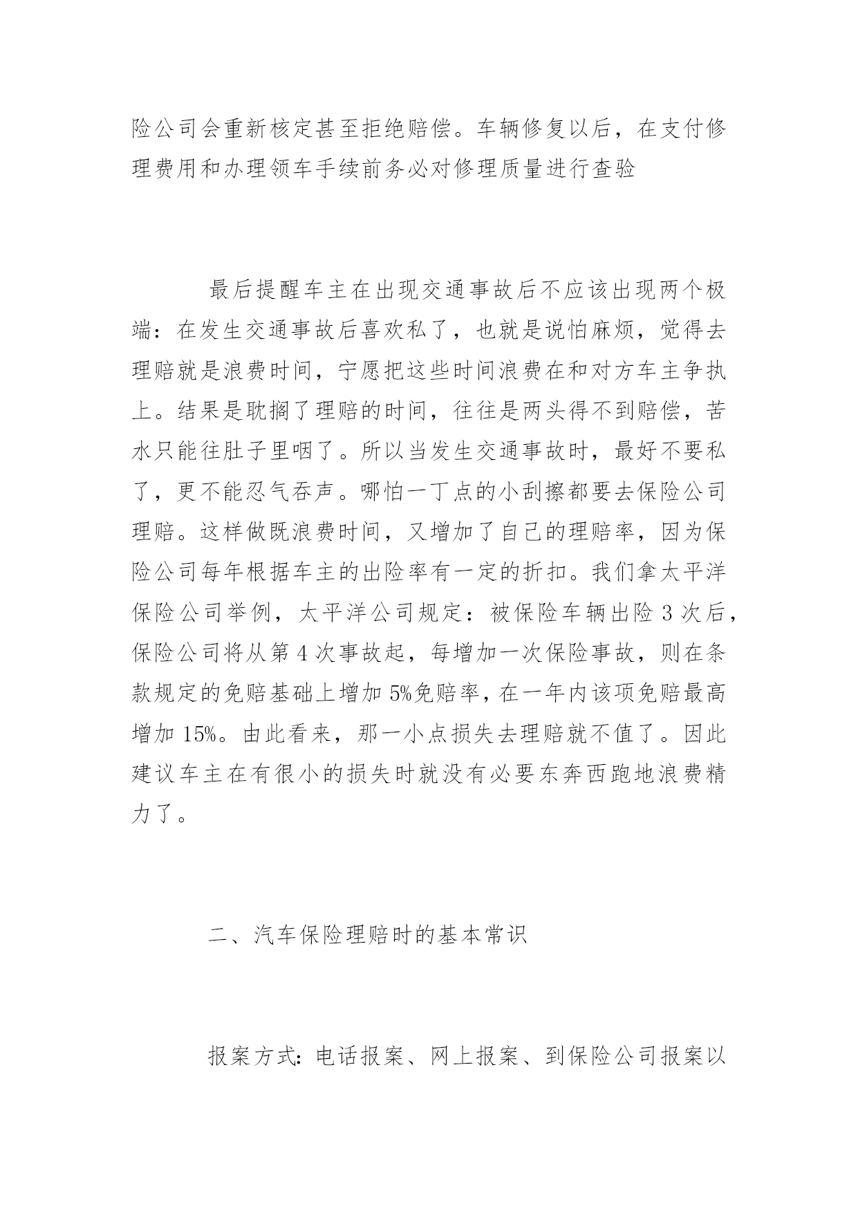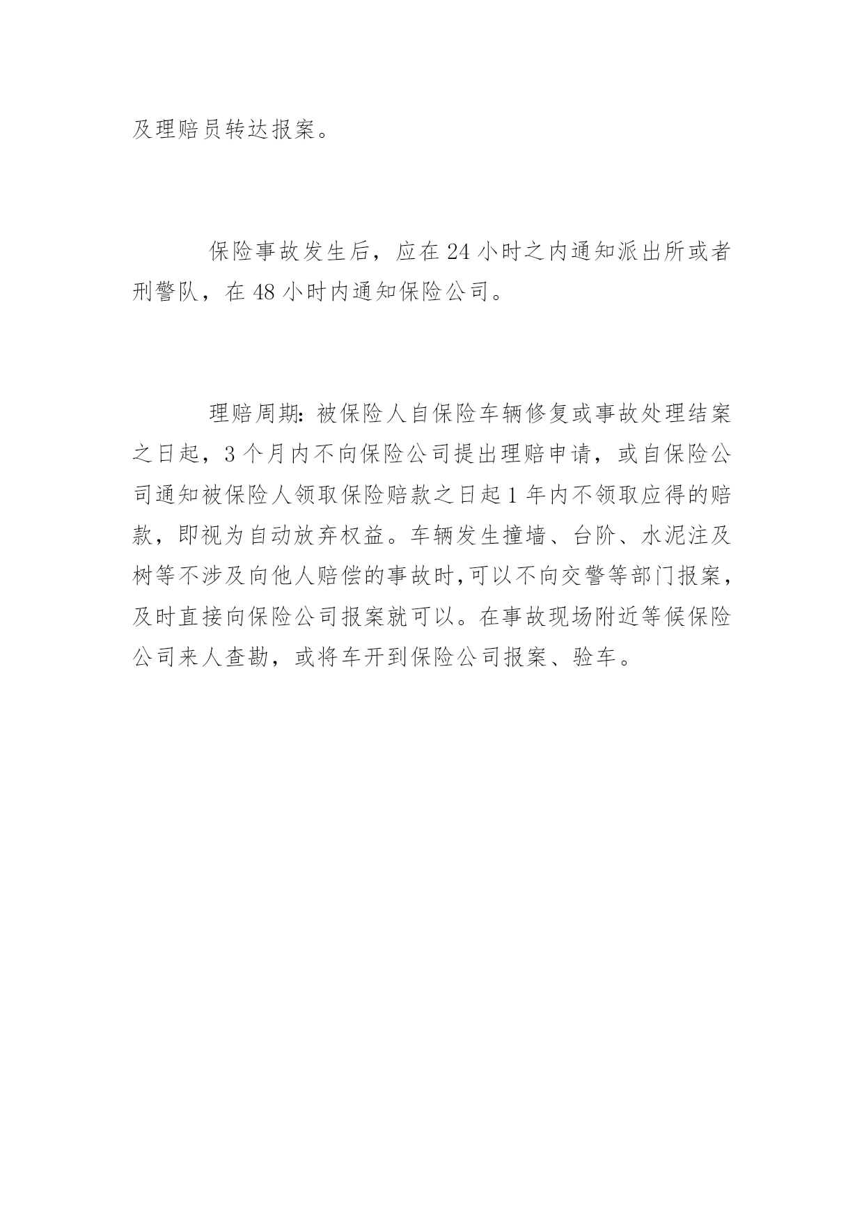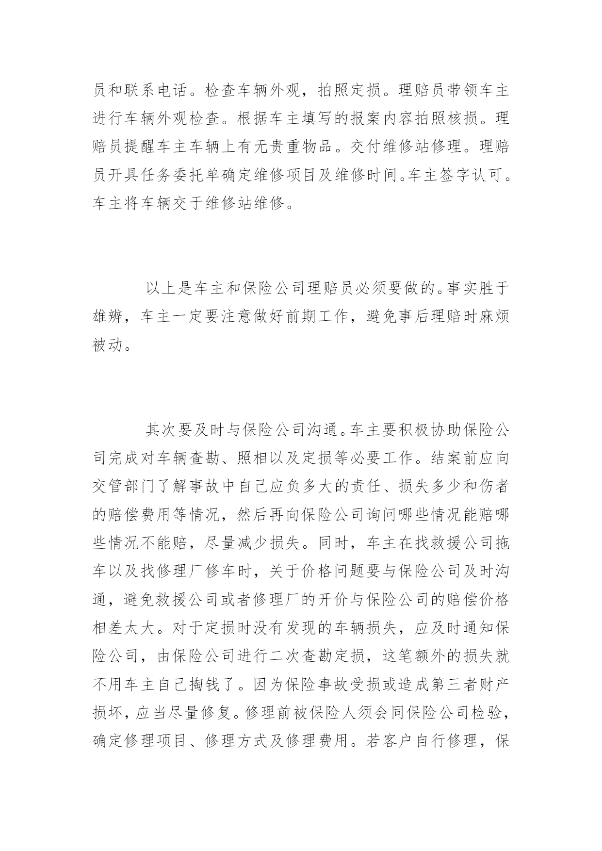 车辆保险申报流程有哪些车主要积极协助保险公司完成对车辆查勘、照相以及定损等必要工作。结案前应向交管部门了解事故中自己应负多大的责任、损失多少和伤者的赔偿费用等情况,然后再向保险公司询问哪些情况能赔哪些情况不能赔,尽量减少损失。下面是小编为大家分享车辆保险申报流程有哪些,欢迎大家阅读浏览。一、保险理赔的基本流程出现交通事故后首先要做的是及时报案。出了交通事故除了向交通管理部门报案外,还要及时向保险公司报案。一方面让保险公司知道投保人出了交通事故,另一方面也可以向保险公司咨询如何处理、保护现场,保险公司会教车友如何向对方索要事故证明等。车主在理赔时的`基本流程:出示保险单证。出示行驶证。出示驾驶证。出示被保险人身份证。出示保险单。填写出险报案表。详细填写出险经过。详细填写报案人、驾驶员和联系电话。检查车辆外观,拍照定损。理赔员带领车主进行车辆外观检查。根据车主填写的报案内容拍照核损。理赔员提醒车主车辆上有无贵重物品。交付维修站修理。理赔员开具任务委托单确定维修项目及维修时间。车主签字认可。车主将车辆交于维修站维修。以上是车主和保险公司理赔员必须要做的。事实胜于雄辨,车主一定要注意做好前期工作,避免事后理赔时麻烦被动。其次要及时与保险公司沟通。车主要积极协助保险公司完成对车辆查勘、照相以及定损等必要工作。结案前应向交管部门了解事故中自己应负多大的责任、损失多少和伤者的赔偿费用等情况,然后再向保险公司询问哪些情况能赔哪些情况不能赔,尽量减少损失。同时,车主在找救援公司拖车以及找修理厂修车时,关于价格问题要与保险公司及时沟通,避免救援公司或者修理厂的开价与保险公司的赔偿价格相差太大。对于定损时没有发现的车辆损失,应及时通知保险公司,由保险公司进行二次查勘定损,这笔额外的损失就不用车主自己掏钱了。因为保险事故受损或造成第三者财产损坏,应当尽量修复。修理前被保险人须会同保险公司检验,确定修理项目、修理方式及修理费用。若客户自行修理,保险公司会重新核定甚至拒绝赔偿。车辆修复以后,在支付修理费用和办理领车手续前务必对修理质量进行查验最后提醒车主在出现交通事故后不应该出现两个极端:在发生交通事故后喜欢私了,也就是说怕麻烦,觉得去理赔就是浪费时间,宁愿把这些时间浪费在和对方车主争执上。结果是耽搁了理赔的时间,往往是两头得不到赔偿,苦水只能往肚子里咽了。所以当发生交通事故时,最好不要私了,更不能忍气吞声。哪怕一丁点的小刮擦都要去保险公司理赔。这样做既浪费时间,又增加了自己的理赔率,因为保险公司每年根据车主的出险率有一定的折扣。我们拿太平洋保险公司举例,太平洋公司规定:被保险车辆出险3次后,保险公司将从第4次事故起,每增加一次保险事故,则在条款规定的免赔基础上增加5%免赔率,在一年内该项免赔最高增加15%。由此看来,那一小点损失去理赔就不值了。因此建议车主在有很小的损失时就没有必要东奔西跑地浪费精力了。二、汽车保险理赔时的基本常识报案方式:电话报案、网上报案、到保险公司报案以及理赔员转达报案。保险事故发生后,应在24小时之内通知派出所或者刑警队,在48小时内通知保险公司。理赔周期:被保险人自保险车辆修复或事故处理结案之日起,3个月内不向保险公司提出理赔申请,或自保险公司通知被保险人领取保险赔款之日起1年内不领取应得的赔款,即视为自动放弃权益。车辆发生撞墙、台阶、水泥注及树等不涉及向他人赔偿的事故时,可以不向交警等部门报案,及时直接向保险公司报案就可以。在事故现场附近等候保险公司来人查勘,或将车开到保险公司报案、验车。
