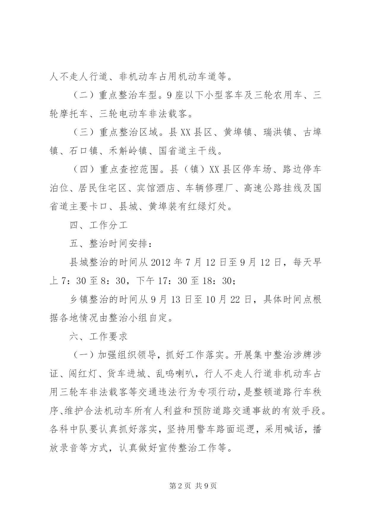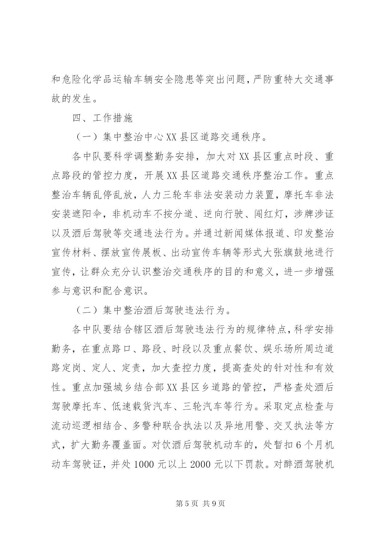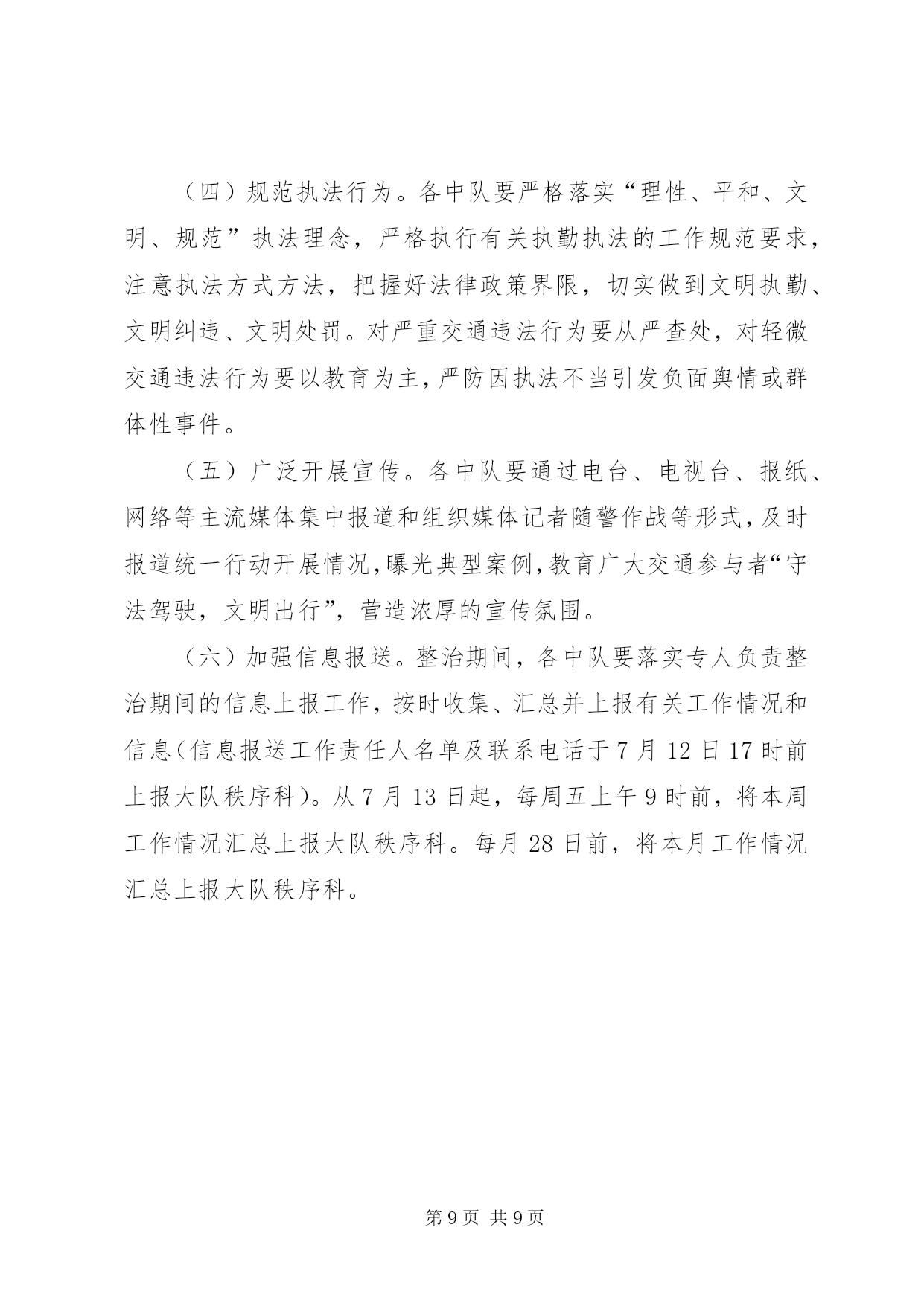 第PAGE\*Arabic\*MERGEFORMAT9页共NUMPAGES\*MERGEFORMAT9页交警大队交通整治方案2篇第一篇为进一步整顿道路行车秩序,消除道路交通安全隐患,营造和谐的道路交通环境,根据上级精神,结合我县实际,大队决定从2012年7月12日至10月22日,在全县范围内开展一百天的集中整治涉牌涉证、闯红灯、占道行驶、三轮车非法载客等交通违法行为百日行动,为确保此次行动取得实效,特制定本工作方案:一、工作目标通过此次百日行动,严格查处无牌无证、假牌套牌、遮挡号牌、报废机动车、闯红灯、占道行驶、三轮车非法载客等交通违法行为,有效遏制机动车涉牌涉证等交通违法行为的多发势头,力争短期内使我县XX县区及国省道主干线机动车涉牌涉证等交通违法率明显下降,切实保障广大人民群众的合法权益,有效预防道路交通事故的发生。二、组织领导为确保此次百日行动取得实效,大队决定成立交通违法整治领导小组,具体负责组织、协调工作。三、工作重点(一)重点整治内容。无牌无证、假牌套牌、遮挡号牌、报废机动车、闯红灯、货车进城、乱呜喇叭、三轮车非法载客、行人不走人行道、非机动车占用机动车道等。(二)重点整治车型。9座以下小型客车及三轮农用车、三轮摩托车、三轮电动车非法载客。(三)重点整治区域。县XX县区、黄埠镇、瑞洪镇、古埠镇、石口镇、禾斛岭镇、国省道主干线。(四)重点查控范围。县(镇)XX县区停车场、路边停车泊位、居民住宅区、宾馆酒店、车辆修理厂、高速公路挂线及国省道主要卡口、县城、黄埠装有红绿灯处。四、工作分工五、整治时间安排:县城整治的时间从2012年7月12日至9月12日,每天早上7:30至8:30,下午17:30至18:30;乡镇整治的时间从9月13日至10月22日,具体时间点根据各地情况由整治小组自定。六、工作要求(一)加强组织领导,抓好工作落实。开展集中整治涉牌涉证、闯红灯、货车进城、乱呜喇叭,行人不走人行道非机动车占用三轮车非法载客等交通违法行为专项行动,是整顿道路行车秩序、维护合法机动车所有人利益和预防道路交通事故的有效手段。各科中队要认真抓好落实,坚持用警车路面巡逻,采用喊话,播放录音等方式,认真做好宣传整治工作等。(二)强化协作配合,严查违法行为。各科中队要根据涉牌涉证交通违法车辆上路行驶及停放的规律和特点,科学安排勤务,要积极配合、协同作战,加大对重点区域、重点时段、重点路段和重点位置的检查力度,从严查处涉牌涉证、闯红灯、占道行驶、三轮车非法载客等交通违法行为。(三)坚持依法行政,规范文明执法。要规范执勤执法行为,避免引发交通堵塞和不必要的矛盾。对无牌无证、假牌套牌、遮挡号牌、报废机动车、闯红灯、占道行驶、三轮车非法载客等交通违法行为,要按照《道路交通安全法》的有关规定从严从重处罚。(四)加强宣传教育,营造浓厚氛围。要充分利用电视、广播、报纸等多种形式,大力宣传国家有关政策法律和法规,广泛宣传无牌无证、假牌套牌、遮挡号牌、报废机动车、闯红灯、占道行驶、三轮车非法载客交通违法行为的危害性及开展此次行动的必要性,不断提高广大人民群众的法律意识和交通安全意识,取得广大车主、驾驶人及社会各界的理解、支持和配合,自觉抵制和检举揭发此类交通违法行为,努力营造良好的社会舆论氛围。第二篇为进一步巩固深化“春雷行动”战果,再掀打击违法犯罪活动高潮,全面提升群众安全感和满意度,确保全市社会政治和治安大局持续平稳,结合省厅“夏季无声风暴行动”和市局夏季社会治安集中整治“骄阳行动”的工作要求,大队决定从现在起至2012年10月12日,组织开展为期100天的交通秩序集中整治“骄阳行动”,现制定行动方案如下:一、工作目标以党的十八大安全保卫工作为主线,以构建和谐平安上饶为目标,以集中开展“十大战役”为重点,力争破获一批大要案件、抓捕一批逃犯、消除一批安全隐患,全面提升公安机关维护稳定、打击犯罪和治安管理工作水平,全力确保不发生有重大影响的各类恶性案(事)件,努力为党的十八大胜利召开和建设“五个”创造一流的社会治安环境。二、组织领导为确保整治期间各项工作措施落到实处,大队成立全县交通秩序集中整治“骄阳行动”领导小组,大队决定成立交通违法整治领导小组,由县公安局党委委员、副政委、交警大队长朱明星任组长,交警大队副大队长高结才任常务副组长,大队班子其他副职任副组长,各科队负责人任成员,领导小组下设办公室,办公室设在秩序科,由秩序科科长叶忠圣任办公室主任,具体负责组织、协调工作。三、整治目标以平安畅通为目标,持之以恒地抓好中心XX县区道路交通秩序集中整治,大力整治酒后驾车、超员超载超速行驶以及客运和危险化学品运输车辆安全隐患等突出问题,严防重特大交通事故的发生。四、工作措施(一)集中整治中心XX县区道路交通秩序。各中队要科学调整勤务安