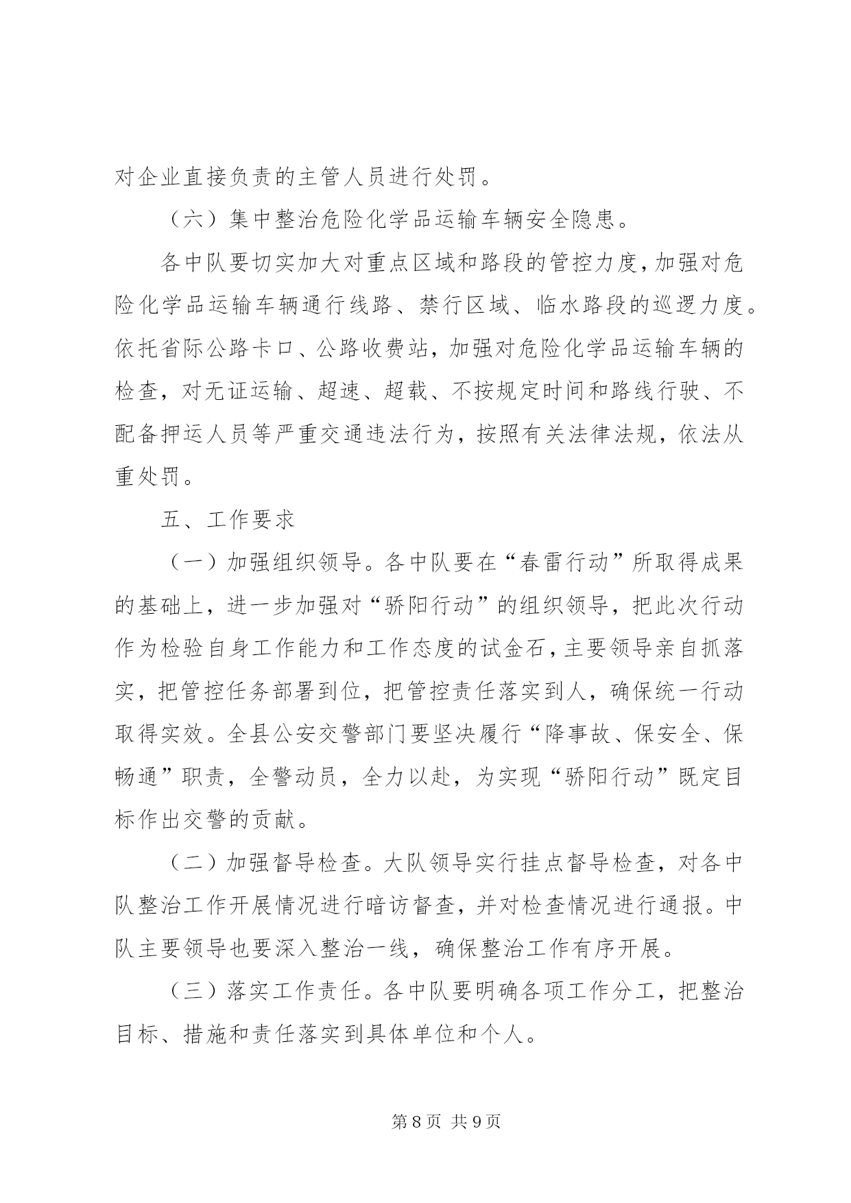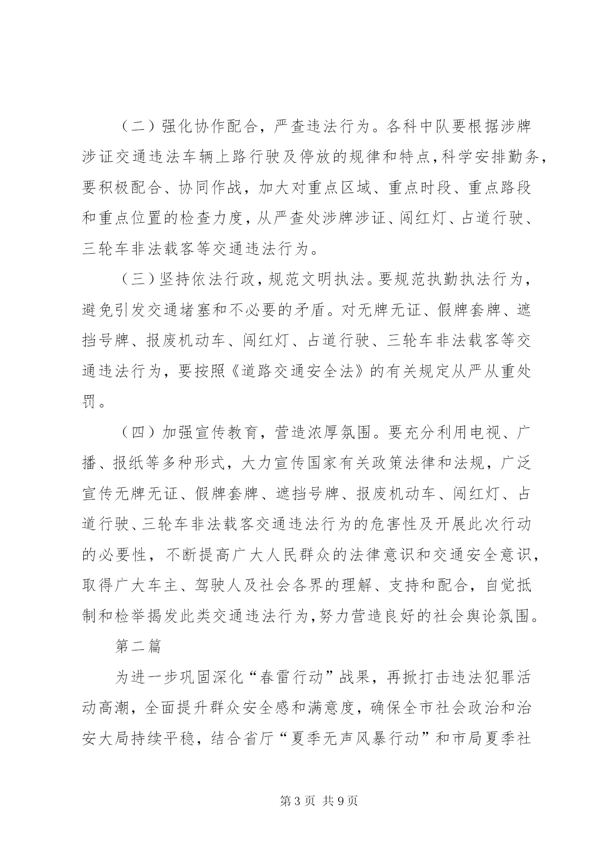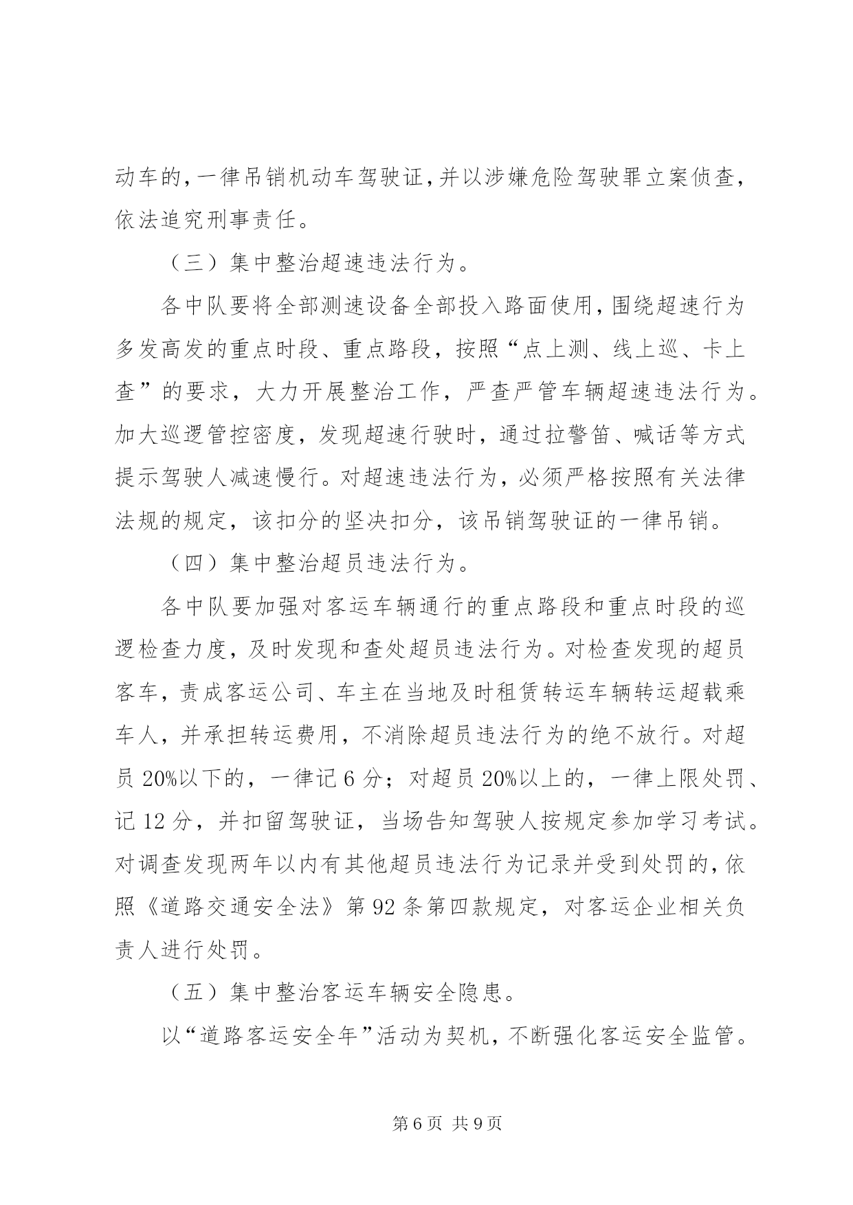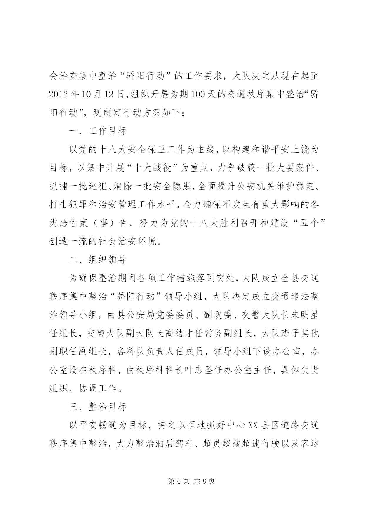 第PAGE\*Arabic\*MERGEFORMAT9页共NUMPAGES\*MERGEFORMAT9页交警大队交通整治方案2篇第一篇为进一步整顿道路行车秩序,消除道路交通安全隐患,营造和谐的道路交通环境,根据上级精神,结合我县实际,大队决定从2012年7月12日至10月22日,在全县范围内开展一百天的集中整治涉牌涉证、闯红灯、占道行驶、三轮车非法载客等交通违法行为百日行动,为确保此次行动取得实效,特制定本工作方案:一、工作目标通过此次百日行动,严格查处无牌无证、假牌套牌、遮挡号牌、报废机动车、闯红灯、占道行驶、三轮车非法载客等交通违法行为,有效遏制机动车涉牌涉证等交通违法行为的多发势头,力争短期内使我县XX县区及国省道主干线机动车涉牌涉证等交通违法率明显下降,切实保障广大人民群众的合法权益,有效预防道路交通事故的发生。二、组织领导为确保此次百日行动取得实效,大队决定成立交通违法整治领导小组,具体负责组织、协调工作。三、工作重点(一)重点整治内容。无牌无证、假牌套牌、遮挡号牌、报废机动车、闯红灯、货车进城、乱呜喇叭、三轮车非法载客、行人不走人行道、非机动车占用机动车道等。(二)重点整治车型。9座以下小型客车及三轮农用车、三轮摩托车、三轮电动车非法载客。(三)重点整治区域。县XX县区、黄埠镇、瑞洪镇、古埠镇、石口镇、禾斛岭镇、国省道主干线。(四)重点查控范围。县(镇)XX县区停车场、路边停车泊位、居民住宅区、宾馆酒店、车辆修理厂、高速公路挂线及国省道主要卡口、县城、黄埠装有红绿灯处。四、工作分工五、整治时间安排:县城整治的时间从2012年7月12日至9月12日,每天早上7:30至8:30,下午17:30至18:30;乡镇整治的时间从9月13日至10月22日,具体时间点根据各地情况由整治小组自定。六、工作要求(一)加强组织领导,抓好工作落实。开展集中整治涉牌涉证、闯红灯、货车进城、乱呜喇叭,行人不走人行道非机动车占用三轮车非法载客等交通违法行为专项行动,是整顿道路行车秩序、维护合法机动车所有人利益和预防道路交通事故的有效手段。各科中队要认真抓好落实,坚持用警车路面巡逻,采用喊话,播放录音等方式,认真做好宣传整治工作等。(二)强化协作配合,严查违法行为。各科中队要根据涉牌涉证交通违法车辆上路行驶及停放的规律和特点,科学安排勤务,要积极配合、协同作战,加大对重点区域、重点时段、重点路段和重点位置的检查力度,从严查处涉牌涉证、闯红灯、占道行驶、三轮车非法载客等交通违法行为。(三)坚持依法行政,规范文明执法。要规范执勤执法行为,避免引发交通堵塞和不必要的矛盾。对无牌无证、假牌套牌、遮挡号牌、报废机动车、闯红灯、占道行驶、三轮车非法载客等交通违法行为,要按照《道路交通安全法》的有关规定从严从重处罚。(四)加强宣传教育,营造浓厚氛围。要充分利用电视、广播、报纸等多种形式,大力宣传国家有关政策法律和法规,广泛宣传无牌无证、假牌套牌、遮挡号牌、报废机动车、闯红灯、占道行驶、三轮车非法载客交通违法行为的危害性及开展此次行动的必要性,不断提高广大人民群众的法律意识和交通安全意识,取得广大车主、驾驶人及社会各界的理解、支持和配合,自觉抵制和检举揭发此类交通违法行为,努力营造良好的社会舆论氛围。第二篇为进一步巩固深化“春雷行动”战果,再掀打击违法犯罪活动高潮,全面提升群众安全感和满意度,确保全市社会政治和治安大局持续平稳,结合省厅“夏季无声风暴行动”和市局夏季社会治安集中整治“骄阳行动”的工作要求,大队决定从现在起至2012年10月12日,组织开展为期100天的交通秩序集中整治“骄阳行动”,现制定行动方案如下:一、工作目标以党的十八大安全保卫工作为主线,以构建和谐平安上饶为目标,以集中开展“十大战役”为重点,力争破获一批大要案件、抓捕一批逃犯、消除一批安全隐患,全面提升公安机关维护稳定、打击犯罪和治安管理工作水平,全力确保不发生有重大影响的各类恶性案(事)件,努力为党的十八大胜利召开和建设“五个”创造一流的社会治安环境。二、组织领导为确保整治期间各项工作措施落到实处,大队成立全县交通秩序集中整治“骄阳行动”领导小组,大队决定成立交通违法整治领导小组,由县公安局党委委员、副政委、交警大队长朱明星任组长,交警大队副大队长高结才任常务副组长,大队班子其他副职任副组长,各科队负责人任成员,领导小组下设办公室,办公室设在秩序科,由秩序科科长叶忠圣任办公室主任,具体负责组织、协调工作。三、整治目标以平安畅通为目标,持之以恒地抓好中心XX县区道路交通秩序集中整治,大力整治酒后驾车、超员超载超速行驶以及客运和危险化学品运输车辆安全隐患等突出问题,严防重特大交通事故的发生。四、工作措施(一)集中整治中心XX县区道路交通秩序。各中队要科学调整勤务安