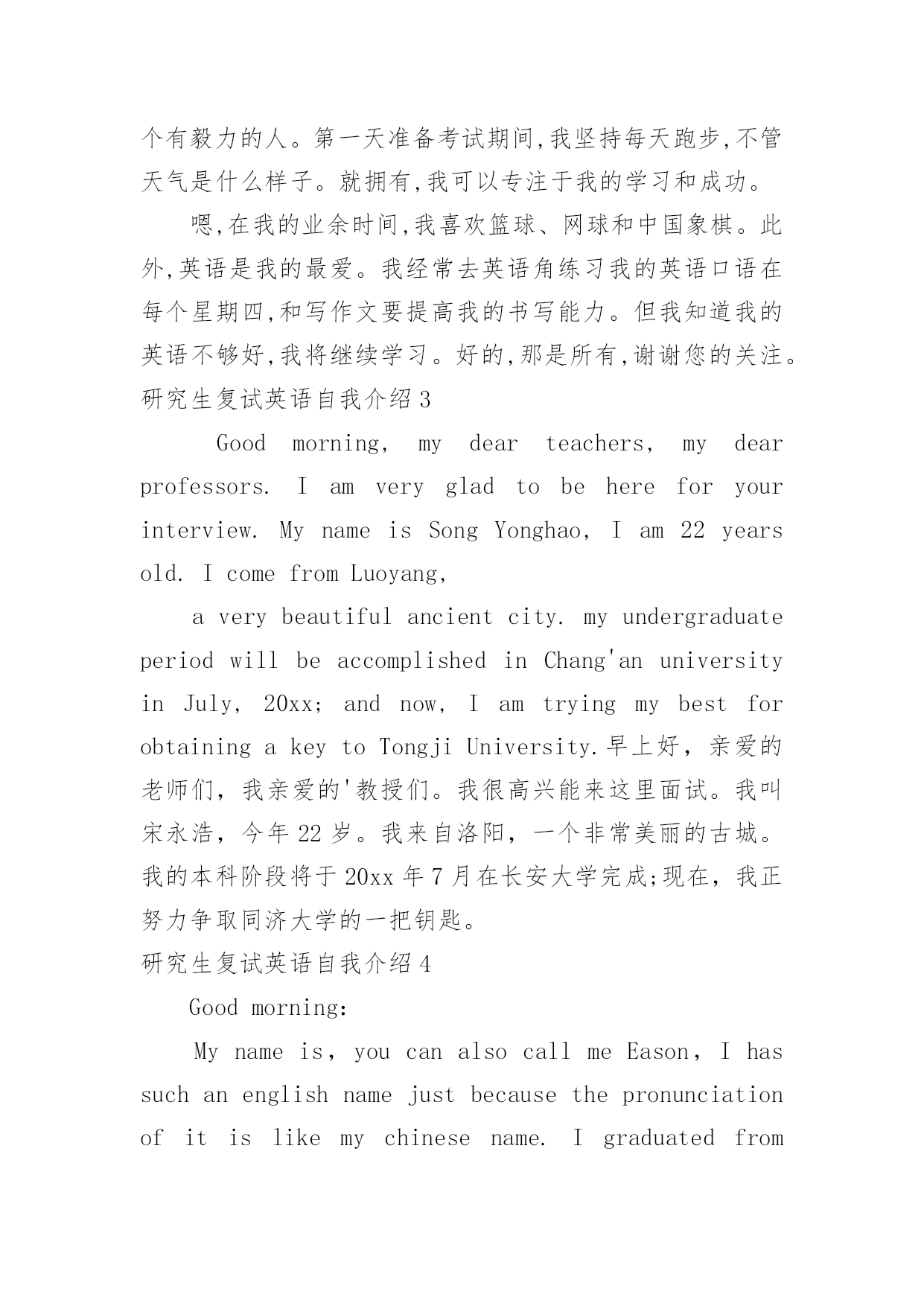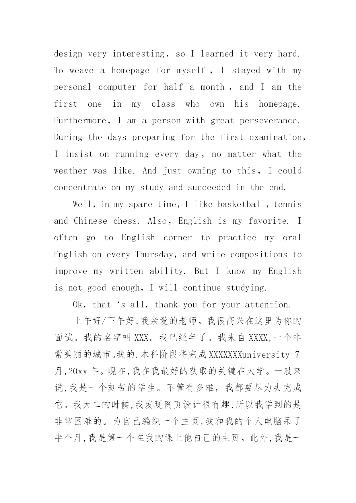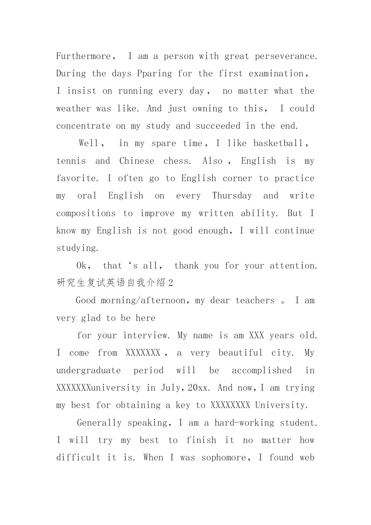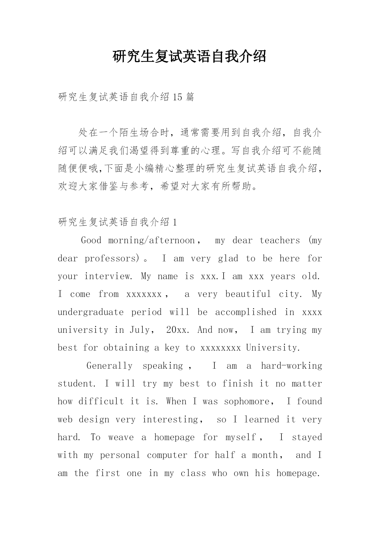 研究生复试英语自我介绍研究生复试英语自我介绍15篇处在一个陌生场合时,通常需要用到自我介绍,自我介绍可以满足我们渴望得到尊重的心理。写自我介绍可不能随随便便哦,下面是小编精心整理的研究生复试英语自我介绍,欢迎大家借鉴与参考,希望对大家有所帮助。研究生复试英语自我介绍1Goodmorning/afternoon,mydearteachers(mydearprofessors)。Iamverygladtobehereforyourinterview.Mynameisxxx.Iamxxxyearsold.Icomefromxxxxxxx,averybeautifulcity.MyundergraduateperiodwillbeaccomplishedinxxxxuniversityinJuly,20xx.Andnow,IamtryingmybestforobtainingakeytoxxxxxxxxUniversity.Generallyspeaking,Iamahard-workingstudent.Iwilltrymybesttofinishitnomatterhowdifficultitis.WhenIwassophomore,Ifoundwebdesignveryinteresting,soIlearneditveryhard.Toweaveahomepageformyself,Istayedwithmypersonalcomputerforhalfamonth,andIamthefirstoneinmyclasswhoownhishomepage.Furthermore,Iamapersonwithgreatperseverance.DuringthedaysPparingforthefirstexamination,Iinsistonrunningeveryday,nomatterwhattheweatherwaslike.Andjustowningtothis,Icouldconcentrateonmystudyandsucceededintheend.Well,inmysparetime,Ilikebasketball,tennisandChinesechess.Also,Englishismyfavorite.IoftengotoEnglishcornertopracticemyoralEnglishoneveryThursdayandwritecompositionstoimprovemywrittenability.ButIknowmyEnglishisnotgoodenough,Iwillcontinuestudying.Ok,that‘sall,thankyouforyourattention.研究生复试英语自我介绍2Goodmorning/afternoon,mydearteachers。Iamverygladtobehereforyourinterview.MynameisamXXXyearsold.IcomefromXXXXXXX,averybeautifulcity.MyundergraduateperiodwillbeaccomplishedinXXXXXXXuniversityinJuly,20xx.Andnow,IamtryingmybestforobtainingakeytoXXXXXXXXUniversity.Generallyspeaking,Iamahard-workingstudent.Iwilltrymybesttofinishitnomatterhowdifficultitis.WhenIwassophomore,Ifoundwebdesignveryinteresting,soIlearneditveryhard.Toweaveahomepageformyself,Istayedwithmypersonalcomputerforhalfamonth,andIamthefirstoneinmyclasswhoownhishomepage.Furthermore,Iamapersonwithgreatperseverance.Duringthedayspreparingforthefirstexamination,Iinsistonrunningeveryday,nomatterwhattheweatherwaslike.Andjustowningtothis,Icouldconcentrateonmystudyandsucceededintheend.Well,inmysparetime,Ilikebasketball,tennisandChinesechess.Also,