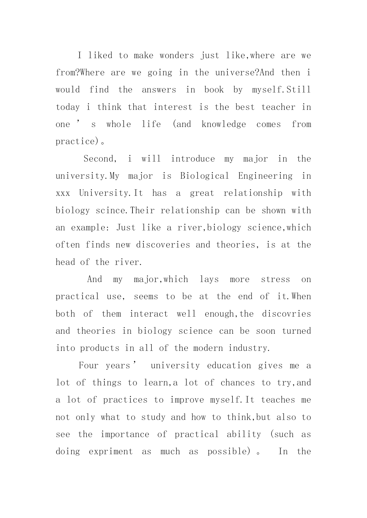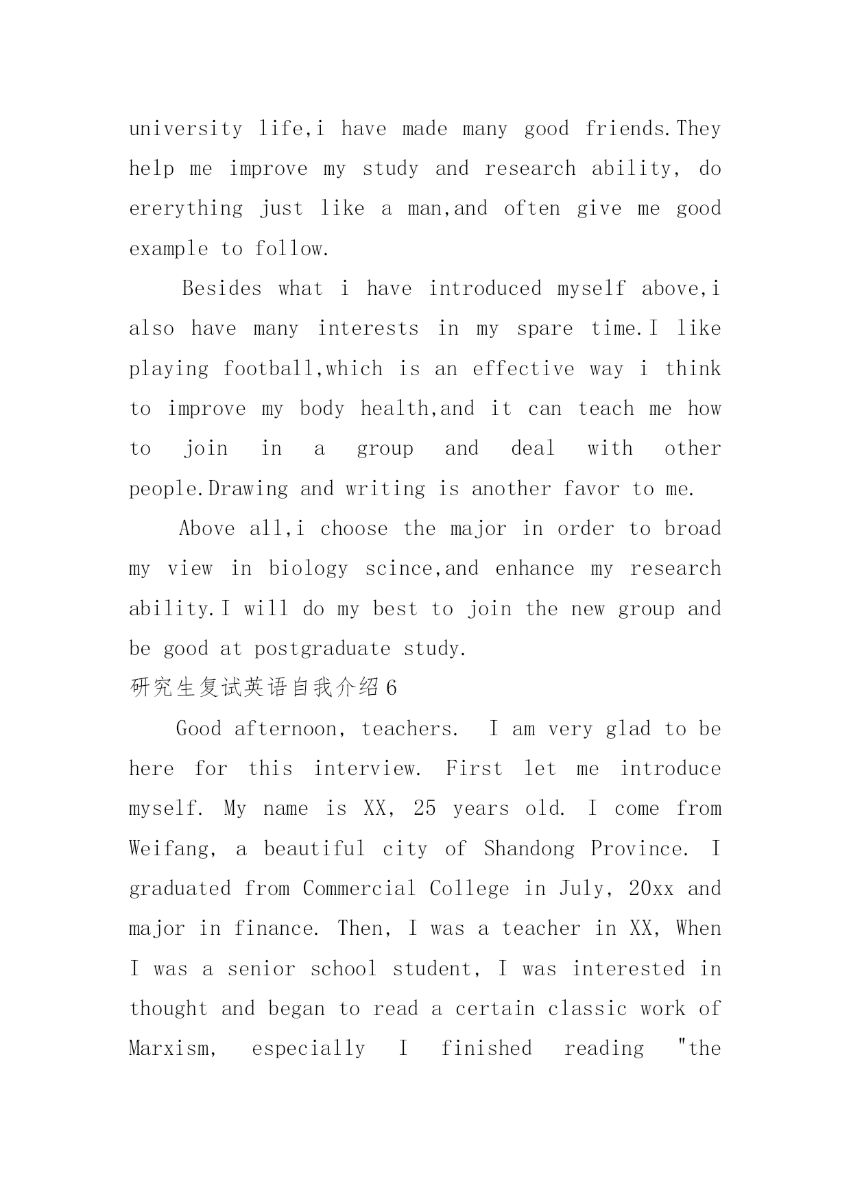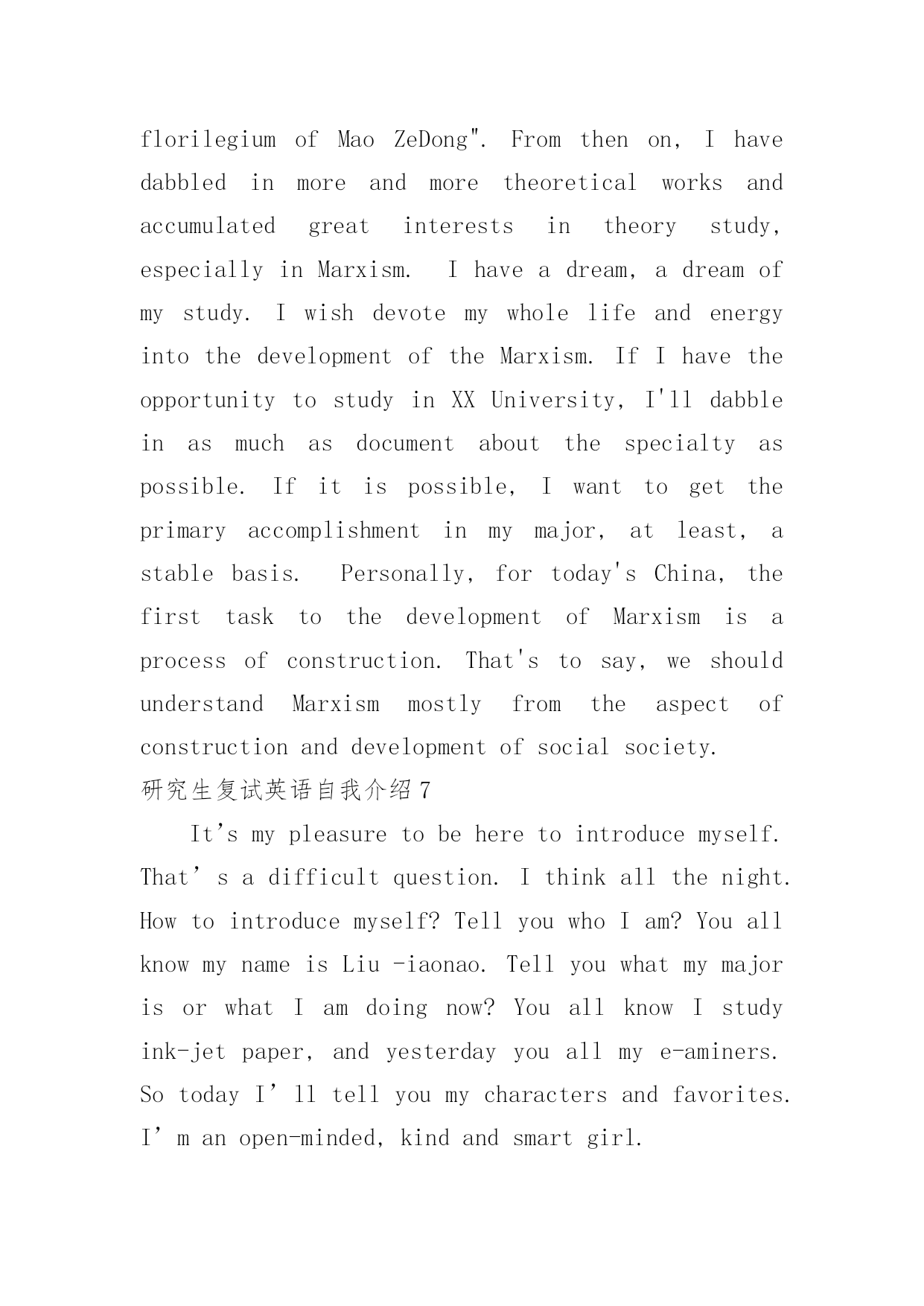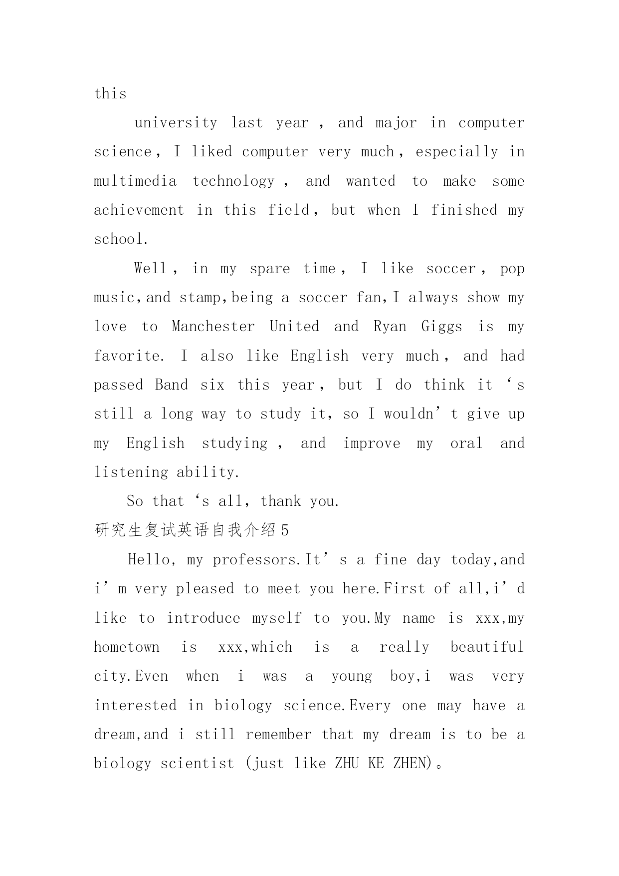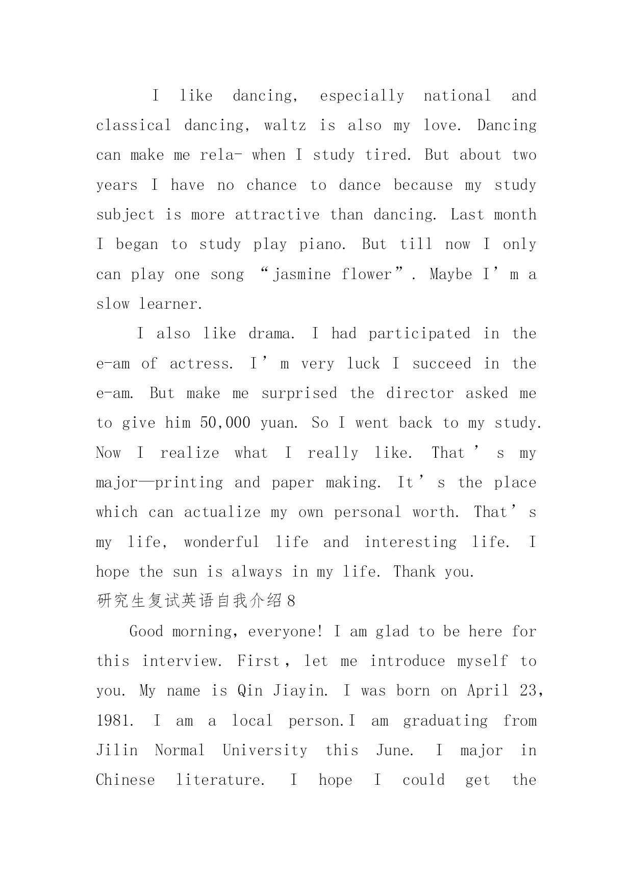研究生复试英语自我介绍研究生复试英语自我介绍15篇处在一个陌生场合时,通常需要用到自我介绍,自我介绍可以满足我们渴望得到尊重的心理。写自我介绍可不能随随便便哦,下面是小编精心整理的研究生复试英语自我介绍,欢迎大家借鉴与参考,希望对大家有所帮助。研究生复试英语自我介绍1Goodmorning/afternoon,mydearteachers(mydearprofessors)。Iamverygladtobehereforyourinterview.Mynameisxxx.Iamxxxyearsold.Icomefromxxxxxxx,averybeautifulcity.MyundergraduateperiodwillbeaccomplishedinxxxxuniversityinJuly,20xx.Andnow,IamtryingmybestforobtainingakeytoxxxxxxxxUniversity.Generallyspeaking,Iamahard-workingstudent.Iwilltrymybesttofinishitnomatterhowdifficultitis.WhenIwassophomore,Ifoundwebdesignveryinteresting,soIlearneditveryhard.Toweaveahomepageformyself,Istayedwithmypersonalcomputerforhalfamonth,andIamthefirstoneinmyclasswhoownhishomepage.Furthermore,Iamapersonwithgreatperseverance.DuringthedaysPparingforthefirstexamination,Iinsistonrunningeveryday,nomatterwhattheweatherwaslike.Andjustowningtothis,Icouldconcentrateonmystudyandsucceededintheend.Well,inmysparetime,Ilikebasketball,tennisandChinesechess.Also,Englishismyfavorite.IoftengotoEnglishcornertopracticemyoralEnglishoneveryThursdayandwritecompositionstoimprovemywrittenability.ButIknowmyEnglishisnotgoodenough,Iwillcontinuestudying.Ok,that‘sall,thankyouforyourattention.研究生复试英语自我介绍2Goodmorning/afternoon,mydearteachers。Iamverygladtobehereforyourinterview.MynameisamXXXyearsold.IcomefromXXXXXXX,averybeautifulcity.MyundergraduateperiodwillbeaccomplishedinXXXXXXXuniversityinJuly,20xx.Andnow,IamtryingmybestforobtainingakeytoXXXXXXXXUniversity.Generallyspeaking,Iamahard-workingstudent.Iwilltrymybesttofinishitnomatterhowdifficultitis.WhenIwassophomore,Ifoundwebdesignveryinteresting,soIlearneditveryhard.Toweaveahomepageformyself,Istayedwithmypersonalcomputerforhalfamonth,andIamthefirstoneinmyclasswhoownhishomepage.Furthermore,Iamapersonwithgreatperseverance.Duringthedayspreparingforthefirstexamination,Iinsistonrunningeveryday,nomatterwhattheweatherwaslike.Andjustowningtothis,Icouldconcentrateonmystudyandsucceededintheend.Well,inmysparetime,Ilikebasketball,tennisandChinesechess.Also,