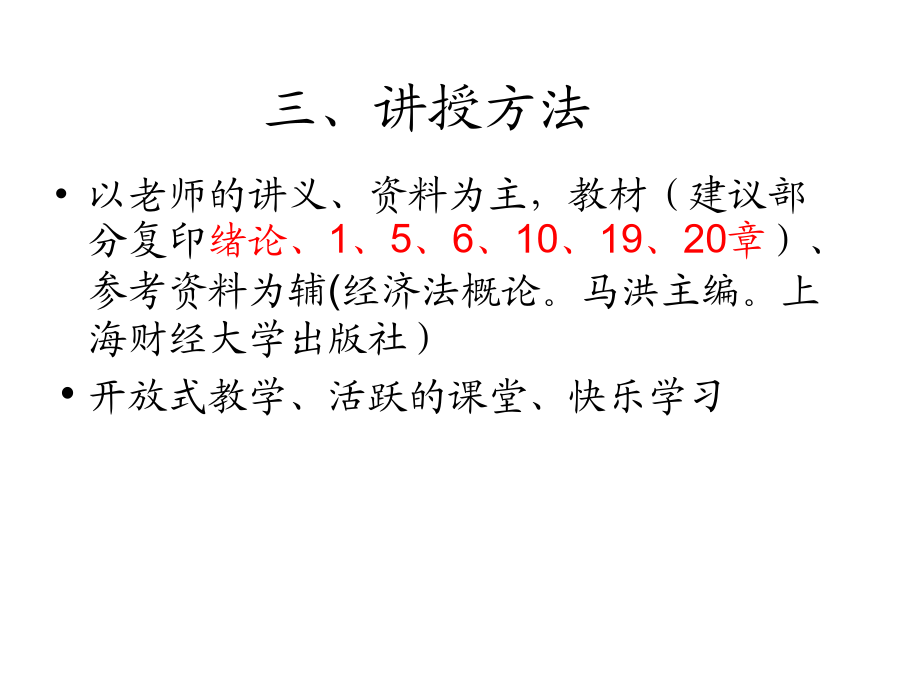 经济法一、课程的重要性和学习目的、要求二、课程的主要内容及课时分配绪2必须的经济法基础6必须的(打基础)个人独资企业法2实用的、合伙企业法2实用的、公司法11实用的、难把握的合同法9实用的、难把握的担保法0实用的、难把握的证券法0实用的、难把握的复习0三、讲授方法四、学习方法考试问题说明1、看案例:财判-折戟的创投梦2、纵横统一论和国家干预论的区别与联系.(见书P11-选做)3、我国经济法学界争论的第一焦点问题是什么?4、分学习小组第一章经济法基础(见书P11第9排)经济法的概念1、经济法调整的经济关系发生在国家与市场主体之间,即国家对市场主体的建立、存续和活动进行组织、管理和监督过程中发生的经济关系市场主体:参与市场经济的企业或个人国家对市场主体管理的法律国家对市场主体活动管理的法律2、经济法调整的经济关系发生在国家与整个市场之间,即国家运用计划、产业政策、财政、信贷、税收和物价等手段对整个市场关系进行宏观调控过程中发生的经济关系宏观调控?国家对宏观经济管理的法律房地产宏观调控政策中国人民银行决定从2004年10月29日起上调金融机构存贷款基准利率(加息)2005年3月17日房贷优惠政策取消,调控涉及消费层面。央行决定从即日起调整商业银行自营性个人住房贷款政策。宣布取消住房贷款优惠利率;对房地产价格上涨过快的城市或地区,个人住房贷款最低首付款比例可由现行的20%提高到30%。央行此举表明,中央政府对房地产的政策调控力度进一步加大。自2005年6月1日起,对个人购买住房不足2年转手交易的,销售时按其取得的售房收入全额征收营业税;2006年4月28日,央行全面上调各档次贷款利率,再次加息。2006年6月1日后,个人将购买不足5年的住房对外销售全额征收营业税2007年不但延续了前几年的政策取向,而且在力度上明显加大。资金方面:一年内6次上调银行基准利率、10次上调存款准备金率、提高第二套房的首付和利率;土地方面:强调节约集约用地、控制大套型商品房、“招拍挂”出让土地的方式作了重要修改、开展以查处“以租代征”为重点的土地执法百日行动。然而,最大的亮点还是住宅市场由“重建设”转为“重保障”标志着本轮调控思路的根本性转变。国务院24号文明确规定廉租房为住房保障的重点,经济适用房实行有限产权;各级政府分别对保障房的建设数量、时间进度、覆盖对象进行了具体的量化安排。2007年,楼市正在逐步过渡到一个新的运行期。经济法是调整上述经济关系的所有法律规范的总称经济法的调整对象是什么?P20第二节经济法律关系的概念经济法律关系作为法律关系的一种,是指经济法所确认的,在国家对市场活动进行组织、管理、监督和调控过程中,当事人之间所形成的具有权利、义务内容的经济关系.经济法律关系是一种权利、义务关系,即在主体相互的关系中,谁可以做什么,谁不可以做什么.由法律规定或当事人约定。当事人必须按法律规定或当事人约定行事。经济法律关系是一种由法律规定或当事人约定形成的权利、义务关系经济法律关系的特征(P21)第三节经济法律关系的主体二、主体的概念三、主体的分类因分工和职能的不同分为:(二)市场主体1.自然人2.法人:具有民事权利能力和民事行为能力,依法独立享有民事权利和承担民事义务的组织。法人承担有限责任,即投资人以其投资额为限承担对外债务。3.其他经济组织(非法人经济实体):不具备法人资格的经济组织,可以对外独立经营,不能独立对外承担民事责任,而必须承担无限责任或连带责任.投资人的财产不足以清偿债务时,要与其他有法律关系的主体共同清偿债务。数人共负同一债务而对债权人各负全部清偿责任。即:债权人可以对债务人中的一人或数人或全体同时或先后请求全部清偿,债务人中的一人清偿全部债务时,其他债务人也免除责任;在连带责任中,一人清偿全部债务时,有向其他债务人请求偿还各自应分担部分的权利。(追偿)组织形式责任形式第四节经济法律关系的内容三、经济义务第五节经济法律关系的客体二、客体的分类(一)物动产:可以移动位置而不改变其性质、形状和效用的物。(机器、汽车)不动产:土地、建筑物法律意义:动产转移所有权时只须交付就可实现,而不动产和特殊动产所有权的转移必须到一定的国家机关进行登记。可以替代的物。例如:同种类、型号的钢材、水泥流通物:(二)货币和有价证券能产生经济价值的脑力劳动成果.如:专利权(四)行为第六节经济法律关系的产生、变更和终止二、法律事实2、分类主体:发包方和承包方客体:货币、修建行为、房屋内容:权利义务法律事实:签订合同的行为第七节经济法的特征(P34)我国的法规体系中华人民共和国建筑法建筑安装工程承包合同条例工程建设监理单位资质管理试行办法重庆市