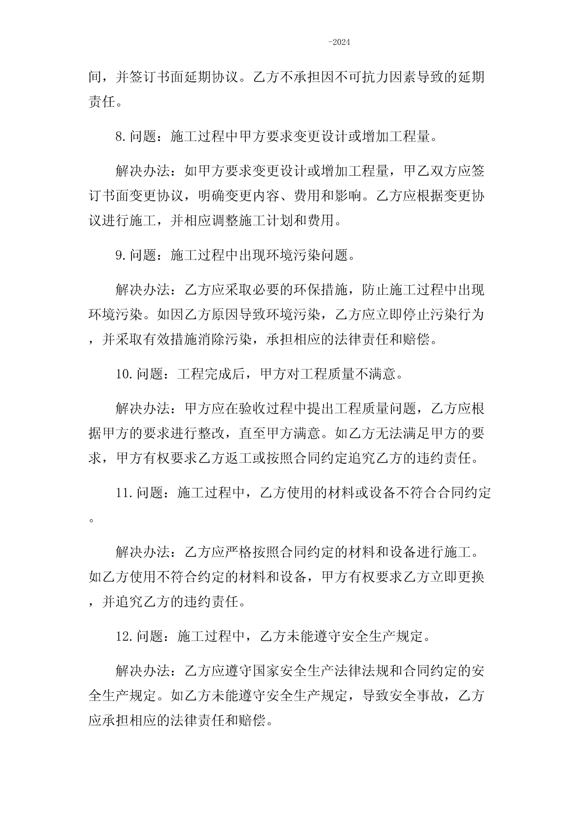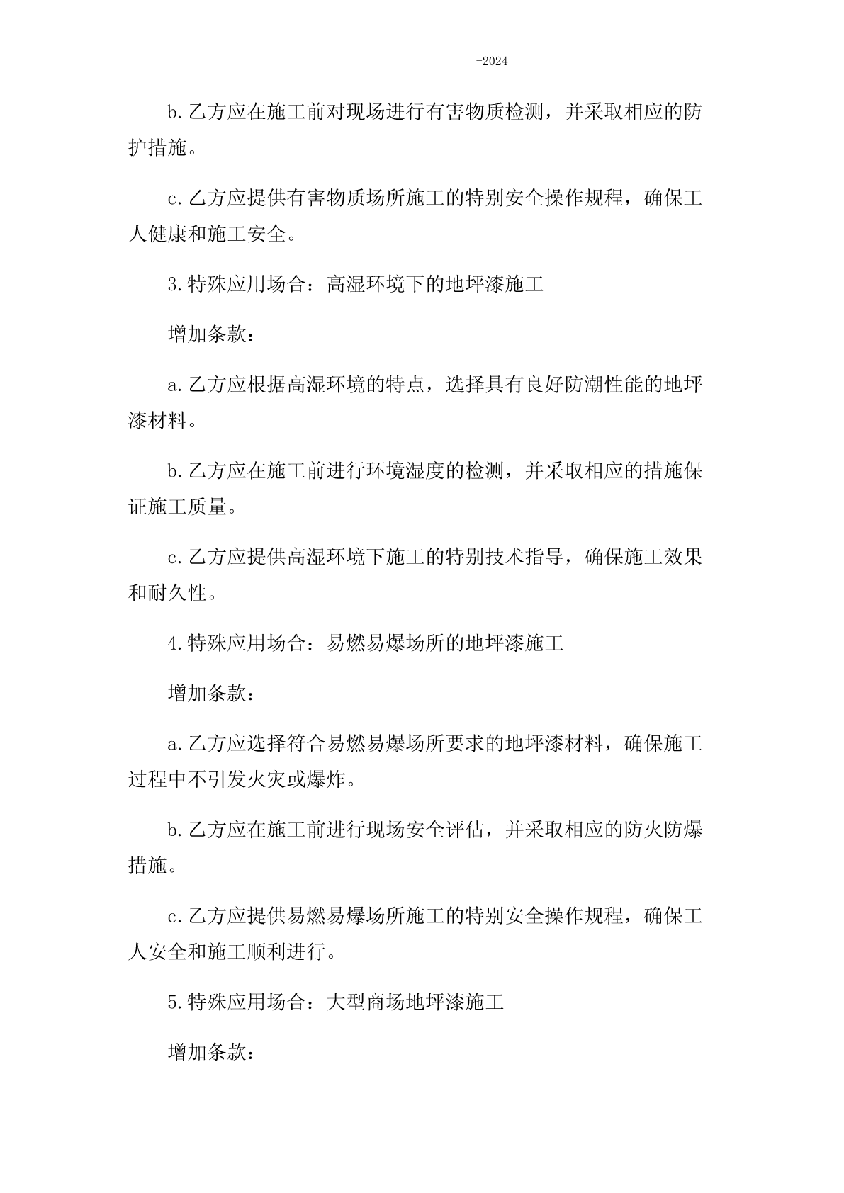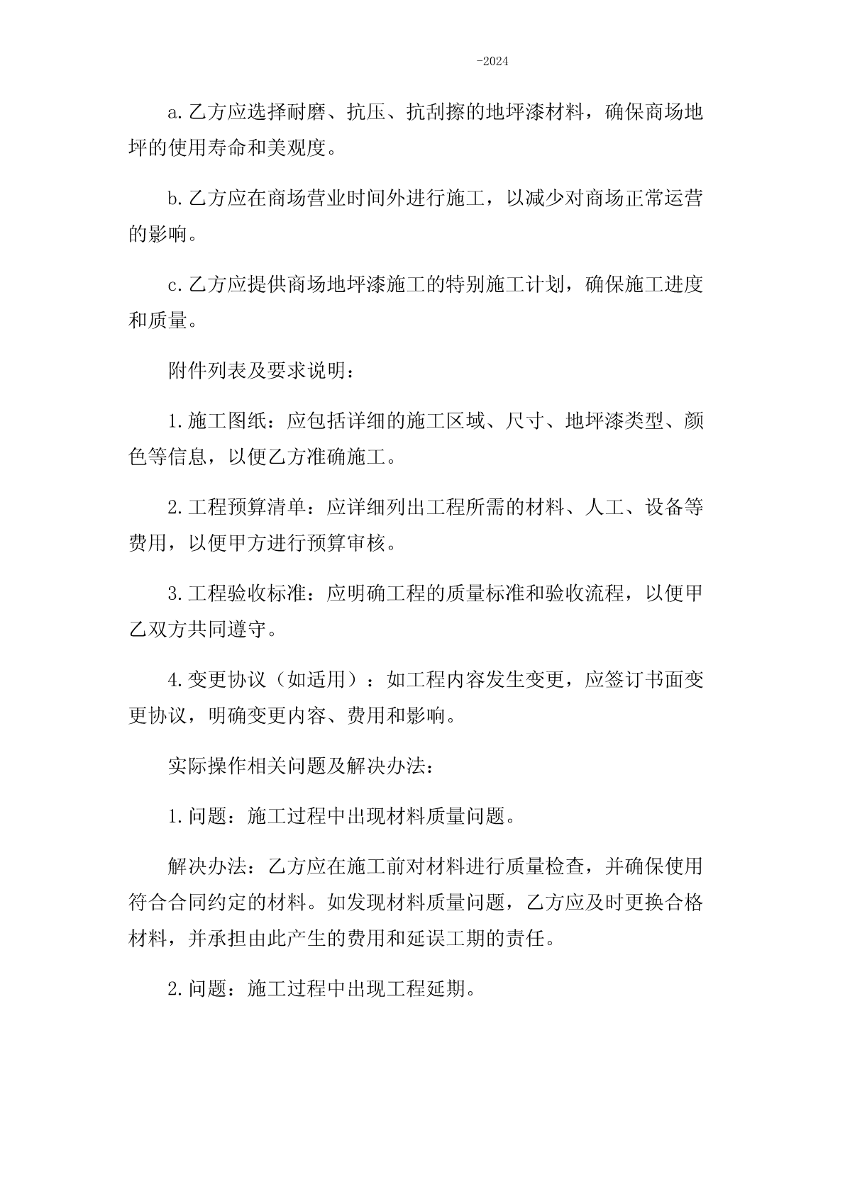 -2024合同编号:_______地坪漆施工合同甲方(委托方):__________乙方(承包方):__________签订日期:__________一、工程概况1.1工程名称:__________1.2工程地点:__________1.3工程内容:__________1.4工程面积:__________二、工程期限2.1工程期限为______天,自______年______月______日起至______年______月______日止。三、工程费用3.1工程总费用为人民币(大写):_______元整(小写):¥_______元。四、支付方式4.1工程开工前,甲方支付乙方合同总金额的_____%,即人民币(大写):_______元整(小写):¥_______元。4.2工程验收合格后,甲方支付乙方剩余的合同总金额的_____%,即人民币(大写):_______元整(小写):¥_______元。-2024五、工程质量和验收5.1乙方应按照甲方的要求和施工图纸进行施工,确保工程质量符合国家相关标准和规定。5.2工程完成后,乙方应向甲方提交完整的施工记录和验收报告。5.3甲方应在收到验收报告后的______天内进行验收,并将验收结果通知乙方。六、工程变更和违约责任6.1在工程进行过程中,如需对工程内容进行变更,甲乙双方应协商一致,并签订书面变更协议。6.2如乙方未能按照合同约定的期限和质量完成工程,应向甲方支付违约金,违约金的数额为合同总金额的_____%。七、争议解决7.1本合同的签订、履行、解释及争议解决均适用法律。7.2双方在履行本合同过程中发生的争议,应通过友好协商解决;如协商不成,任何一方均有权将争议提交至有管辖权的人民法院解决。八、其他条款8.1本合同一式两份,甲乙双方各执一份。8.2本合同自双方签字(或盖章)之日起生效。甲方(委托方):__________乙方(承包方):__________-2024签订日期:__________附件:1.施工图纸2.工程预算清单3.工程验收标准4.变更协议(如适用)=====本合同更广泛的场景,特设场景及条款=====特殊应用场合及增加条款:1.特殊应用场合:高温环境下的地坪漆施工增加条款:a.乙方应根据高温环境的特点,选择耐高温的地坪漆材料,并确保施工过程中的材料性能不受影响。b.乙方应在施工前进行环境温度的检测,并采取相应的措施保证施工质量。c.乙方应提供高温环境下施工的特别安全措施,确保工人安全和施工顺利进行。2.特殊应用场合:有害物质场所的地坪漆施工增加条款:a.乙方应选择符合国家环保要求的地坪漆材料,确保施工过程中不释放有害物质。-2024b.乙方应在施工前对现场进行有害物质检测,并采取相应的防护措施。c.乙方应提供有害物质场所施工的特别安全操作规程,确保工人健康和施工安全。3.特殊应用场合:高湿环境下的地坪漆施工增加条款:a.乙方应根据高湿环境的特点,选择具有良好防潮性能的地坪漆材料。b.乙方应在施工前进行环境湿度的检测,并采取相应的措施保证施工质量。c.乙方应提供高湿环境下施工的特别技术指导,确保施工效果和耐久性。4.特殊应用场合:易燃易爆场所的地坪漆施工增加条款:a.乙方应选择符合易燃易爆场所要求的地坪漆材料,确保施工过程中不引发火灾或爆炸。b.乙方应在施工前进行现场安全评估,并采取相应的防火防爆措施。c.乙方应提供易燃易爆场所施工的特别安全操作规程,确保工人安全和施工顺利进行。5.特殊应用场合:大型商场地坪漆施工增加条款:-2024a.乙方应选择耐磨、抗压、抗刮擦的地坪漆材料,确保商场地坪的使用寿命和美观度。b.乙方应在商场营业时间外进行施工,以减少对商场正常运营的影响。c.乙方应提供商场地坪漆施工的特别施工计划,确保施工进度和质量。附件列表及要求说明:1.施工图纸:应包括详细的施工区域、尺寸、地坪漆类型、颜色等信息,以便乙方准确施工。2.工程预算清单:应详细列出工程所需的材料、人工、设备等费用,以便甲方进行预算审核。3.工程验收标准:应明确工程的质量标准和验收流程,以便甲乙双方共同遵守。4.变更协议(如适用):如工程内容发生变更,应签订书面变更协议,明确变更内容、费用和影响。实际操作相关问题及解决办法:1.问题:施工过程中出现材料质量问题。解决办法:乙方应在施工前对材料进行质量检查,并确保使用符合合同约