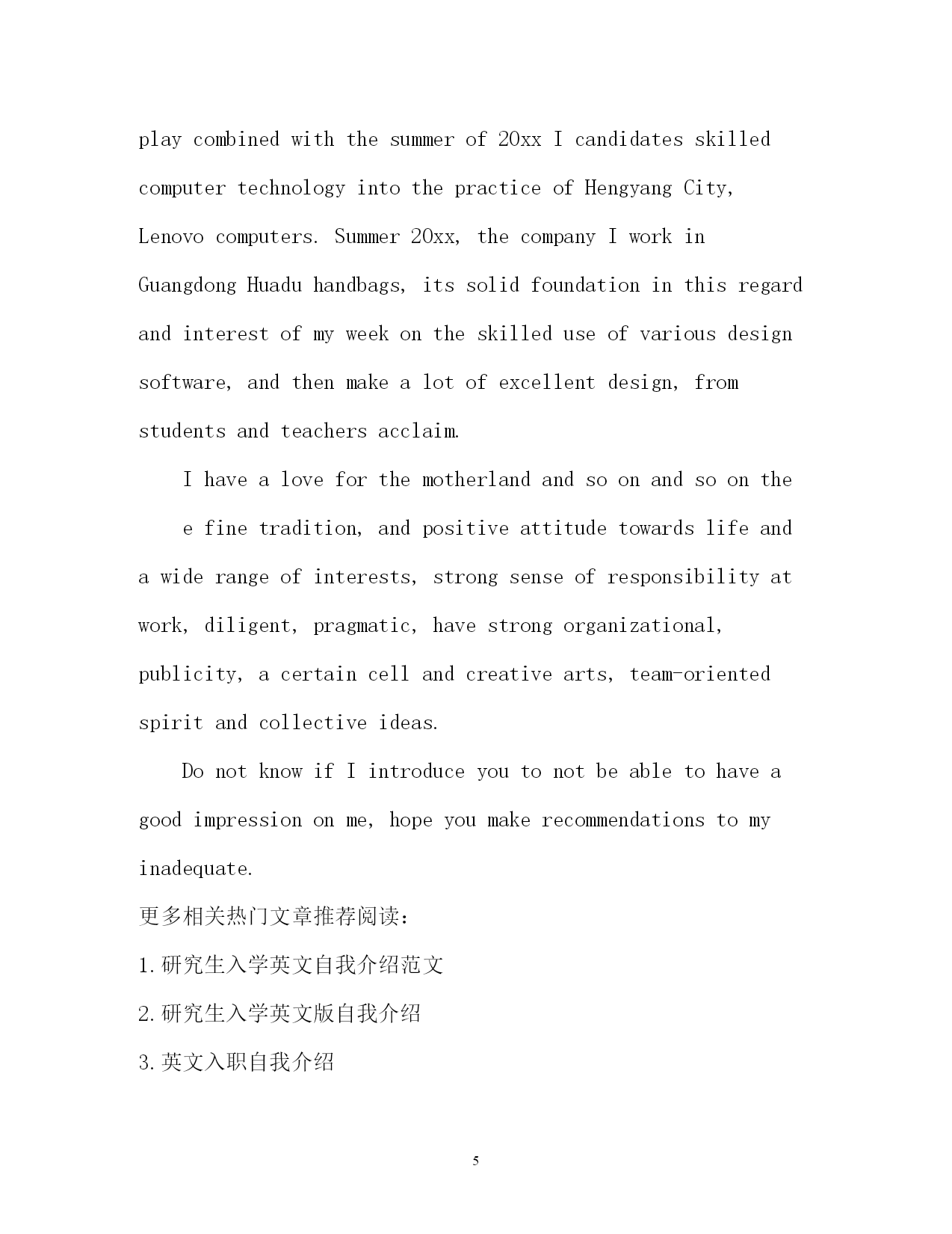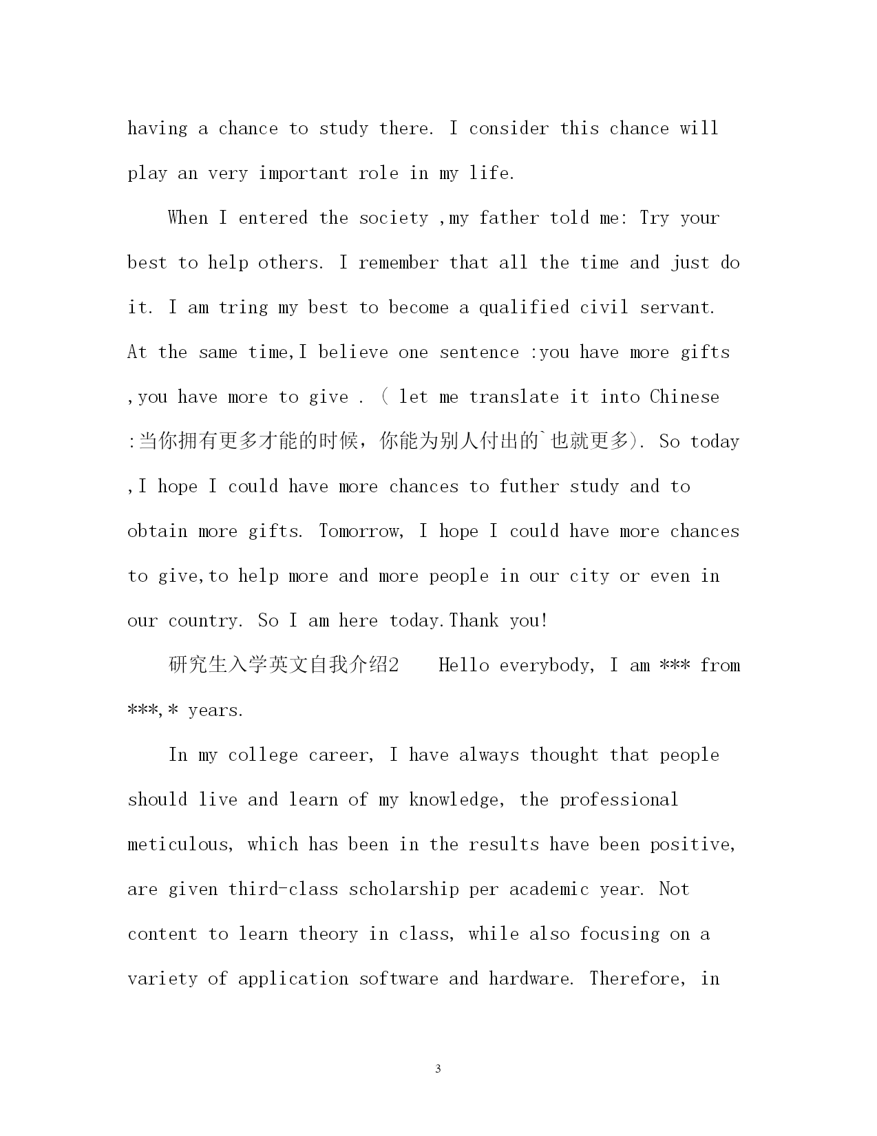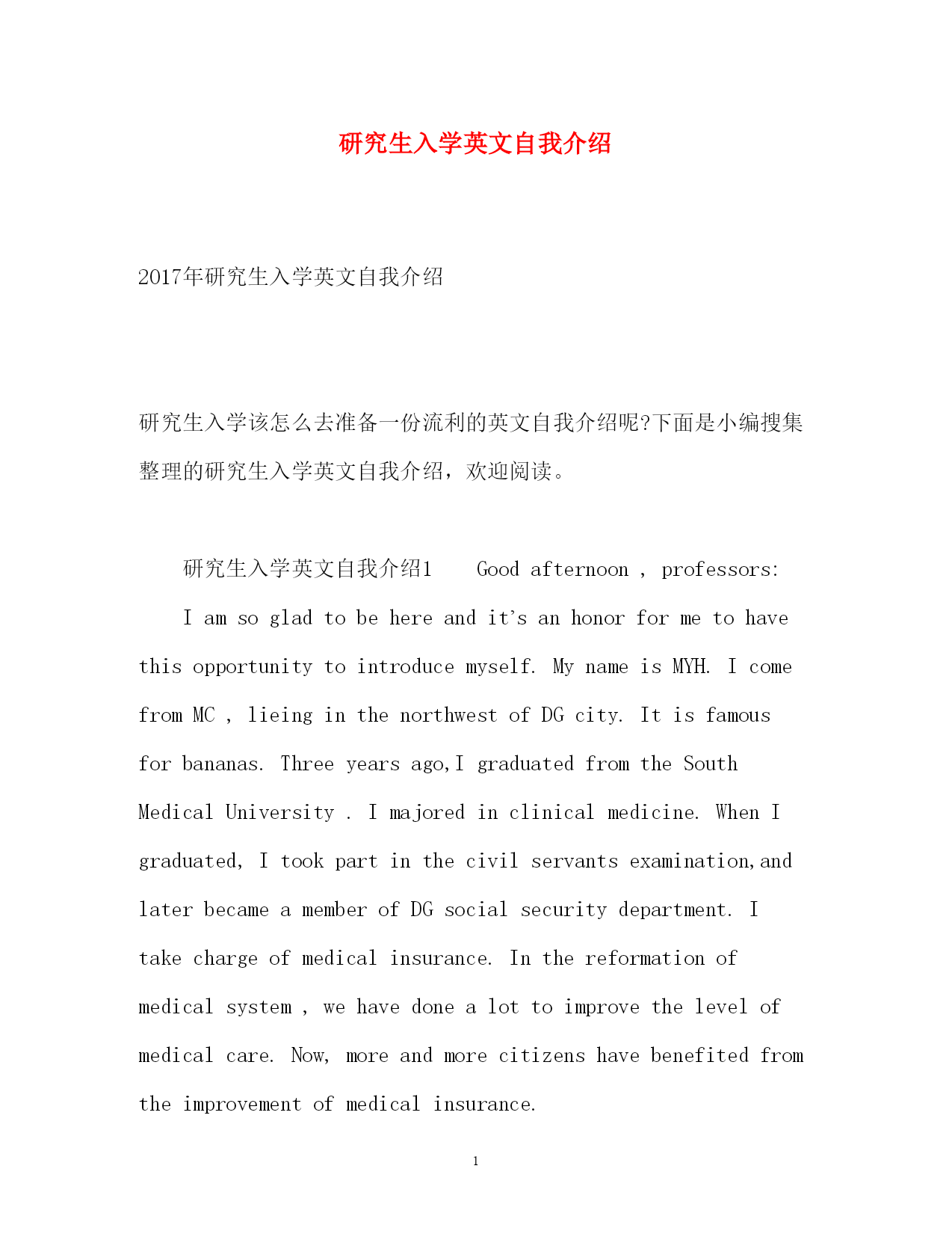 此资料由网络收集而来,如有侵权请告知上传者立即删除。资料共分享,我们负责传递知识。PAGEPAGE6研究生入学英文自我介绍2017年研究生入学英文自我介绍研究生入学该怎么去准备一份流利的英文自我介绍呢?下面是小编搜集整理的研究生入学英文自我介绍,欢迎阅读。研究生入学英文自我介绍1Goodafternoon,professors:Iamsogladtobehereandit’sanhonorformetohavethisopportunitytointroducemyself.MynameisMYH.IcomefromMC,lieinginthenorthwestofDGcity.Itisfamousforbananas.Threeyearsago,IgraduatedfromtheSouthMedicalUniversity.Imajoredinclinicalmedicine.WhenIgraduated,Itookpartinthecivilservantsexamination,andlaterbecameamemberofDGsocialsecuritydepartment.Itakechargeofmedicalinsurance.Inthereformationofmedicalsystem,wehavedonealottoimprovethelevelofmedicalcare.Now,moreandmorecitizenshavebenefitedfromtheimprovementofmedicalinsurance.Iamhonest,open-mindedandfullofpassion.Myfriendsappreciatemeasaresponsibleanddiligentperson.Inmysparetime,Ilovesprots,readingandwriting.Moreover,Iamacrazyliteraturefans.Ienjoywritingpoetries.Inmymind,literaturecouldmakesonesounder.Atthesametime.Iamavolunteer,aninternetvolunteer.Ourdepartmenthavefoundvolunteer’smailboxinourofficialwebsite.Peoplecouldwriteletterstouswhentheyhavequestionsaboutmedicalinsurance,wewillanswertheirquestionsassoonasquicklyinoursparetime.Lastyear,Ihavewrittenbackmorethan300letters.Byhelpingothers,Volunteer’sservicemakemehappy.Inmyopinion,Volunteer’sserviceistrulywellworthadvocating.Itisagoodwaytoimproveefficiencyofthewholesociety.Now,Ihaveworkedforthreeyears.Withtheexperienceofcommunicatingwithallkindsofpeople,Ifeelaneedoffurtherstudy.Iamlackoftheknowledgeofpublicadministrationandhumanities.Andthepeople’suniversityofChinahasalonghistory,anditisfamousforit’seducationofpublicadministrationandhumanities.Iamlongingforhavingachancetostudythere.Iconsiderthischancewillplayanveryimportantroleinmylife.WhenIenteredthesociety,myfathertoldme:Tryyourbesttohelpothers.Irememberthatallthetimeandjustdoit.Iamtringmybesttobecomeaqualifiedcivilservant.Atthesametime,Ibelieveonesentence:youhavemoregifts,youhavemoretogive.(letmetranslateitintoChinese:当你拥有更多才能的时候,你能为别人付出的`也就更多).So