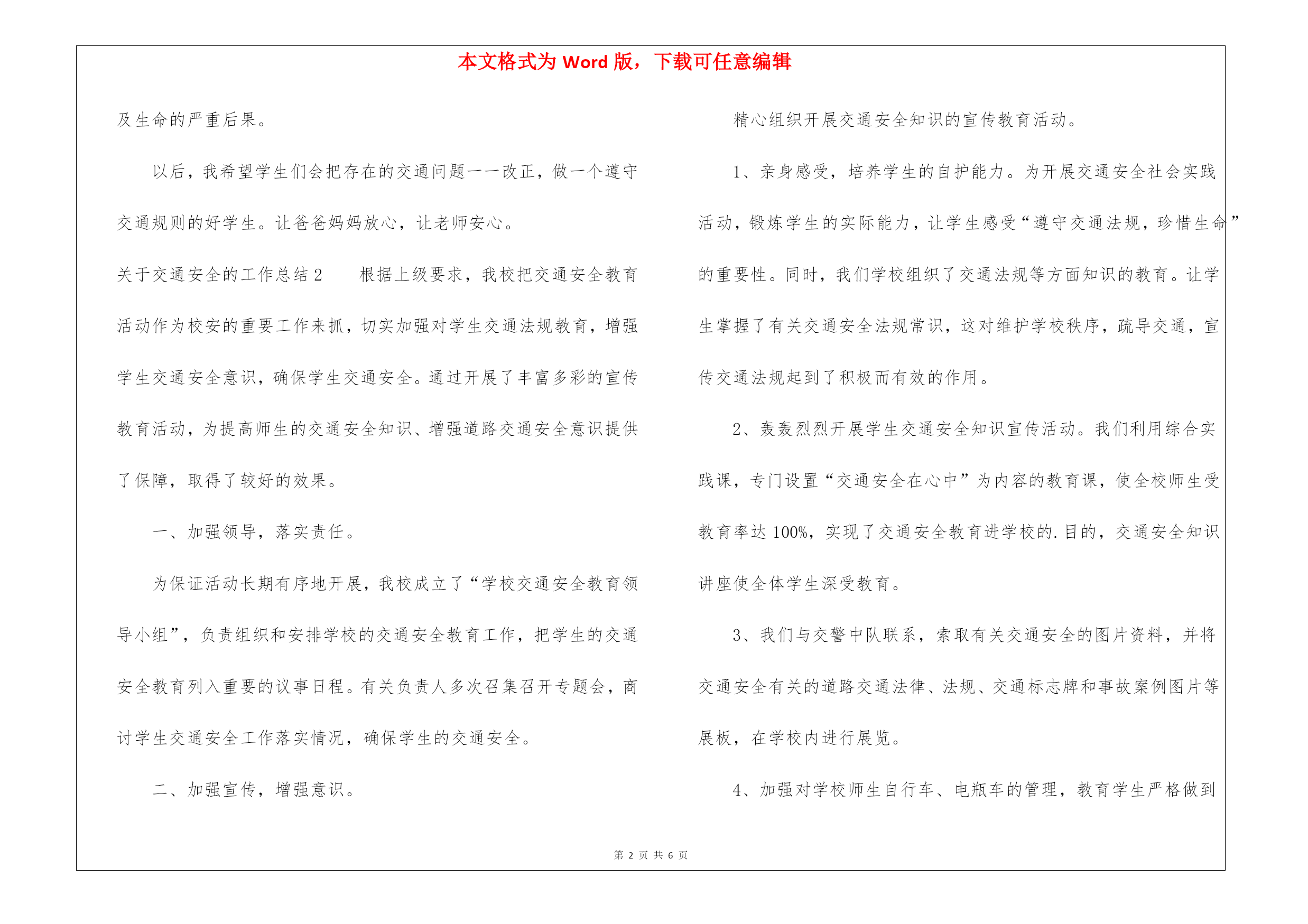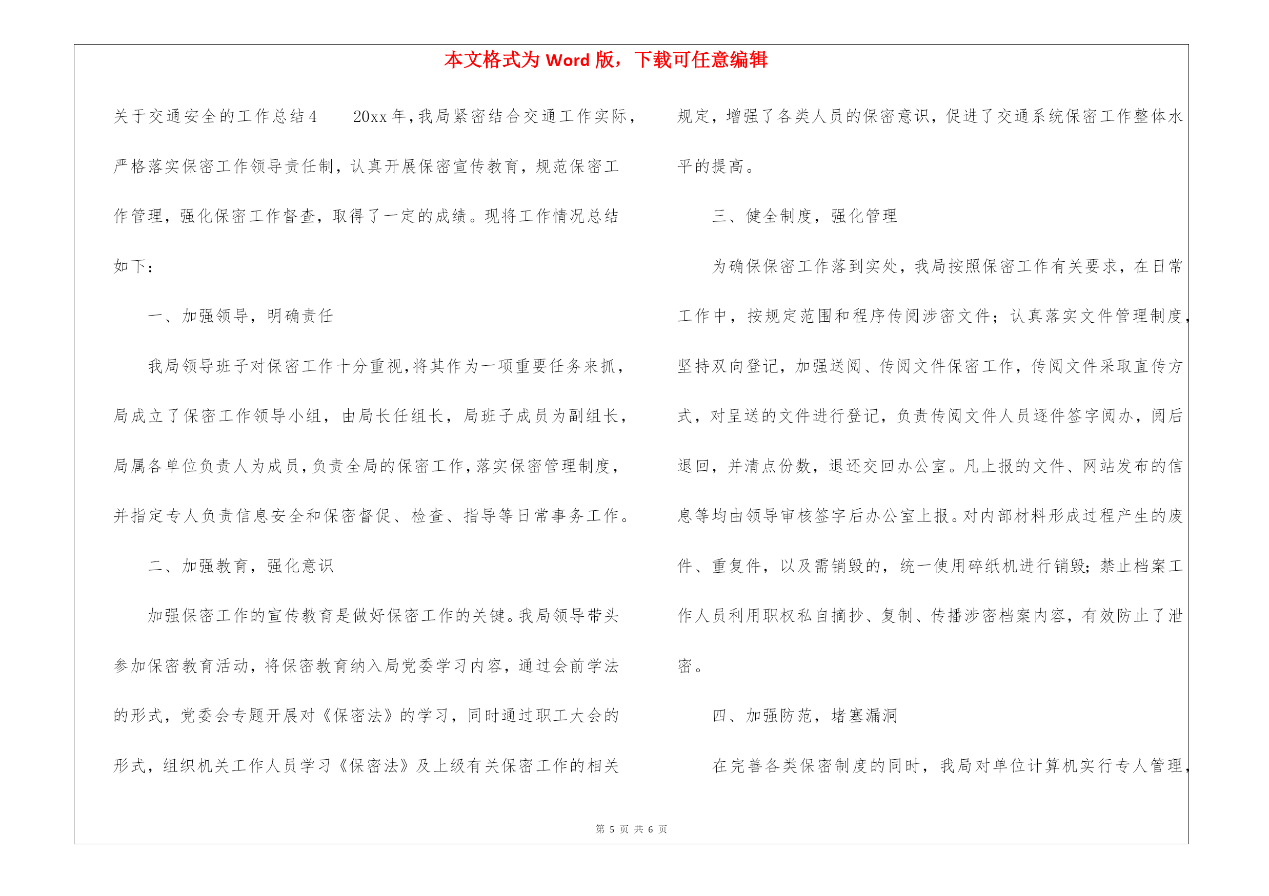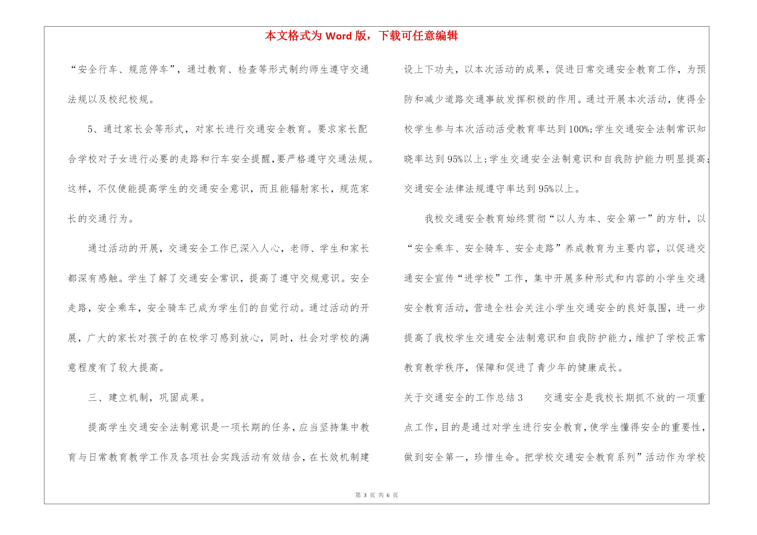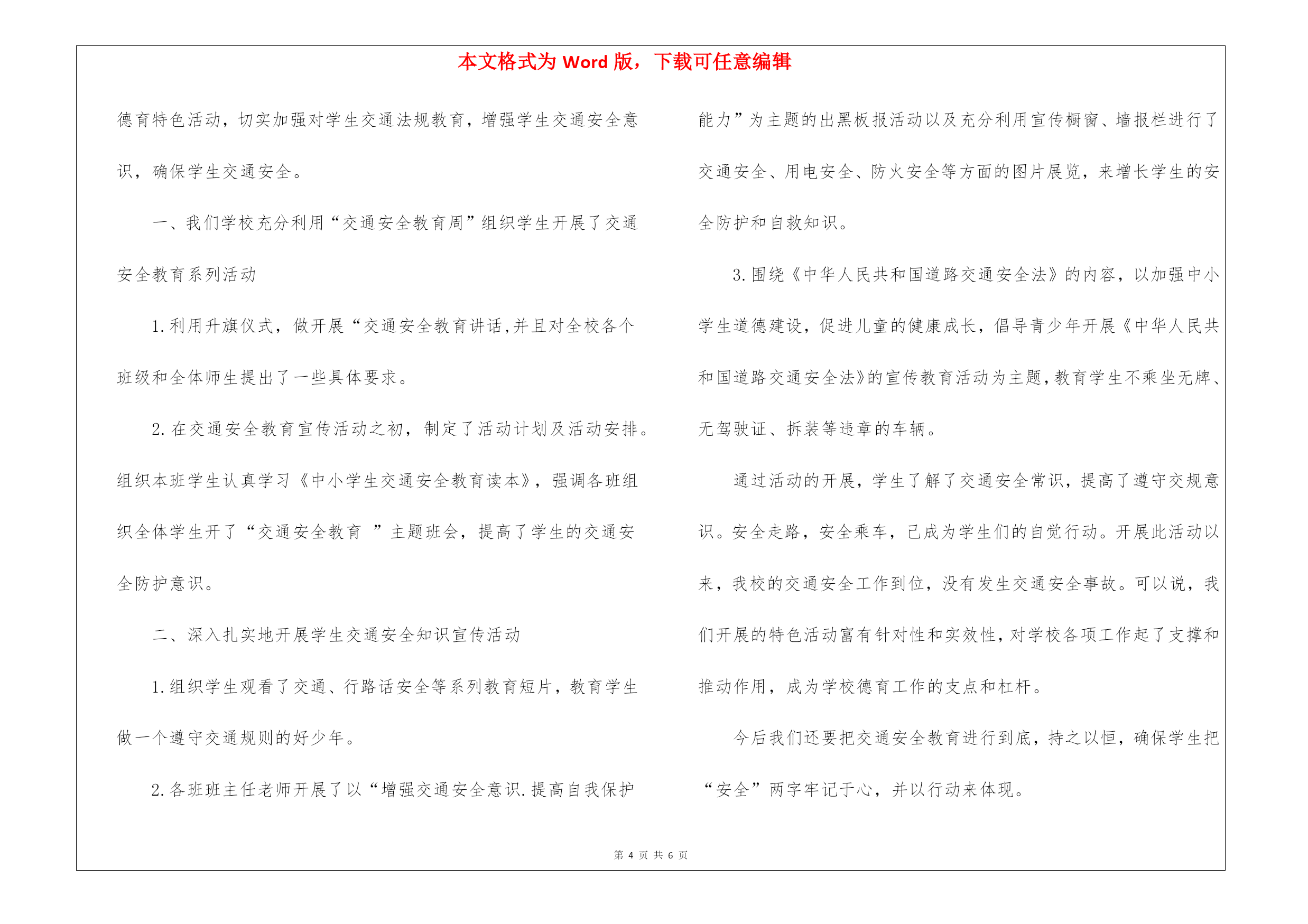 本文格式为Word版,下载可任意编辑第PAGE\*MERGEFORMAT6页共NUMPAGES\*MERGEFORMAT6页关于交通安全的工作总结关于交通安全的工作总结总结是对过去一定时期的工作、学习或思想情况进行回顾、分析,并做出客观评价的书面材料,它能帮我们理顺知识结构,突出重点,突破难点,让我们来为自己写一份总结吧。我们该怎么写总结呢?下面是我编写整理的关于交通安全的工作总结,欢迎大家分享。关于交通安全的工作总结1昨天下午,学校组织全校师生和家长一起听了一节关于交通安全知识的讲座。听了此次讲座我发现,当前交通存在许多问题,如:超车、超载、超速、行人乱穿马路、乱闯红灯等。存在上述问题最重要的是人们对交通安全目标和内容的理解不够,对存在的交通安全隐患认识不足,从而不断导致车祸(死、伤)的人间悲剧发生。孩子们的生命安全牵动着每个家庭和教师的心,因此,要加强对学生的交通安全教育,防止和避免交通事故的发生。作为我们教师要有强烈的交通安全意识,做一个交通安全的保护者、宣传者、教育者,为孩子做出良好的表率作用,增强幼儿的交通安全意识。我们要对对家长进行交通安全宣传,引导家长参与交通安全活动。家长是孩子的第一任老师,对孩子的影响很大。通过开家长会等活动,从而呼吁家长参与进来,应时刻提醒孩子们注意交通安全。在课堂上我教了学生们很多交通安全知识,但也只是浅薄的。通过学习,我进一步树立起了交通安全意识,这在平时对于学生的安全教育中起到了重要的作用。通过学习我知道了:当我们徒步行走于人来车往的马路时,一定要时刻保持清醒的头脑,不能在马路上嬉戏打闹;当我们过马路时,要多一份谦让与耐心,不闯红灯,走人行横道,绝不能为贪一时之快,违规横穿马路。因为,一个疏忽、一个马虎、一个走神都可能酿成危及生命的严重后果。以后,我希望学生们会把存在的交通问题一一改正,做一个遵守交通规则的好学生。让爸爸妈妈放心,让老师安心。关于交通安全的工作总结2根据上级要求,我校把交通安全教育活动作为校安的重要工作来抓,切实加强对学生交通法规教育,增强学生交通安全意识,确保学生交通安全。通过开展了丰富多彩的宣传教育活动,为提高师生的交通安全知识、增强道路交通安全意识提供了保障,取得了较好的效果。一、加强领导,落实责任。为保证活动长期有序地开展,我校成立了“学校交通安全教育领导小组”,负责组织和安排学校的交通安全教育工作,把学生的交通安全教育列入重要的议事日程。有关负责人多次召集召开专题会,商讨学生交通安全工作落实情况,确保学生的交通安全。二、加强宣传,增强意识。精心组织开展交通安全知识的宣传教育活动。1、亲身感受,培养学生的自护能力。为开展交通安全社会实践活动,锻炼学生的实际能力,让学生感受“遵守交通法规,珍惜生命”的重要性。同时,我们学校组织了交通法规等方面知识的教育。让学生掌握了有关交通安全法规常识,这对维护学校秩序,疏导交通,宣传交通法规起到了积极而有效的作用。2、轰轰烈烈开展学生交通安全知识宣传活动。我们利用综合实践课,专门设置“交通安全在心中”为内容的教育课,使全校师生受教育率达100%,实现了交通安全教育进学校的.目的,交通安全知识讲座使全体学生深受教育。3、我们与交警中队联系,索取有关交通安全的图片资料,并将交通安全有关的道路交通法律、法规、交通标志牌和事故案例图片等展板,在学校内进行展览。4、加强对学校师生自行车、电瓶车的管理,教育学生严格做到“安全行车、规范停车”,通过教育、检查等形式制约师生遵守交通法规以及校纪校规。5、通过家长会等形式,对家长进行交通安全教育。要求家长配合学校对子女进行必要的走路和行车安全提醒,要严格遵守交通法规。这样,不仅使能提高学生的交通安全意识,而且能辐射家长,规范家长的交通行为。通过活动的开展,交通安全工作已深入人心,老师、学生和家长都深有感触。学生了解了交通安全常识,提高了遵守交规意识。安全走路,安全乘车,安全骑车己成为学生们的自觉行动。通过活动的开展,广大的家长对孩子的在校学习感到放心,同时,社会对学校的满意程度有了较大提高。三、建立机制,巩固成果。提高学生交通安全法制意识是一项长期的任务,应当坚持集中教育与日常教育教学工作及各项社会实践活动有效结合,在长效机制建设上下功夫,以本次活动的成果,促进日常交通安全教育工作,为预防和减少道路交通事故发挥积极的作用。通过开展本次活动,使得全校学生参与本次活动活受教育率达到100%;学生交通安全法制常识知晓率达到95%以上;学生交通安全法制意识和自我防护能力明显提高;交通安全法律法规遵守率达到95%以上。我校交通安全教育始终贯彻“以人为本、安全第一”的方针,以“安全乘车、安全骑车、安全走路”养成教育为主要内容,以促进交通安全宣传“进学校”工作,集中开展多种形式和内容的小学生