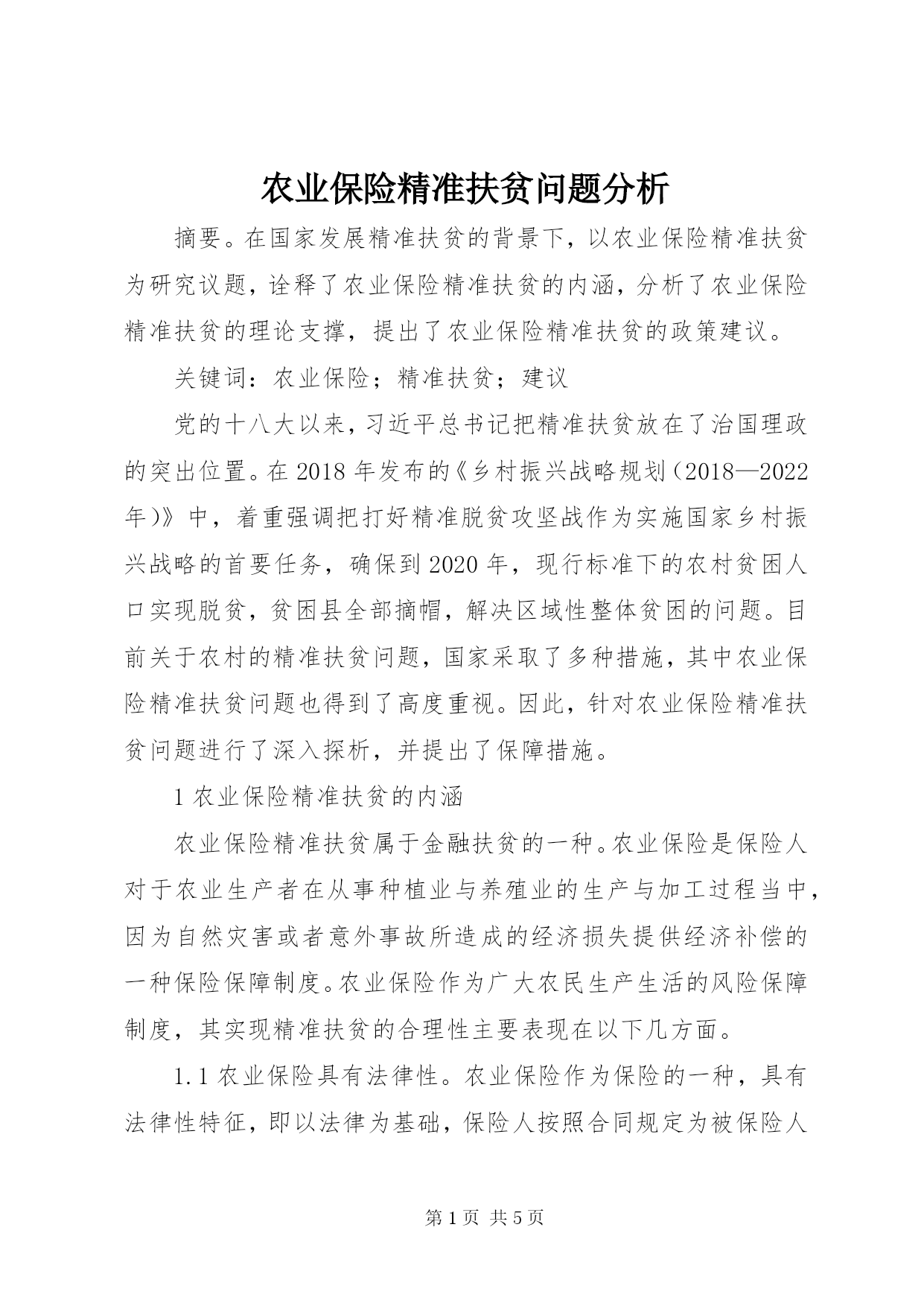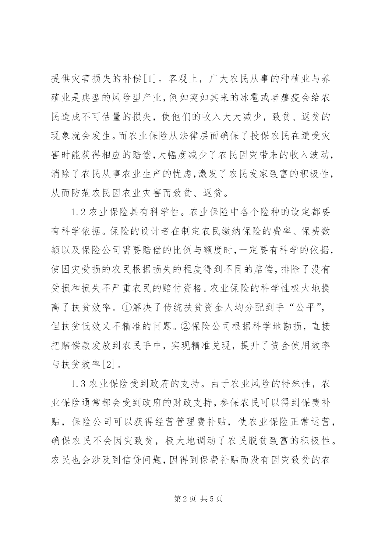 第PAGE\*Arabic\*MERGEFORMAT5页共NUMPAGES\*MERGEFORMAT5页农业保险精准扶贫问题分析摘要。在国家发展精准扶贫的背景下,以农业保险精准扶贫为研究议题,诠释了农业保险精准扶贫的内涵,分析了农业保险精准扶贫的理论支撑,提出了农业保险精准扶贫的政策建议。关键词:农业保险;精准扶贫;建议党的十八大以来,习近平总书记把精准扶贫放在了治国理政的突出位置。在2018年发布的《乡村振兴战略规划(2018—2022年)》中,着重强调把打好精准脱贫攻坚战作为实施国家乡村振兴战略的首要任务,确保到2020年,现行标准下的农村贫困人口实现脱贫,贫困县全部摘帽,解决区域性整体贫困的问题。目前关于农村的精准扶贫问题,国家采取了多种措施,其中农业保险精准扶贫问题也得到了高度重视。因此,针对农业保险精准扶贫问题进行了深入探析,并提出了保障措施。1农业保险精准扶贫的内涵农业保险精准扶贫属于金融扶贫的一种。农业保险是保险人对于农业生产者在从事种植业与养殖业的生产与加工过程当中,因为自然灾害或者意外事故所造成的经济损失提供经济补偿的一种保险保障制度。农业保险作为广大农民生产生活的风险保障制度,其实现精准扶贫的合理性主要表现在以下几方面。1.1农业保险具有法律性。农业保险作为保险的一种,具有法律性特征,即以法律为基础,保险人按照合同规定为被保险人提供灾害损失的补偿[1]。客观上,广大农民从事的种植业与养殖业是典型的风险型产业,例如突如其来的冰雹或者瘟疫会给农民造成不可估量的损失,使他们的收入大大减少,致贫、返贫的现象就会发生。而农业保险从法律层面确保了投保农民在遭受灾害时能获得相应的赔偿,大幅度减少了农民因灾带来的收入波动,消除了农民从事农业生产的忧虑,激发了农民发家致富的积极性,从而防范农民因农业灾害而致贫、返贫。1.2农业保险具有科学性。农业保险中各个险种的设定都要有科学依据。保险的设计者在制定农民缴纳保险的费率、保费数额以及保险公司需要赔偿的比例与额度时,一定要有科学的依据,使因灾受损的农民根据损失的程度得到不同的赔偿,排除了没有受损和损失不严重农民的赔付资格。农业保险的科学性极大地提高了扶贫效率。①解决了传统扶贫资金人均分配到手“公平”,但扶贫低效又不精准的问题。②保险公司根据科学地勘损,直接把赔偿款发放到农民手中,实现精准兑现,提升了资金使用效率与扶贫效率[2]。1.3农业保险受到政府的支持。由于农业风险的特殊性,农业保险通常都会受到政府的财政支持,参保农民可以得到保费补贴,保险公司可以获得经营管理费补贴,使农业保险正常运营,确保农民不会因灾致贫,极大地调动了农民脱贫致富的积极性。农民也会涉及到信贷问题,因得到保费补贴而没有因灾致贫的农民,在基本的信用评价上是不会减分的。此外,政府的最新支持还体现在农业保险上引入了“政银保”和“涉农贷”等模式,帮助农民提高贷款的资信水平和获取贷款的可能性,引领农民脱贫致富。2农业保险精准扶贫的理论支撑2.1保险基金理论。马克思提出了保险基金理论,认为为了应对自然灾害和意外事故,必须从社会总产品当中扣除后备基金即保险基金。保险基金理论上不局限于一种保险,而是一种广义的社会保障措施,保险基金本身具有分摊损失和补偿损失的功能。农业保险之所以具有扶贫功效,就是因为具有分摊损失和补偿损失的功能。农业保险分摊损失的职能就是把因灾造成的损失在农户间分摊,在保险的“大数法则”力量下防止受灾严重的农民因灾致贫与因灾返贫。而补偿损失的职能是利用保险基金对受灾农民进行经济补偿,最大程度地减少受灾农民的损失,使他们有能力继续再生产,鼓励他们脱贫致富。2.2农业保险的福利效应。庇古首先提出了福利经济学,该理论的一个很重要的观点就是提出了“社会资源最优配置论”,认为彻底解决贫困的核心问题是增加社会生产,而这需要社会资源最优配置来实现。农业保险是庇古理论框架下边际私人存产值小于边际社会存产值的部门,因此具有福利溢出效应,通常政府部门会给予大量的补贴支持,即政策性农业保险。得到政府补贴的农业保险发挥着收入“稳定器”的功效,具有国民收入再分配的功效,使农民的风险预期降低,继续投入再生产,产业化的程度与产出效率提升,农民的收入增加。3推动农业保险精准扶贫的政策建议3.1农业保险科学与创新的发展。农业保险实现精准扶贫的根本是农业保险本身的设计要具有科学性,而这需要借助现代科技来推动农业保险科学与创新的发展。(1)推出更多的农险品种,并科学定价。目前占比最高的成本保险既存在定价上的缺陷,也不能满足市场的需要,因此根据各地的实际情况科学地开发天气指数保险、蔬菜价格险、收入保险、扶贫小额意外险、信用保证等保险产品,从而为农民提供多层次的保险体系。利用人工智能等高科技帮助设计天气指数保险、蔬菜价格险、