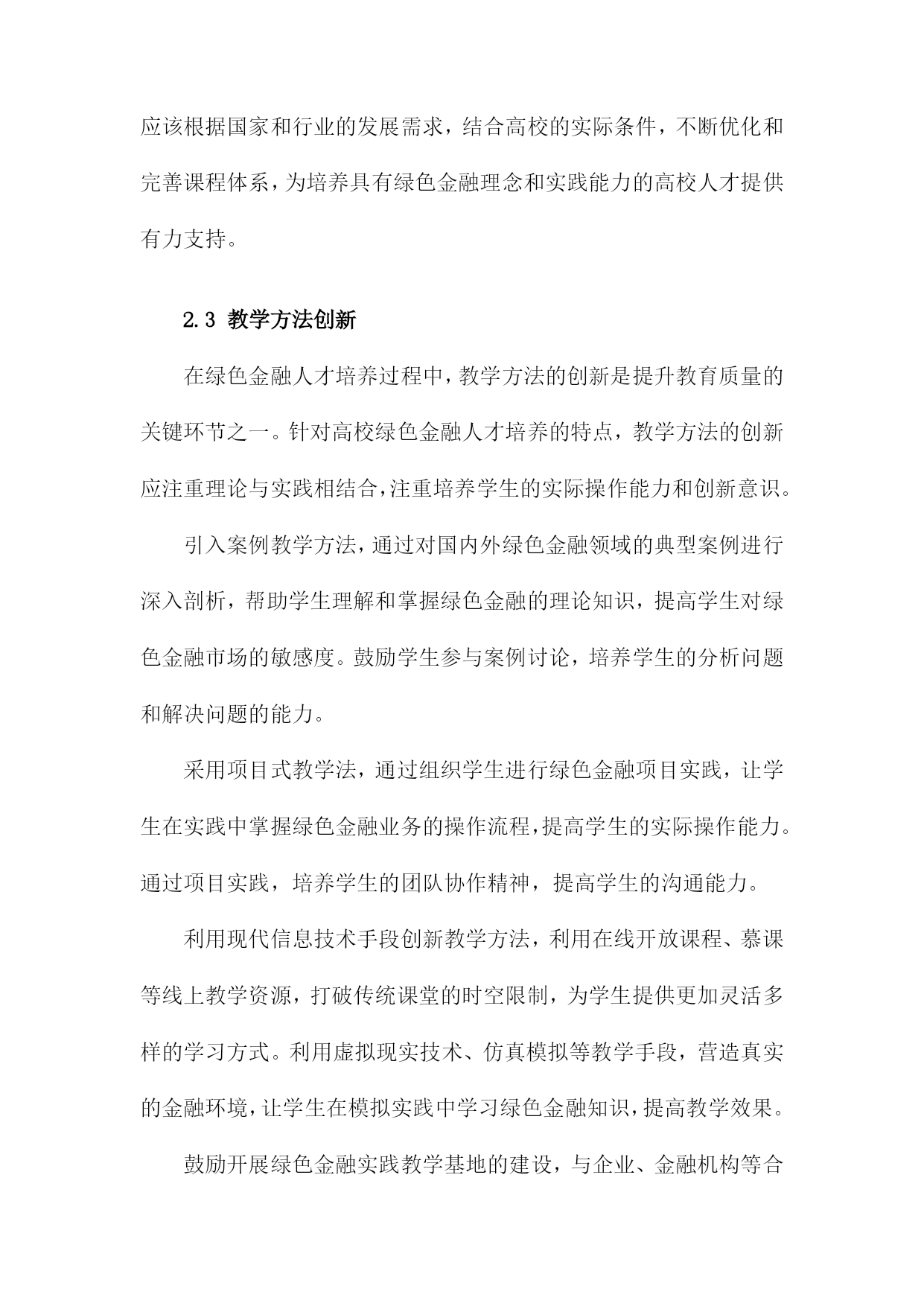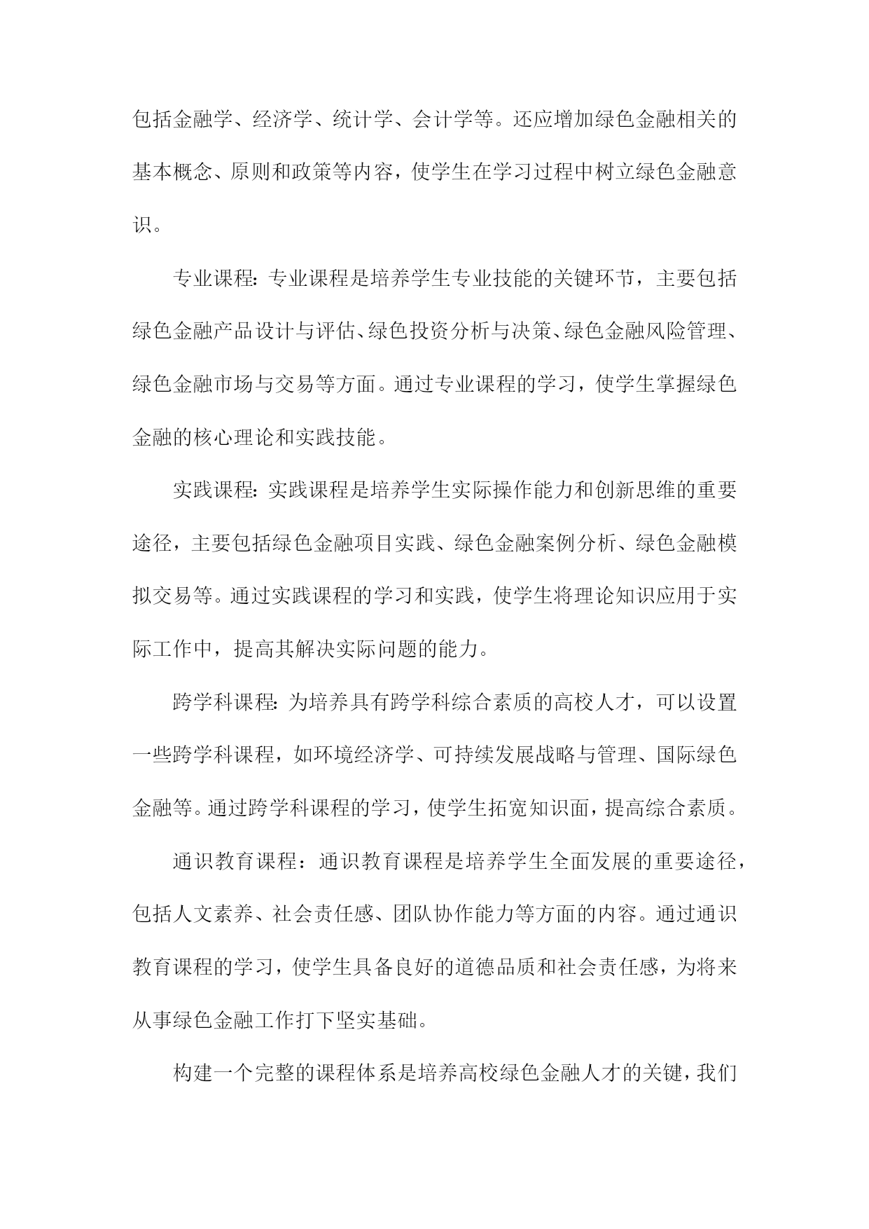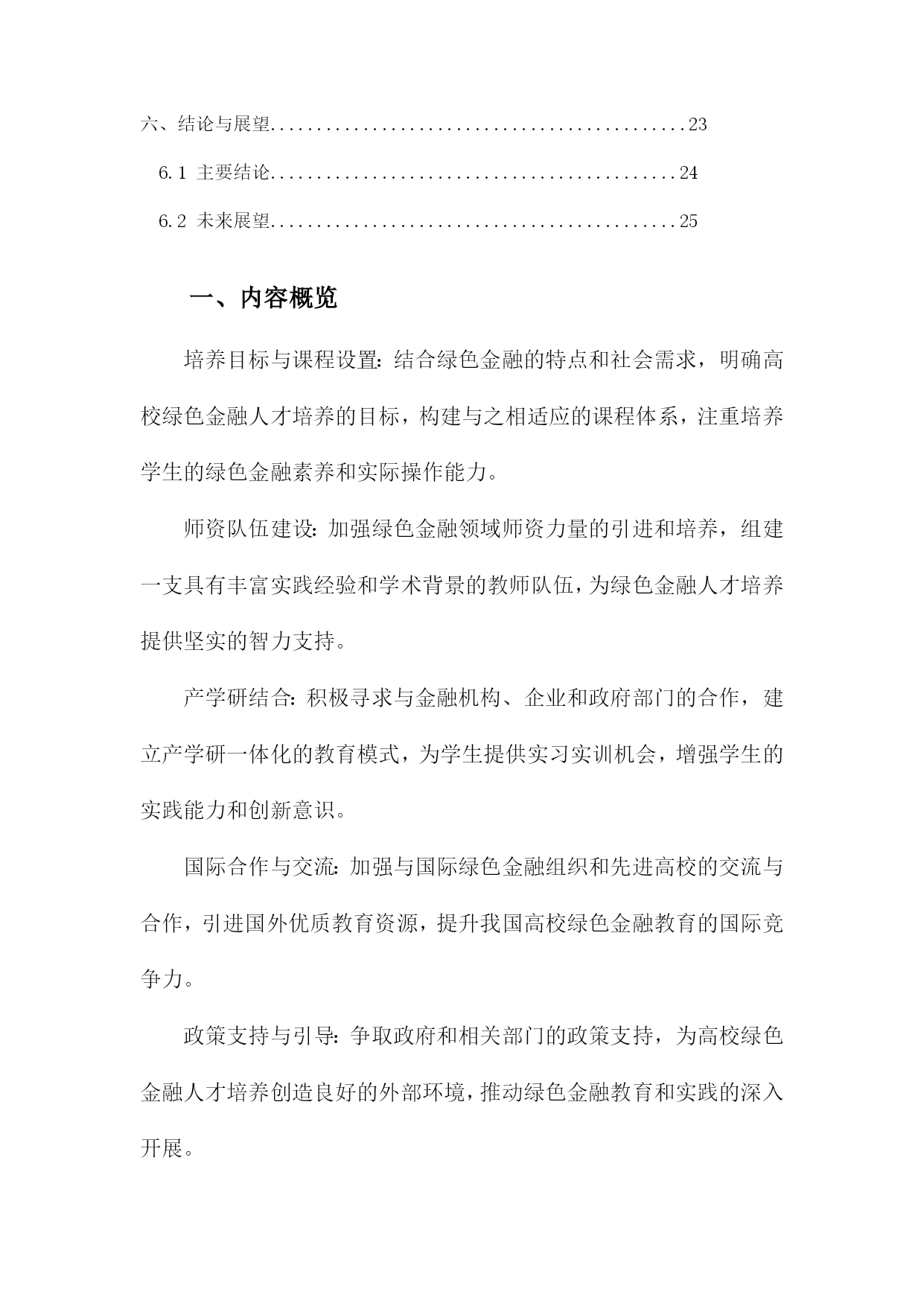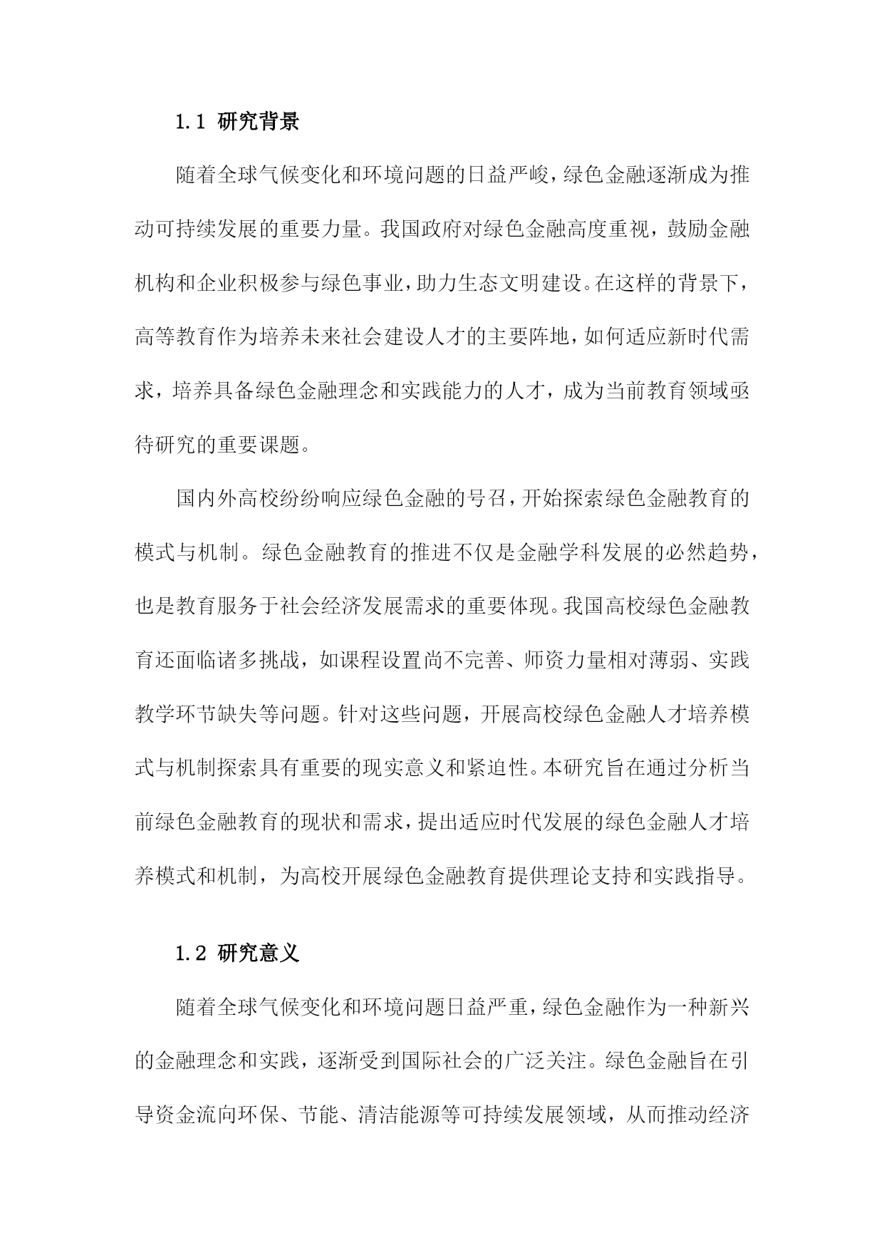高校绿色金融人才培养模式与机制探索目录一、内容概览................................................21.1研究背景.............................................21.2研究意义.............................................3二、高校绿色金融人才培养模式探讨............................42.1培养目标设定.........................................62.2课程体系构建.........................................72.3教学方法创新.........................................82.4实践能力培养.........................................9三、高校绿色金融机制探索...................................103.1政策支持体系........................................113.2产学研结合..........................................133.3绿色金融产品与服务创新..............................133.4国际合作与交流......................................14四、案例分析...............................................154.1国内外高校绿色金融人才培养成功案例..................174.2案例分析与启示......................................18五、挑战与对策建议.........................................195.1面临的挑战..........................................215.2对策与建议..........................................22六、结论与展望.............................................236.1主要结论............................................246.2未来展望............................................25一、内容概览培养目标与课程设置:结合绿色金融的特点和社会需求,明确高校绿色金融人才培养的目标,构建与之相适应的课程体系,注重培养学生的绿色金融素养和实际操作能力。师资队伍建设:加强绿色金融领域师资力量的引进和培养,组建一支具有丰富实践经验和学术背景的教师队伍,为绿色金融人才培养提供坚实的智力支持。产学研结合:积极寻求与金融机构、企业和政府部门的合作,建立产学研一体化的教育模式,为学生提供实习实训机会,增强学生的实践能力和创新意识。国际合作与交流:加强与国际绿色金融组织和先进高校的交流与合作,引进国外优质教育资源,提升我国高校绿色金融教育的国际竞争力。政策支持与引导:争取政府和相关部门的政策支持,为高校绿色金融人才培养创造良好的外部环境,推动绿色金融教育和实践的深入开展。1.1研究背景随着全球气候变化和环境问题的日益严峻,绿色金融逐渐成为推动可持续发展的重要力量。我国政府对绿色金融高度重视,鼓励金融机构和企业积极参与绿色事业,助力生态文明建设。在这样的背景下,高等教育作为培养未来社会建设人才的主要阵地,如何适应新时代需求,培养具备绿色金融理念和实践能力的人才,成为当前教育领域亟待研究的重要课题。国内外高校纷纷响应绿色金融的号召,开始探索绿色金融教育的模式与机制。绿色金融教育的推进不仅是金融学科发展的必然趋势,也是教育服务于社会经济发展需求的重要体现。我国高校绿色金融教育还面临诸多挑战,如课程设置尚不完善、师资力量相对薄弱、实践教学环节缺失等问题。针对这些问题,开展高校绿色金融人才培养模式与机制探索具有重要的现实意义和紧迫性。本研究旨在通过分析当前绿色金融教育的现状和需求,提出适应时代发展的绿色金融人才培养模式和机制,为高校开展绿色金融教育提供理论支持和实践指导。1.2研究意义随着全球气候变化和环境问题日益严重,绿色金融作为一种新兴的金融理念和实践,逐渐受到国际社会的广泛关注。绿色金融旨在引导资金流向环保、节能、清洁能源等可持续发展