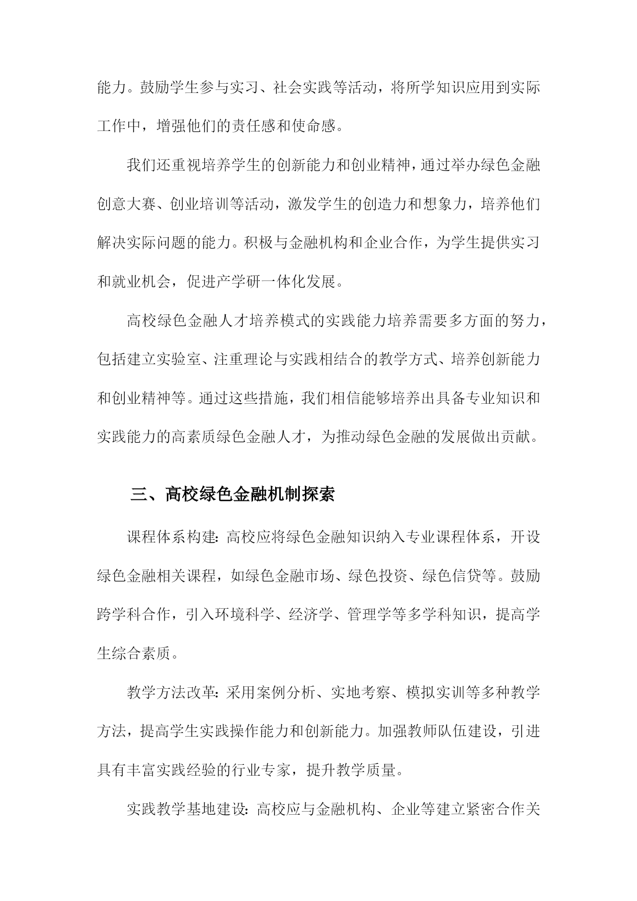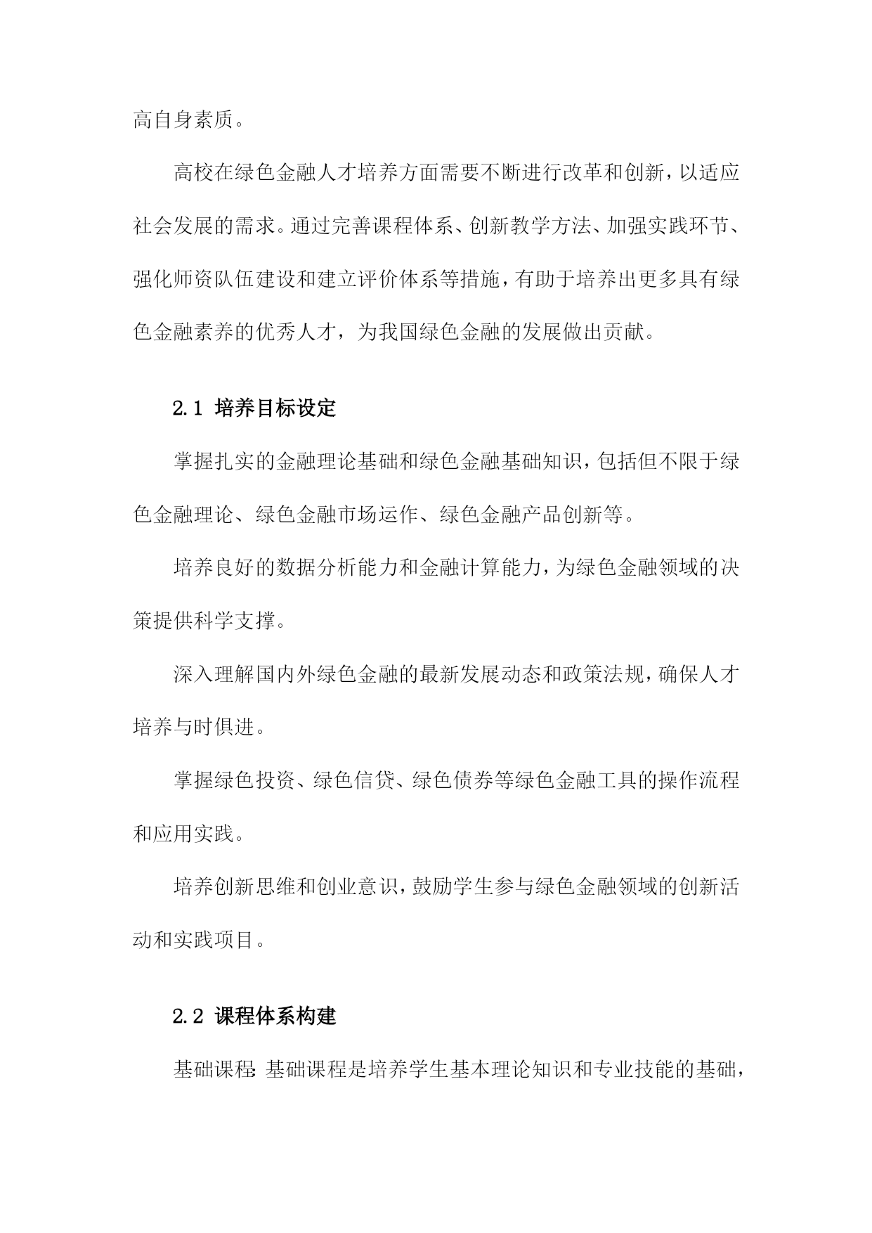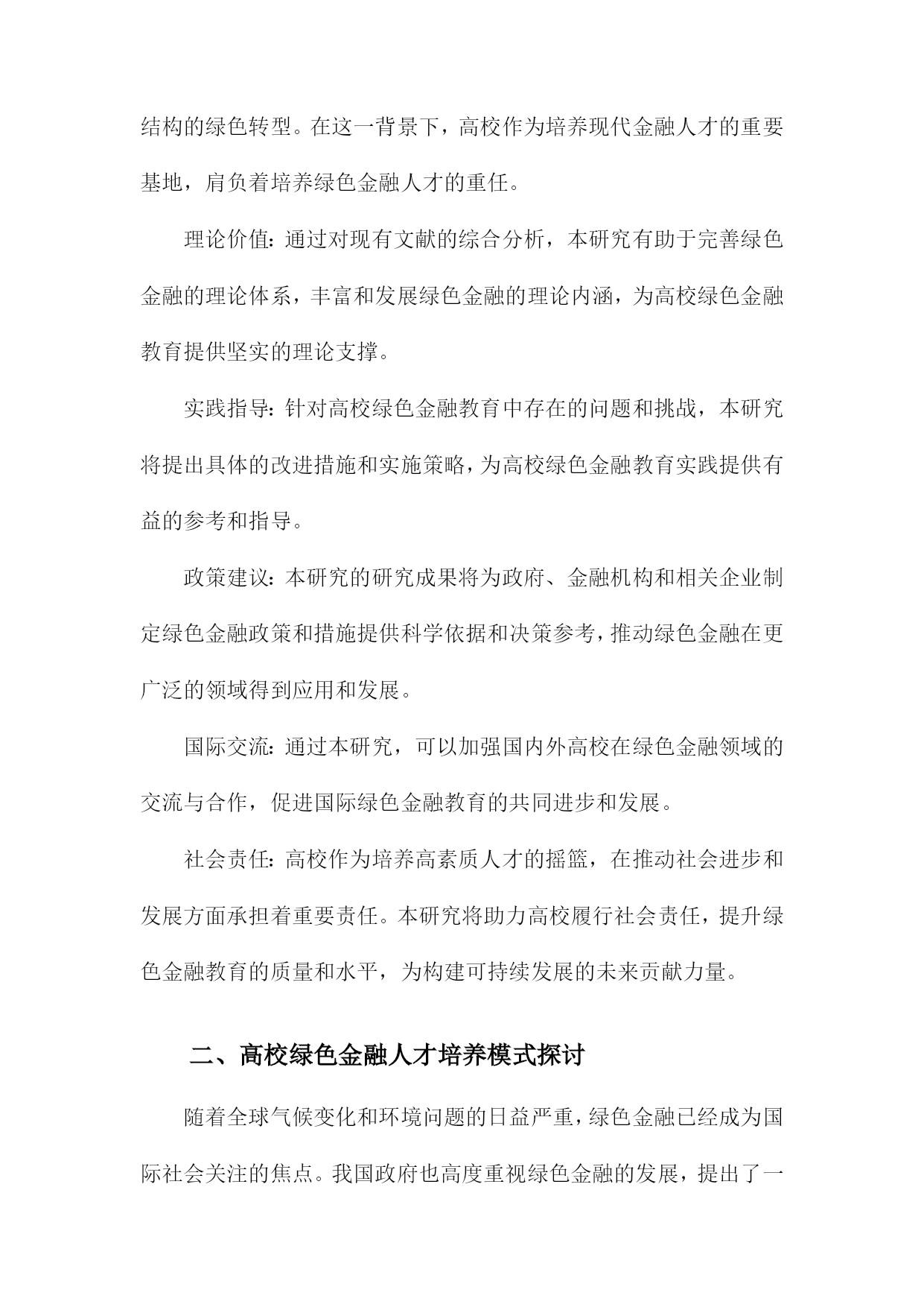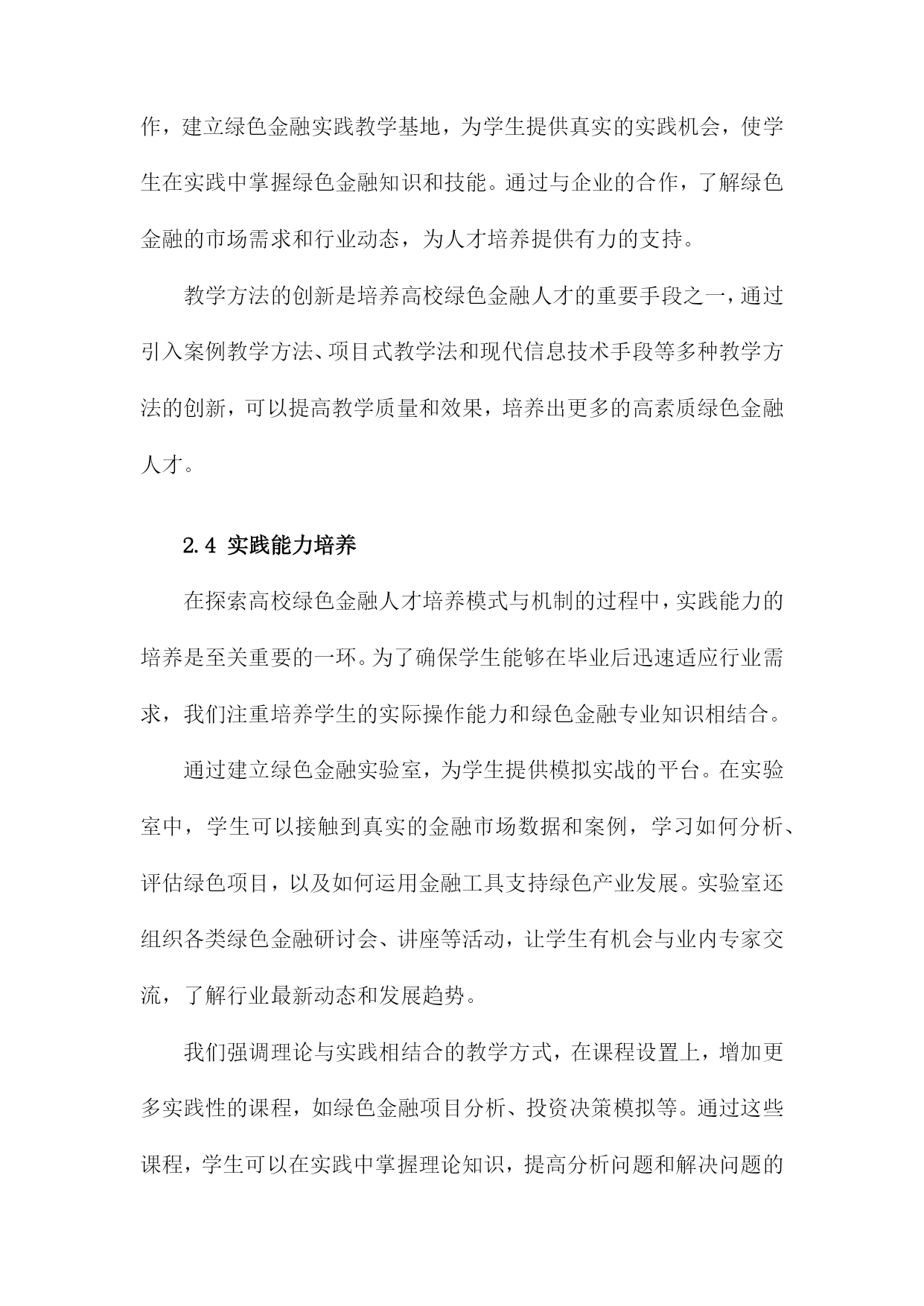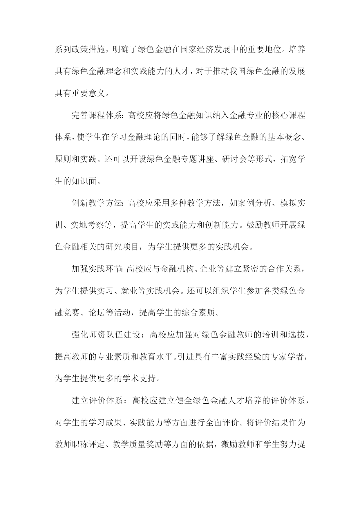 高校绿色金融人才培养模式与机制探索目录一、内容概览................................................21.1研究背景.............................................21.2研究意义.............................................3二、高校绿色金融人才培养模式探讨............................42.1培养目标设定.........................................62.2课程体系构建.........................................72.3教学方法创新.........................................82.4实践能力培养.........................................9三、高校绿色金融机制探索...................................103.1政策支持体系........................................113.2产学研结合..........................................133.3绿色金融产品与服务创新..............................133.4国际合作与交流......................................14四、案例分析...............................................154.1国内外高校绿色金融人才培养成功案例..................174.2案例分析与启示......................................18五、挑战与对策建议.........................................195.1面临的挑战..........................................215.2对策与建议..........................................22六、结论与展望.............................................236.1主要结论............................................246.2未来展望............................................25一、内容概览培养目标与课程设置:结合绿色金融的特点和社会需求,明确高校绿色金融人才培养的目标,构建与之相适应的课程体系,注重培养学生的绿色金融素养和实际操作能力。师资队伍建设:加强绿色金融领域师资力量的引进和培养,组建一支具有丰富实践经验和学术背景的教师队伍,为绿色金融人才培养提供坚实的智力支持。产学研结合:积极寻求与金融机构、企业和政府部门的合作,建立产学研一体化的教育模式,为学生提供实习实训机会,增强学生的实践能力和创新意识。国际合作与交流:加强与国际绿色金融组织和先进高校的交流与合作,引进国外优质教育资源,提升我国高校绿色金融教育的国际竞争力。政策支持与引导:争取政府和相关部门的政策支持,为高校绿色金融人才培养创造良好的外部环境,推动绿色金融教育和实践的深入开展。1.1研究背景随着全球气候变化和环境问题的日益严峻,绿色金融逐渐成为推动可持续发展的重要力量。我国政府对绿色金融高度重视,鼓励金融机构和企业积极参与绿色事业,助力生态文明建设。在这样的背景下,高等教育作为培养未来社会建设人才的主要阵地,如何适应新时代需求,培养具备绿色金融理念和实践能力的人才,成为当前教育领域亟待研究的重要课题。国内外高校纷纷响应绿色金融的号召,开始探索绿色金融教育的模式与机制。绿色金融教育的推进不仅是金融学科发展的必然趋势,也是教育服务于社会经济发展需求的重要体现。我国高校绿色金融教育还面临诸多挑战,如课程设置尚不完善、师资力量相对薄弱、实践教学环节缺失等问题。针对这些问题,开展高校绿色金融人才培养模式与机制探索具有重要的现实意义和紧迫性。本研究旨在通过分析当前绿色金融教育的现状和需求,提出适应时代发展的绿色金融人才培养模式和机制,为高校开展绿色金融教育提供理论支持和实践指导。1.2研究意义随着全球气候变化和环境问题日益严重,绿色金融作为一种新兴的金融理念和实践,逐渐受到国际社会的广泛关注。绿色金融旨在引导资金流向环保、节能、清洁能源等可持续发展